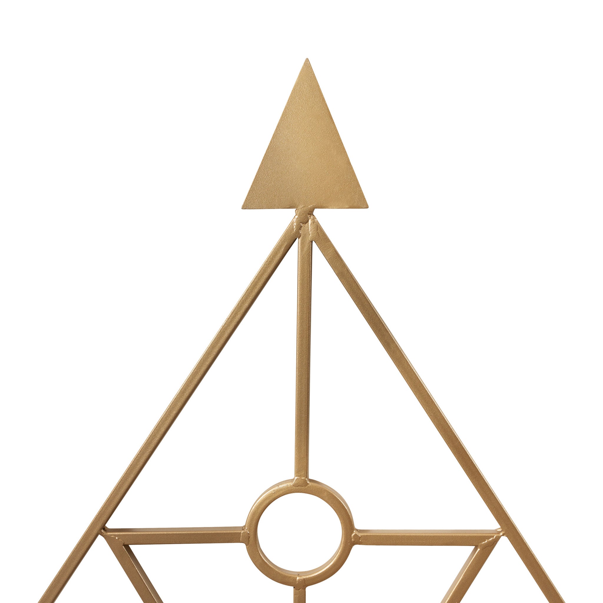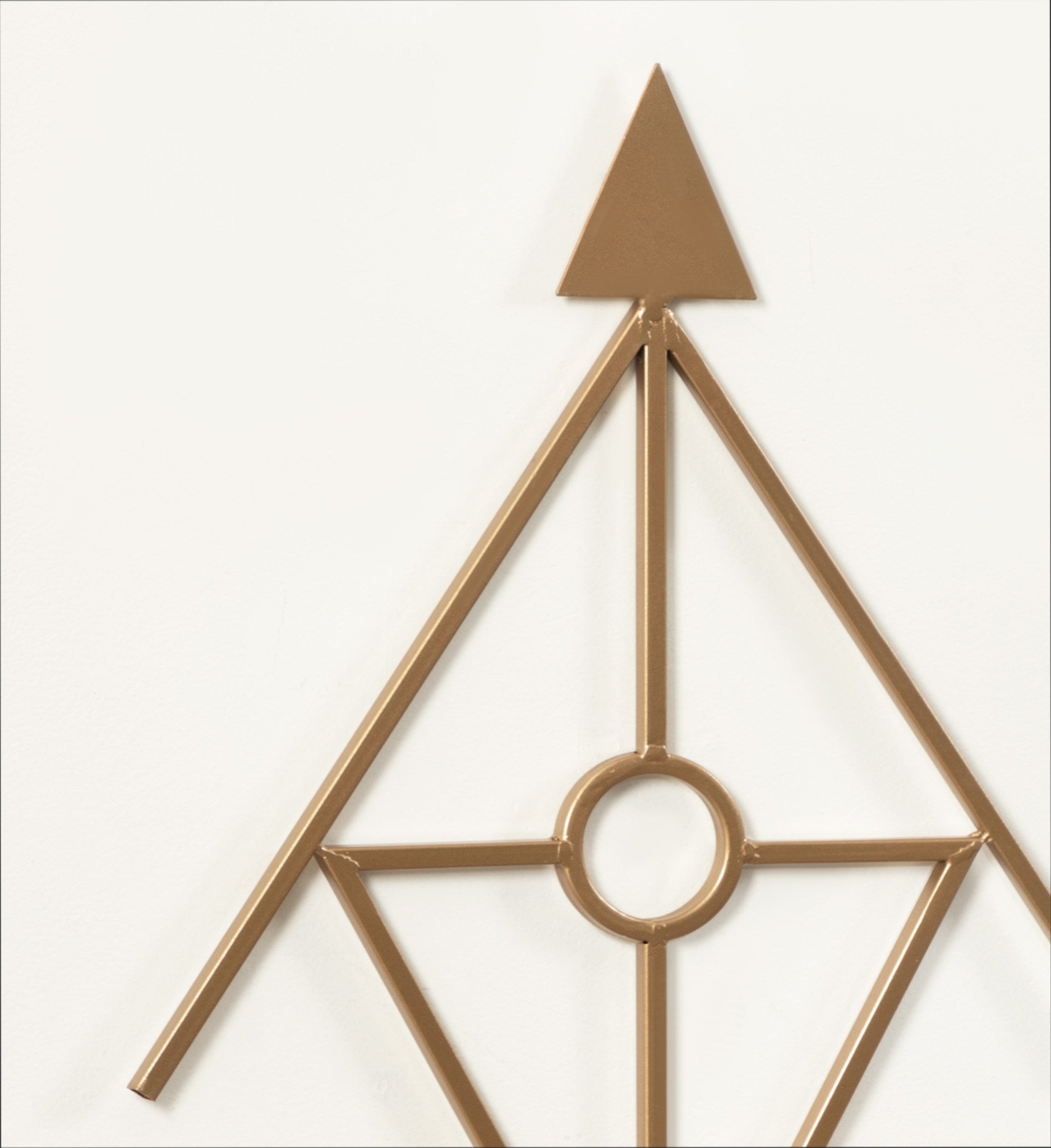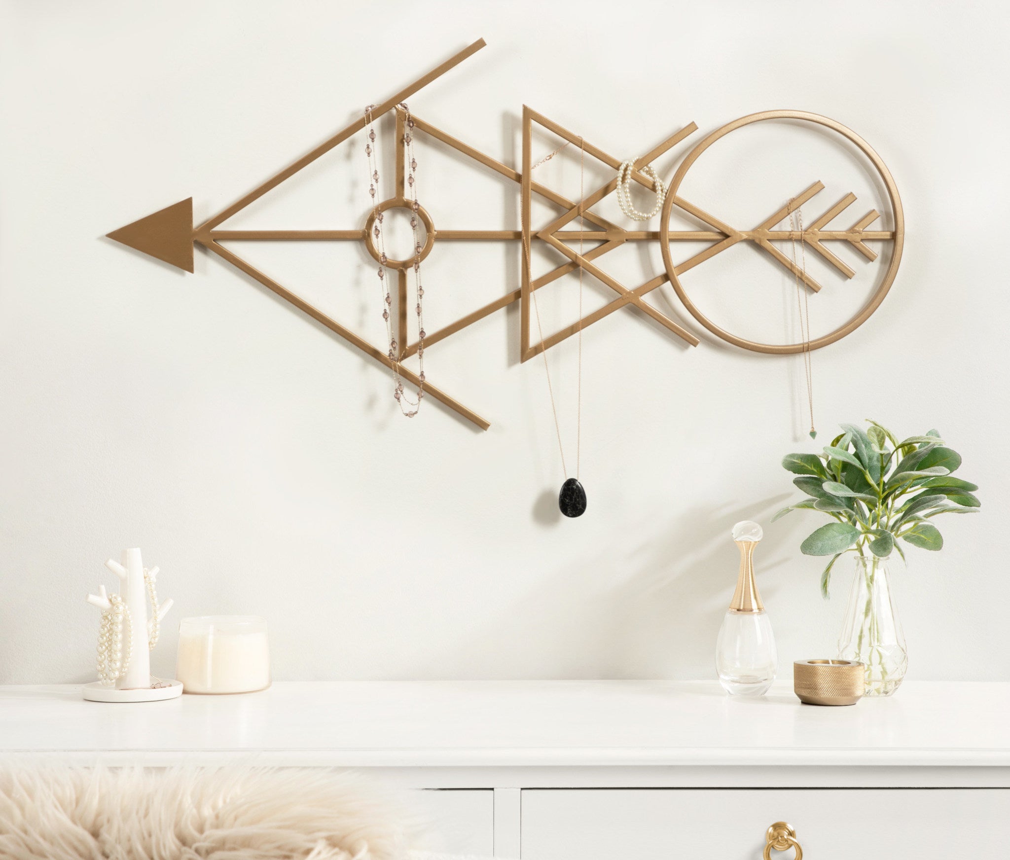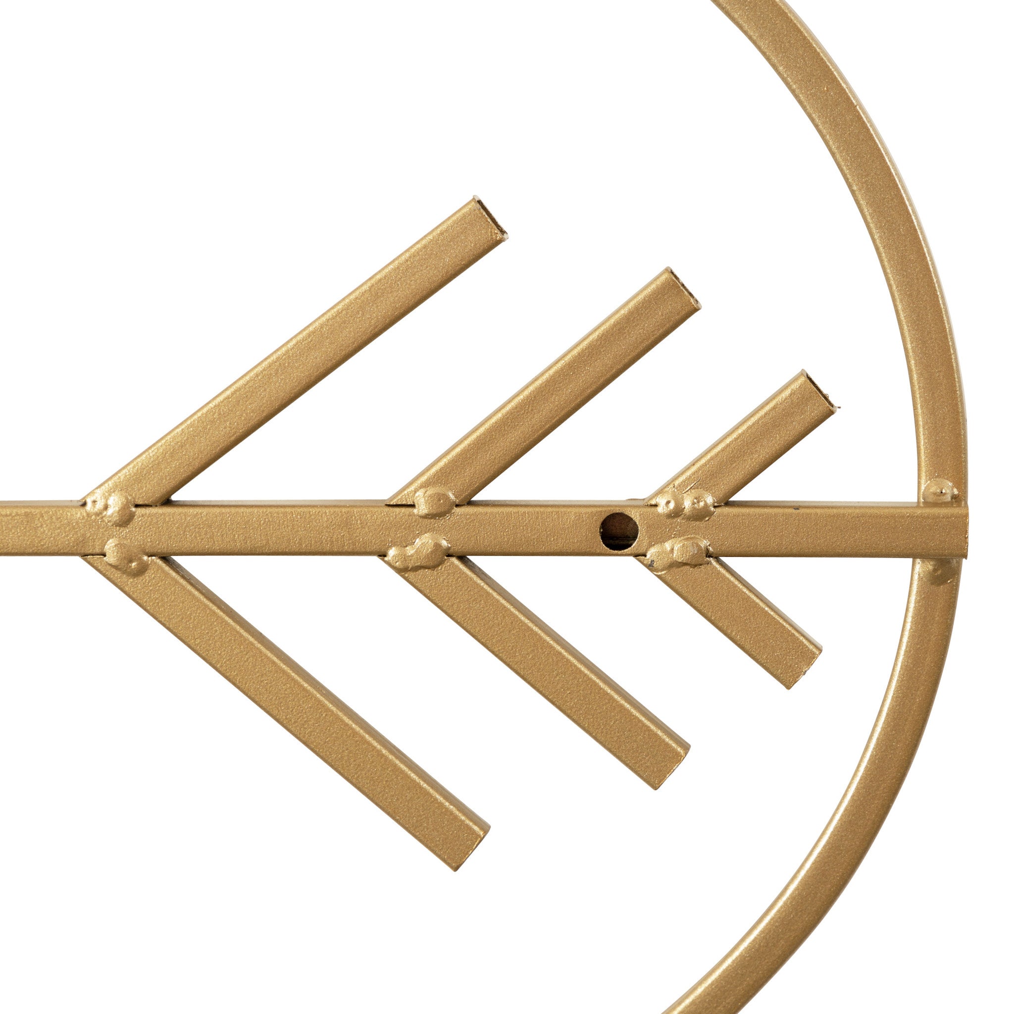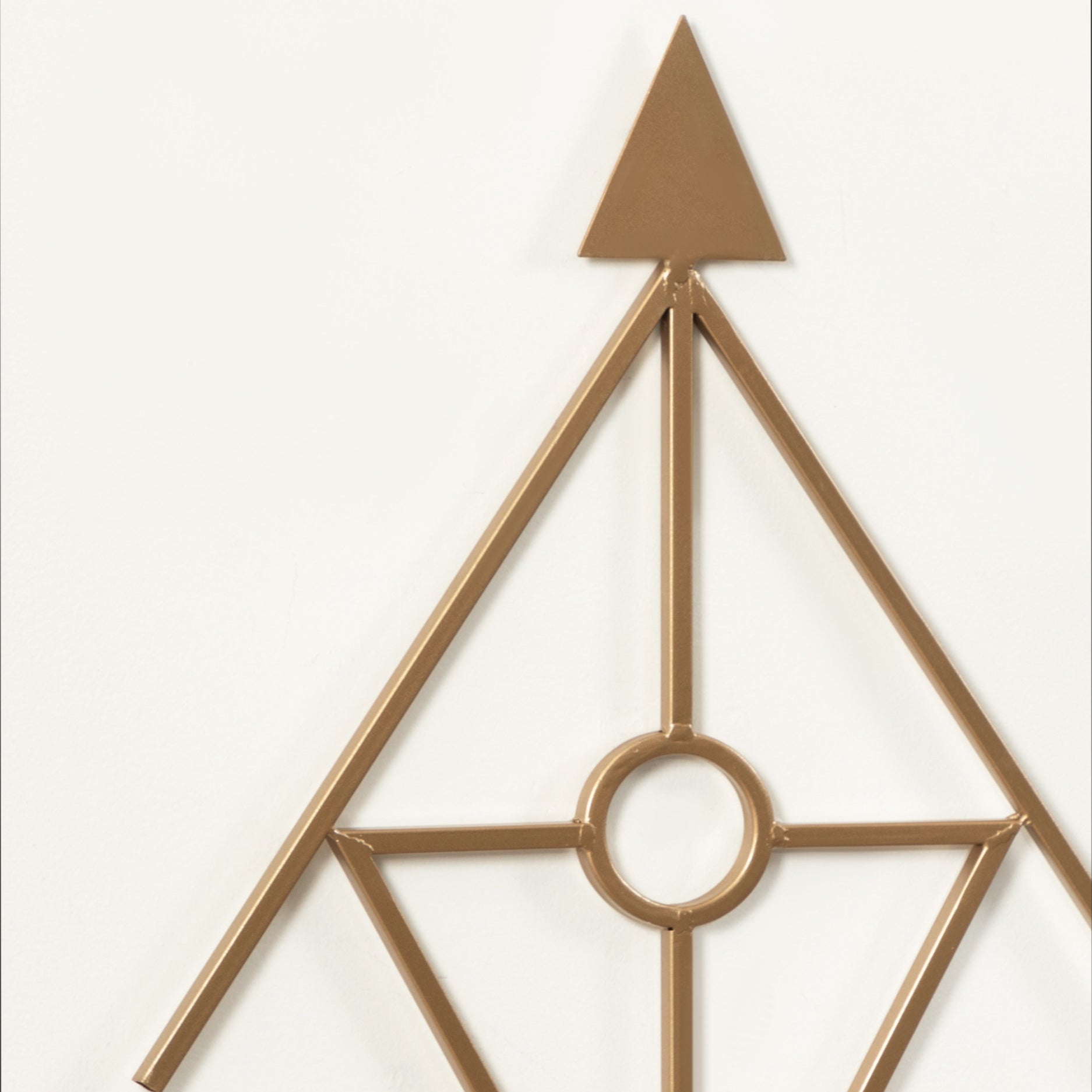 Enhance the bohemian beauty of your home decor scheme with the elegant Benta gold wall art plaque. This beautiful accent piece highlights your bold and worldly taste with its unique design. The Benta utilizes geometric shapes that take the overall form of an arrow to elicit the beauty and fascinating culture of centuries past. This piece of metal wall decor is constructed from robust iron material, providing long-lasting resiliency and premium quality that is made for years of decadent display. The gold finish on this piece of boho decor provides a certain elegance and sleekness to your favorite living space. This lovely accent piece highlights your unique taste while creating a commanding presence with its large size. The overall display dimensions of this charming accent piece are 36 inches wide by 17.5 inches tall, making the Benta a dynamic accent piece to give your wall life and depth. Hang this beautiful wall decor piece among your entryway, bathroom, living room, or bedroom decor easily with the metal hangers conveniently attached to the back of the Benta.