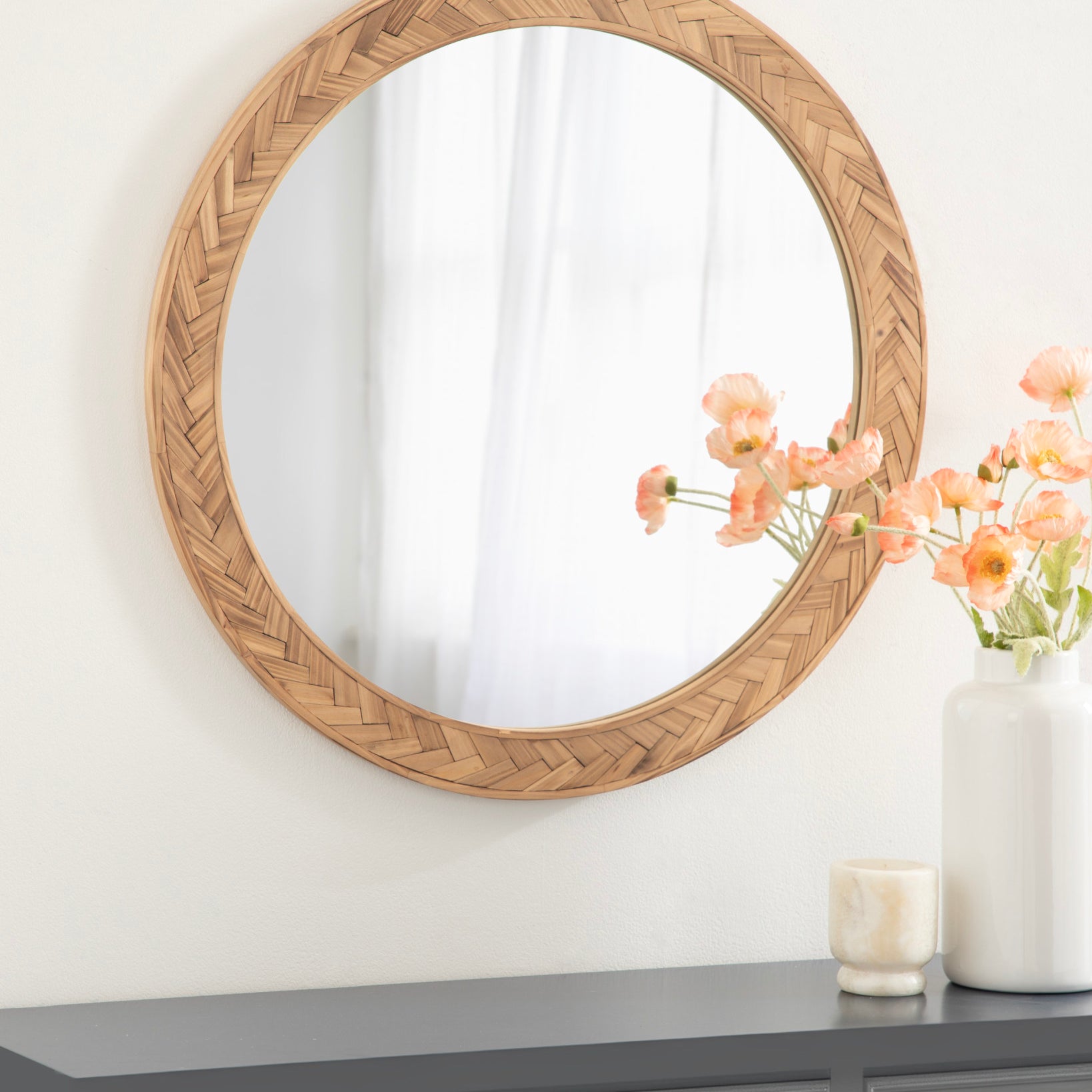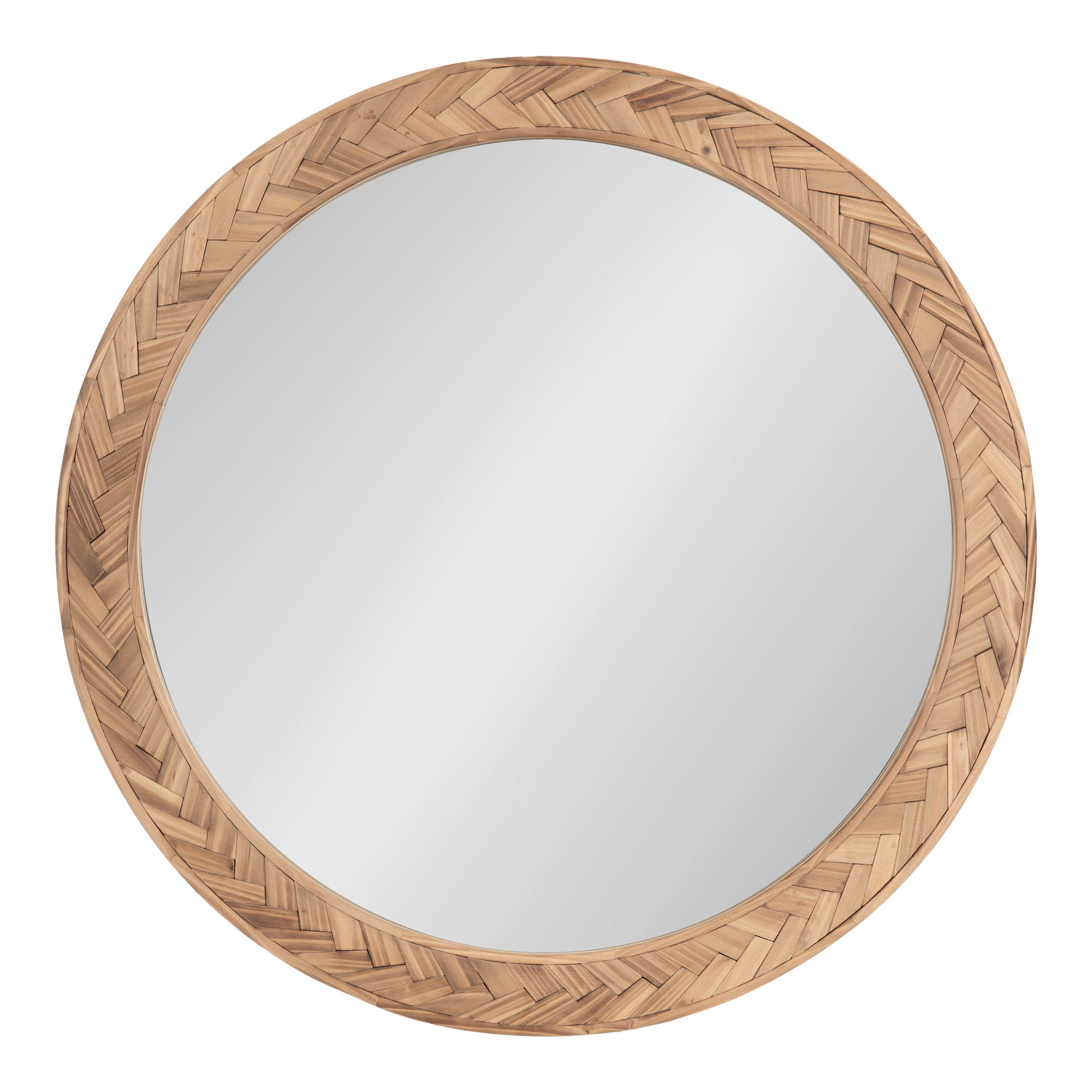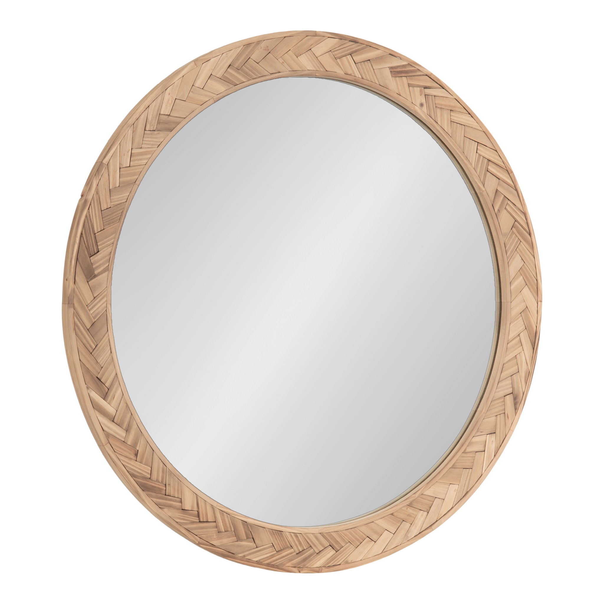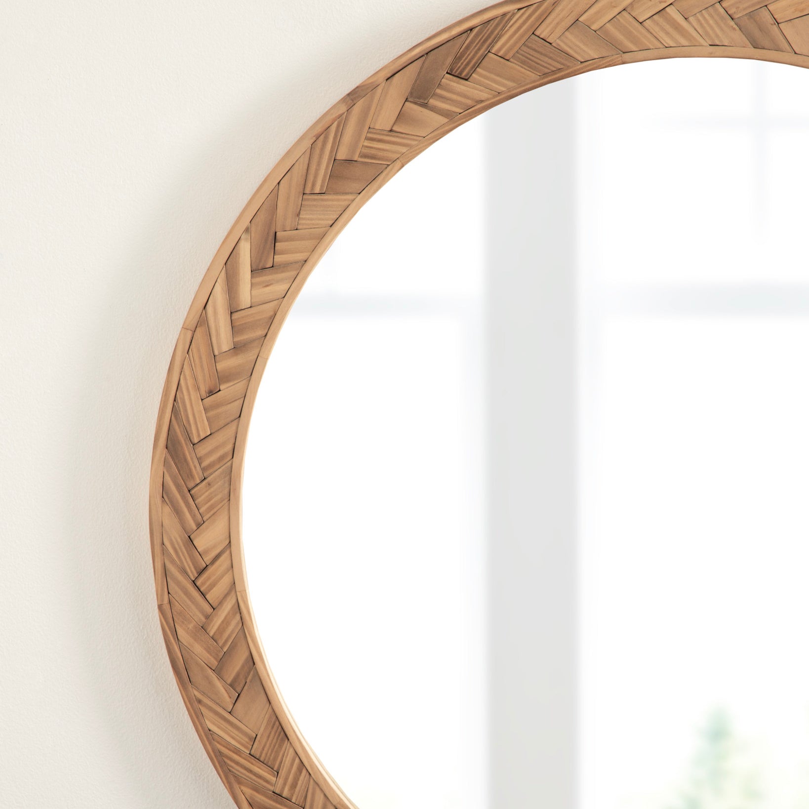 Create a coastal aesthetic in your home with this eclectic, natural Braywood mirror. This beautiful mirror is the epitome of organic modern design, featuring a unique pieced wood look on the frame that pops off the wall. The trendy chevron-patterned frame is made from solid wood, showing off its rich, authentic look through organic wood grain variations. The classic round shape emphasizes its unique look with a dash of modernity to showcase a geometric and trendy style on any wall. This coastal mirror features a sizable reflective surface, providing an accent piece that adds vibrancy and openness to any room of your home. Hang the coastal Braywood wall mirror in a matter of minutes with the convenient D-ring hangers attached to the back of the frame.
