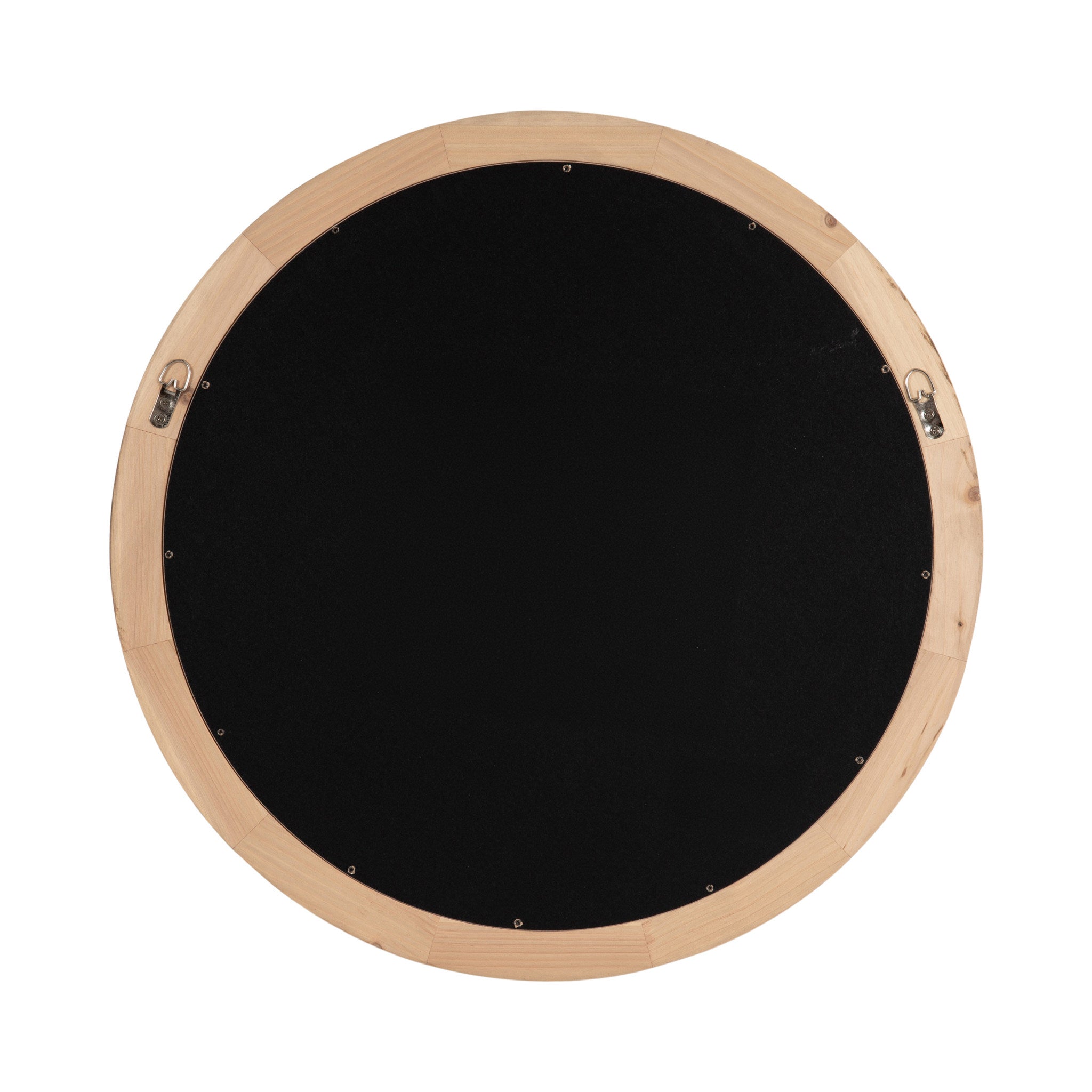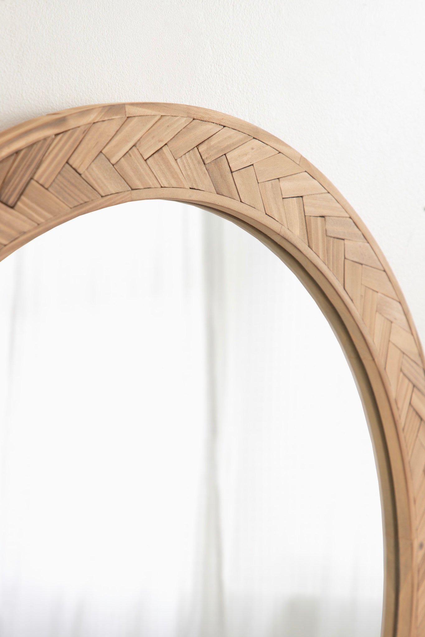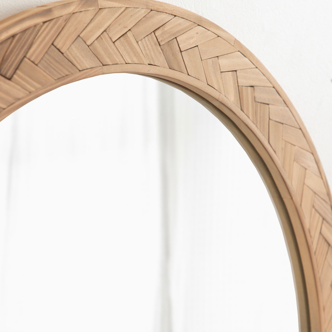 Create a coastal aesthetic in your home with this eclectic, natural Braywood mirror. This beautiful mirror is the epitome of organic modern design, featuring a unique pieced wood look on the frame that pops off the wall. The trendy chevron-patterned frame is made from solid wood, showing off its rich, authentic look through organic wood grain variations. The classic round shape emphasizes its unique look with a dash of modernity to showcase a geometric and trendy style on any wall. This coastal mirror features a sizable reflective surface, providing an accent piece that adds vibrancy and openness to any room of your home. Hang the coastal Braywood wall mirror in a matter of minutes with the convenient D-ring hangers attached to the back of the frame.