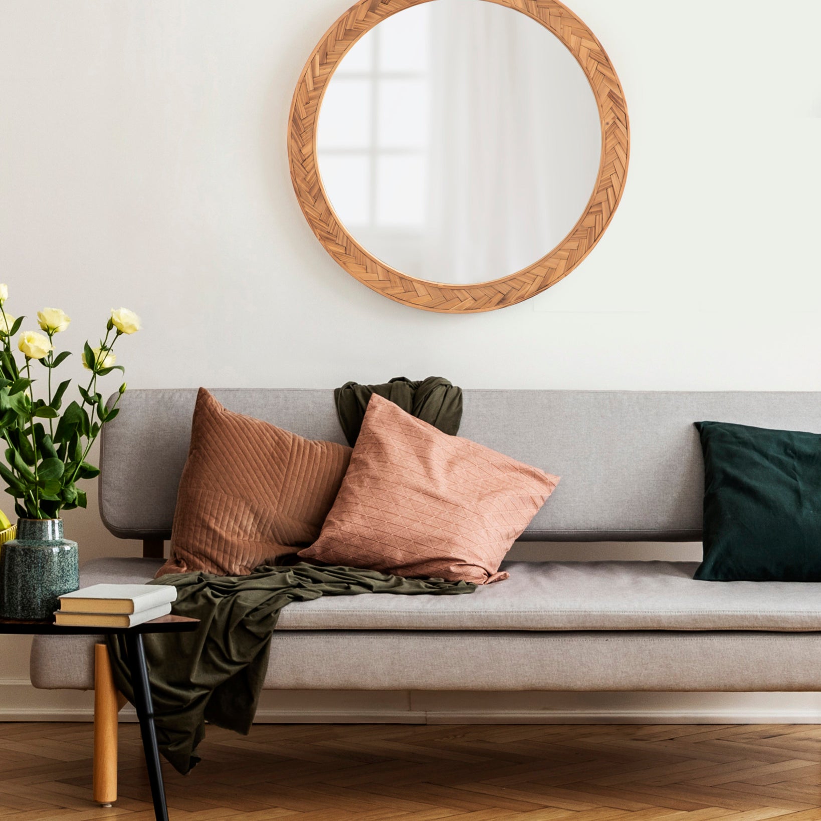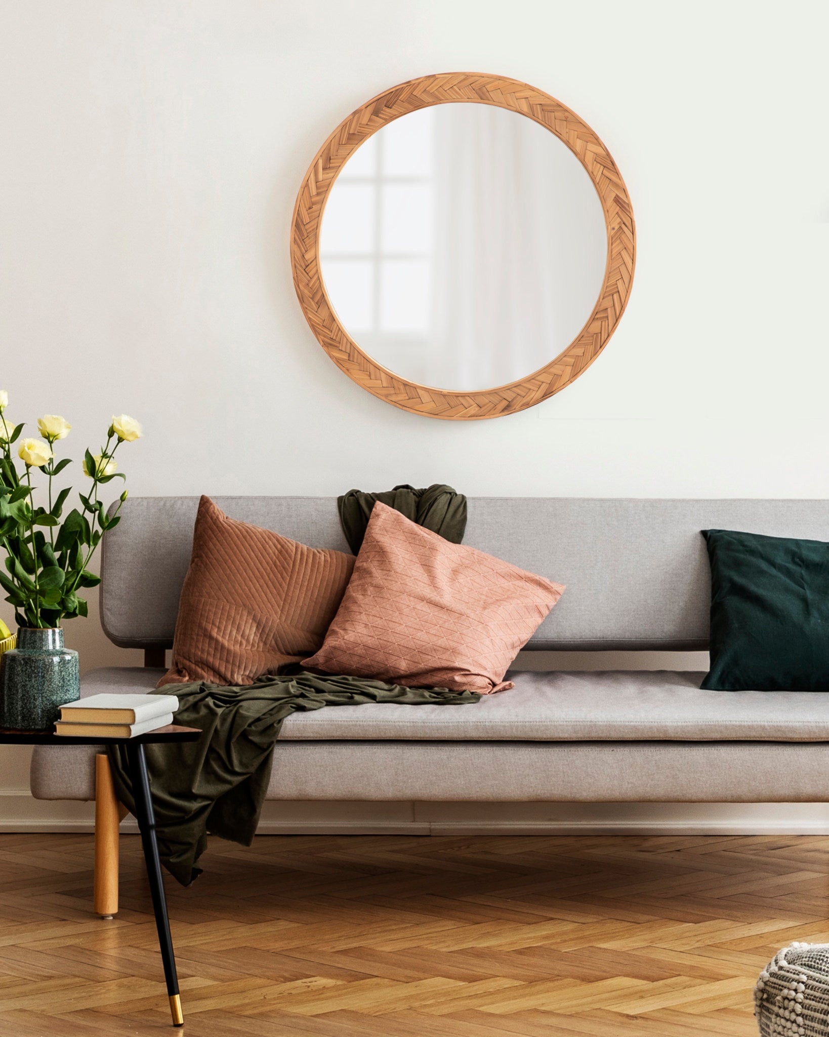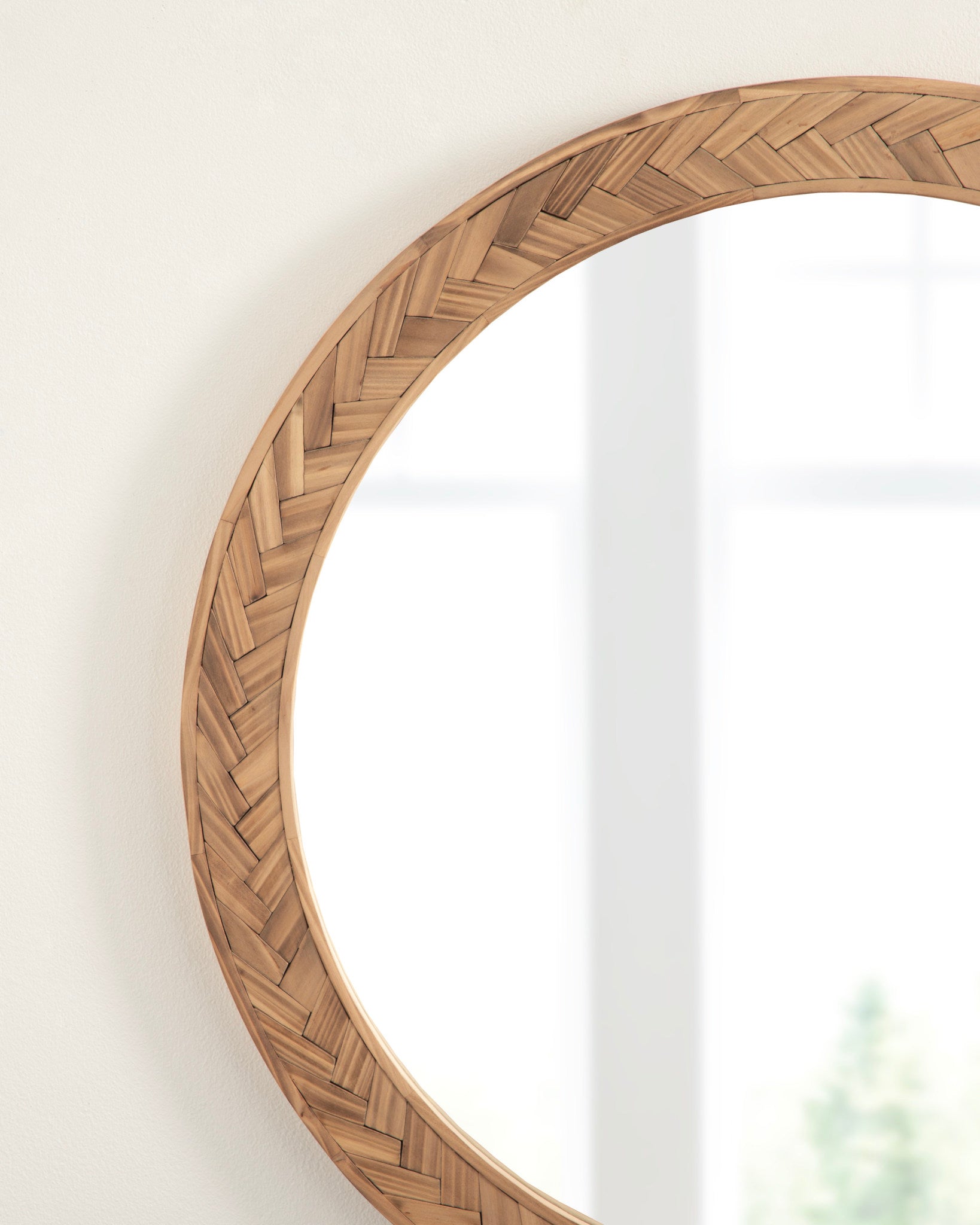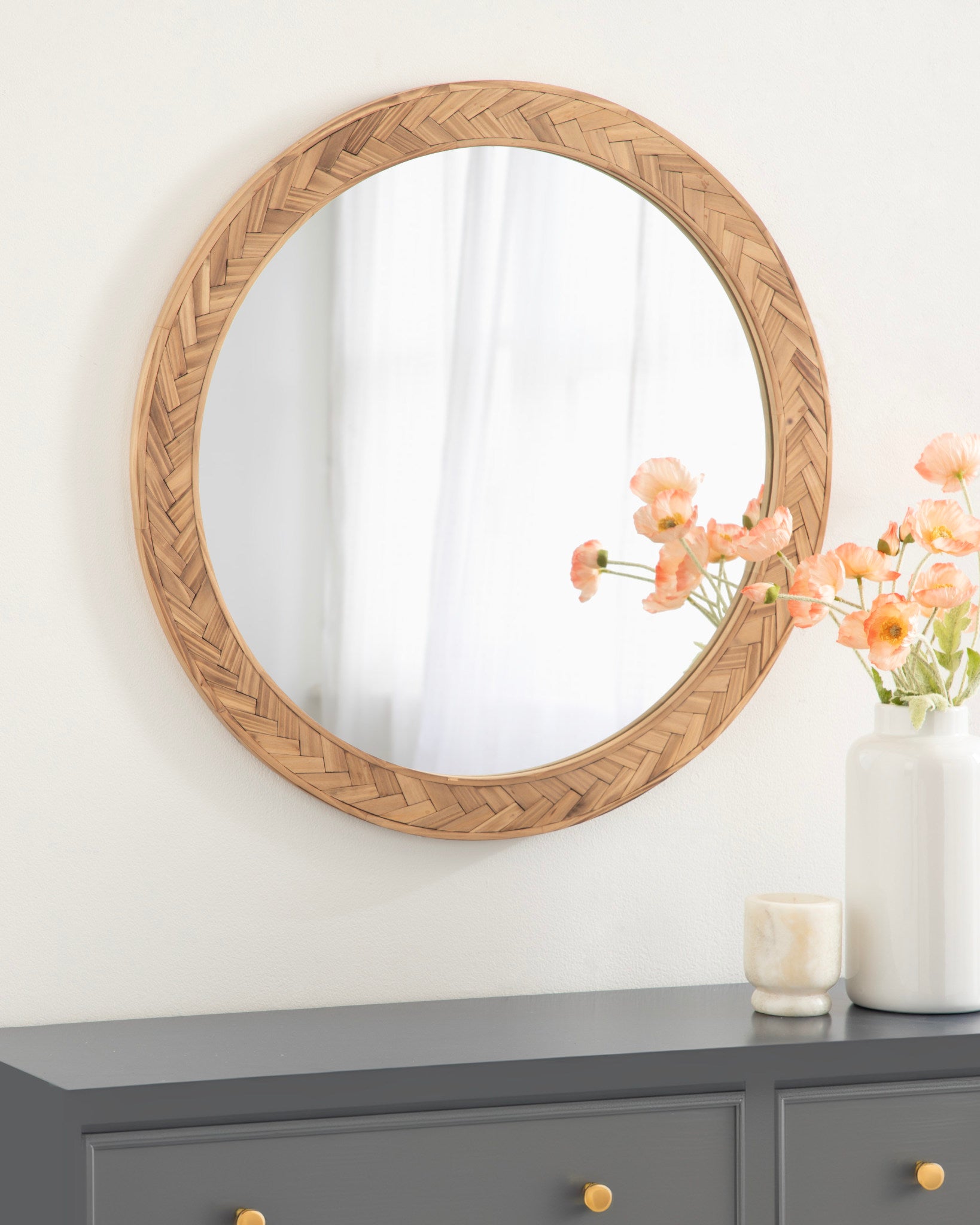 Create a coastal aesthetic in your home with this eclectic, natural Braywood mirror. This beautiful mirror is the epitome of organic modern design, featuring a unique pieced wood look on the frame that pops off the wall. The trendy chevron-patterned frame is made from solid wood, showing off its rich, authentic look through organic wood grain variations. The classic round shape emphasizes its unique look with a dash of modernity to showcase a geometric and trendy style on any wall. This coastal mirror features a sizable reflective surface, providing an accent piece that adds vibrancy and openness to any room of your home. Hang the coastal Braywood wall mirror in a matter of minutes with the convenient D-ring hangers attached to the back of the frame.