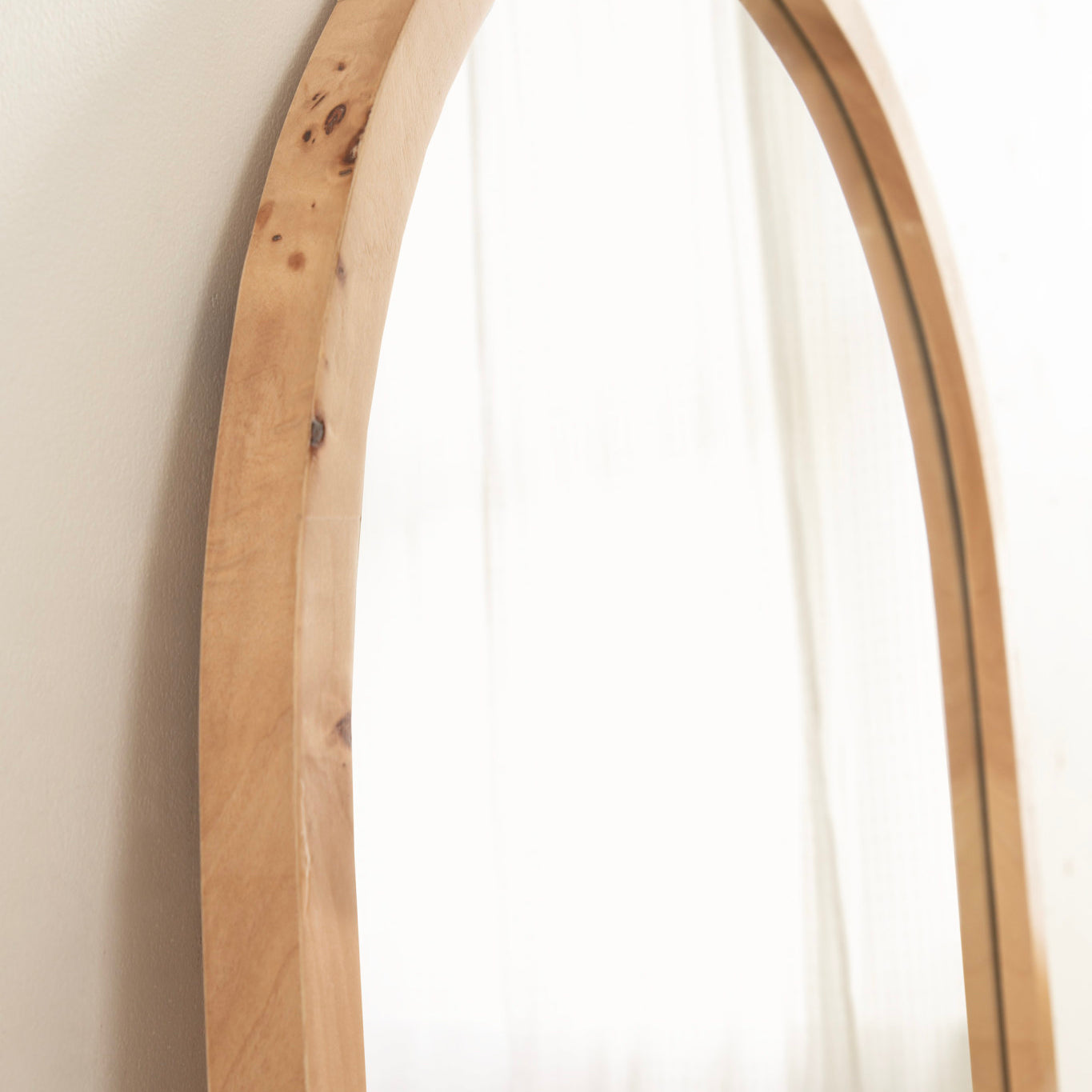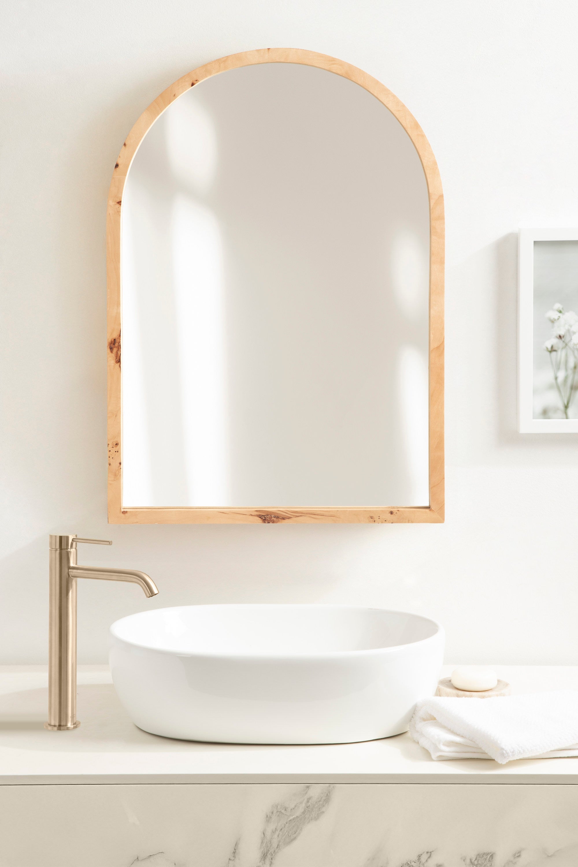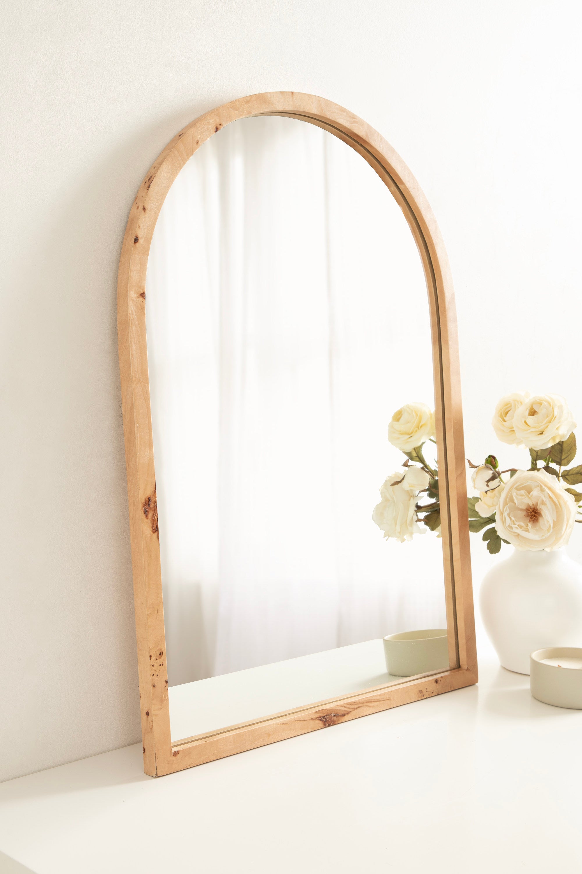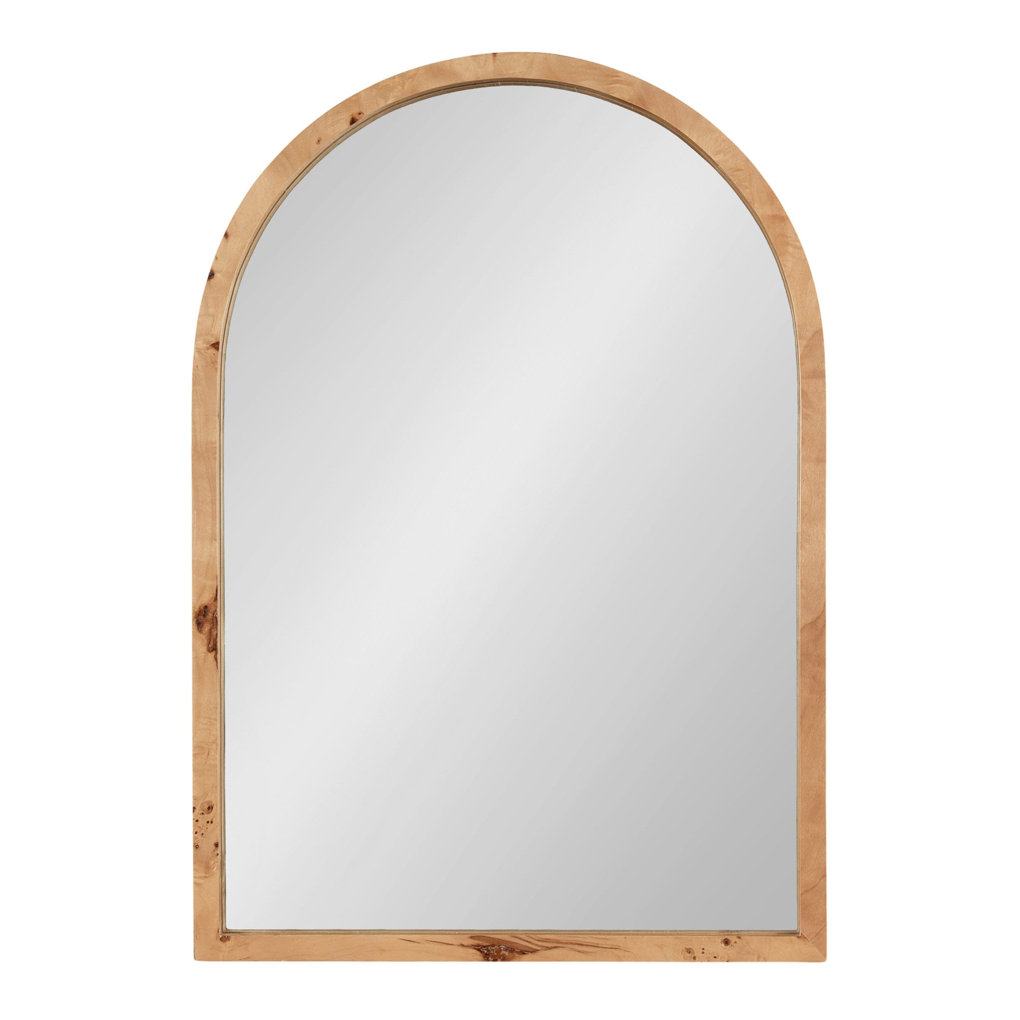 Create a bold focal point that captures the eye and brings light to your space with the Burlock arched mirror from Kate and Laurel. The Burlock utilizes a beautiful burlwood veneer on its arched frame, creating variations in the frame's wood grain with dramatic knotting. The soft arched shape is perfect for creating a symmetrical and inviting accent on your wall. Thanks to the ample surface area, the arch mirror is perfect for use as a bathroom vanity mirror, looking fantastic in a single or double vanity display. As a decorative focal point, this mirror highlights your light sources, enhancing the vibrancy and dimension in your space and making it appear more open. It's a fabulous accent mirror to hang on its own or in a display of two or three on a wide hallway wall.