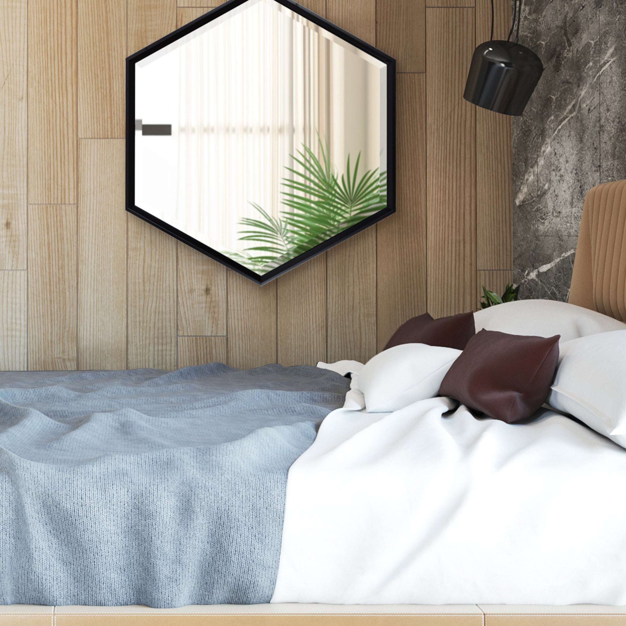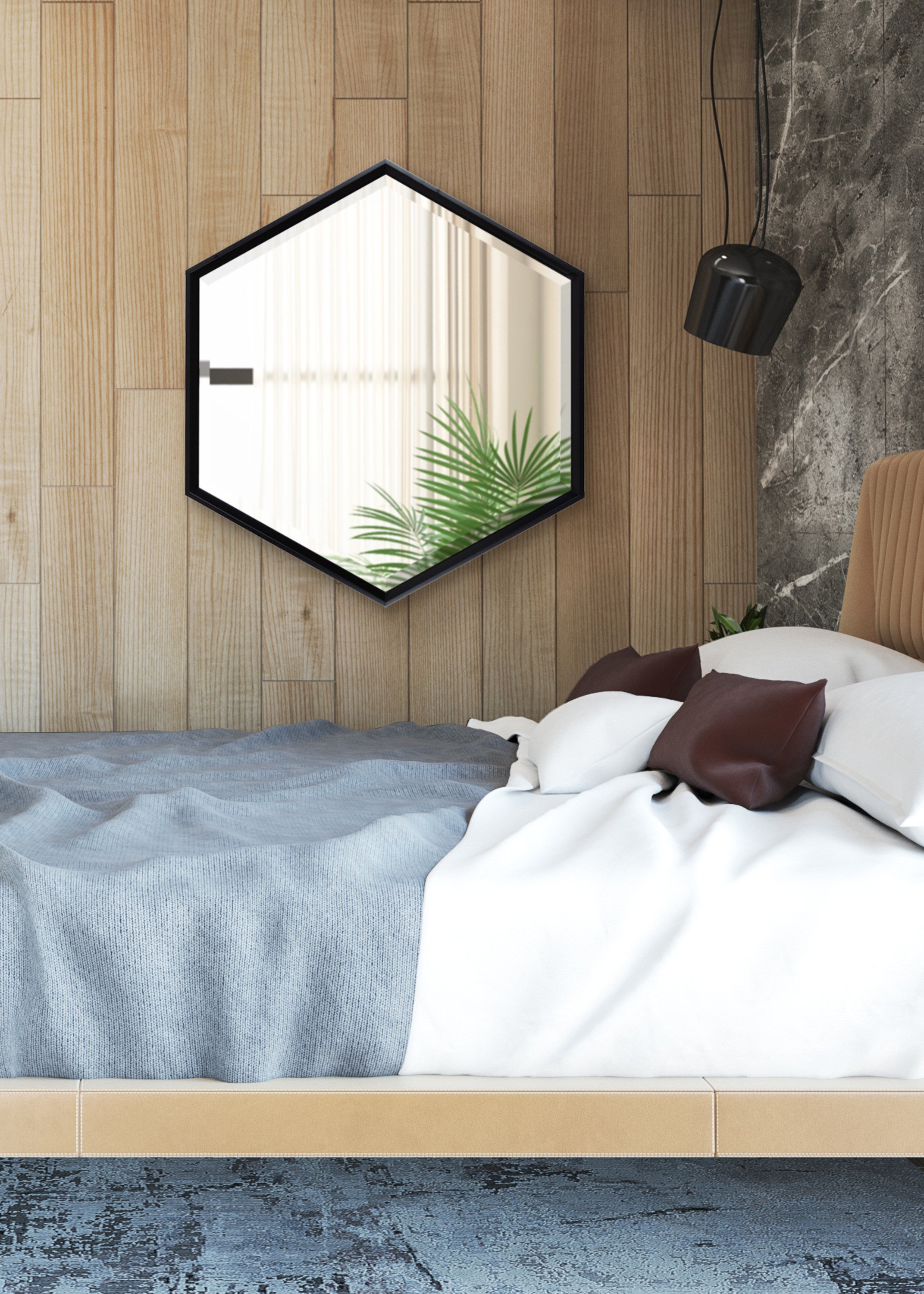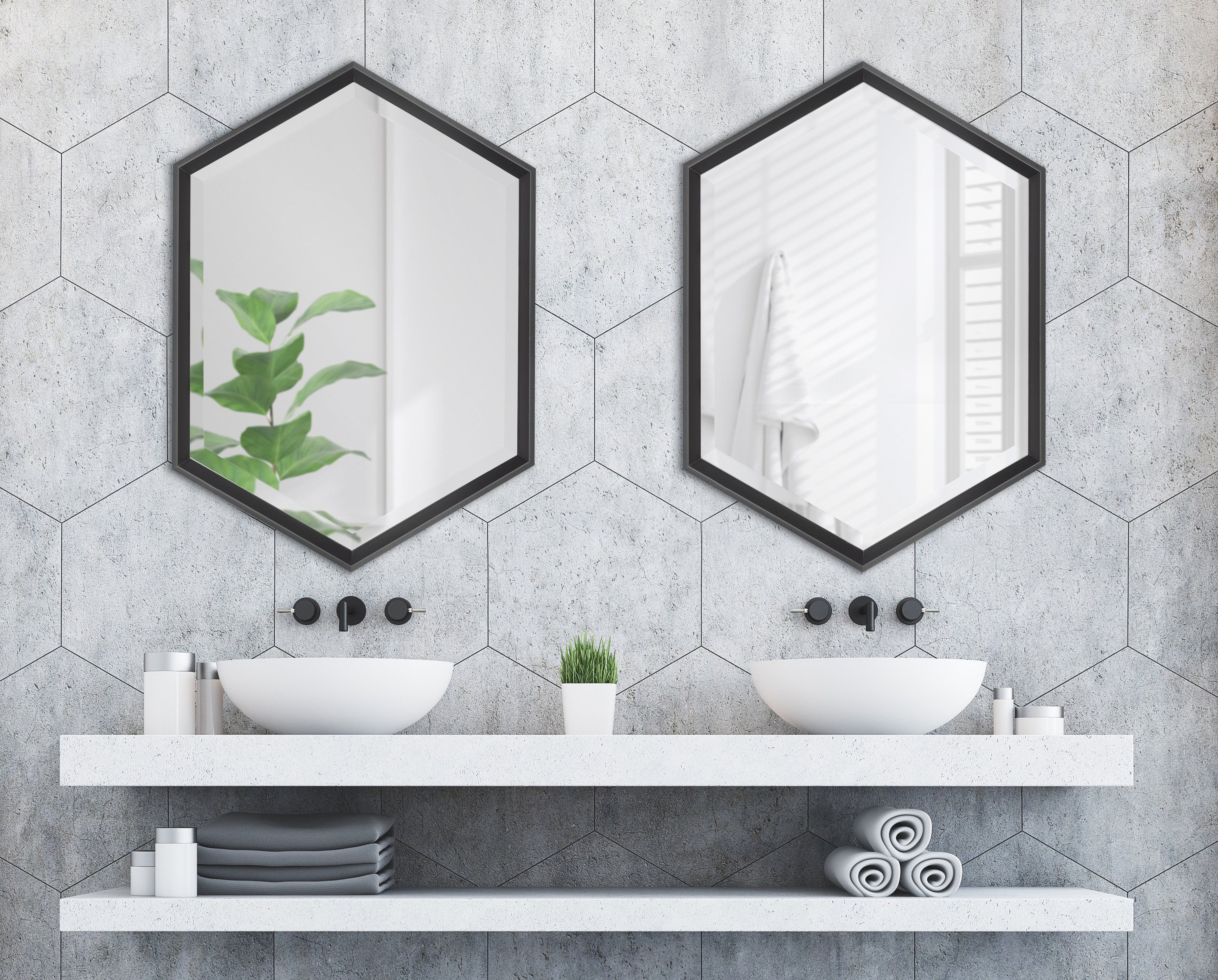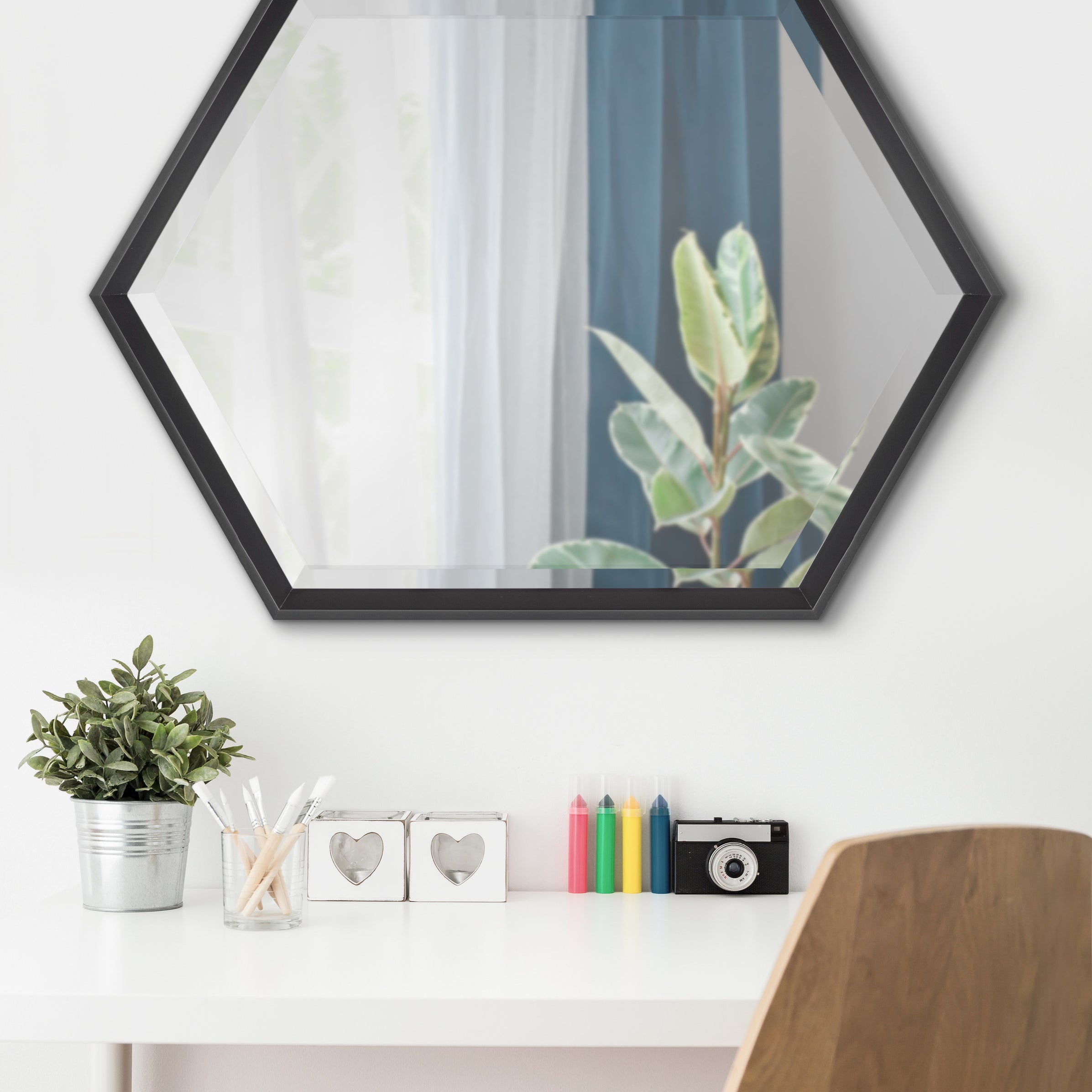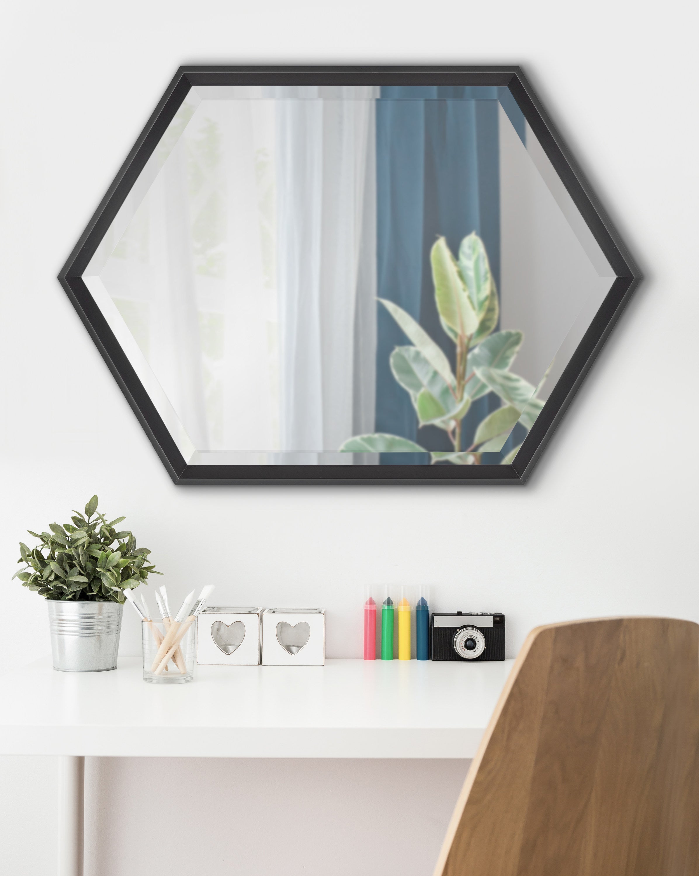 Bring modern geometry into your home with this minimalist wall mirror. The Calter mirror features a stunning hexagon shape in a variety of finishes to create the ultimate wall decor that suits a variety of aesthetics. Use it as a chic bathroom vanity, or as a decorative statement in your living room, bedroom, entryway, or dining room.