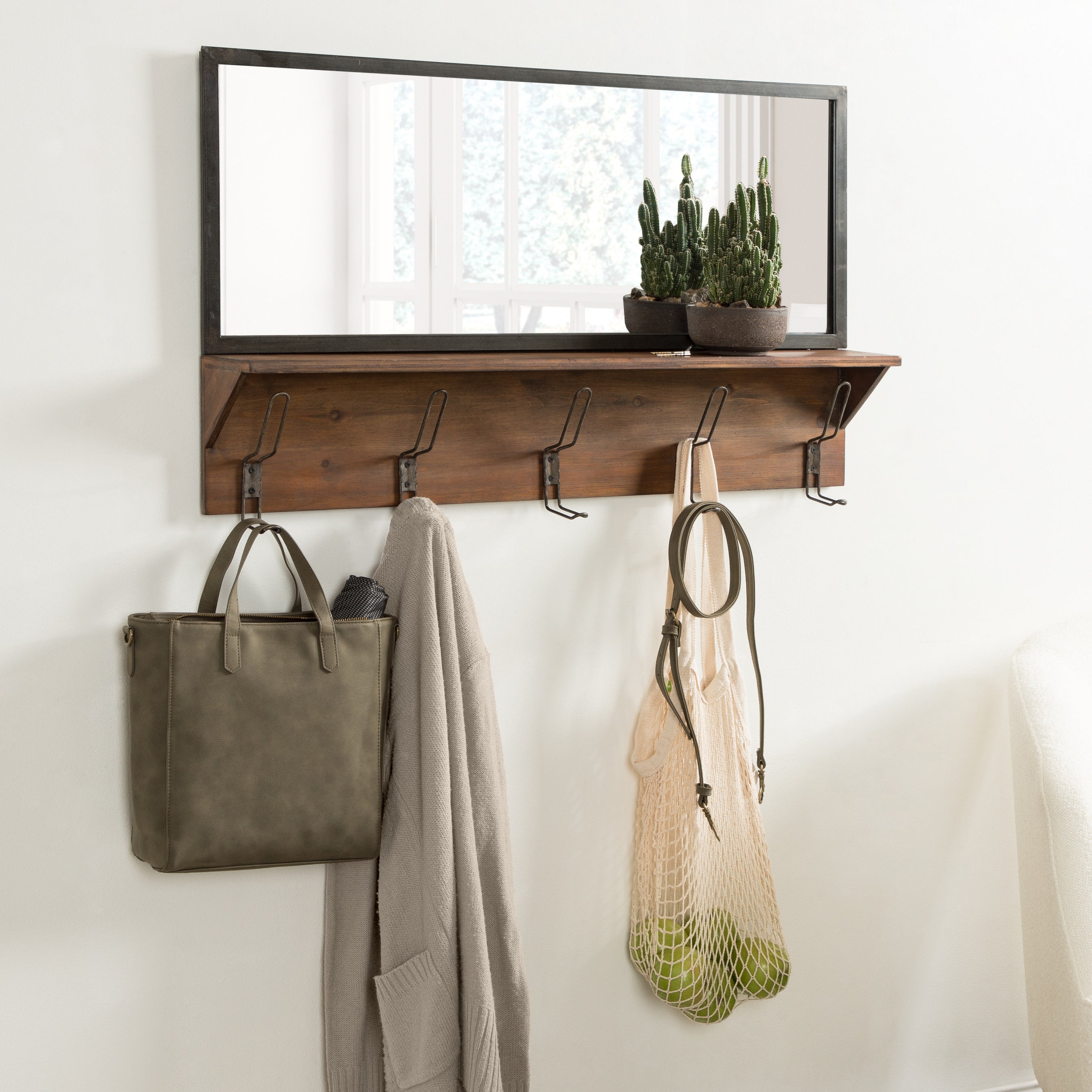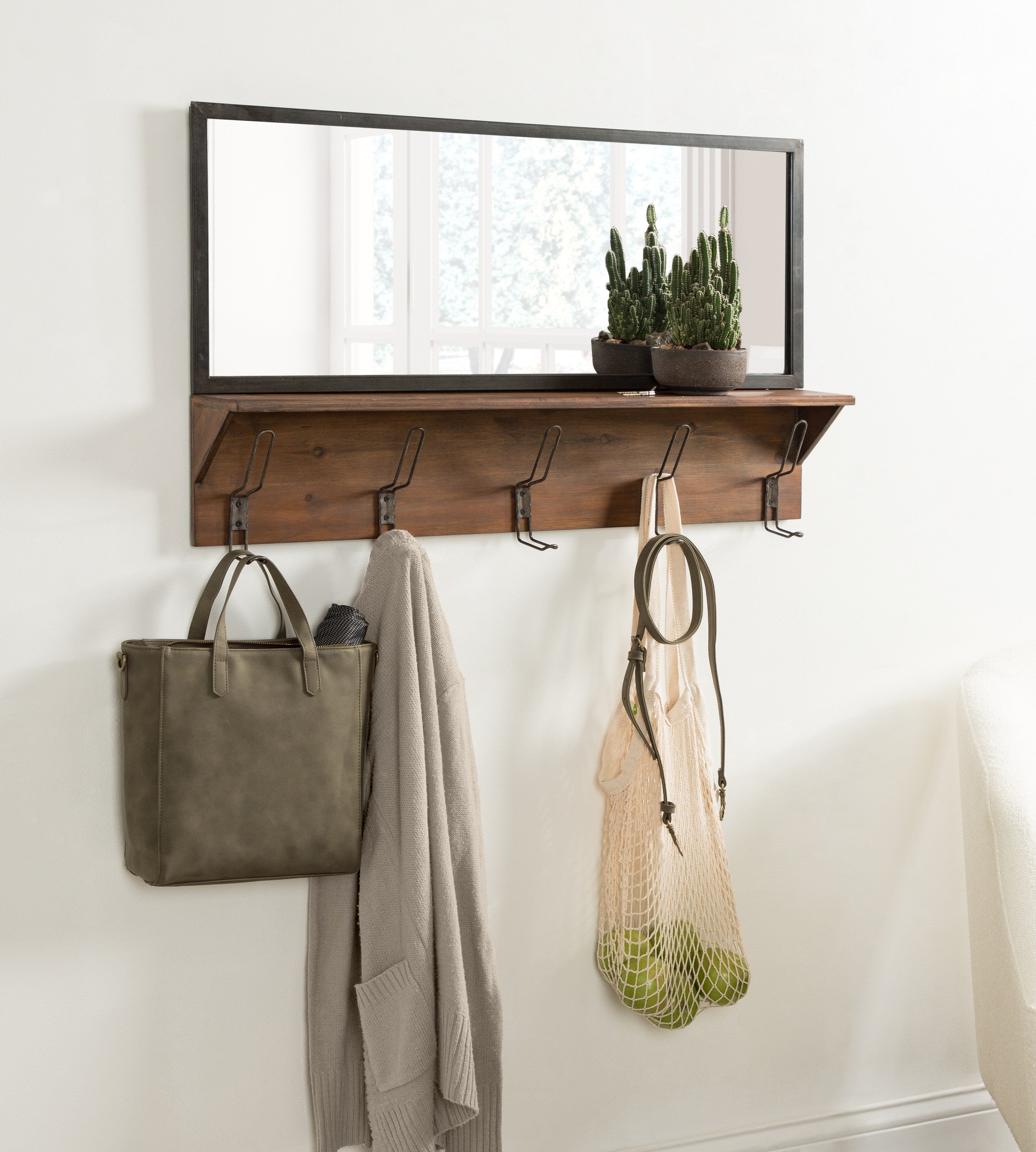 Decorate your home with a wall accent that blends modern functionality with farmhouse aesthetics. The Coburn pub mirror features a minimal, rectangular mirror with a wood shelf and five hooks. The Coburn's reflective glass adds vibrancy and dimension to your space, while the shelf and hooks create a catch-all space for household necessities. It's fantastic for a living room, entryway, bedroom, or bathroom, creating an open concept while providing a space for wallets, keys, robes, and coats.