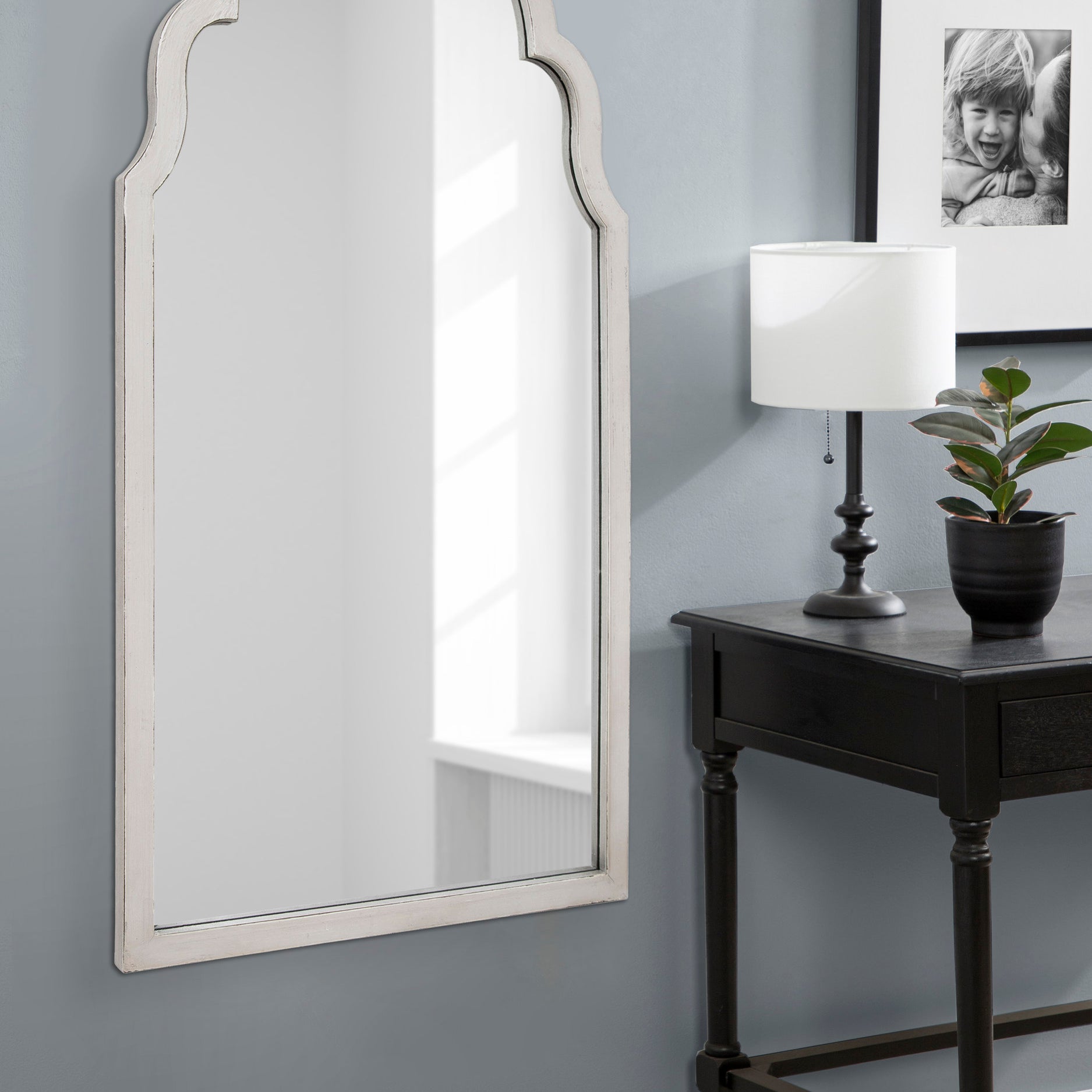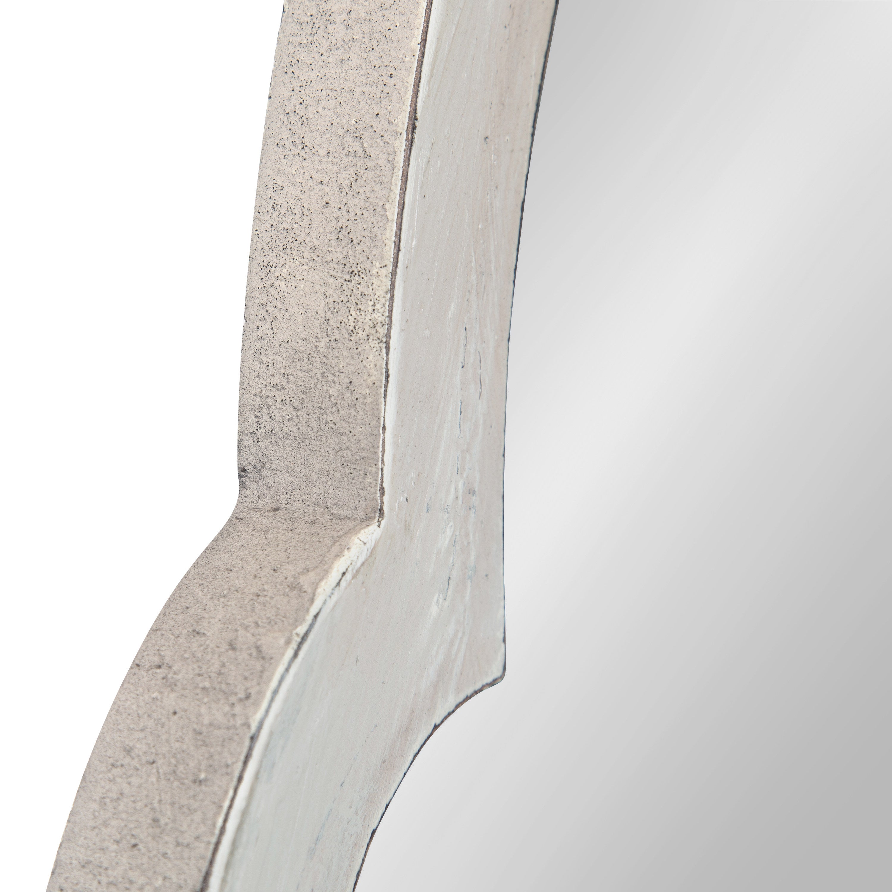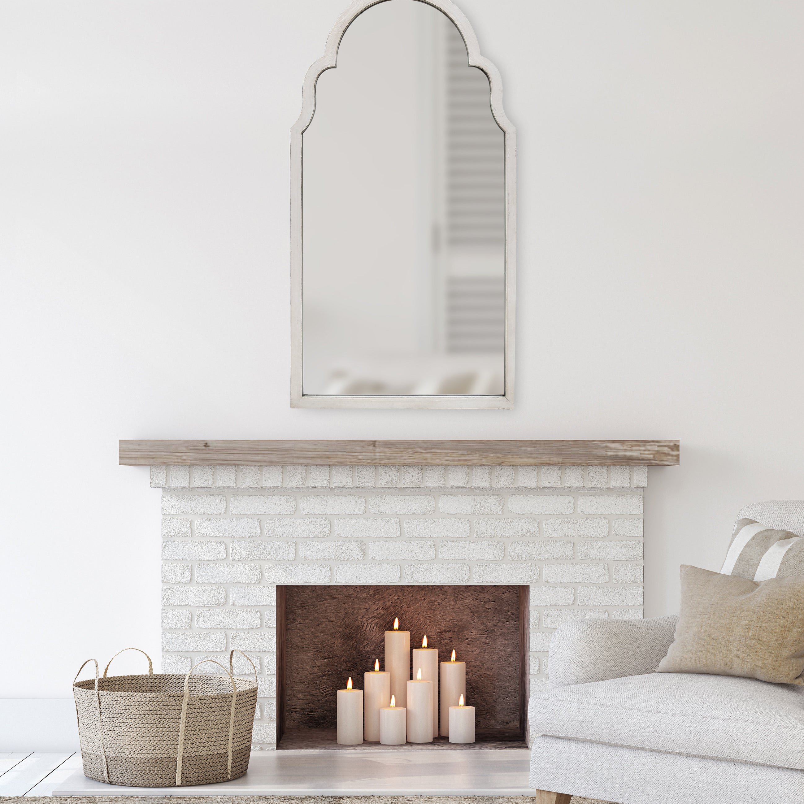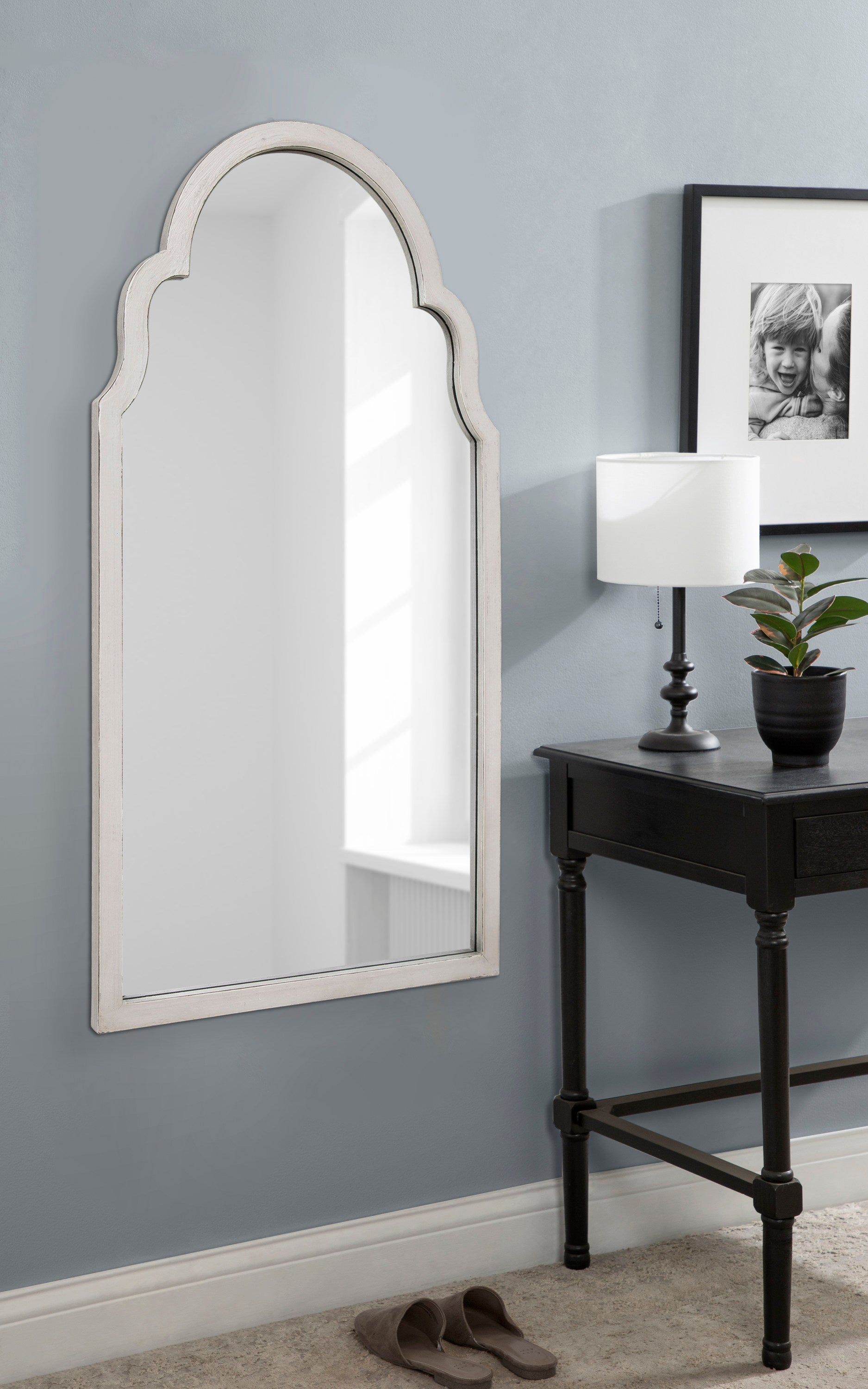 Inspired by Moroccan architecture, the Damara arched mirror will bring chic, vintage design to your wall with its bold shape and farmhouse style. Crafted with a scalloped shape and finished in a classic distressed vintage white, the exotic style of this mirror creates an intriguing statement above a headboard, sofa, fireplace, or in an entryway. Use it to ignite the conversation at your next gathering white increasing the vibrancy of the space with its large design.