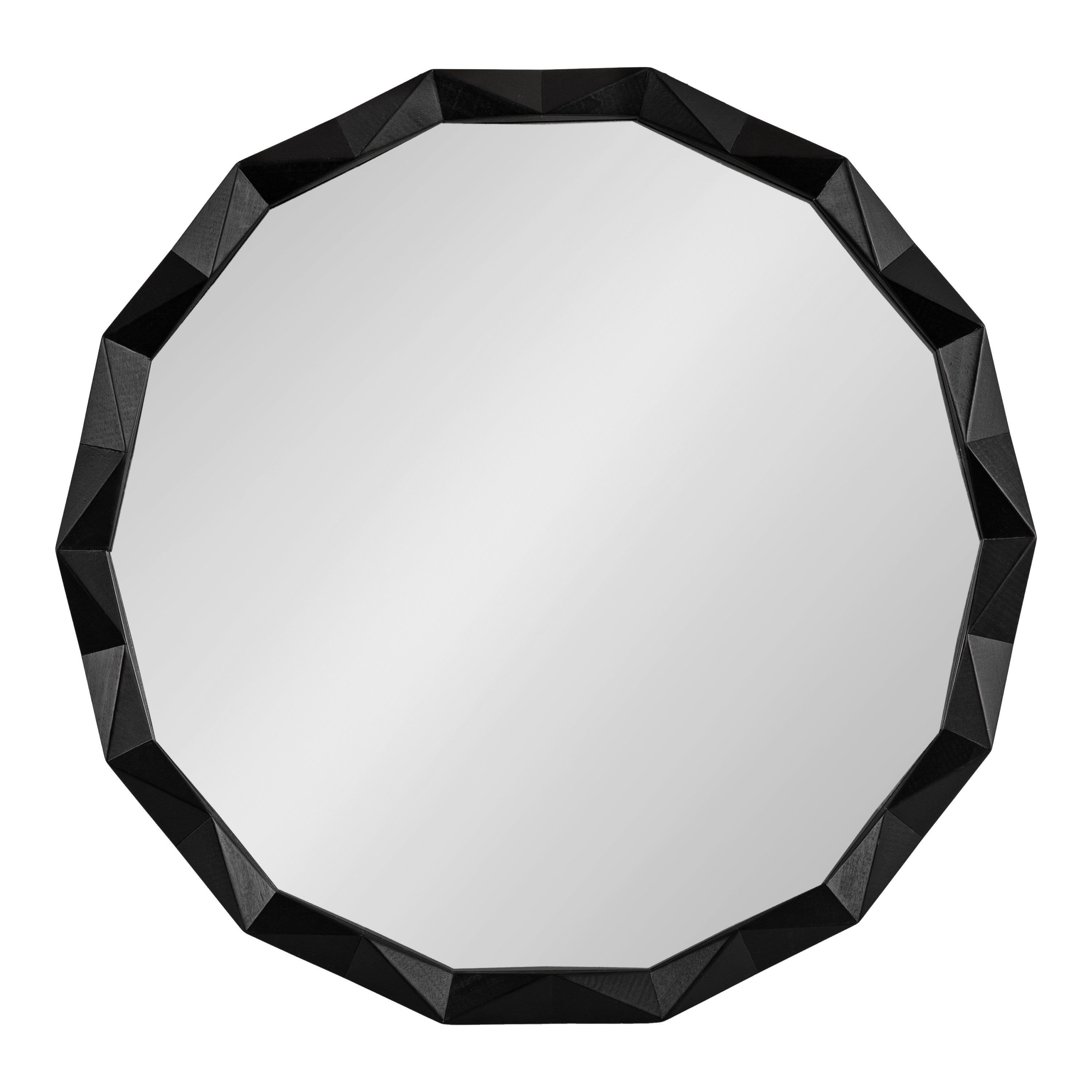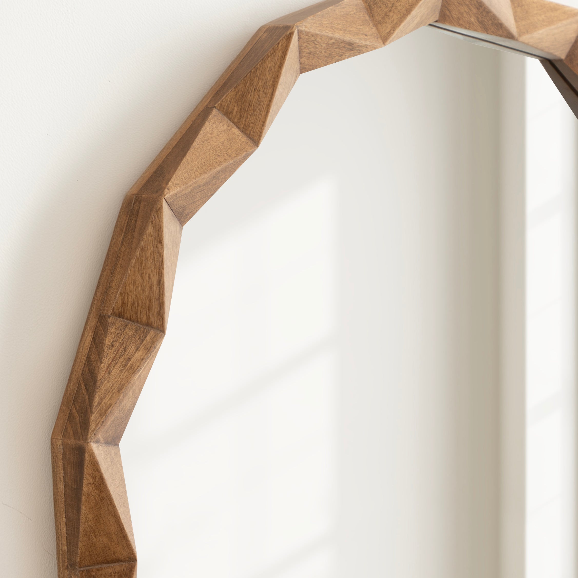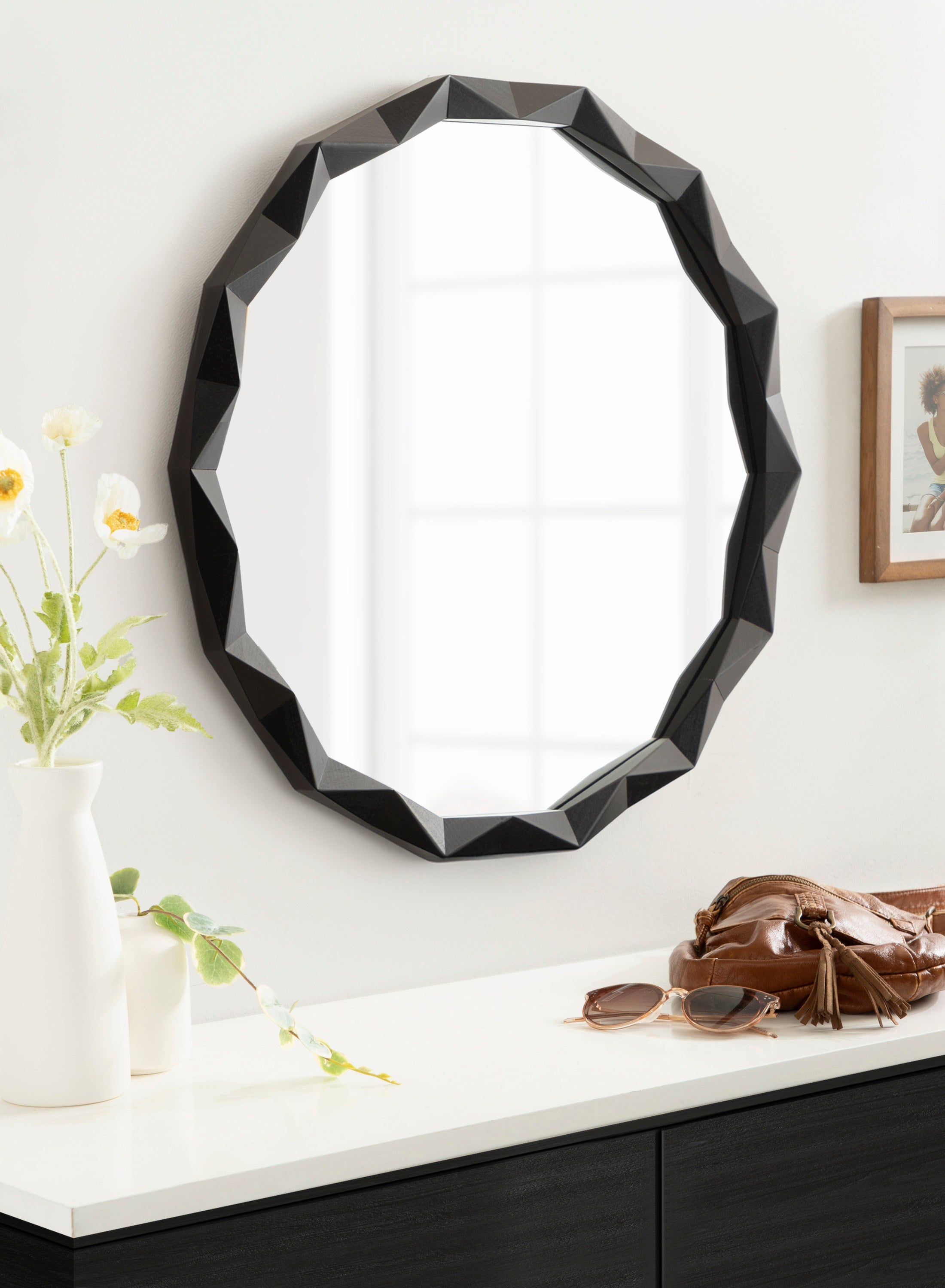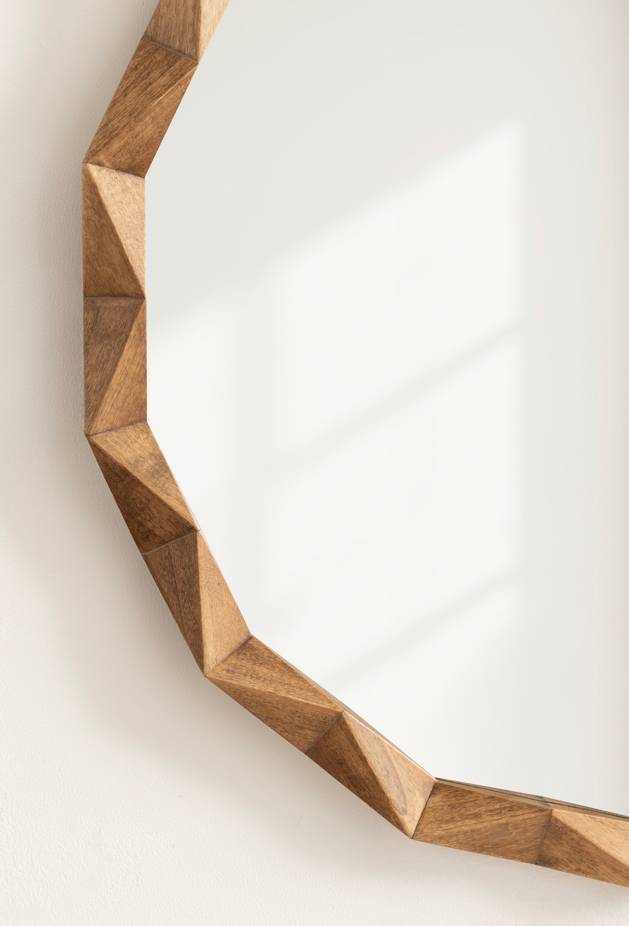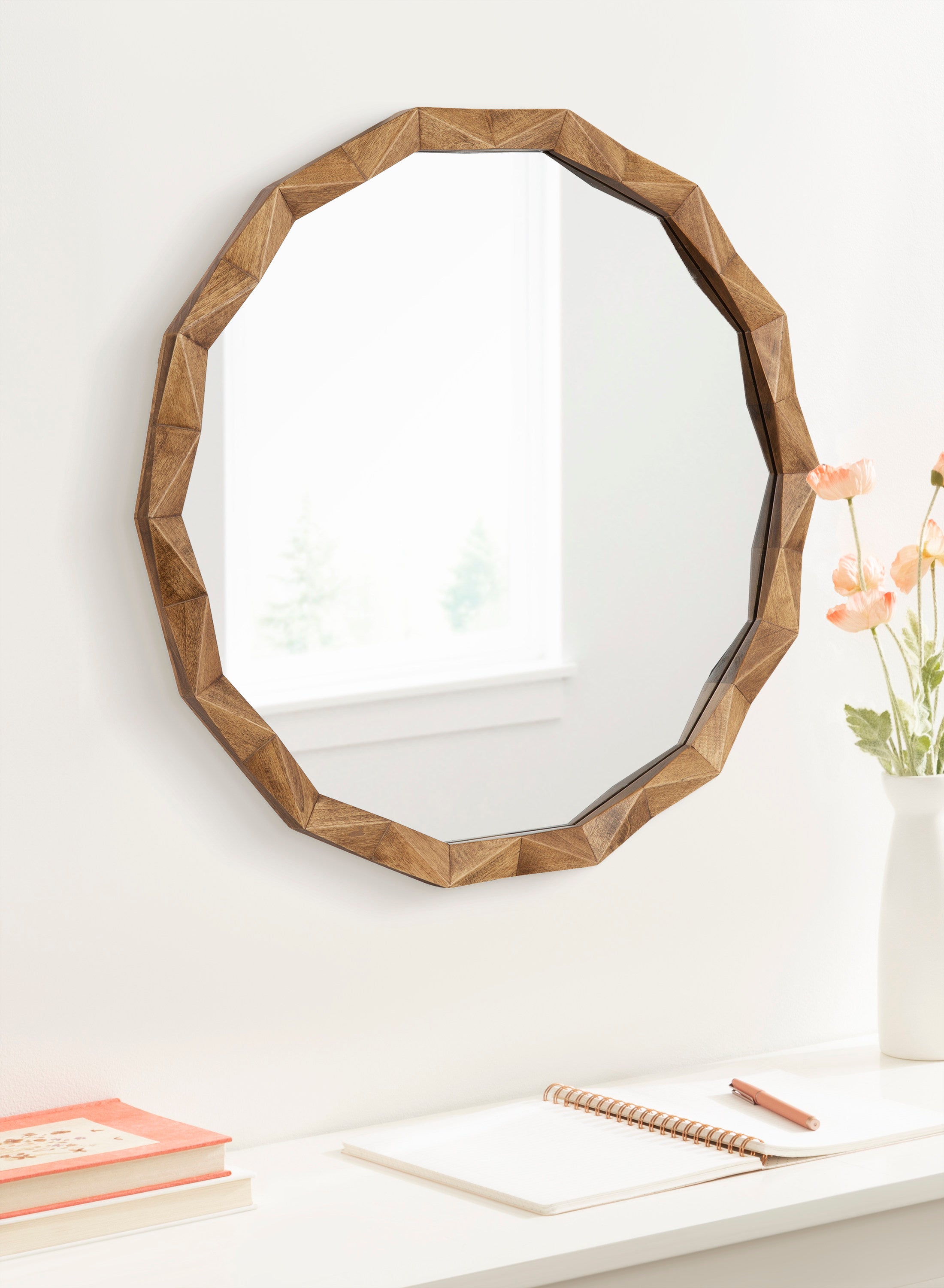 Crafted with the utmost care, this round mirror boasts a solid poplar wood frame that ensures durability and longevity. The frame profile of this wall mirror has a unique, faceted edge crafted from pieced wood segments. Not only is this mirror visually appealing, but it also serves a practical purpose. Hang it in your living room, bedroom, or entryway to create an illusion of a larger space, and to effortlessly check your appearance before heading out. The Endicott geometric round mirror is designed to make your home feel brighter and more spacious. Its faceted mirror shape adds a touch of uniqueness to your wall decor, making it a focal point in any room.