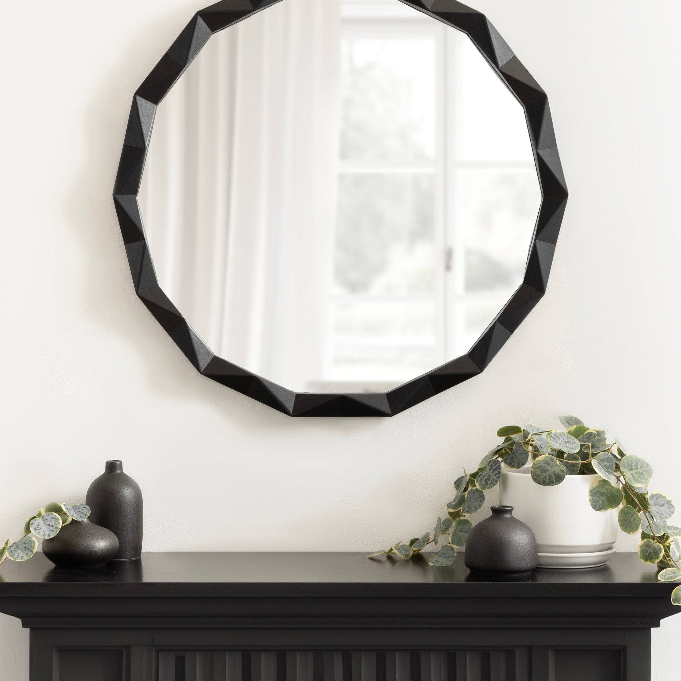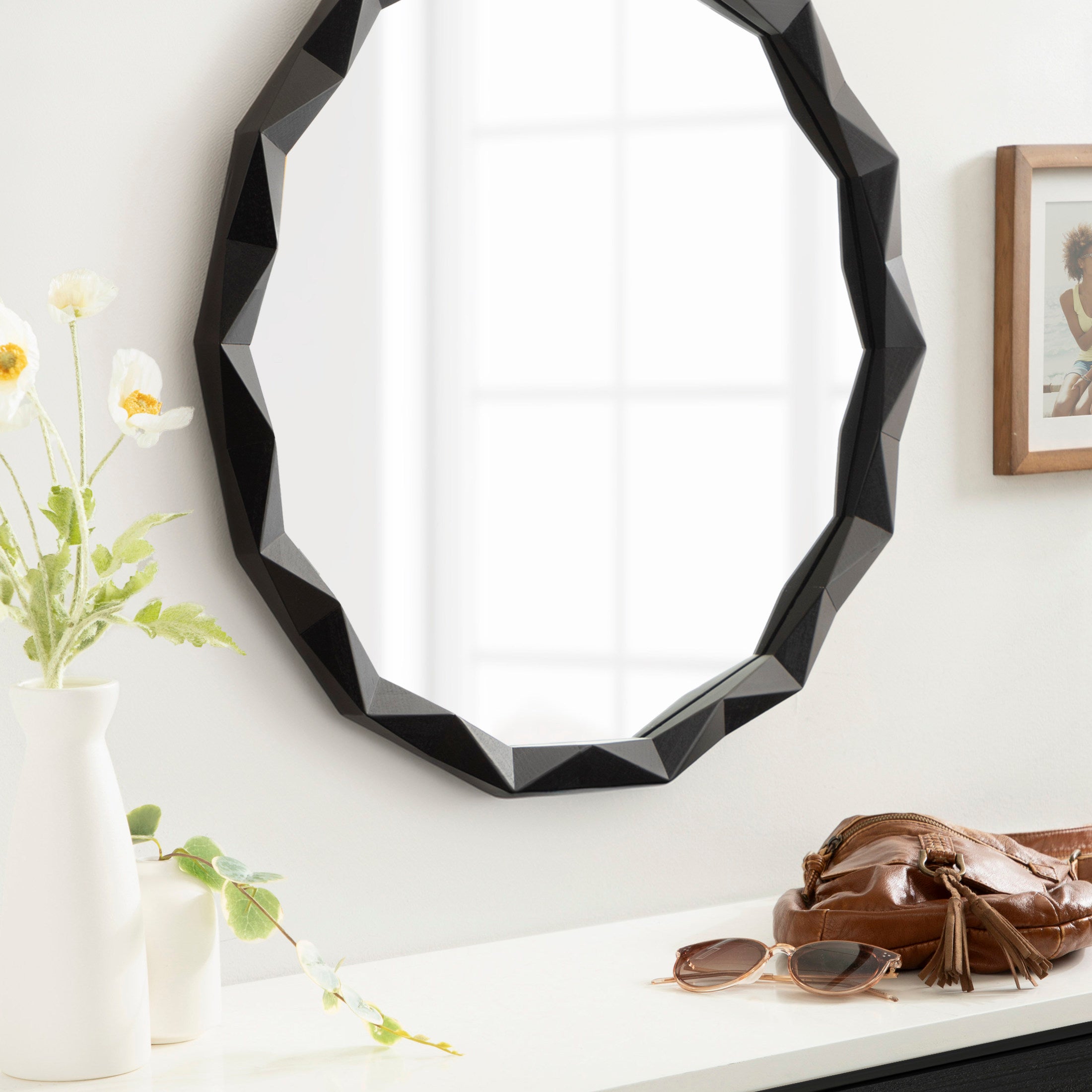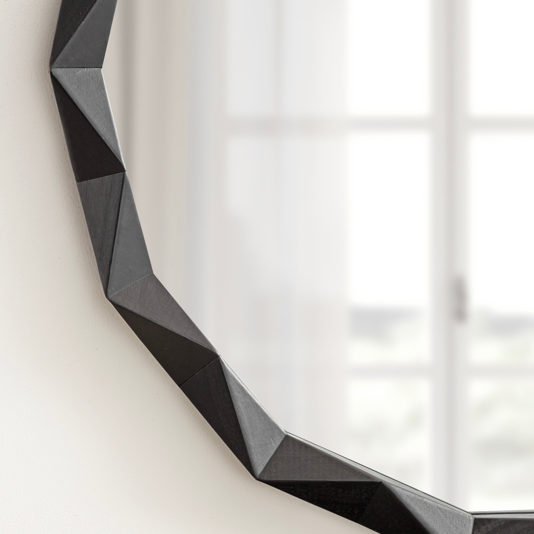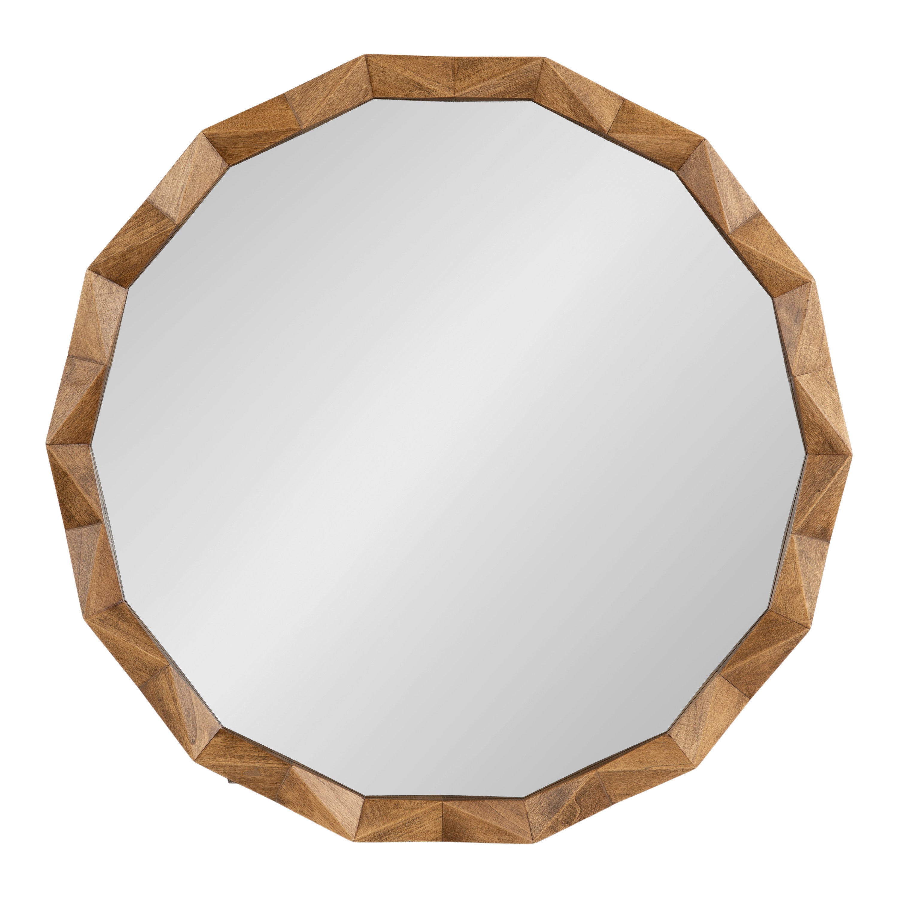 Crafted with the utmost care, this round mirror boasts a solid poplar wood frame that ensures durability and longevity. The frame profile of this wall mirror has a unique, faceted edge crafted from pieced wood segments. Not only is this mirror visually appealing, but it also serves a practical purpose. Hang it in your living room, bedroom, or entryway to create an illusion of a larger space, and to effortlessly check your appearance before heading out. The Endicott geometric round mirror is designed to make your home feel brighter and more spacious. Its faceted mirror shape adds a touch of uniqueness to your wall decor, making it a focal point in any room.