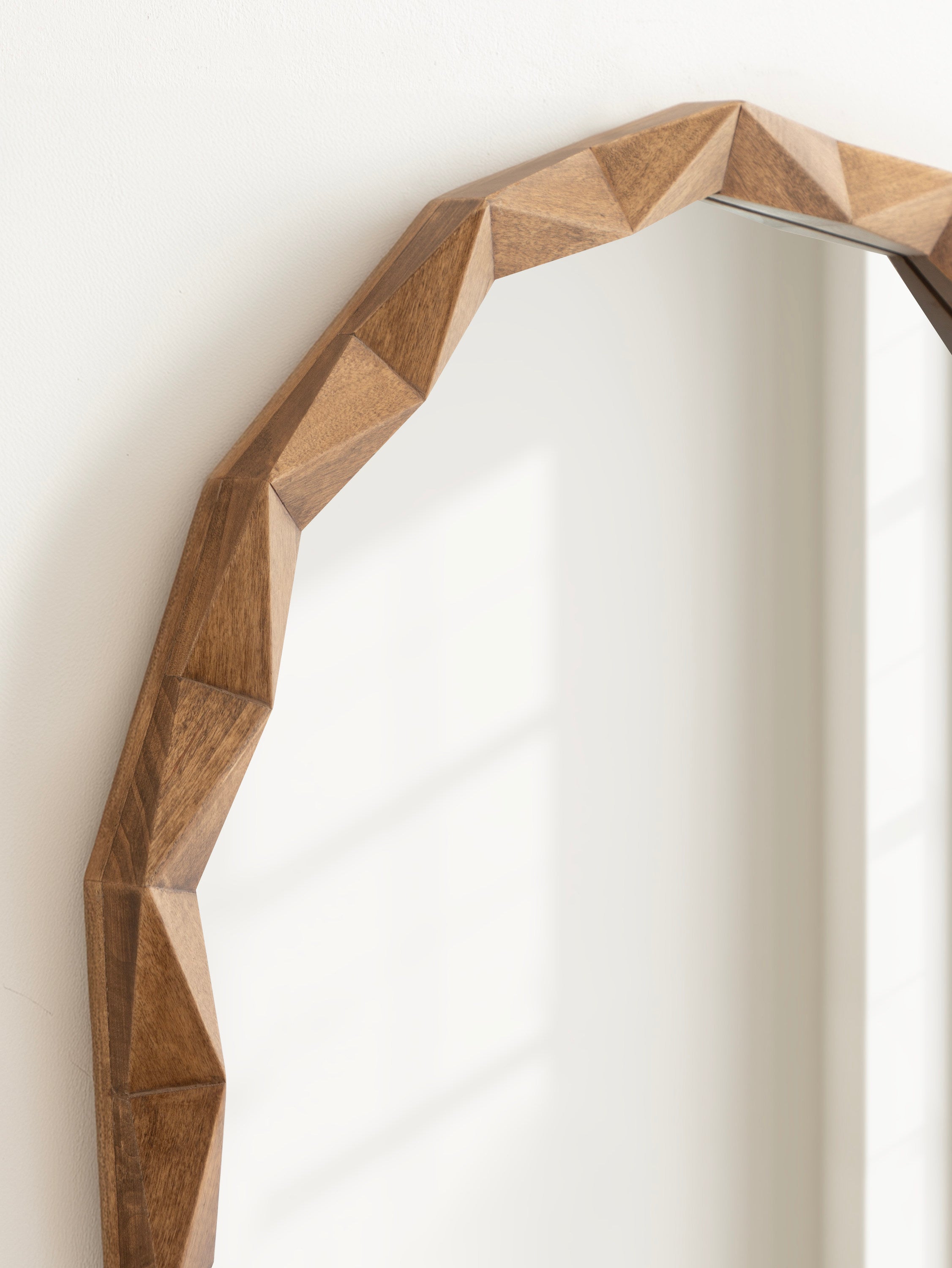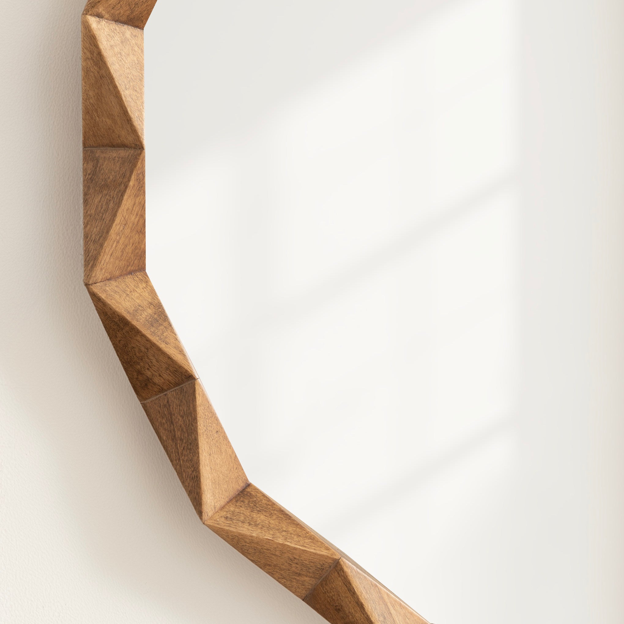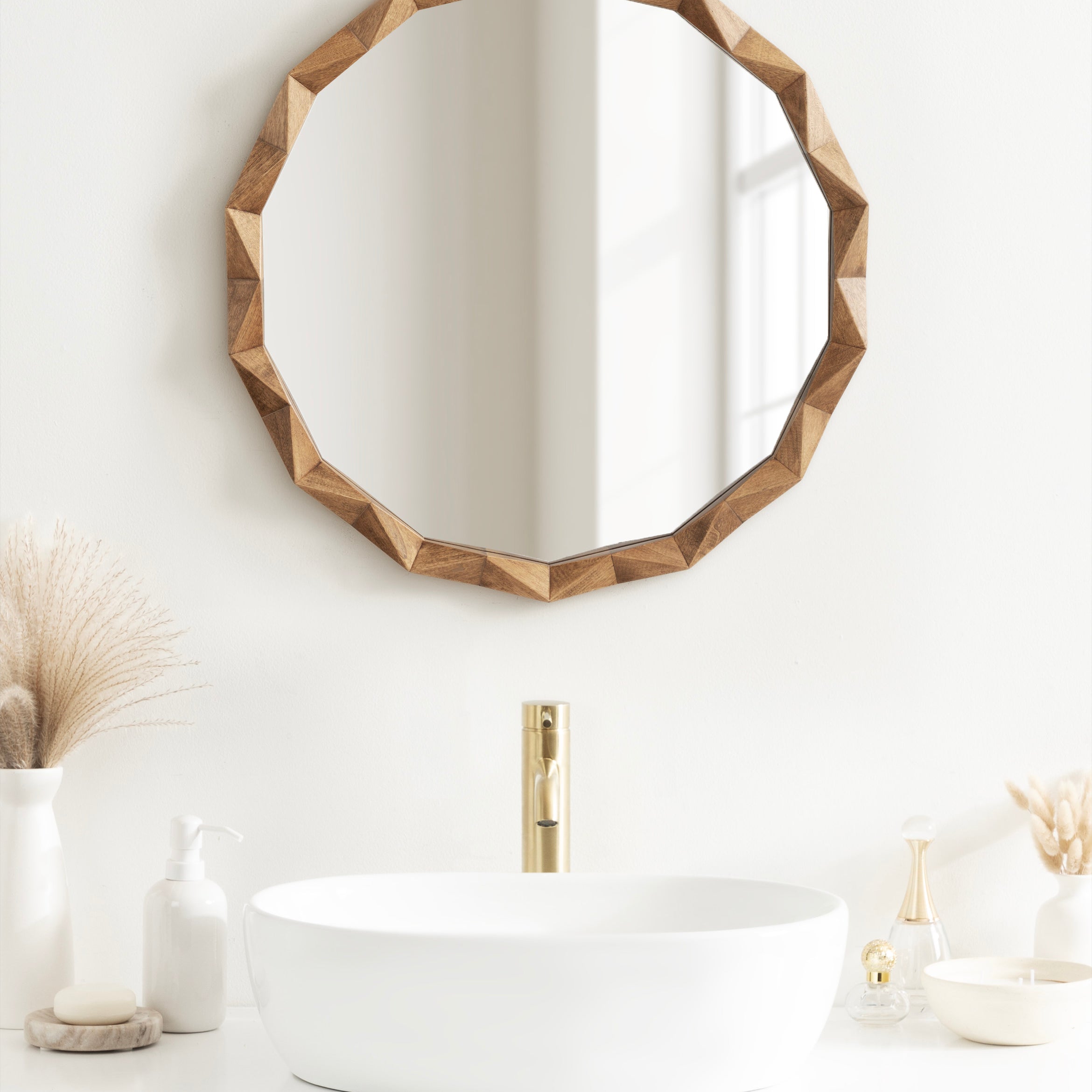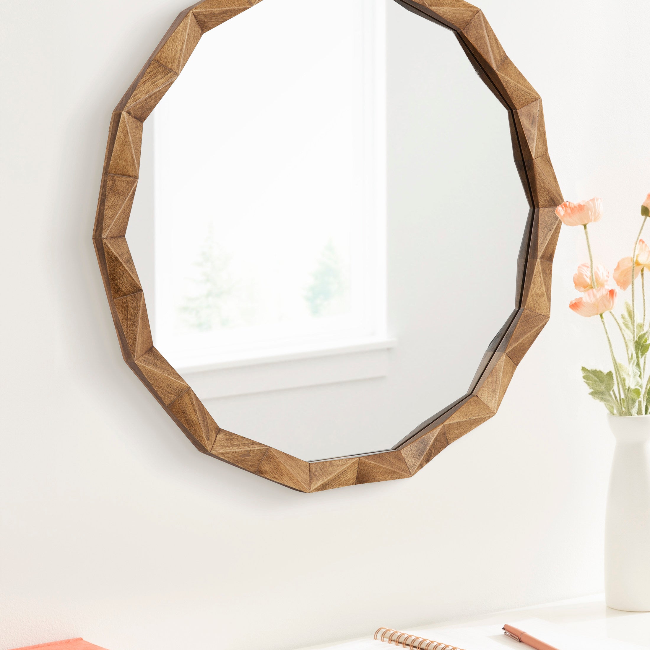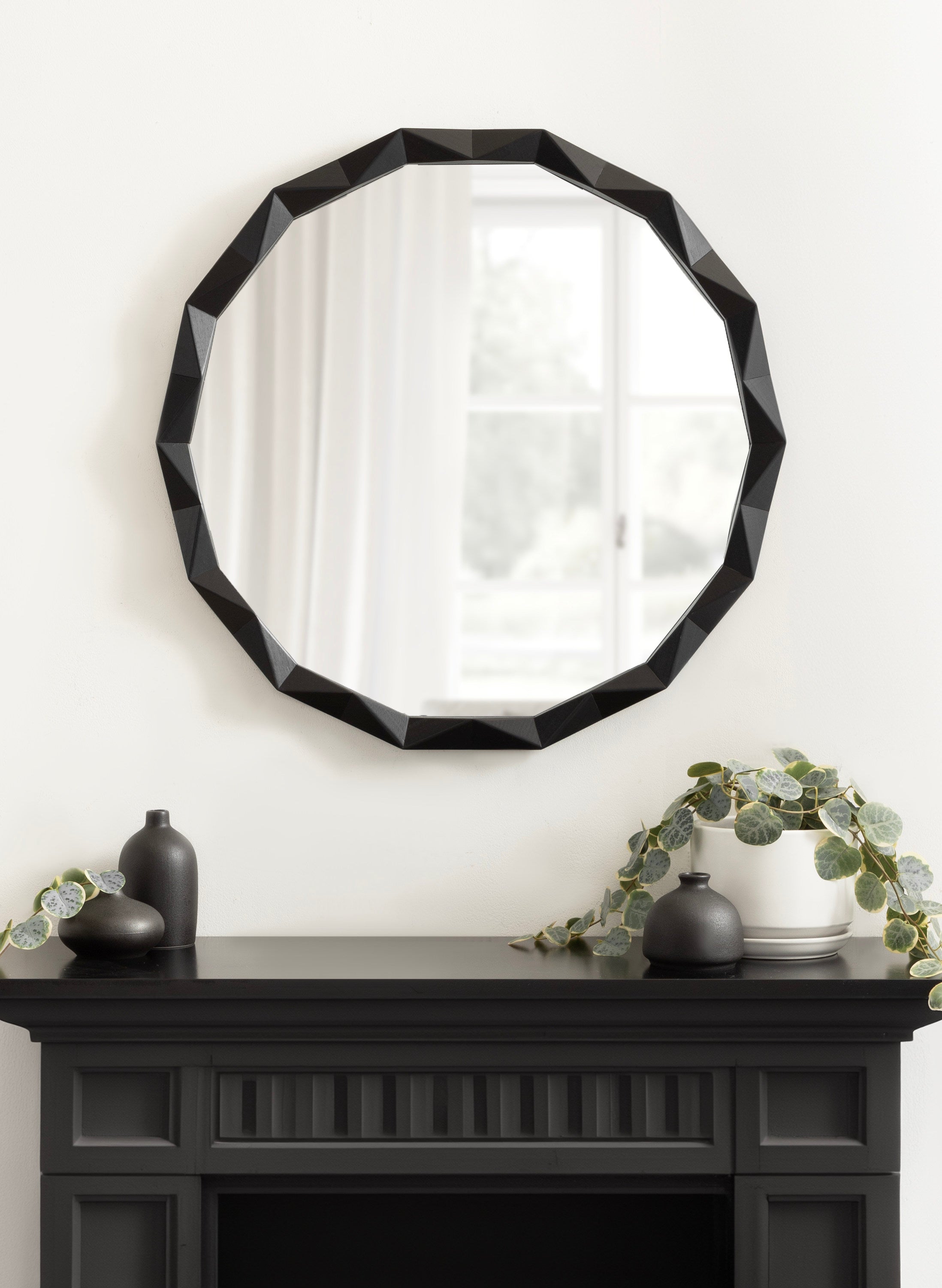 Crafted with the utmost care, this round mirror boasts a solid poplar wood frame that ensures durability and longevity. The frame profile of this wall mirror has a unique, faceted edge crafted from pieced wood segments. Not only is this mirror visually appealing, but it also serves a practical purpose. Hang it in your living room, bedroom, or entryway to create an illusion of a larger space, and to effortlessly check your appearance before heading out. The Endicott geometric round mirror is designed to make your home feel brighter and more spacious. Its faceted mirror shape adds a touch of uniqueness to your wall decor, making it a focal point in any room.