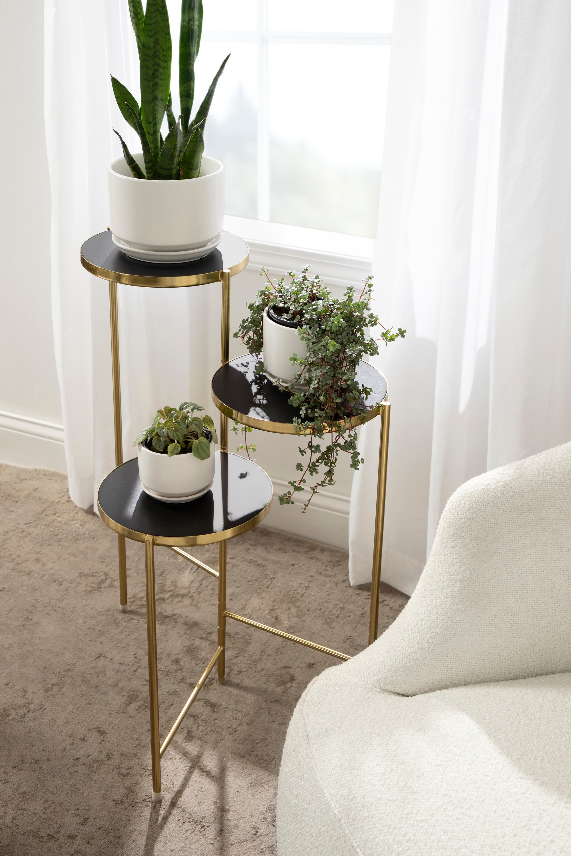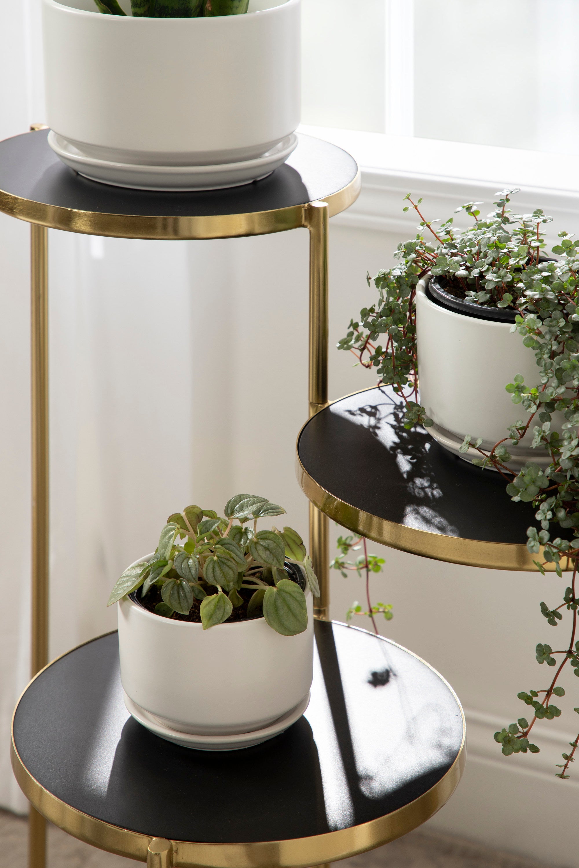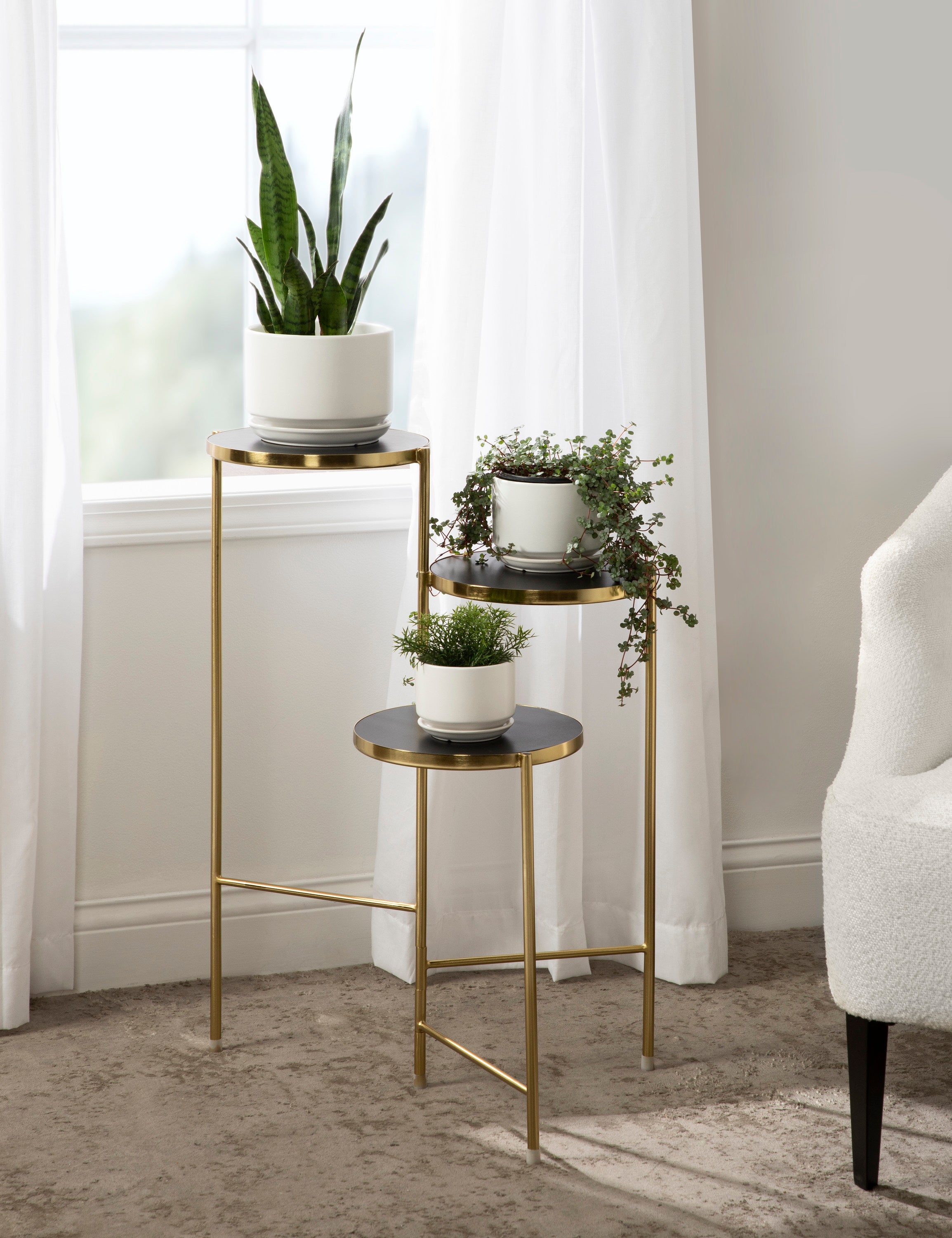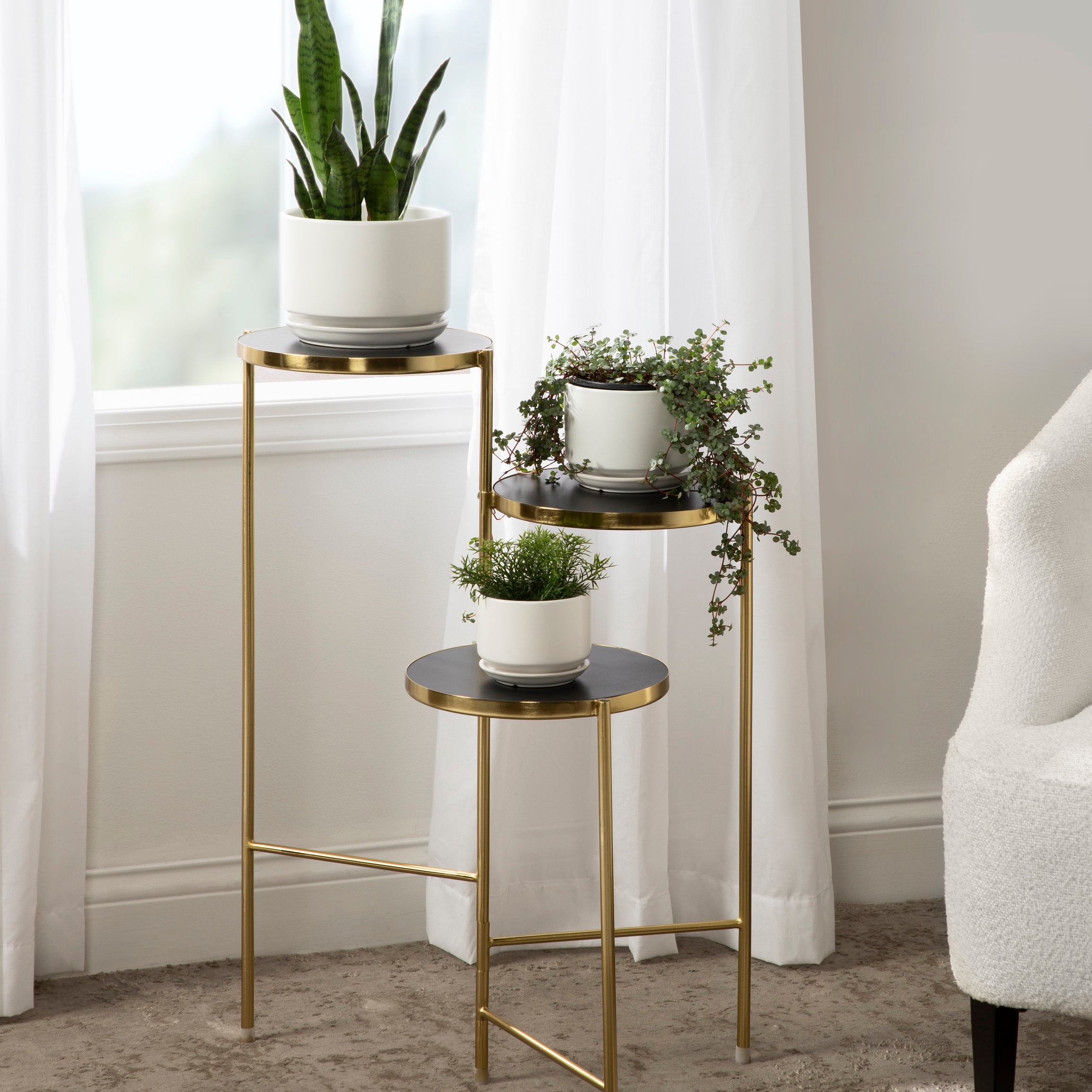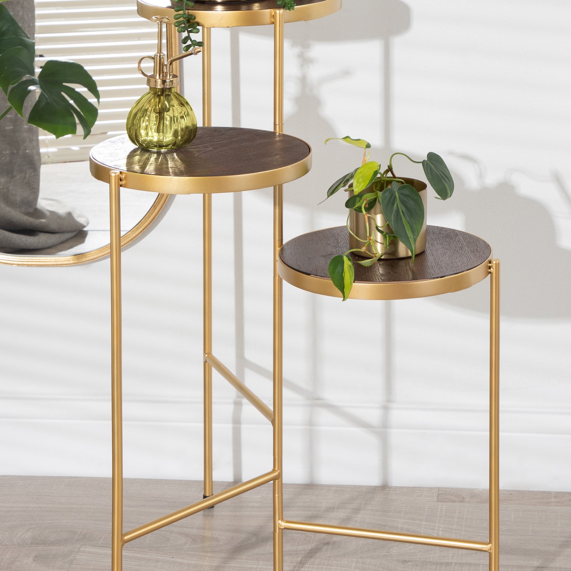 The Fields plant stand brings refinement and style to any room of your home. Featuring a two-tone finish and a folding, nesting frame, this multifunctional, three-tier plant stand is excellent for serving, display, and storage of household items. It's great for placement near an attractive bay window, next to your vanity, or as an end table by your couch.