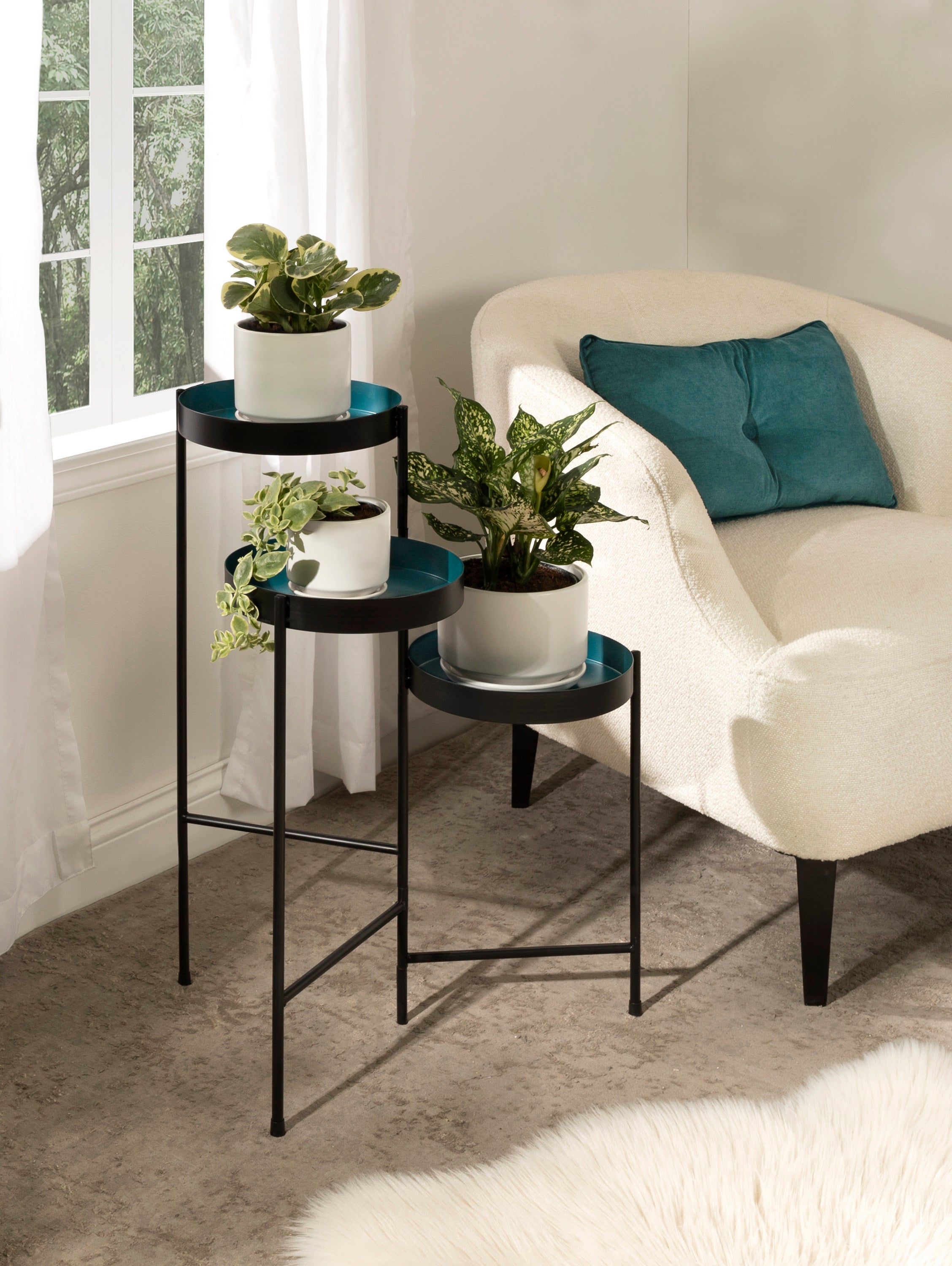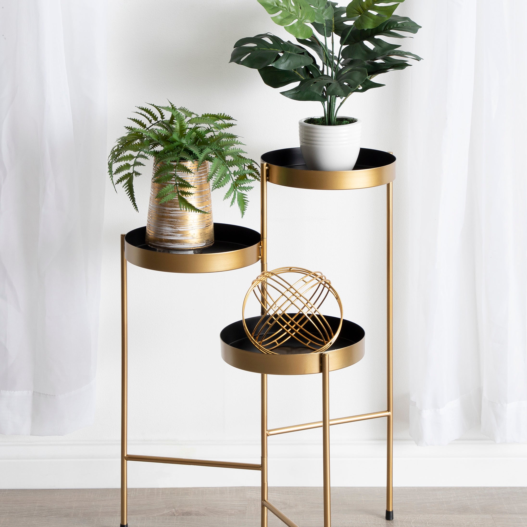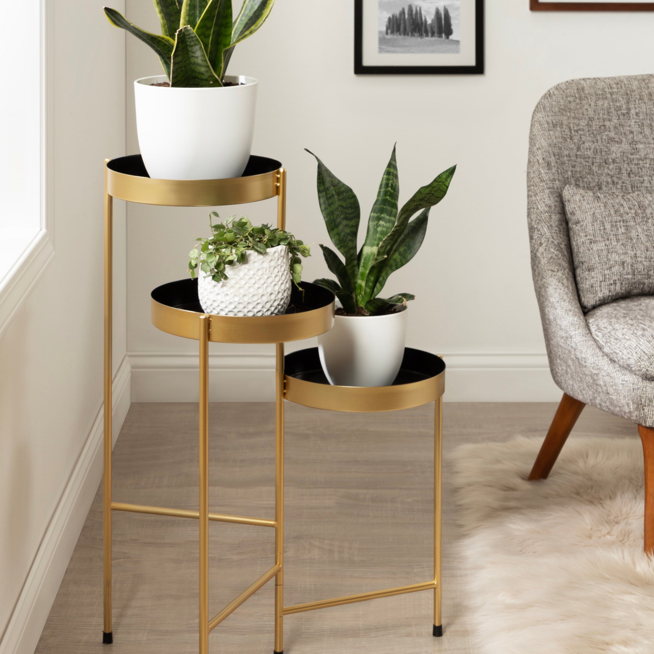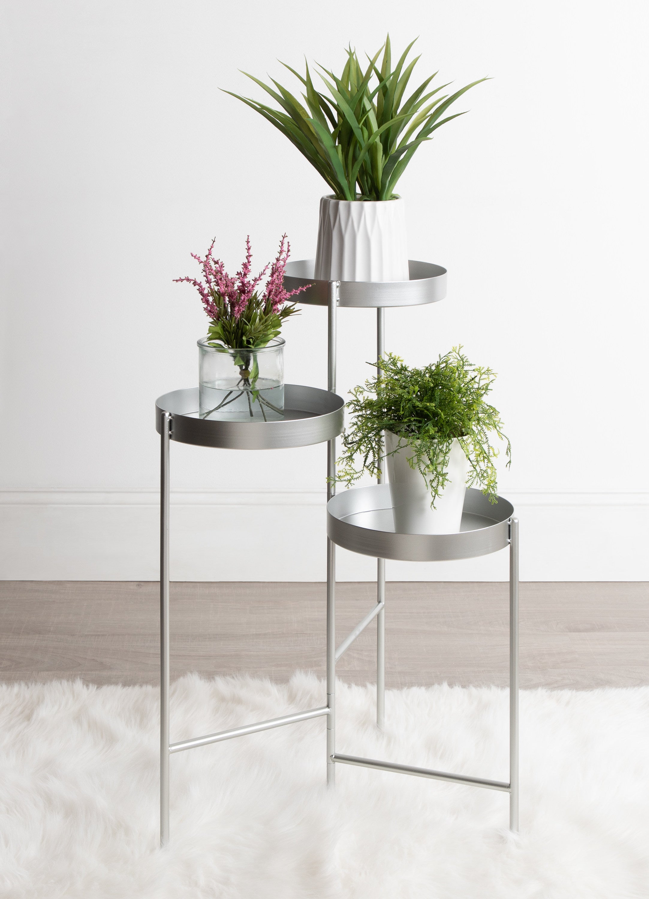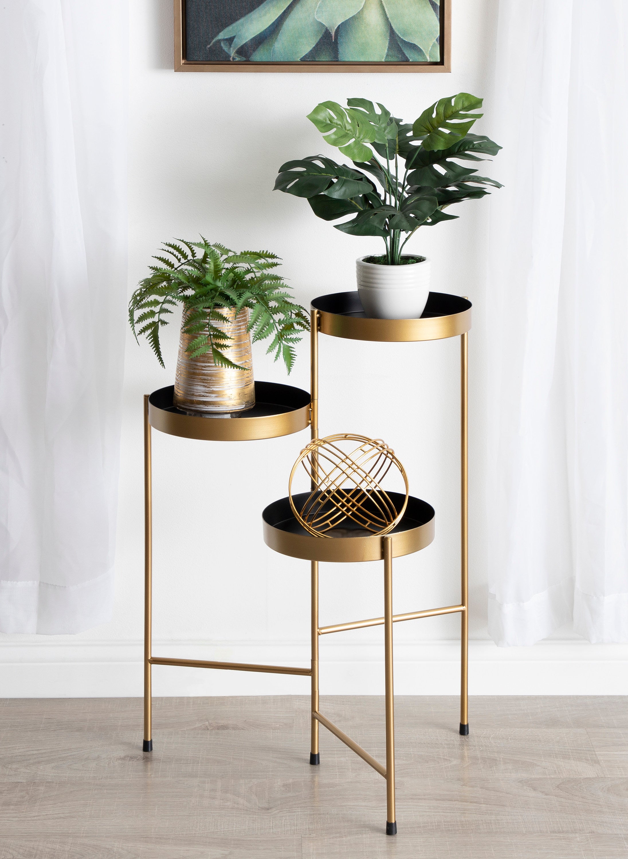 Perfectly present your plants with the Finn tri-level plant stand. The versatility is in the design. The graceful stair-step arrangement can display three large plants in a minimum amount of space. The hinged legs allow you to arrange it in a way the suits you or store away when necessary. Its a modern look with a glamorous style that will fit in with your contemporary home.