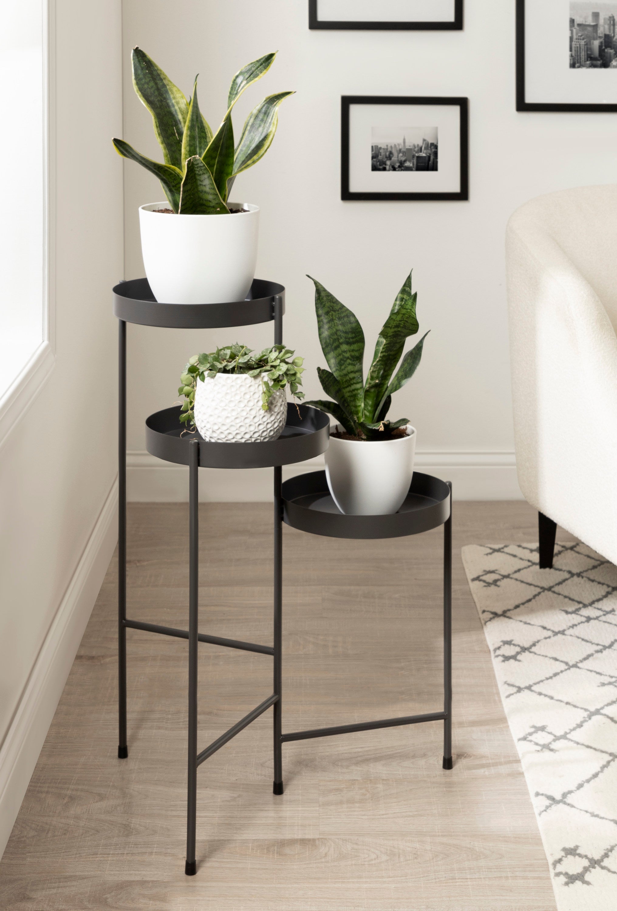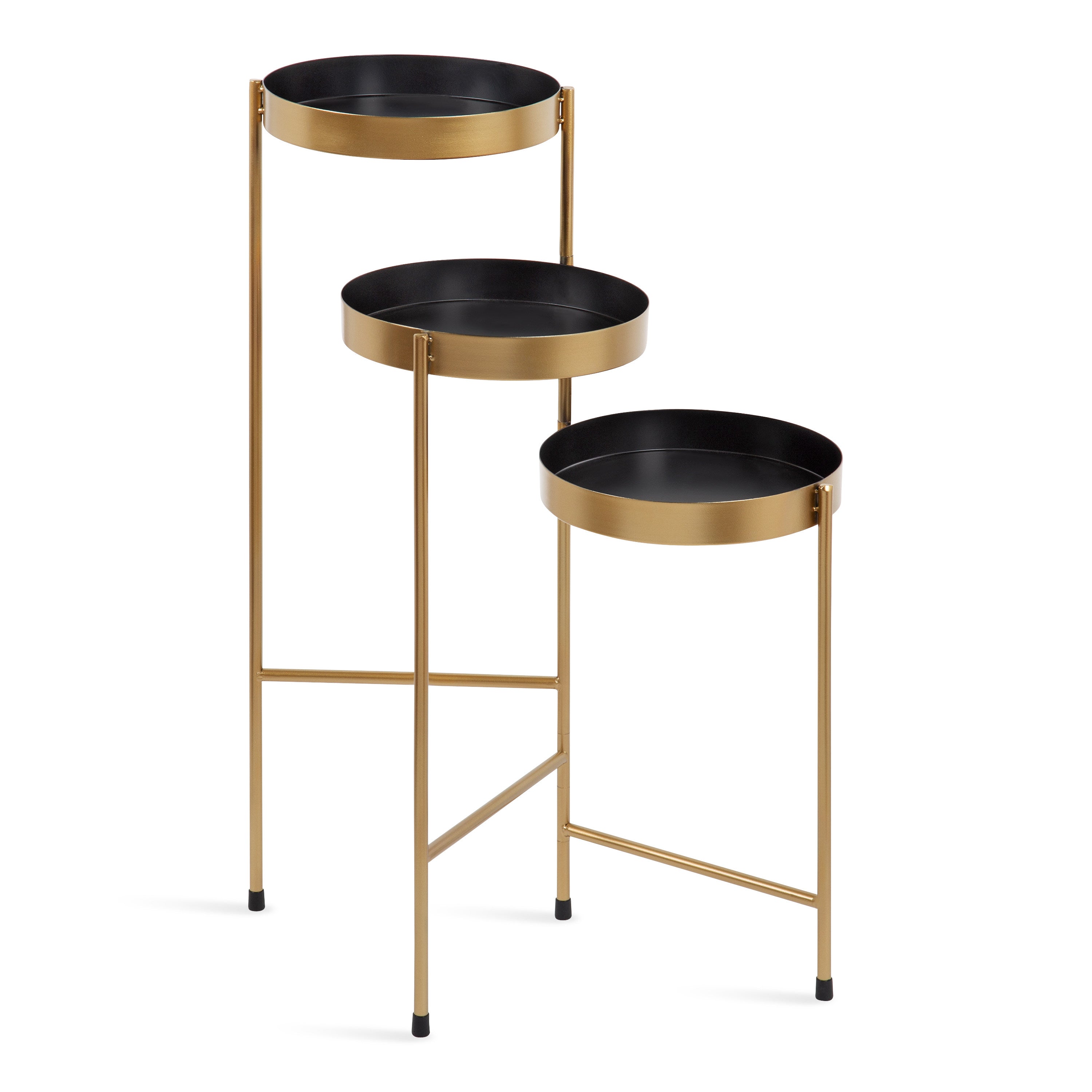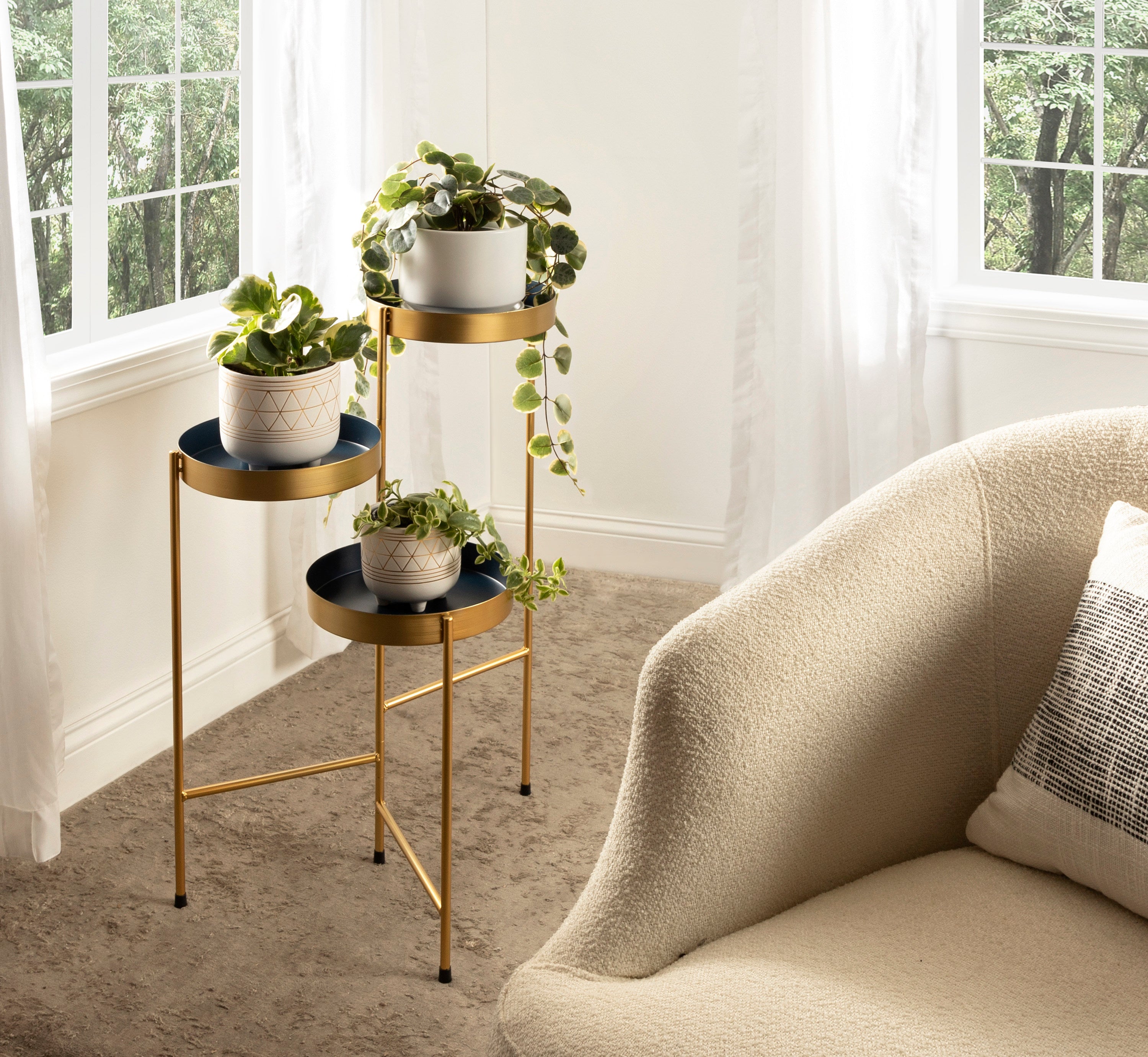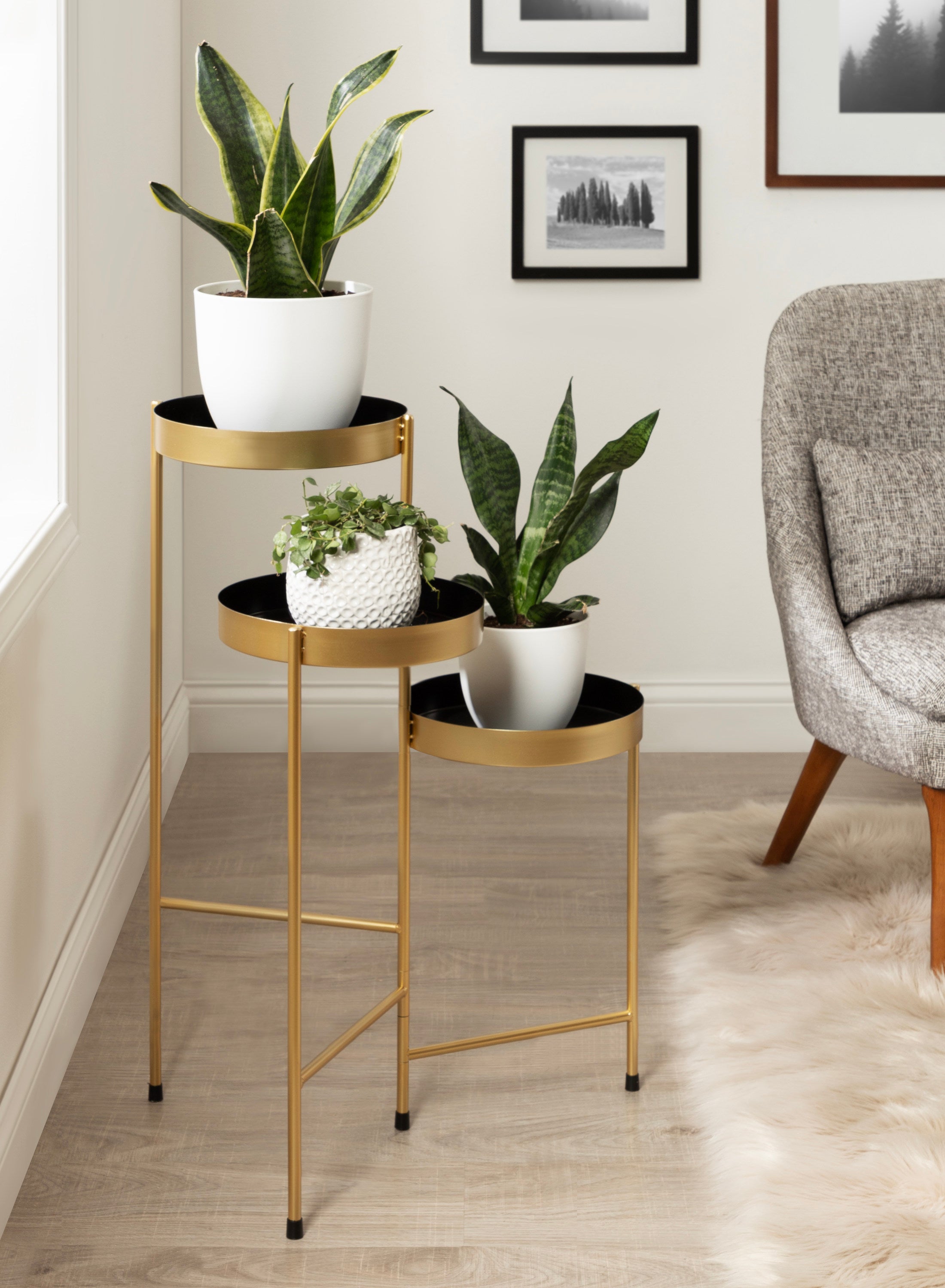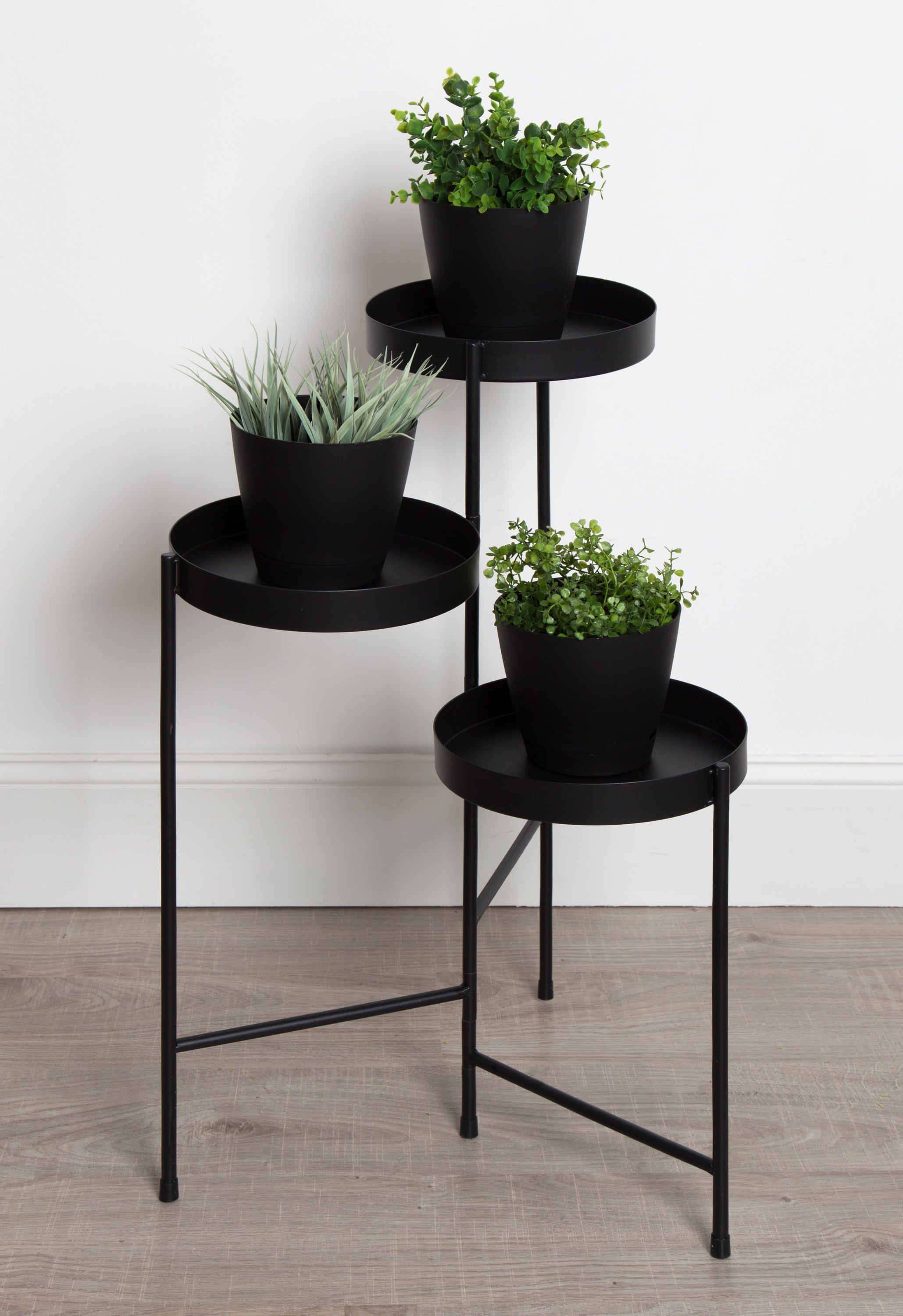 Perfectly present your plants with the Finn tri-level plant stand. The versatility is in the design. The graceful stair-step arrangement can display three large plants in a minimum amount of space. The hinged legs allow you to arrange it in a way the suits you or store away when necessary. Its a modern look with a glamorous style that will fit in with your contemporary home.