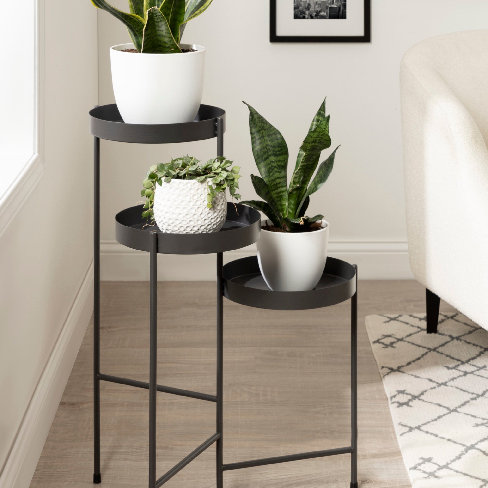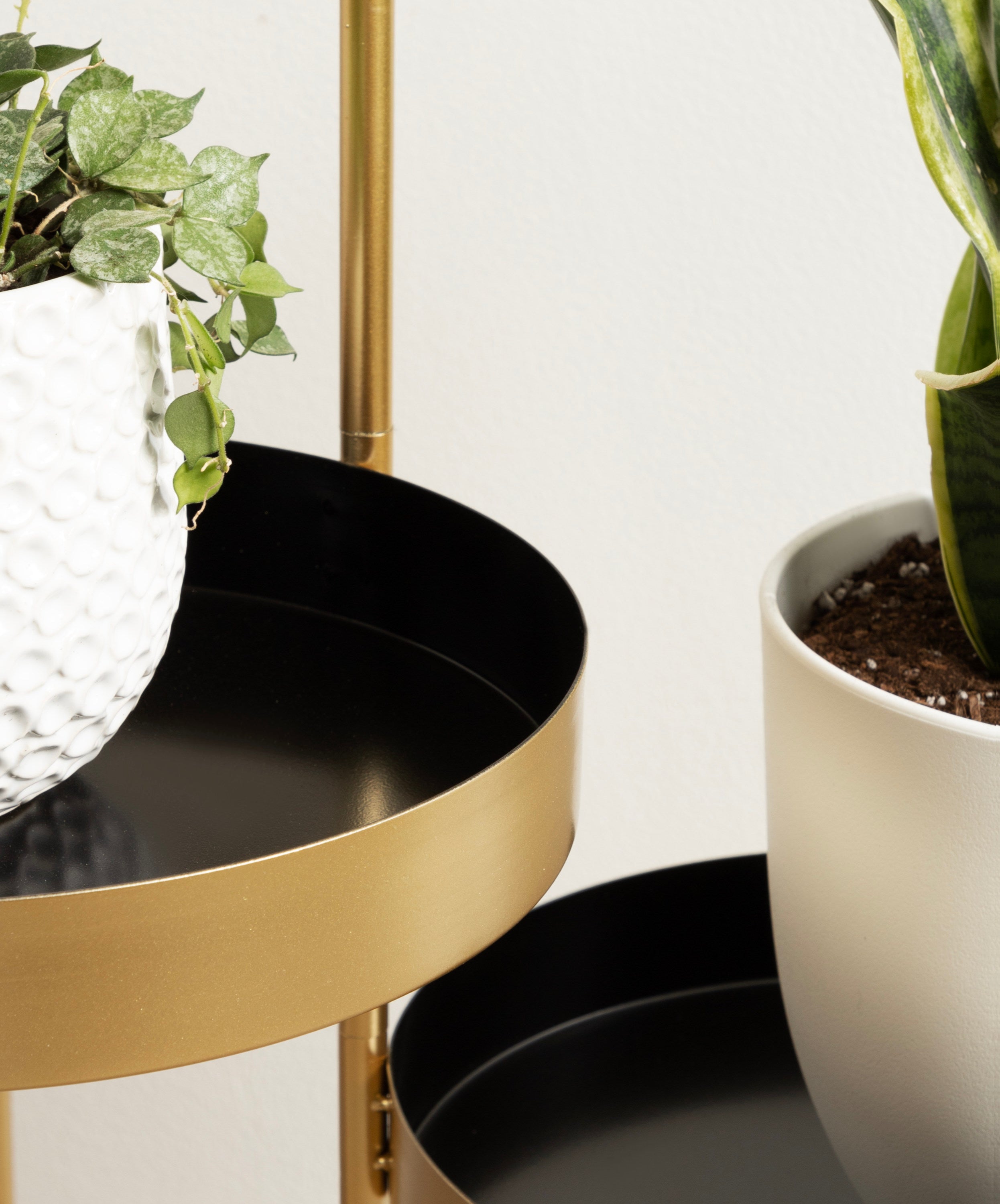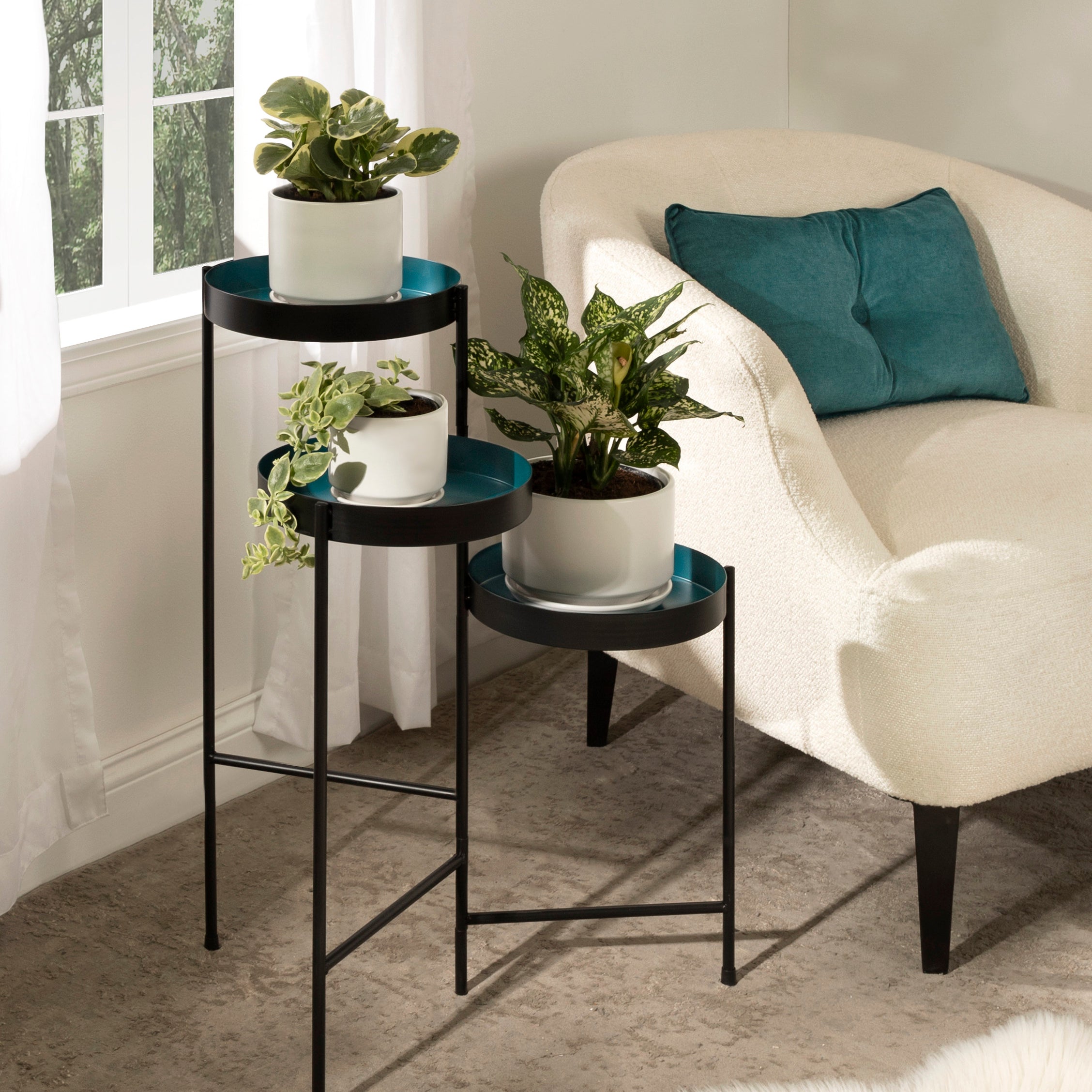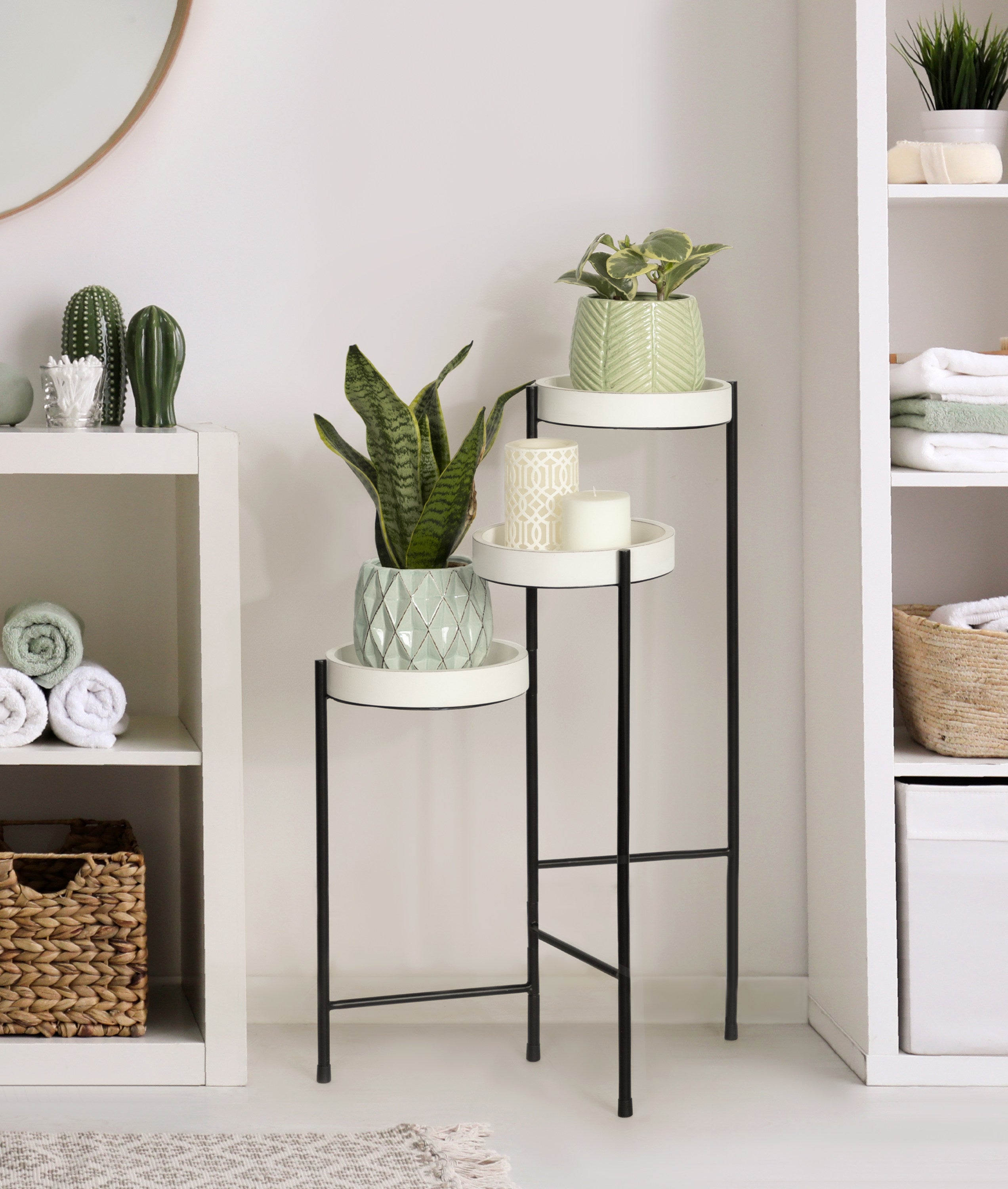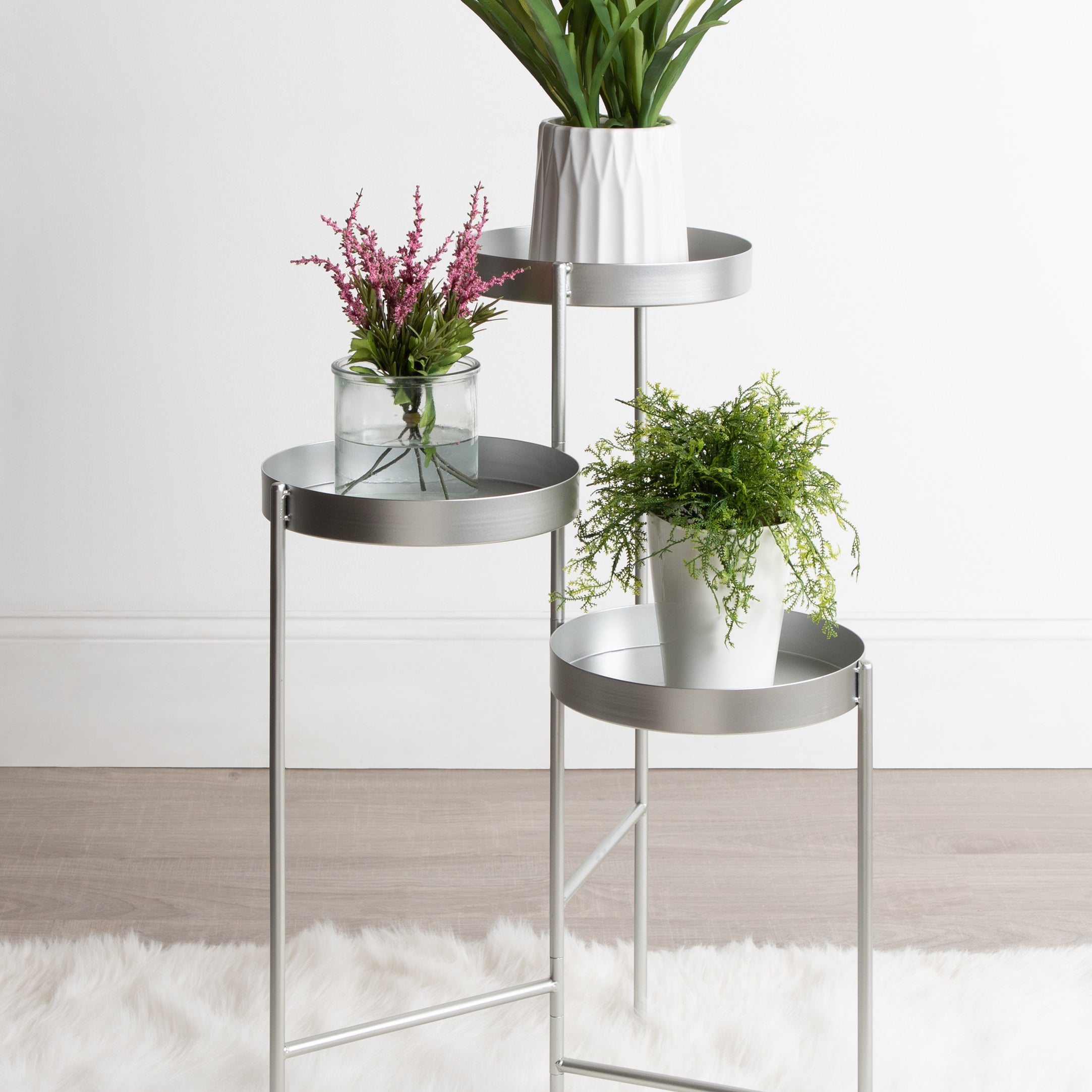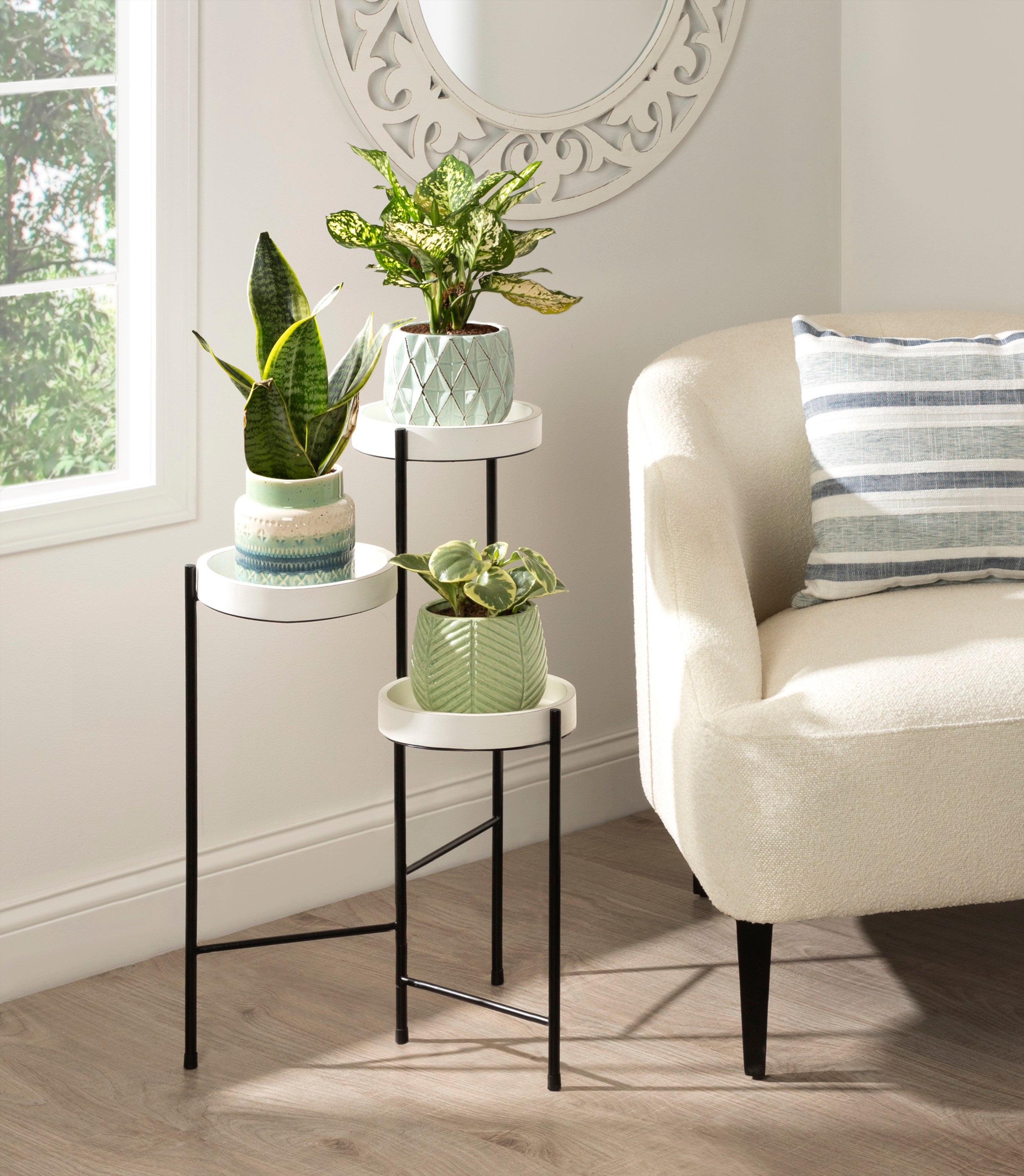 Perfectly present your plants with the Finn tri-level plant stand. The versatility is in the design. The graceful stair-step arrangement can display three large plants in a minimum amount of space. The hinged legs allow you to arrange it in a way the suits you or store away when necessary. Its a modern look with a glamorous style that will fit in with your contemporary home.