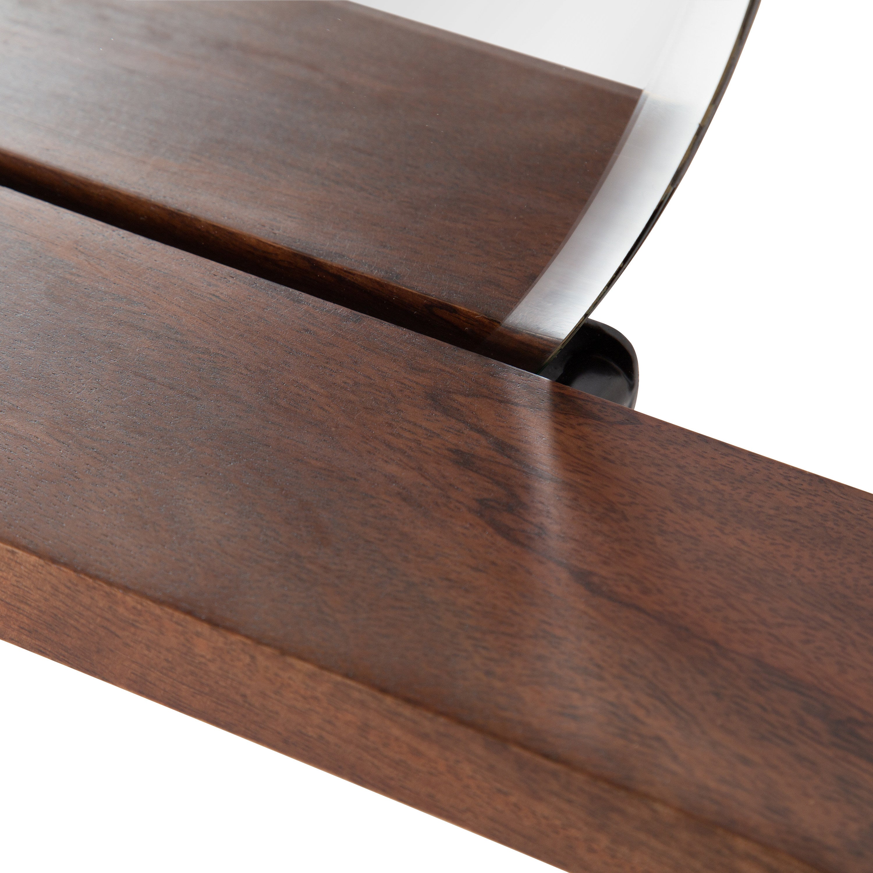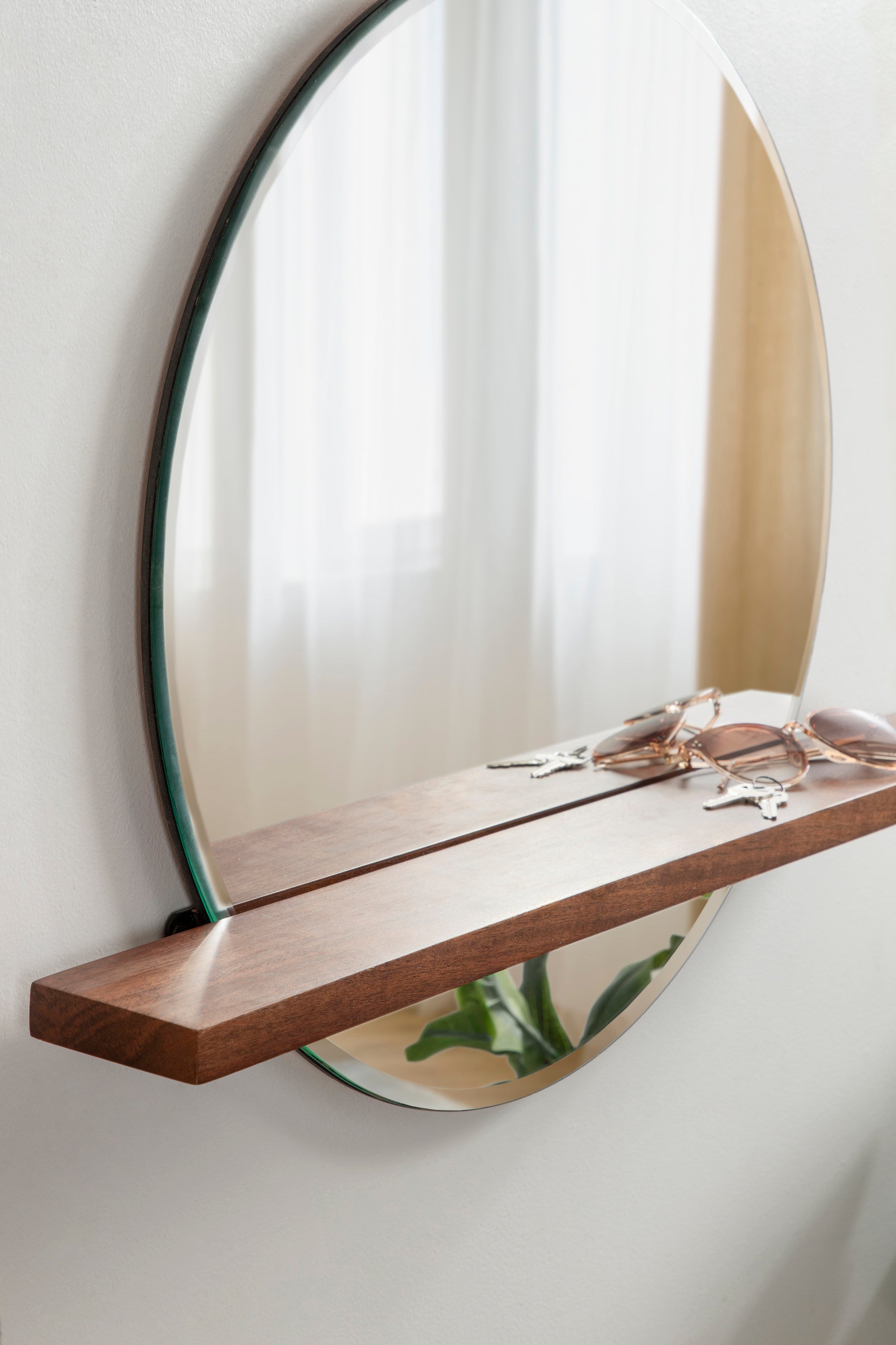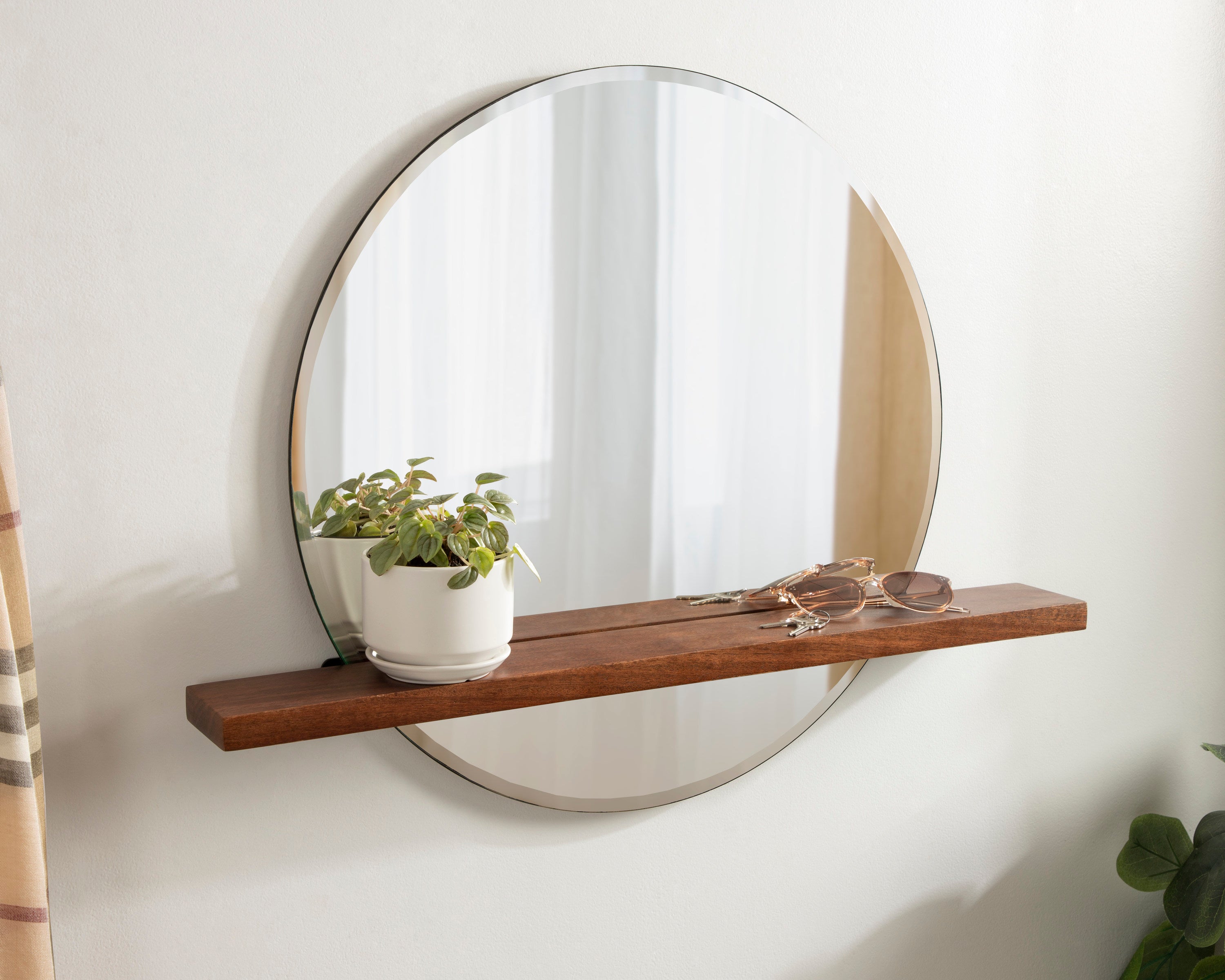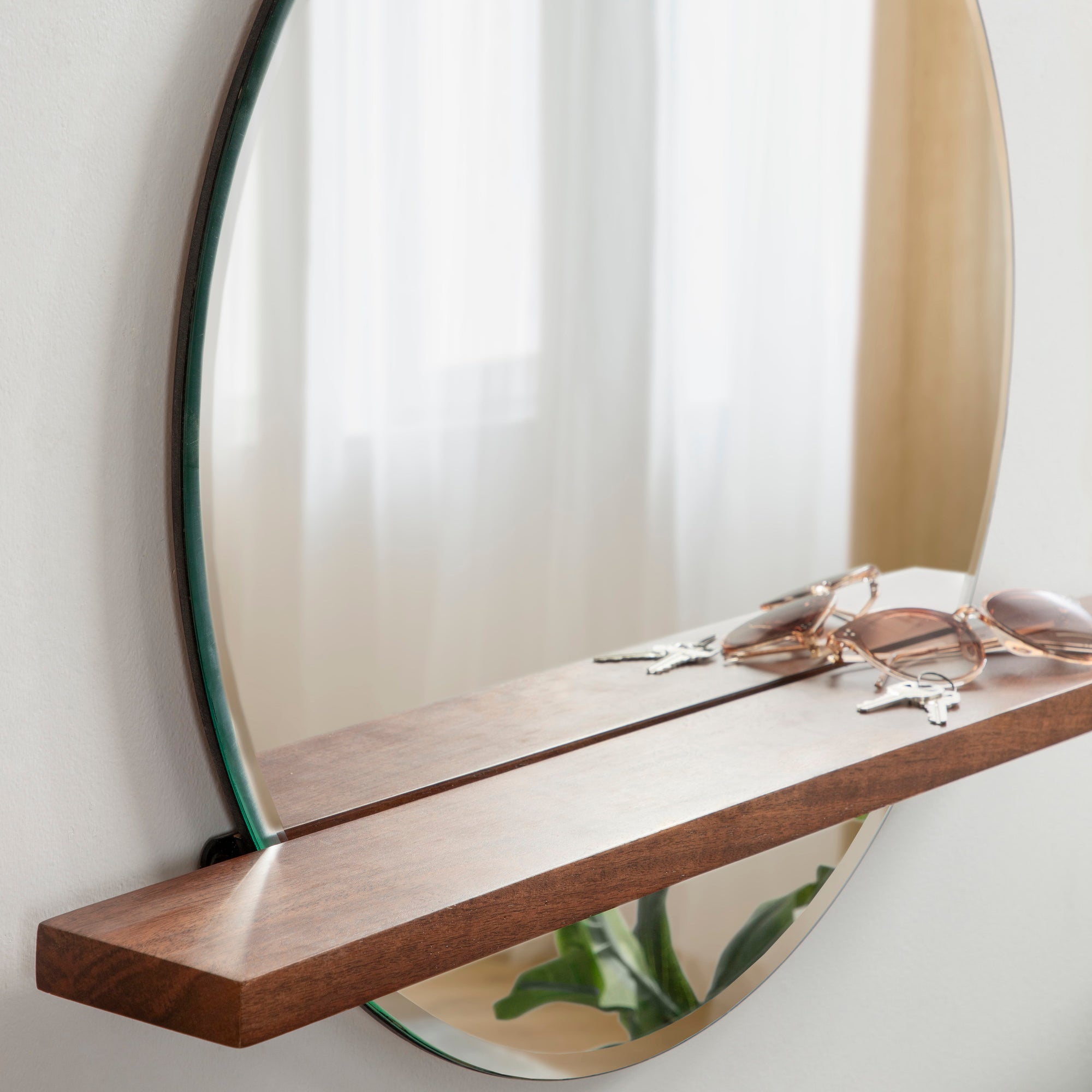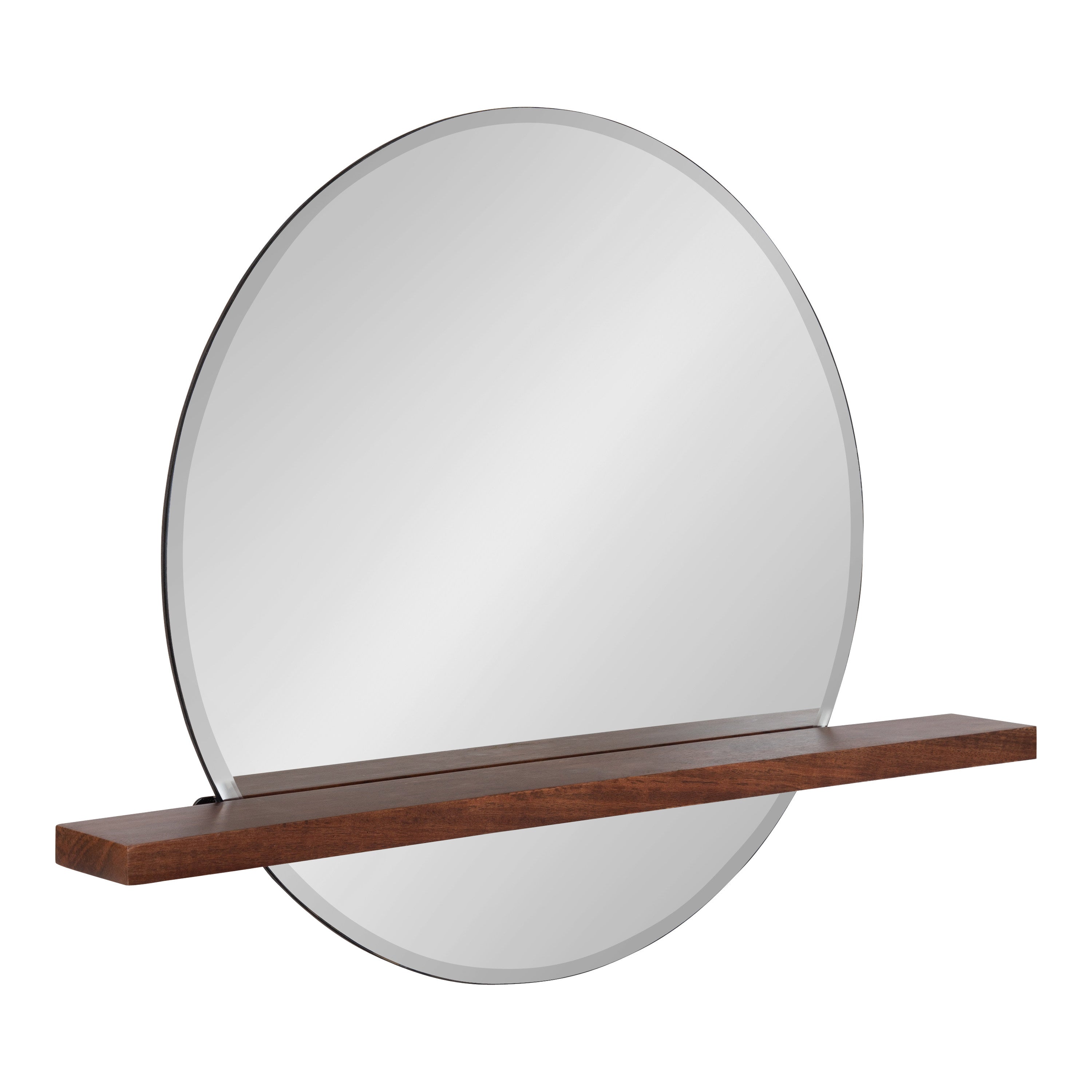 Decorate your home in midcentury sophistication with the Fossett mirror. This mirror features a frameless design and a floating shelf with a walnut finish combining mid-century modern design with contemporary minimalism. Each Fossett mirror is handcrafted in India, making each piece vary in finish and woodgrain. The Fossett is a fabulous addition to various spaces in your home, giving you an amazing bedroom vanity or entryway console mirror. Its beveled surface is exactly what your home needs to feel more open and illuminated. At the same time, its sophisticated solid wood shelf is fantastic for showcasing display accents and keeping track of small household necessities.