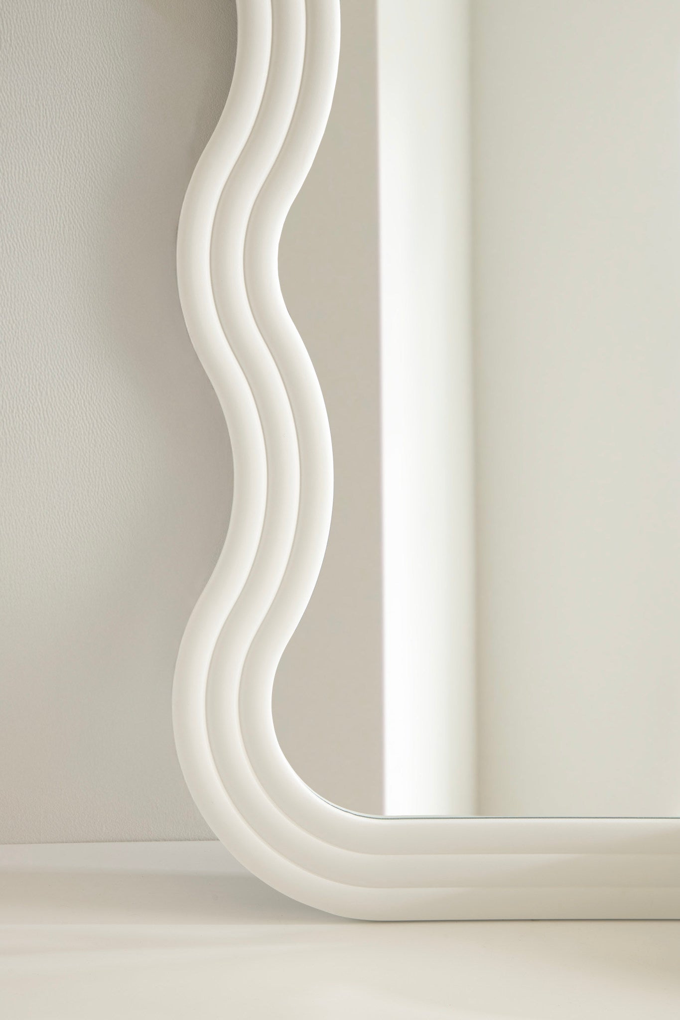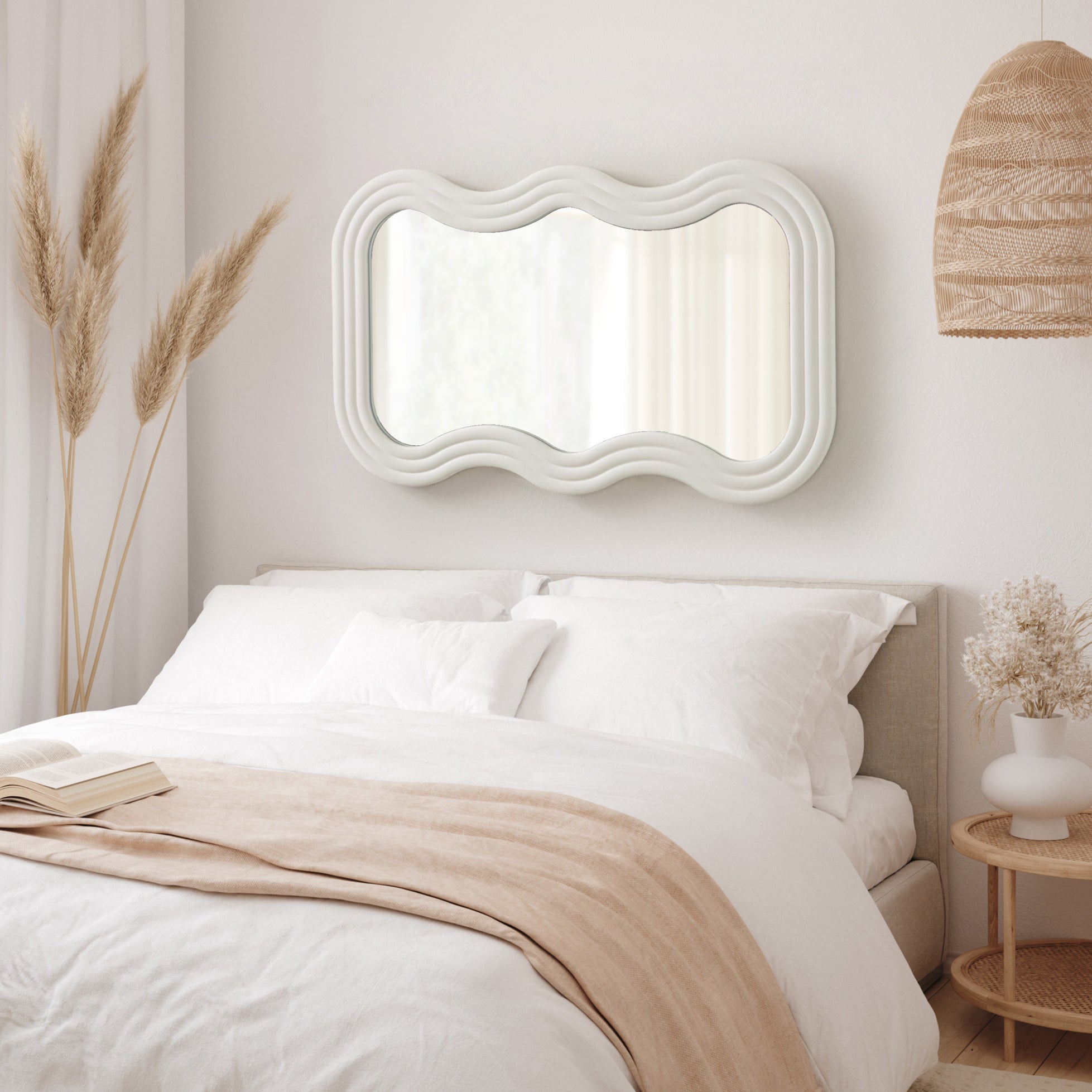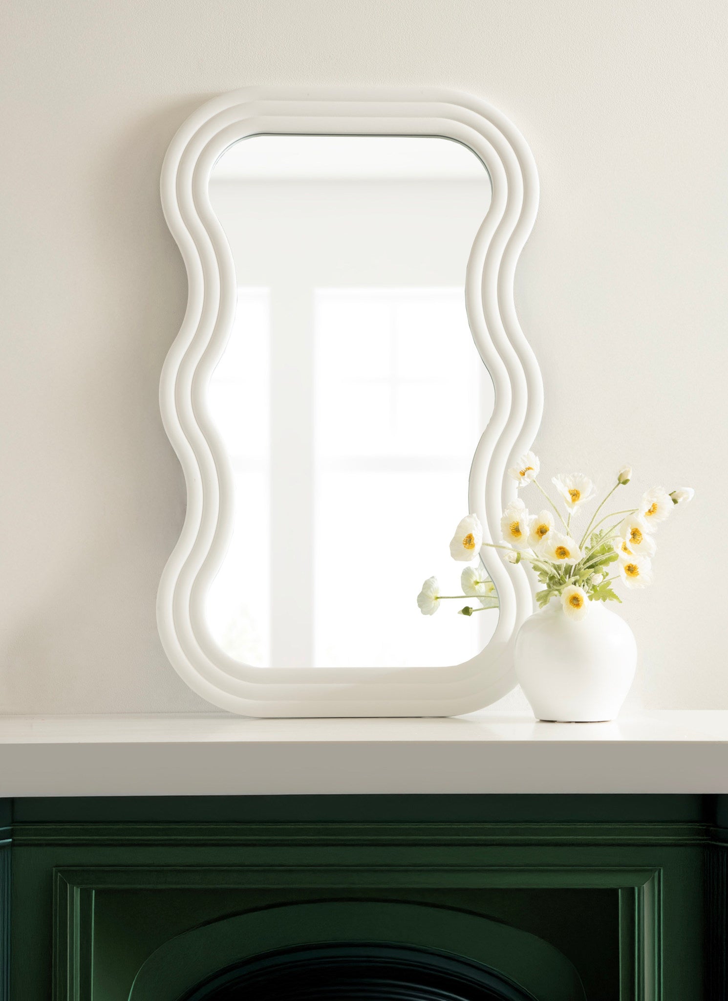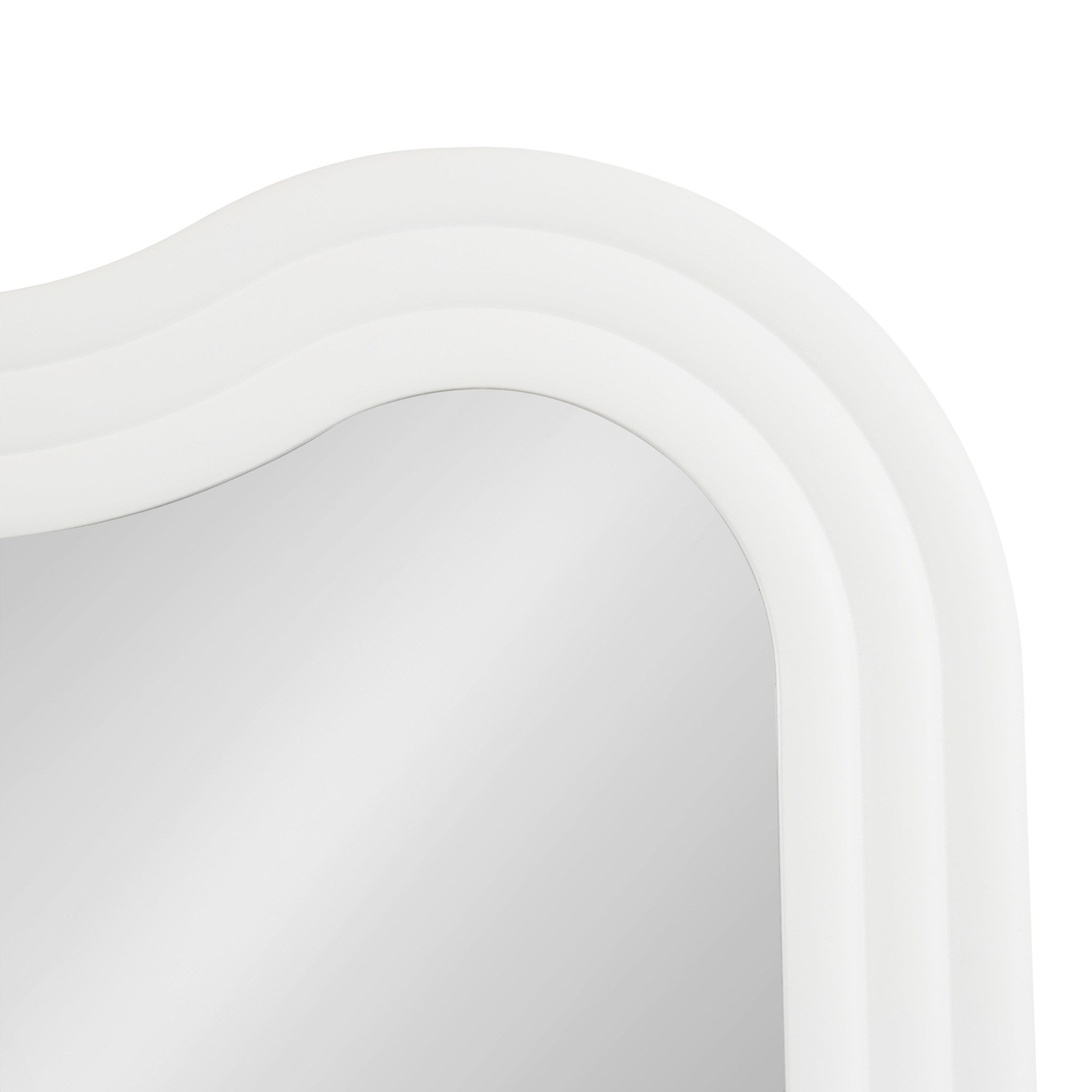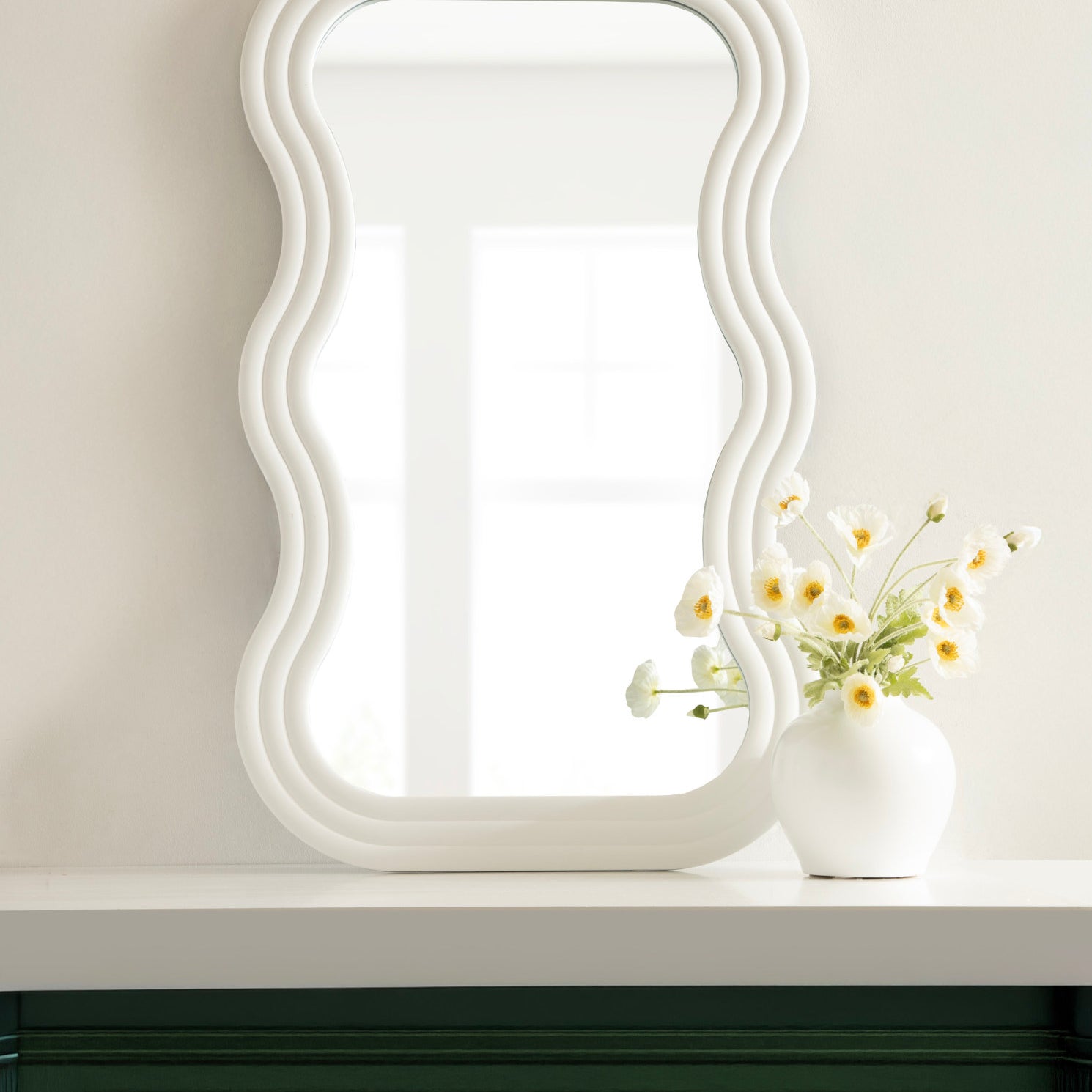 The Kate and Laurel Fripp wavy mirror features a soft finish that adds a touch of elegance and brightness to your space. Crafted with the utmost care, the mirror boasts a molded wooden material frame that ensures durability and longevity. The wavy frame profile adds to the mirror's charm, making it a perfect fit for a variety of interior styles, including modern, contemporary, and transitional. Not only is this mirror visually appealing, but it also serves a practical purpose. Hang it in your living room, bedroom, or entryway to create an illusion of a larger space, and to effortlessly check your appearance before heading out. Its wavy mirror shape adds a touch of uniqueness to your wall decor, making it a focal point in any room. The mirror features convenient metal hangers to be hung easily to suit your wall decor.