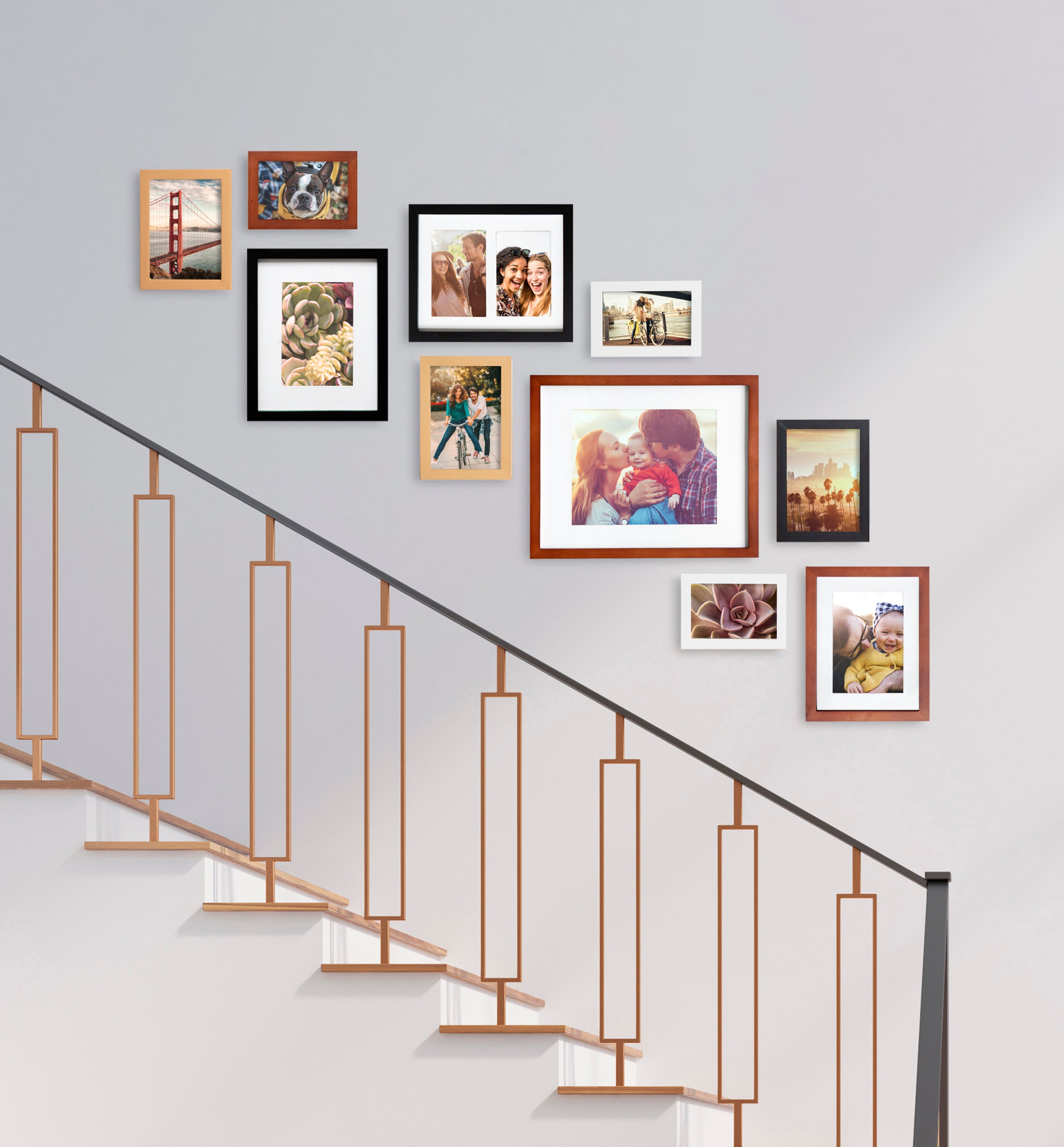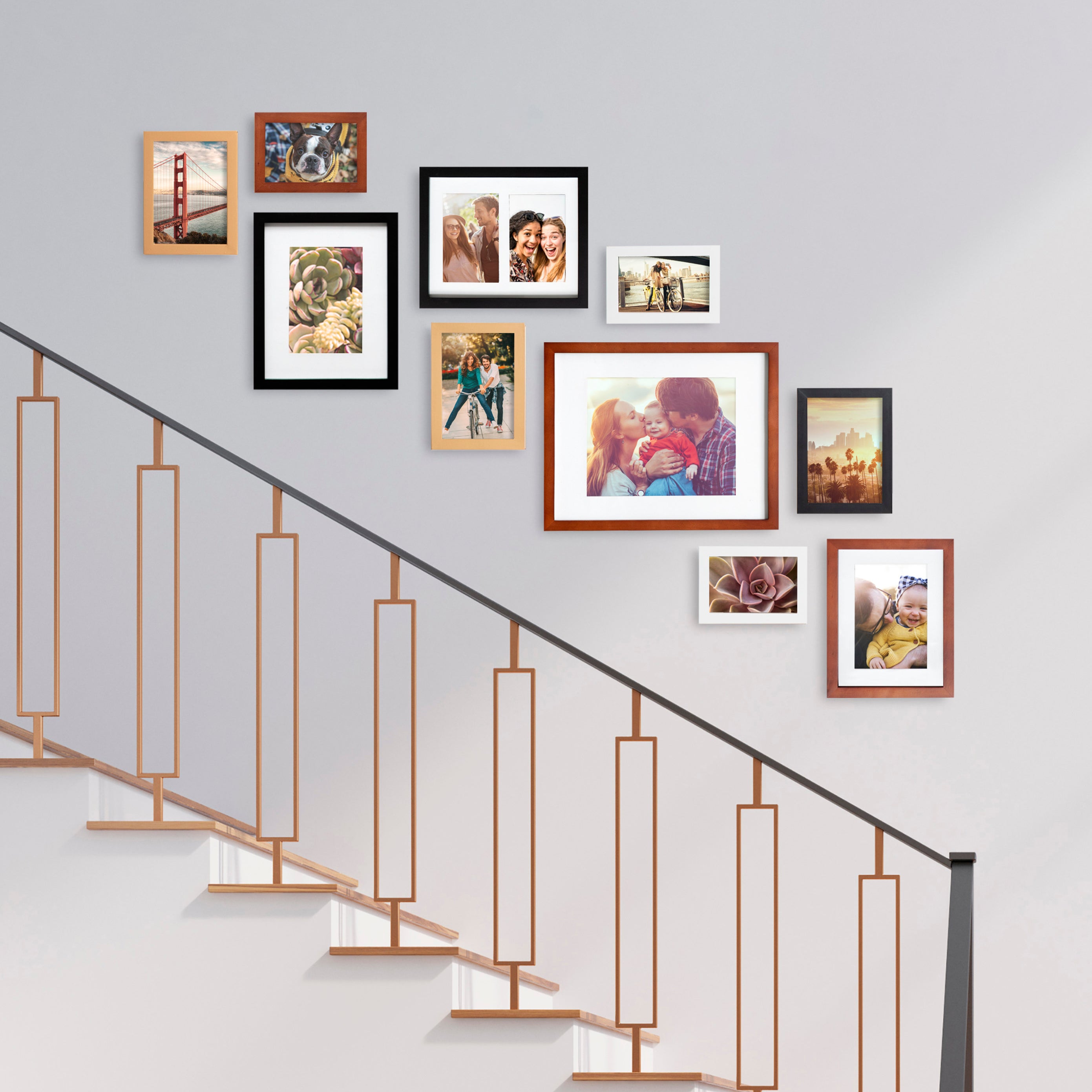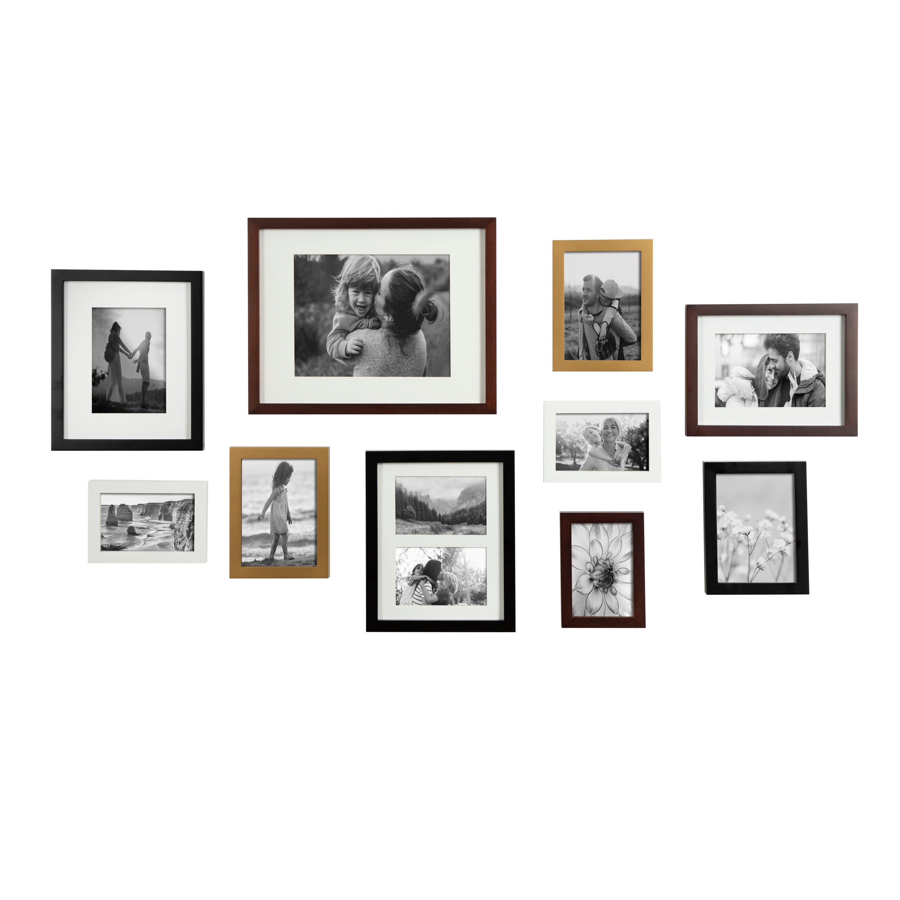 Create a stunning gallery wall with this beautiful 10-piece Gallery picture frame set from Kate and Laurel. With differing sizes and finishes, this marvelous collection can absolutely transform any open wall into a delightful combination of memories, scenery, and refinement. Family photographs should be displayed where they can be a constant reminder that time spent with family and friends should be remembered and enjoyed by everyone. Sharing those photos is a joy that brings not only you satisfaction but also entertains your guests.