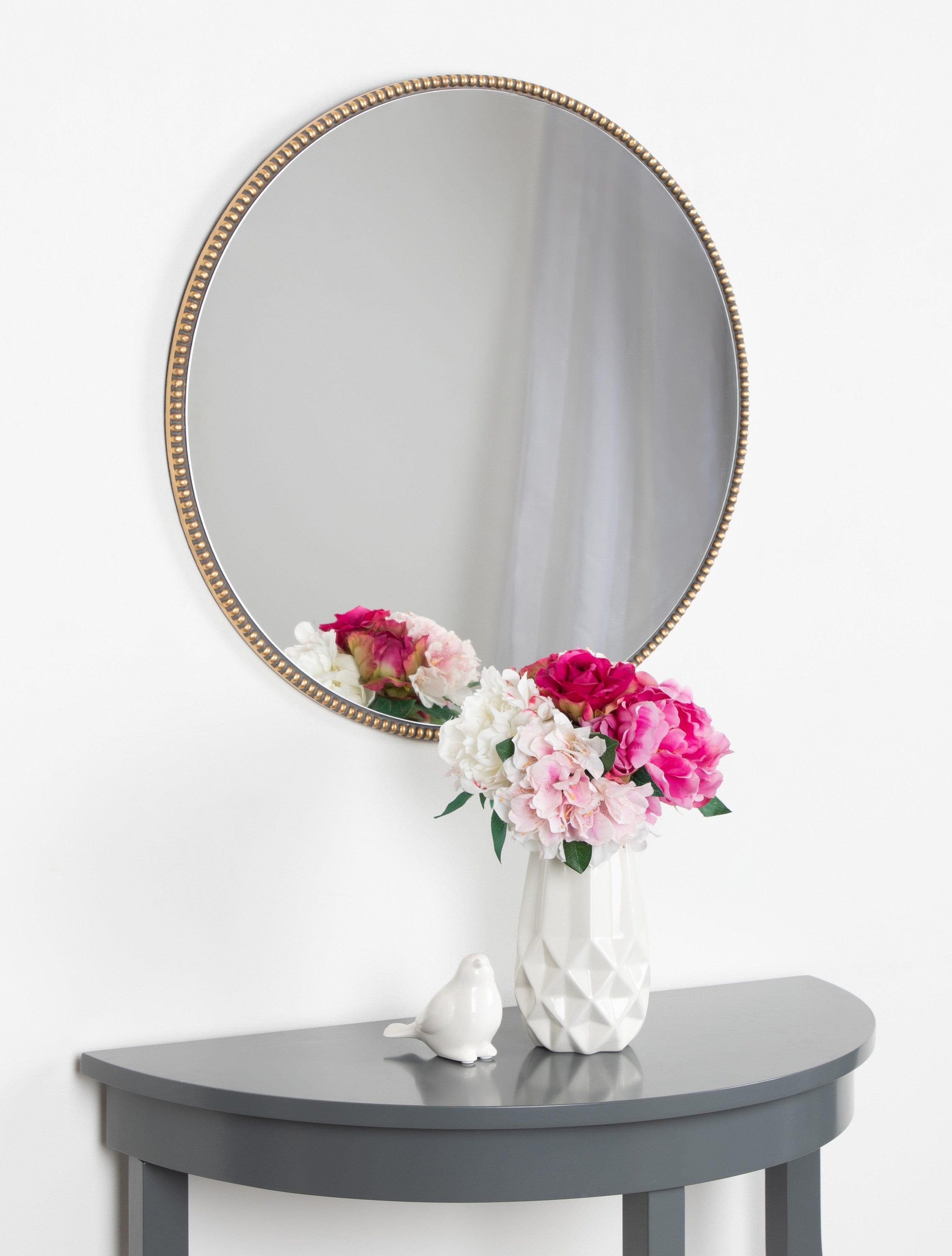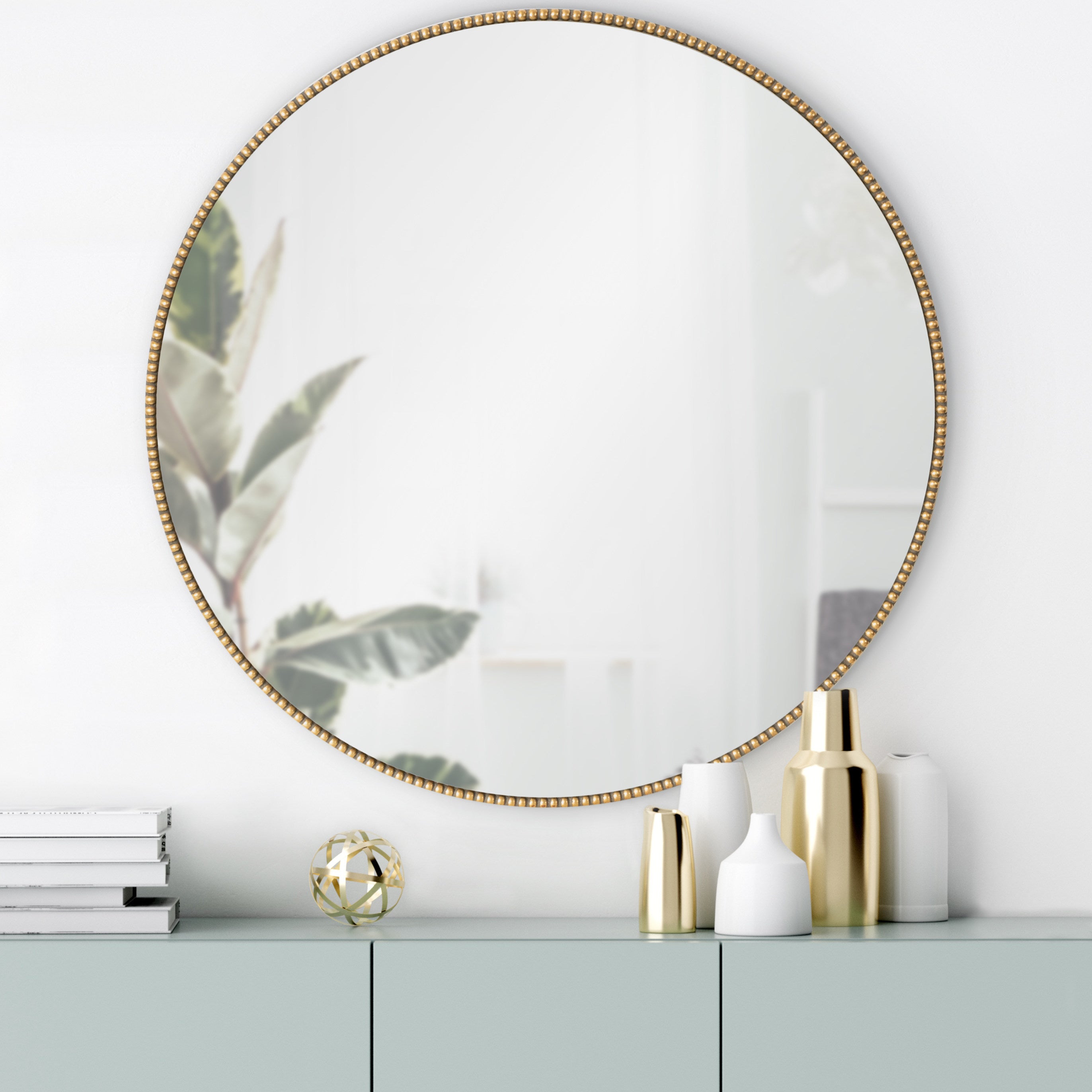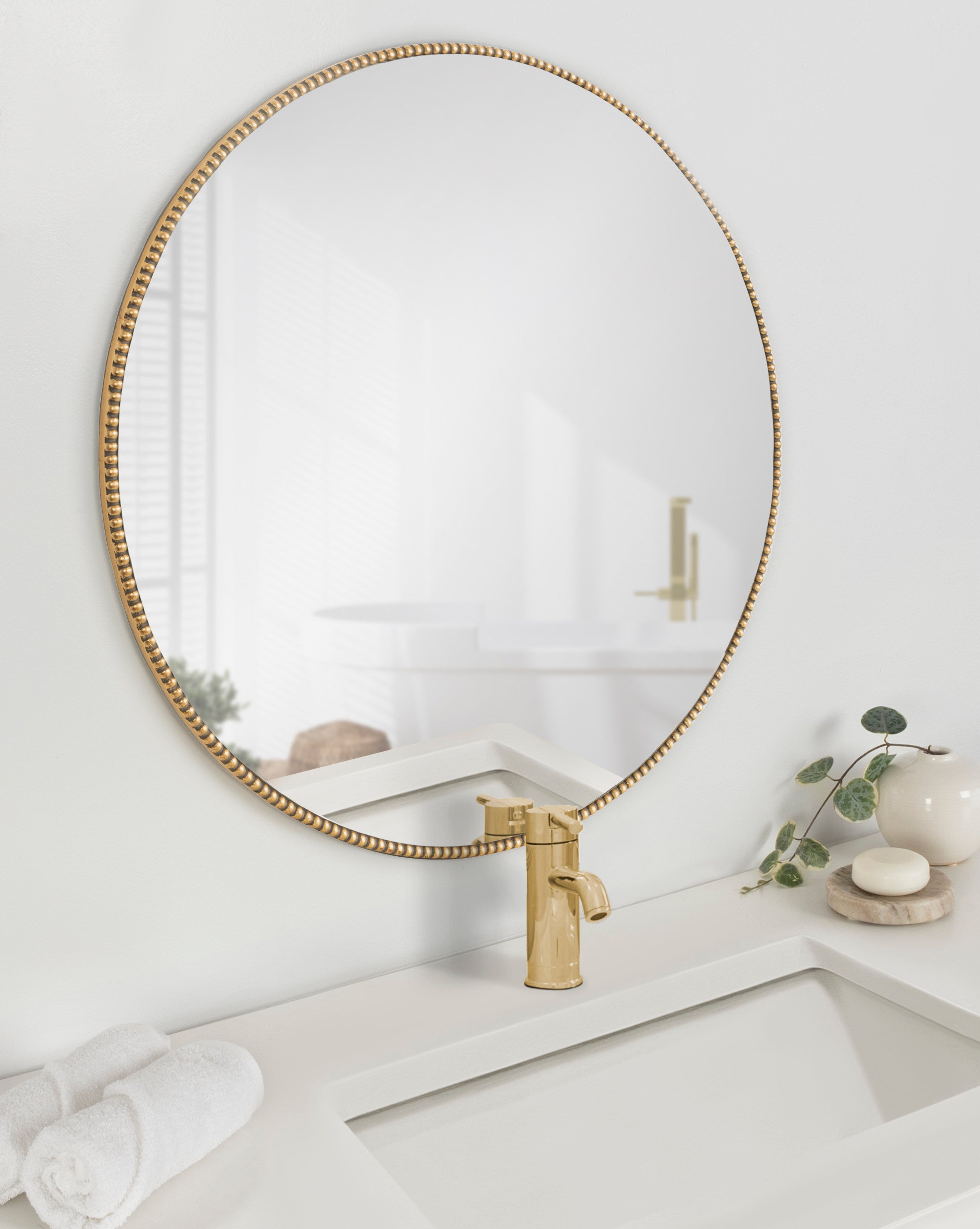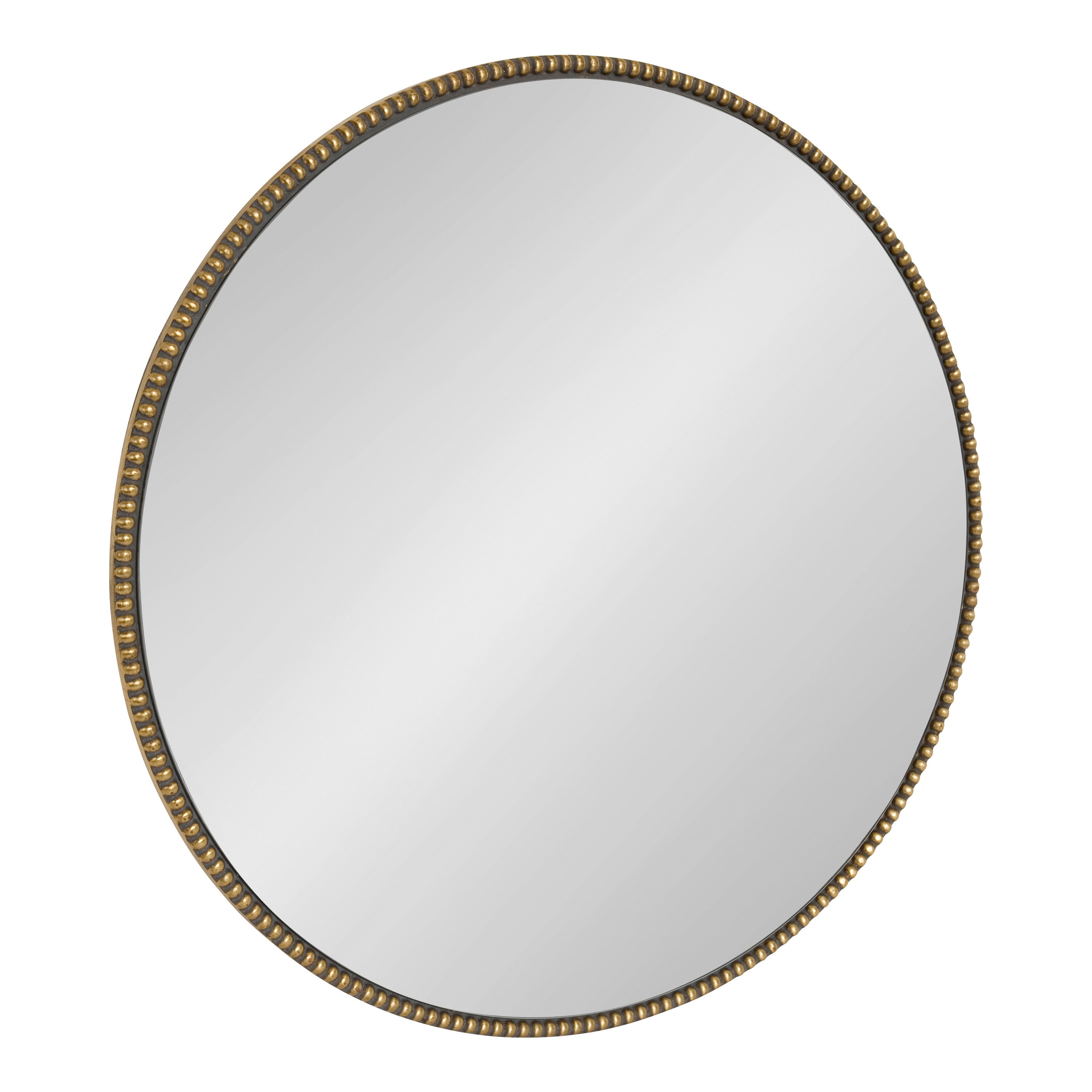 The beautiful Gwendolyn mirror showcases a stylish and glamorous aesthetic on your wall. This mirror features a beautiful beaded frame with an elegant finish to offer a textural look to elevate your decor. In addition, its large diameter and round shape make this the perfect mirror to create a dazzling focal point in your home, highlighting your elevated modern taste. Showcase it in the bedroom, over a console, on your living room mantle, or in your bathroom above your modern vanity.