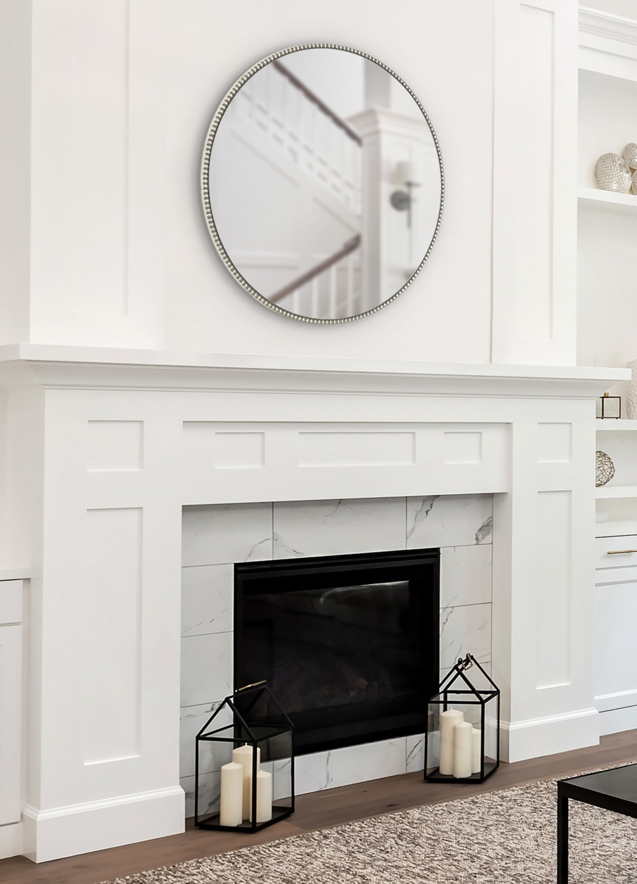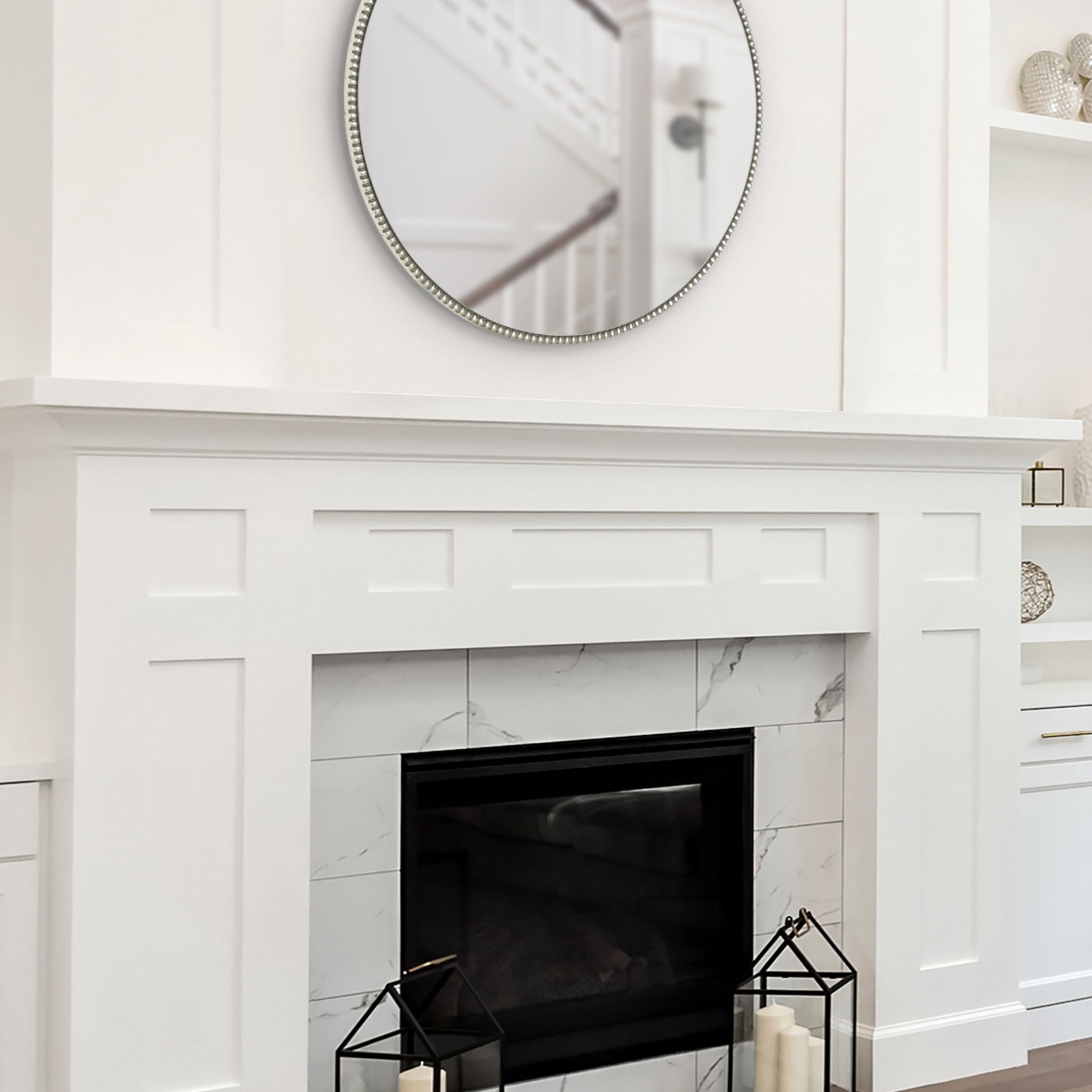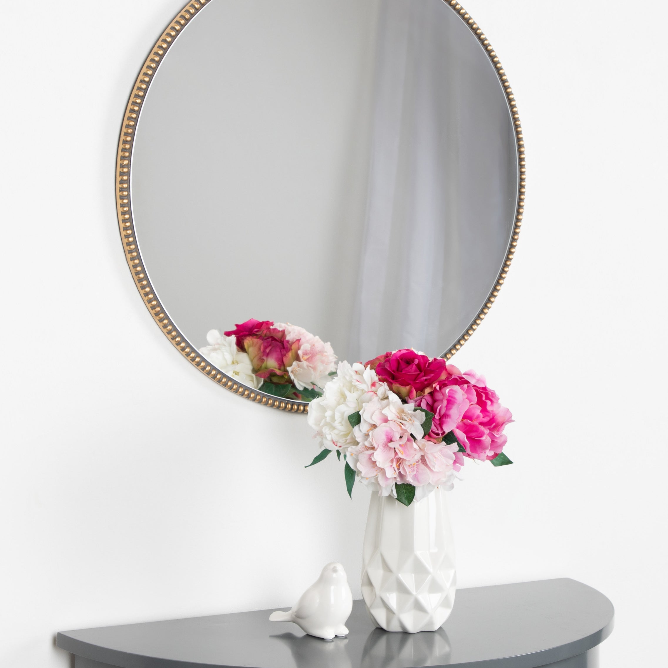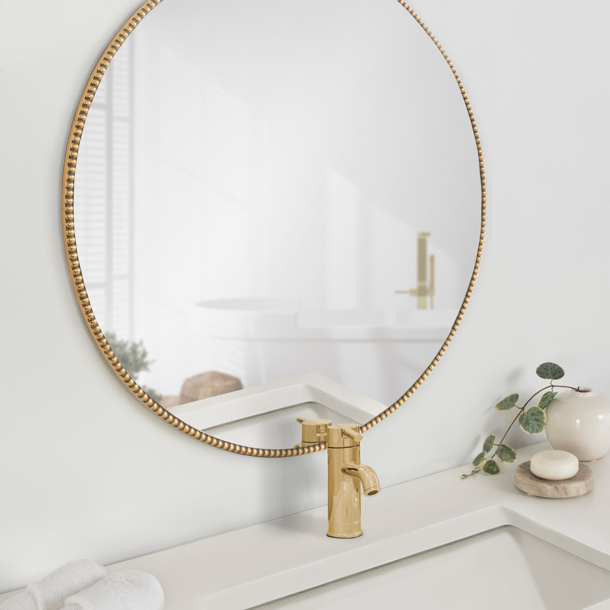 The beautiful Gwendolyn mirror showcases a stylish and glamorous aesthetic on your wall. This mirror features a beautiful beaded frame with an elegant finish to offer a textural look to elevate your decor. In addition, its large diameter and round shape make this the perfect mirror to create a dazzling focal point in your home, highlighting your elevated modern taste. Showcase it in the bedroom, over a console, on your living room mantle, or in your bathroom above your modern vanity.