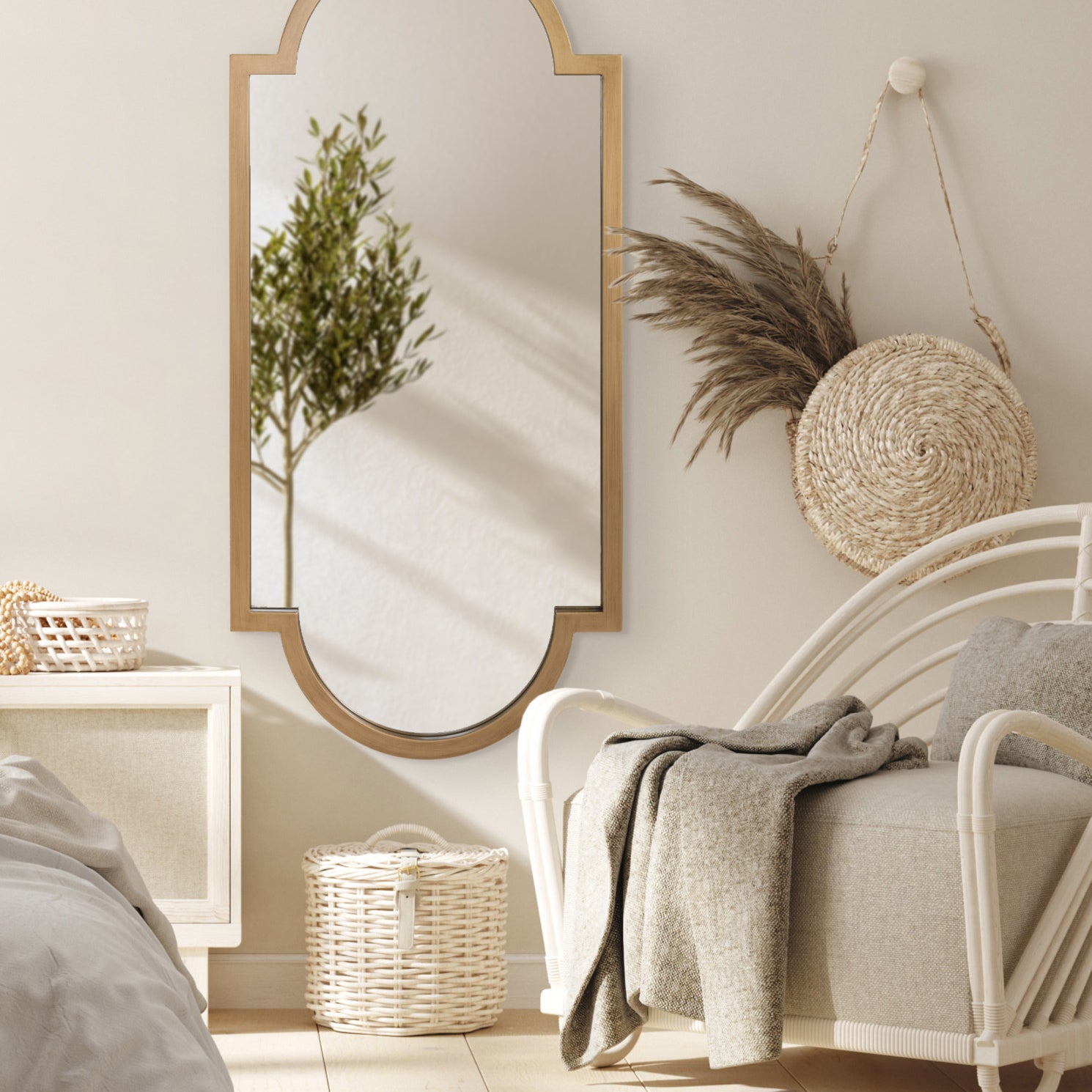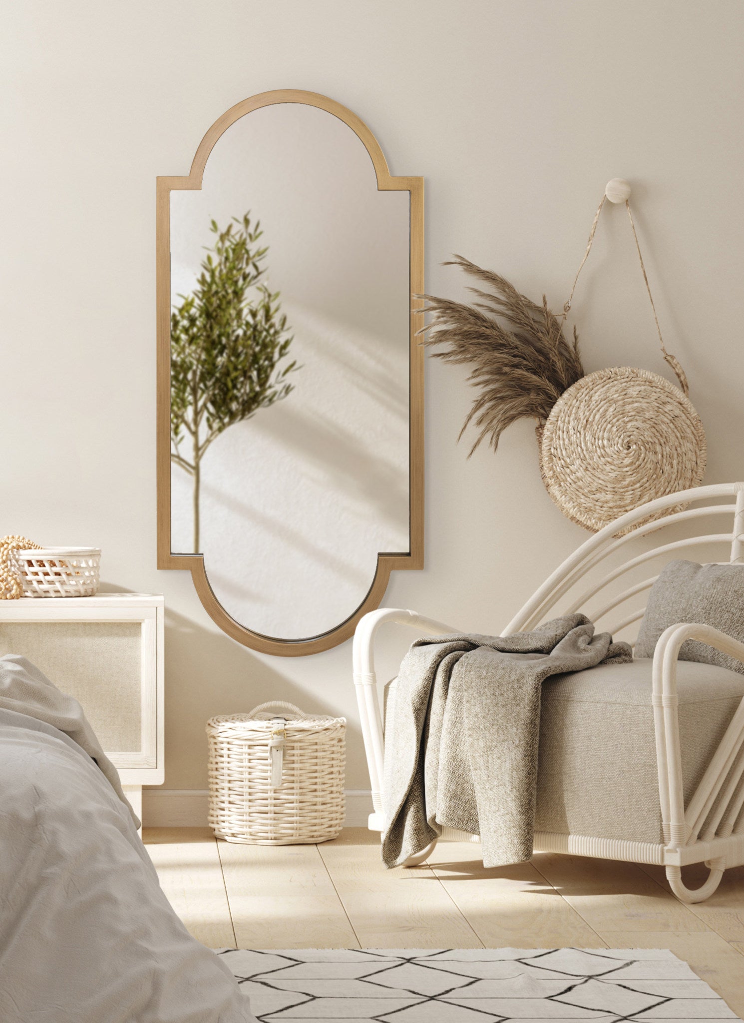This stunning mirror is the perfect way to showcase your sophisticated style while opening up your space. It has an elegant shape with a panel look, featuring rounded edges at the top and bottom with clean, straightforward lines on either side. The frame of the mirror is made of wooden material, making it lightweight yet resilient to create a statement piece that will last. Hang this mirror either vertically or horizontally, allowing for a robust accent piece that can blend into a variety of decor scenes. Its generous height makes it a fun decorative full-length mirror option for checking your outfit before heading out for the day. If you have a bathroom with tall ceilings, you could make a grand statement above your vanity as well!