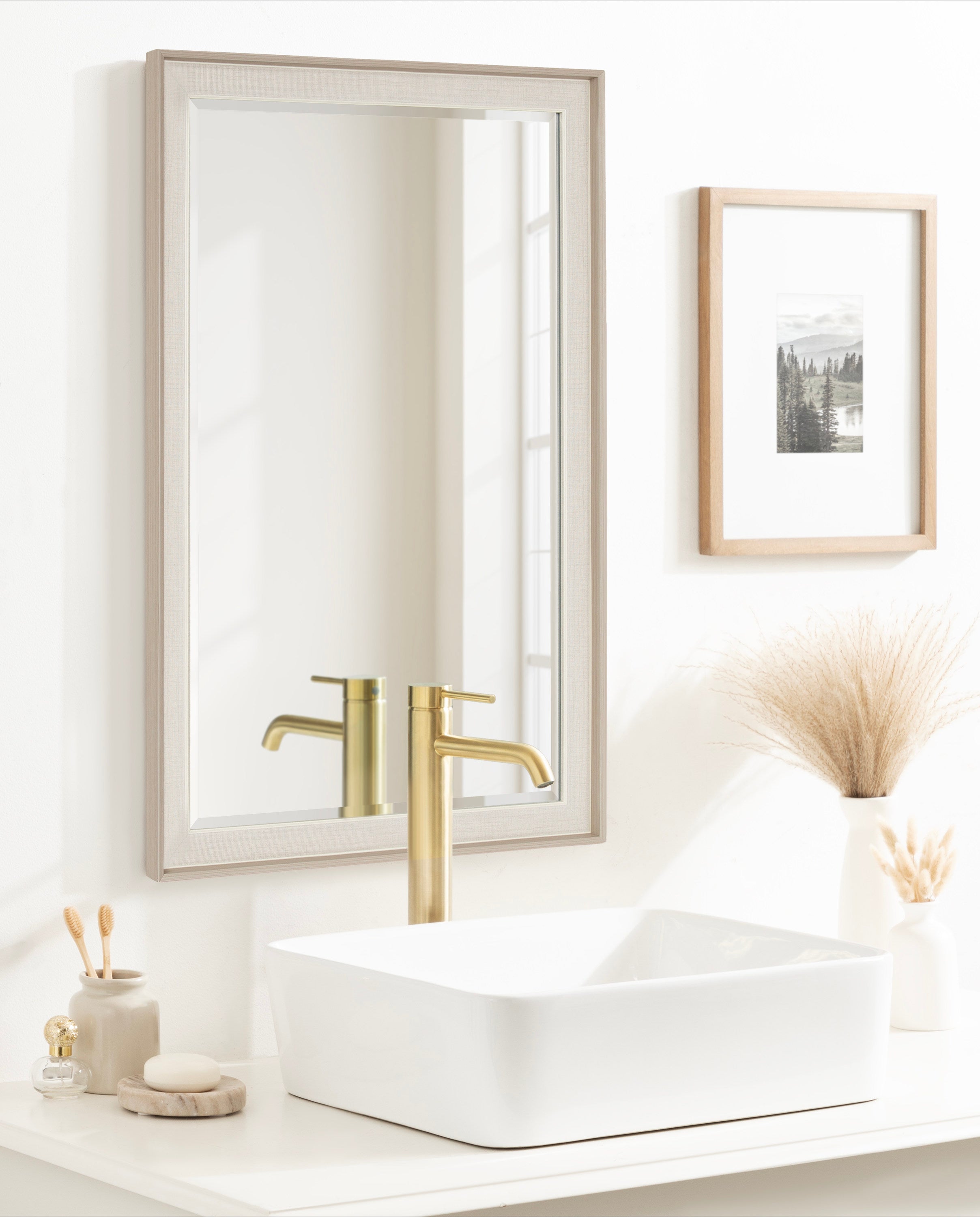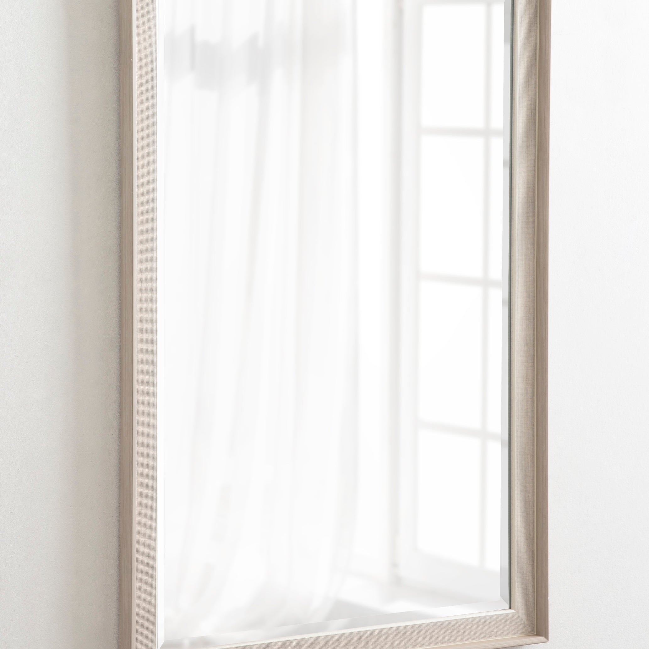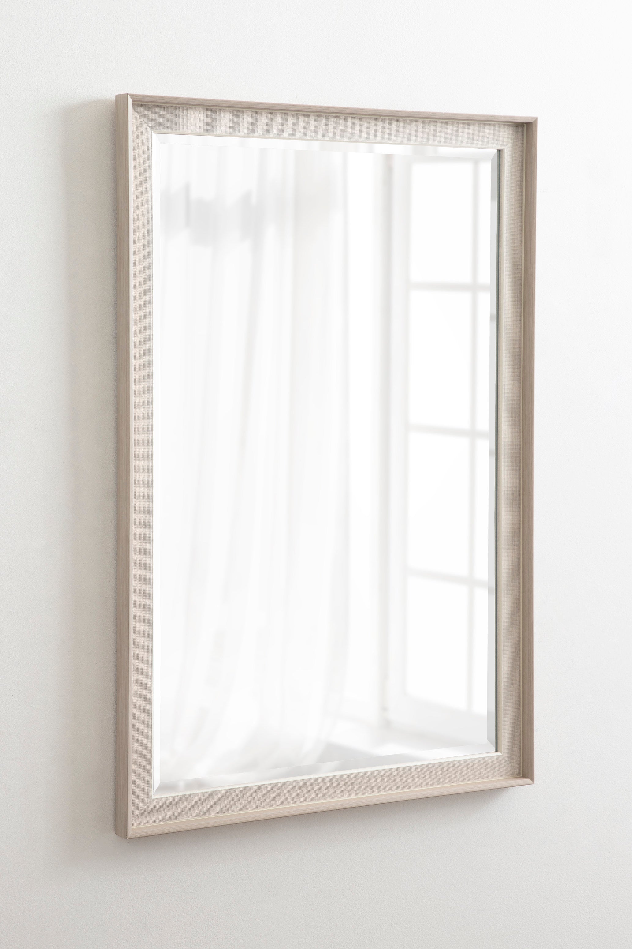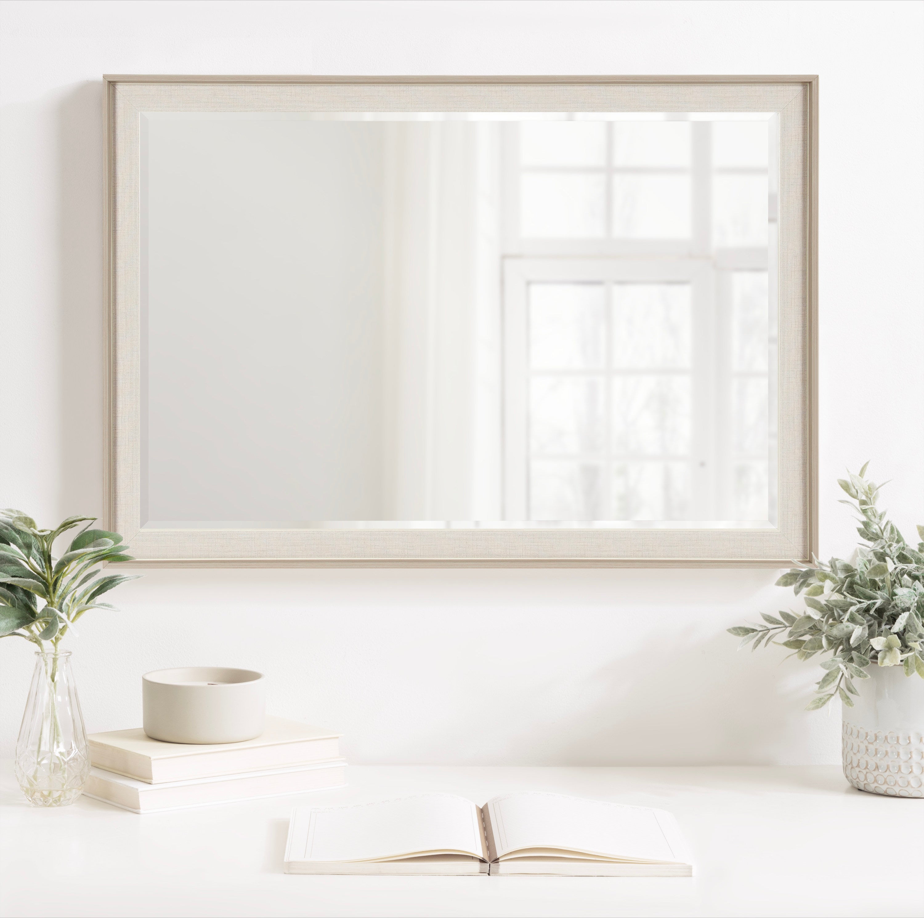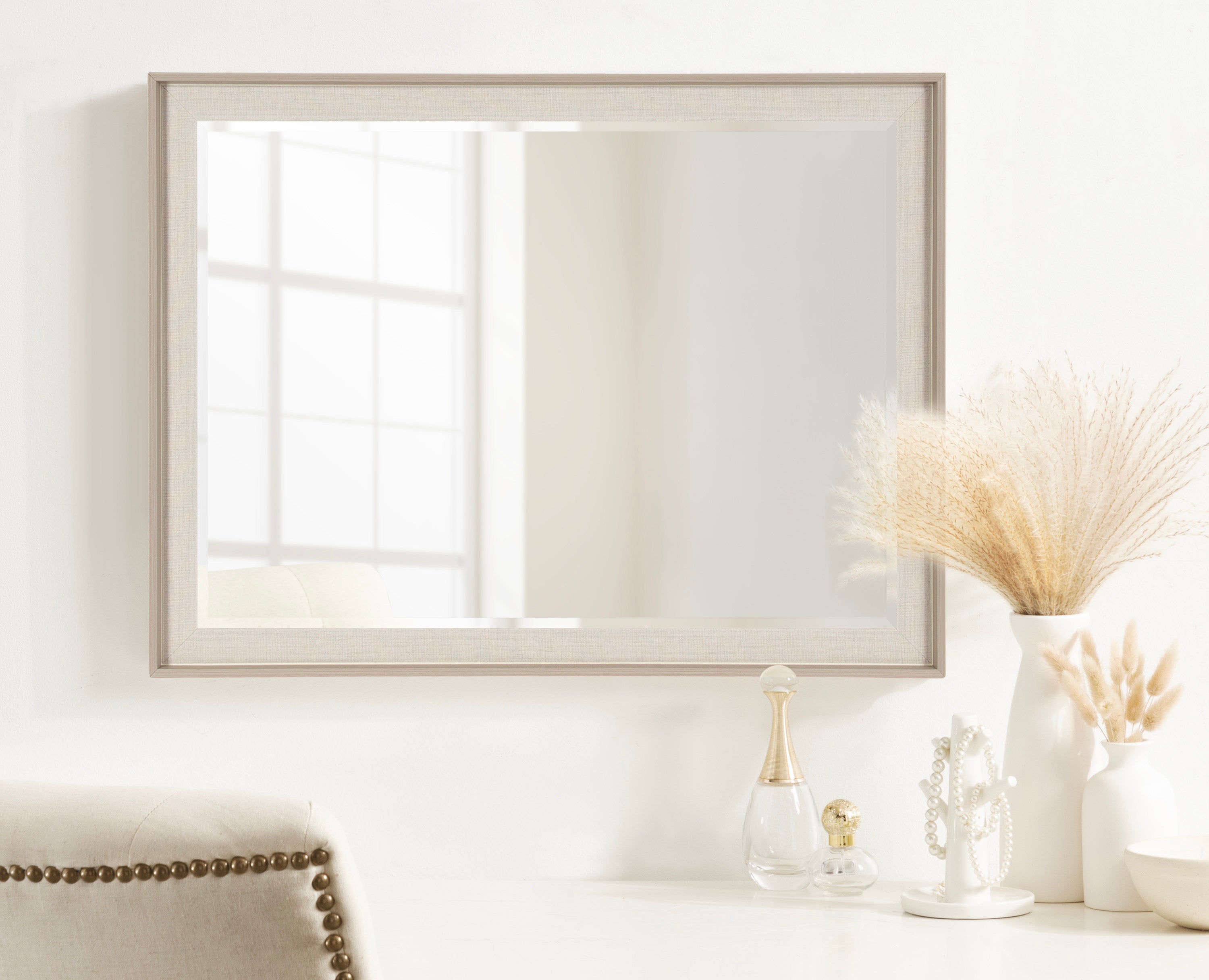 This beautiful mirror boasts a modern transitional design with a lovely finish and a fine linen texture. The subtle patterned texture and beveled edge add an elegant touch to this mirror, making it a stylish and sophisticated addition to any room. The rectangular shape of the mirror is suitable for use as a small bathroom vanity mirror, providing ample space for getting ready for the day.