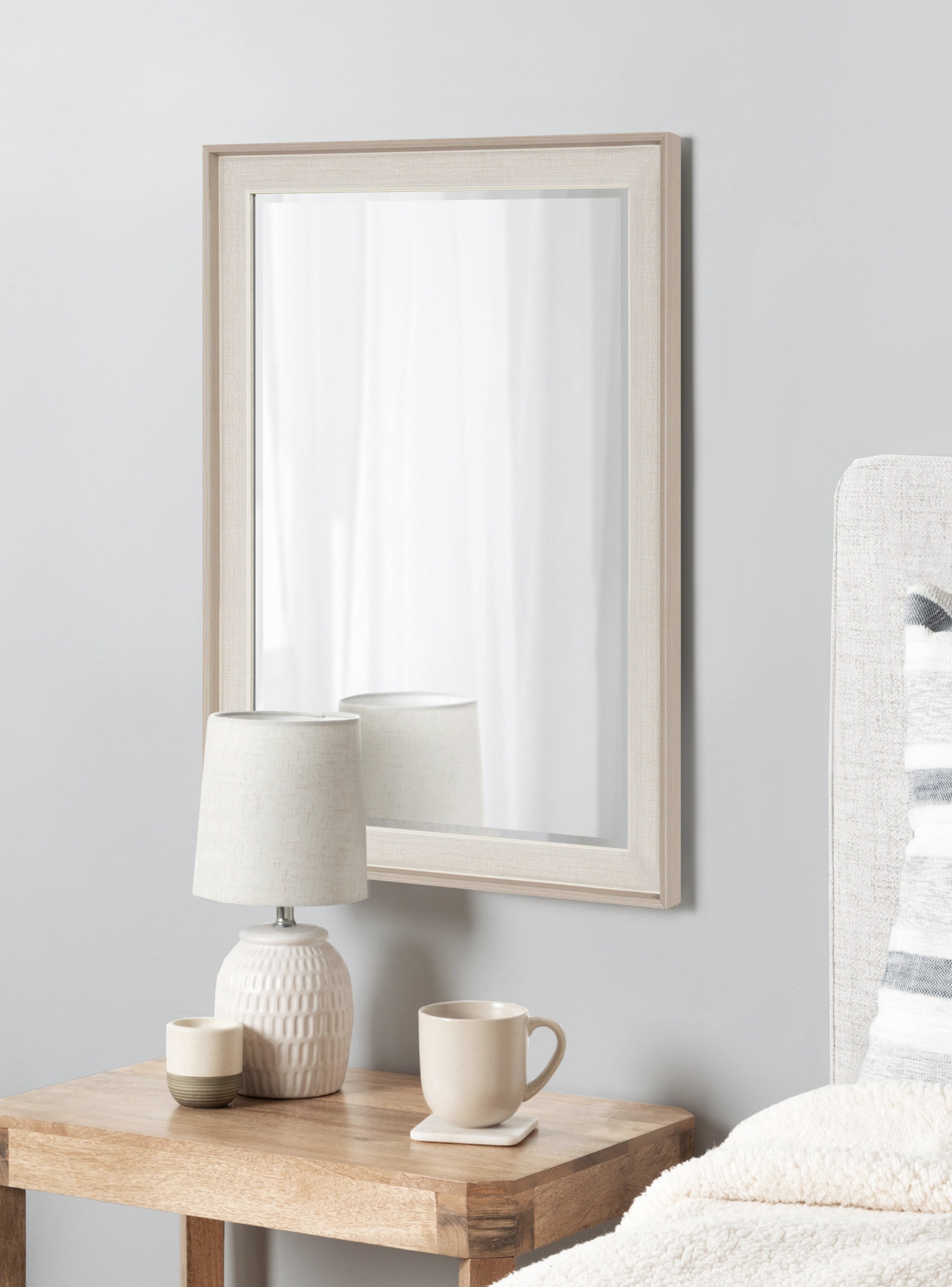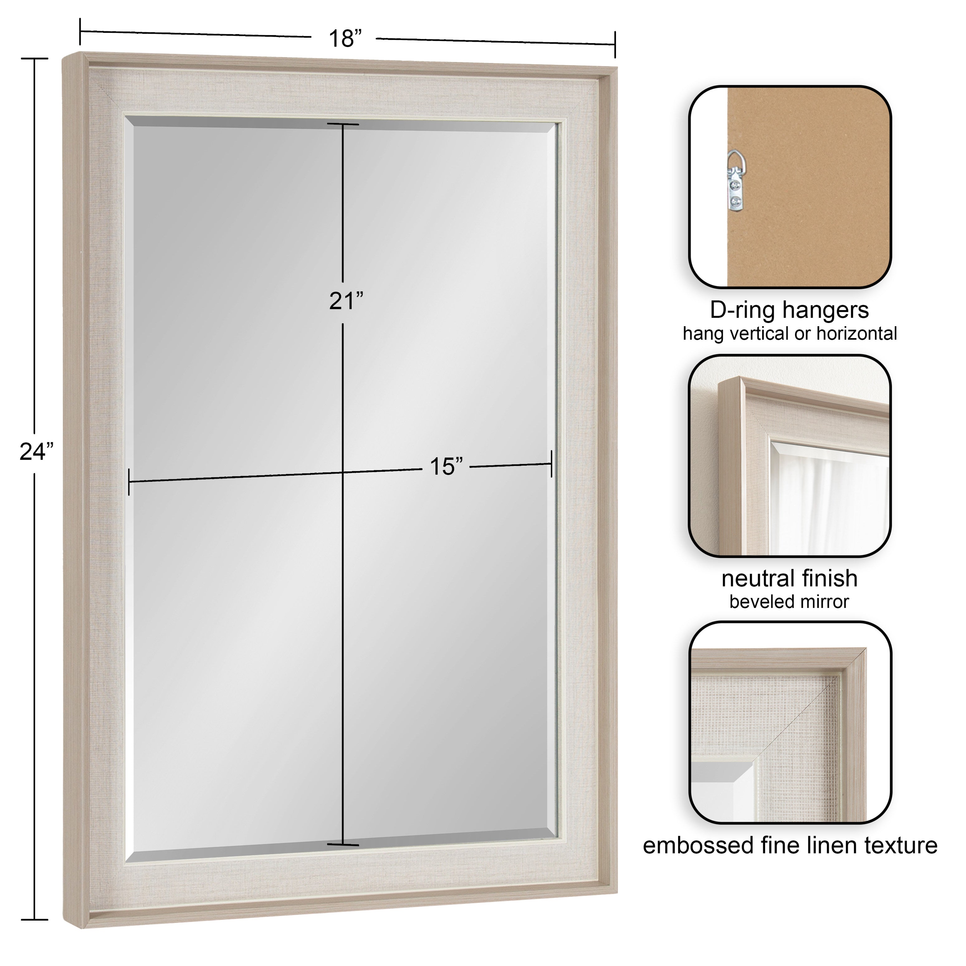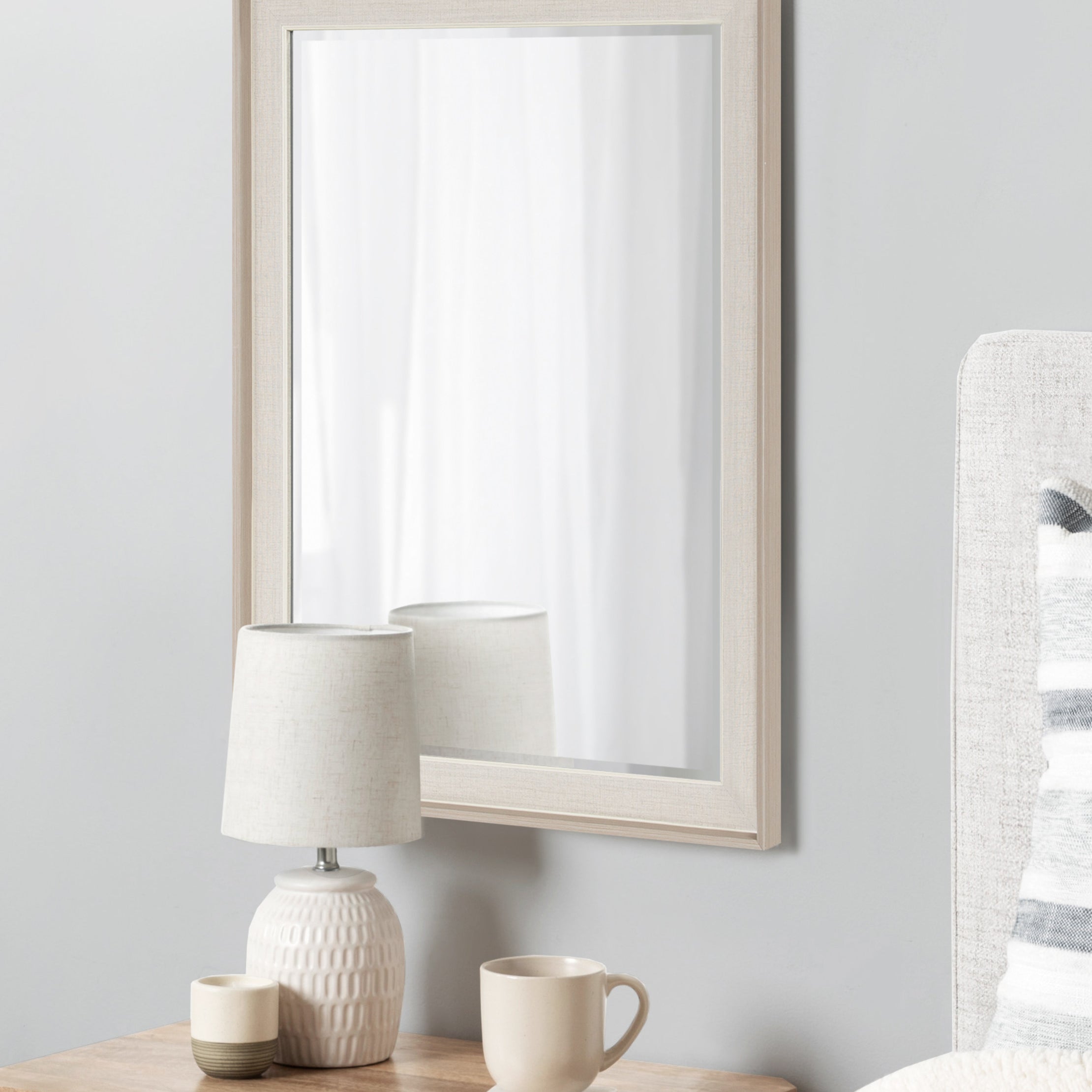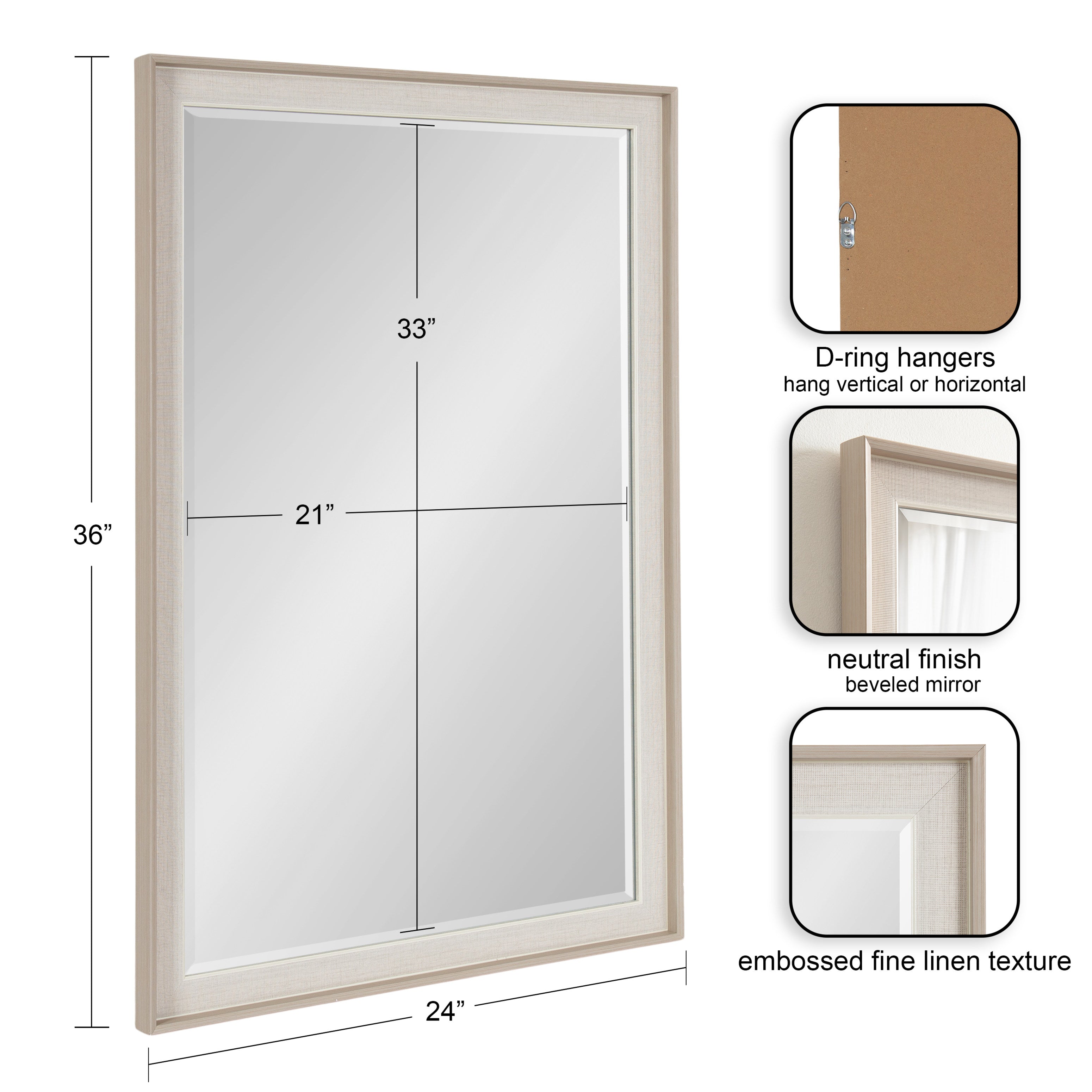 This beautiful mirror boasts a modern transitional design with a lovely finish and a fine linen texture. The subtle patterned texture and beveled edge add an elegant touch to this mirror, making it a stylish and sophisticated addition to any room. The rectangular shape of the mirror is suitable for use as a small bathroom vanity mirror, providing ample space for getting ready for the day.