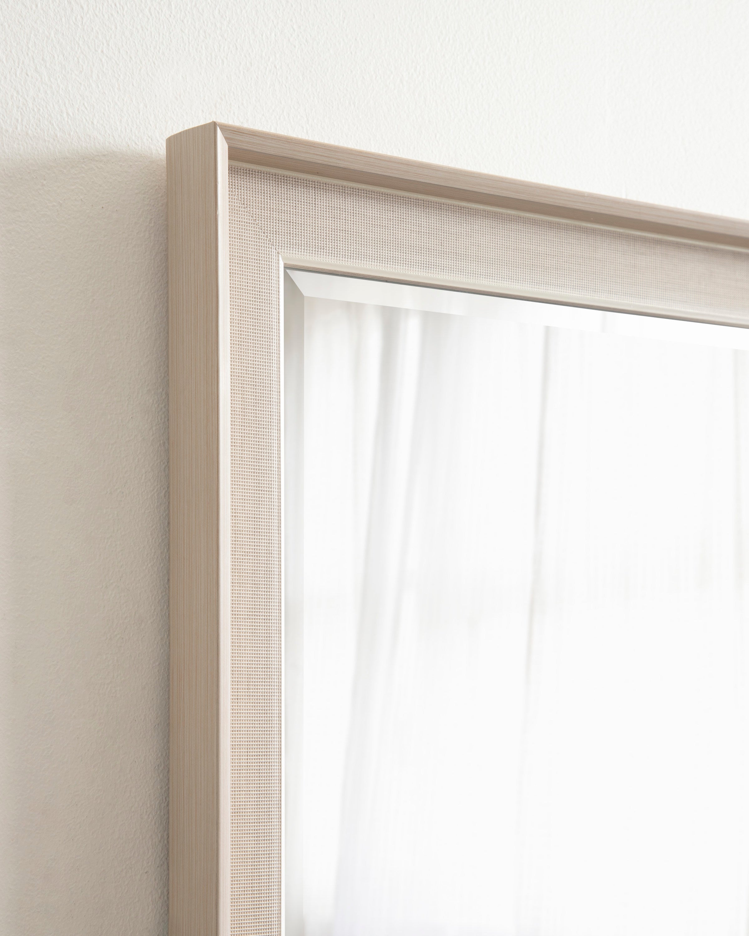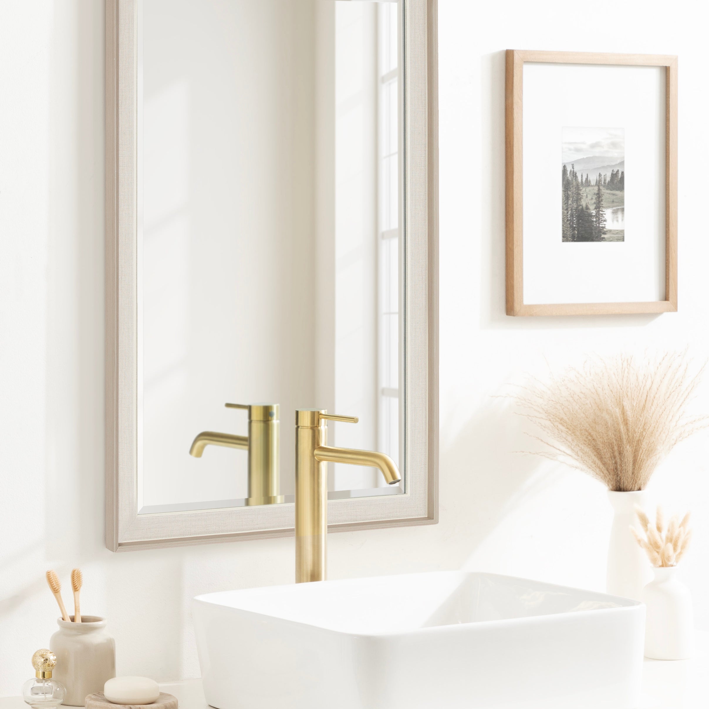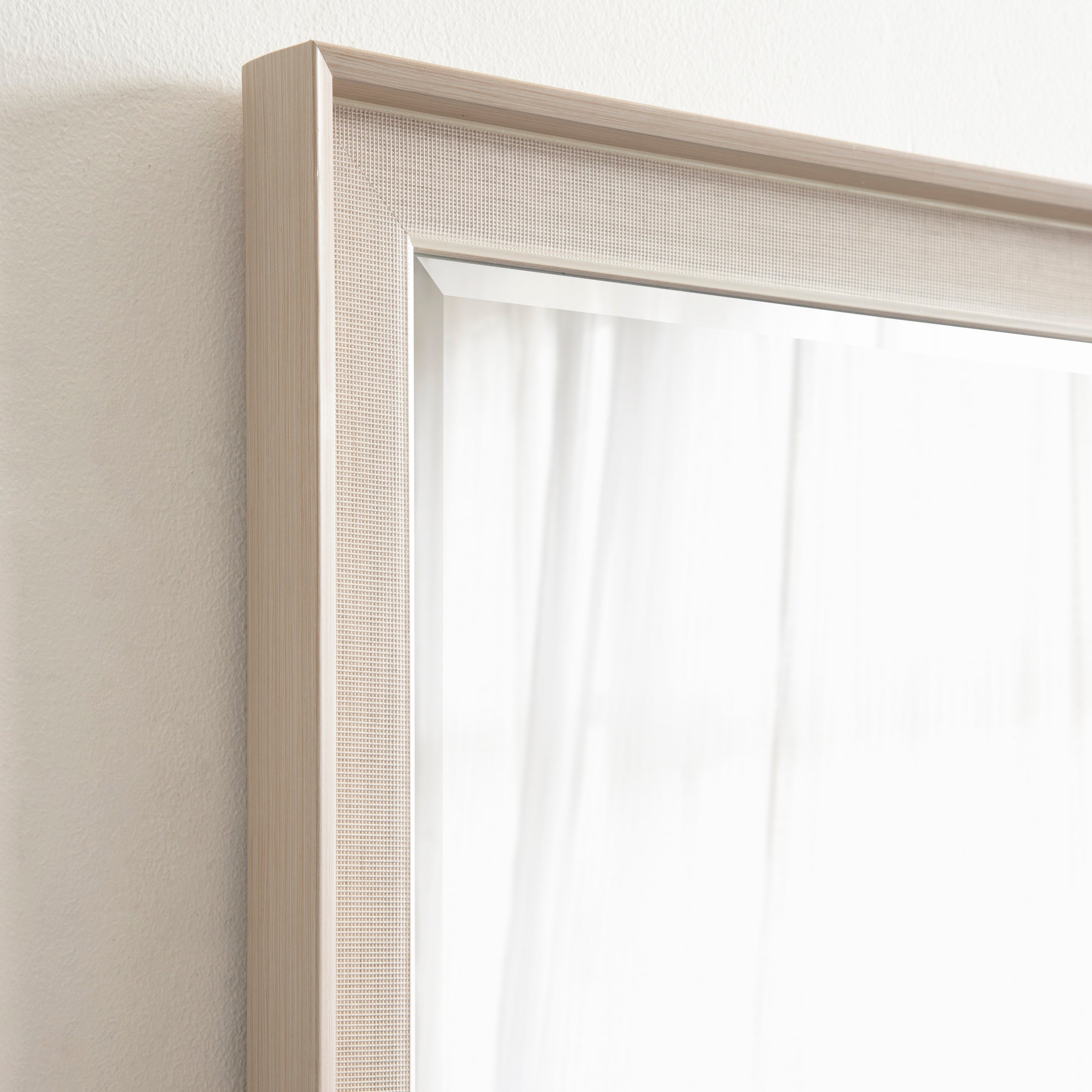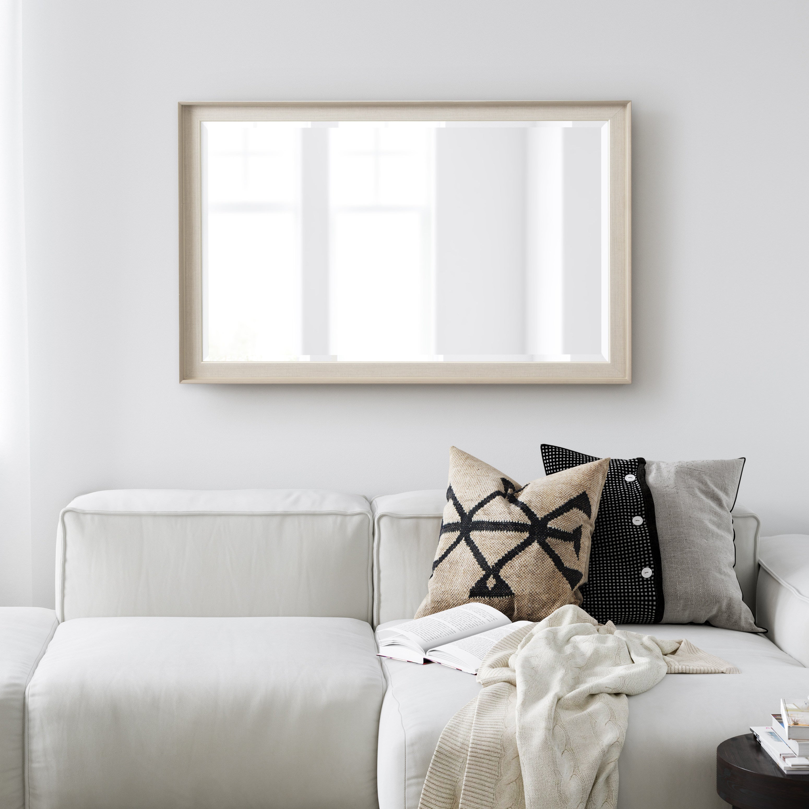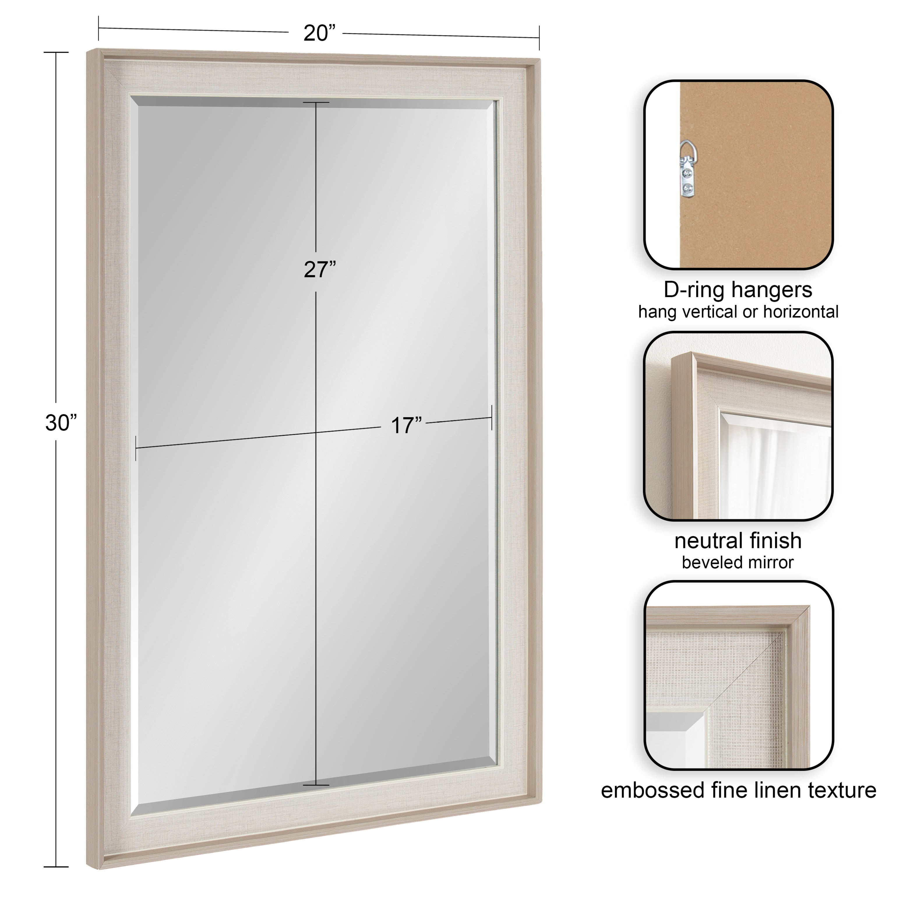 This beautiful mirror boasts a modern transitional design with a lovely finish and a fine linen texture. The subtle patterned texture and beveled edge add an elegant touch to this mirror, making it a stylish and sophisticated addition to any room. The rectangular shape of the mirror is suitable for use as a small bathroom vanity mirror, providing ample space for getting ready for the day.