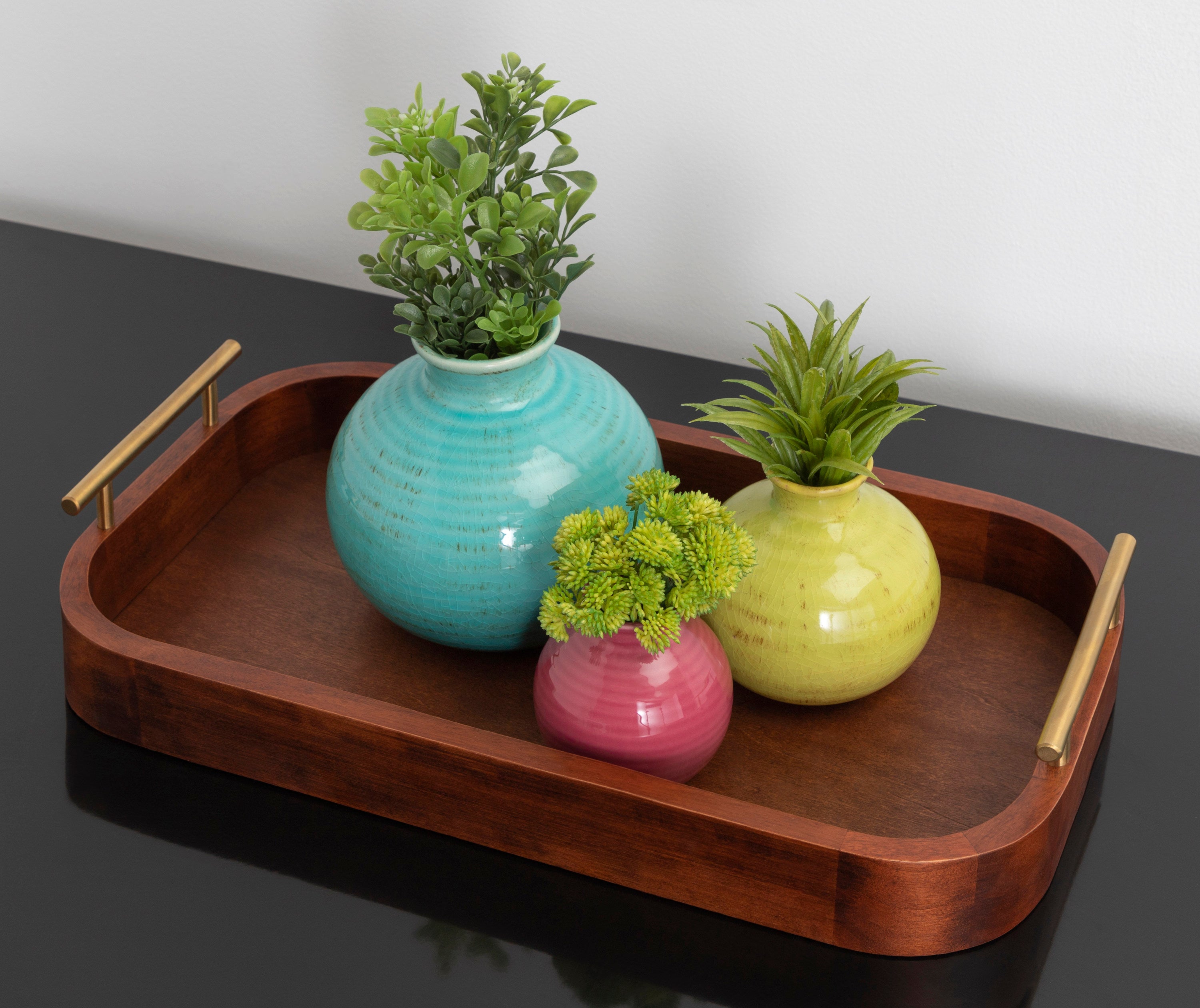 Bring a new level of mid-century elegance with the Lipton rectangle wood tray. This tray has rounded edges and eye-catching metal handles with a lux metal finish. It blends well with any mid-century decor, with a bold, striking finish on its wood surface. Use it for storage or decorative display.