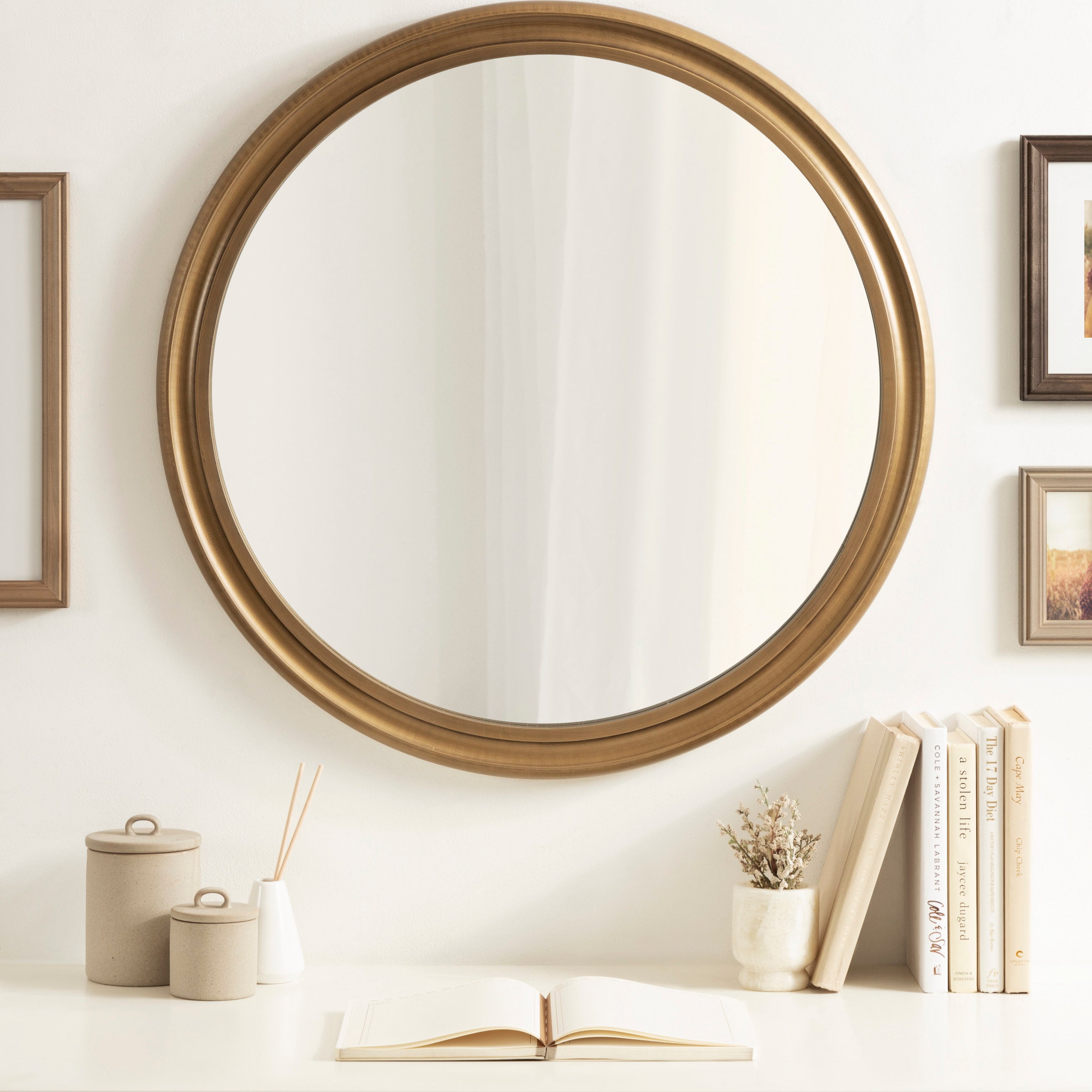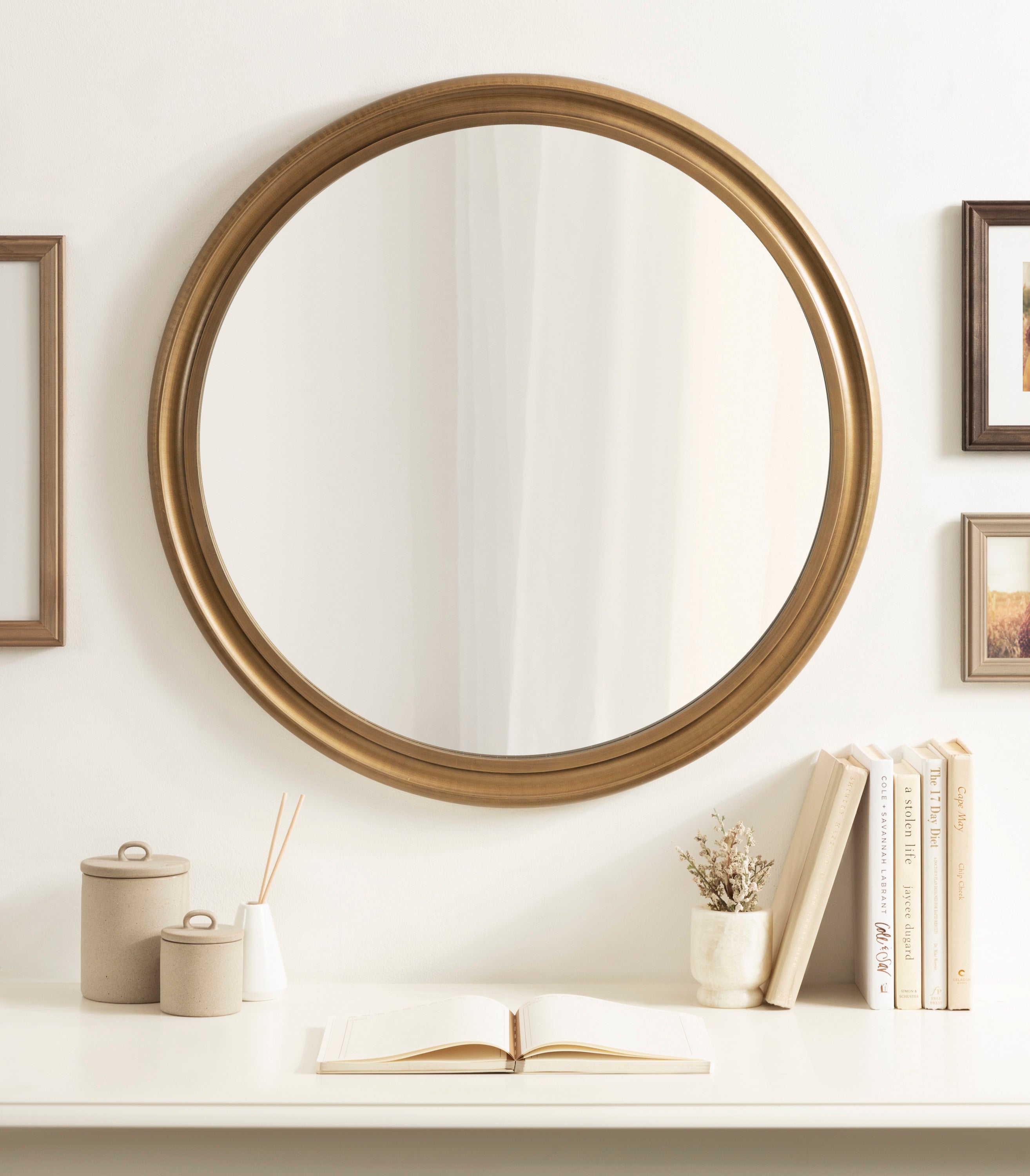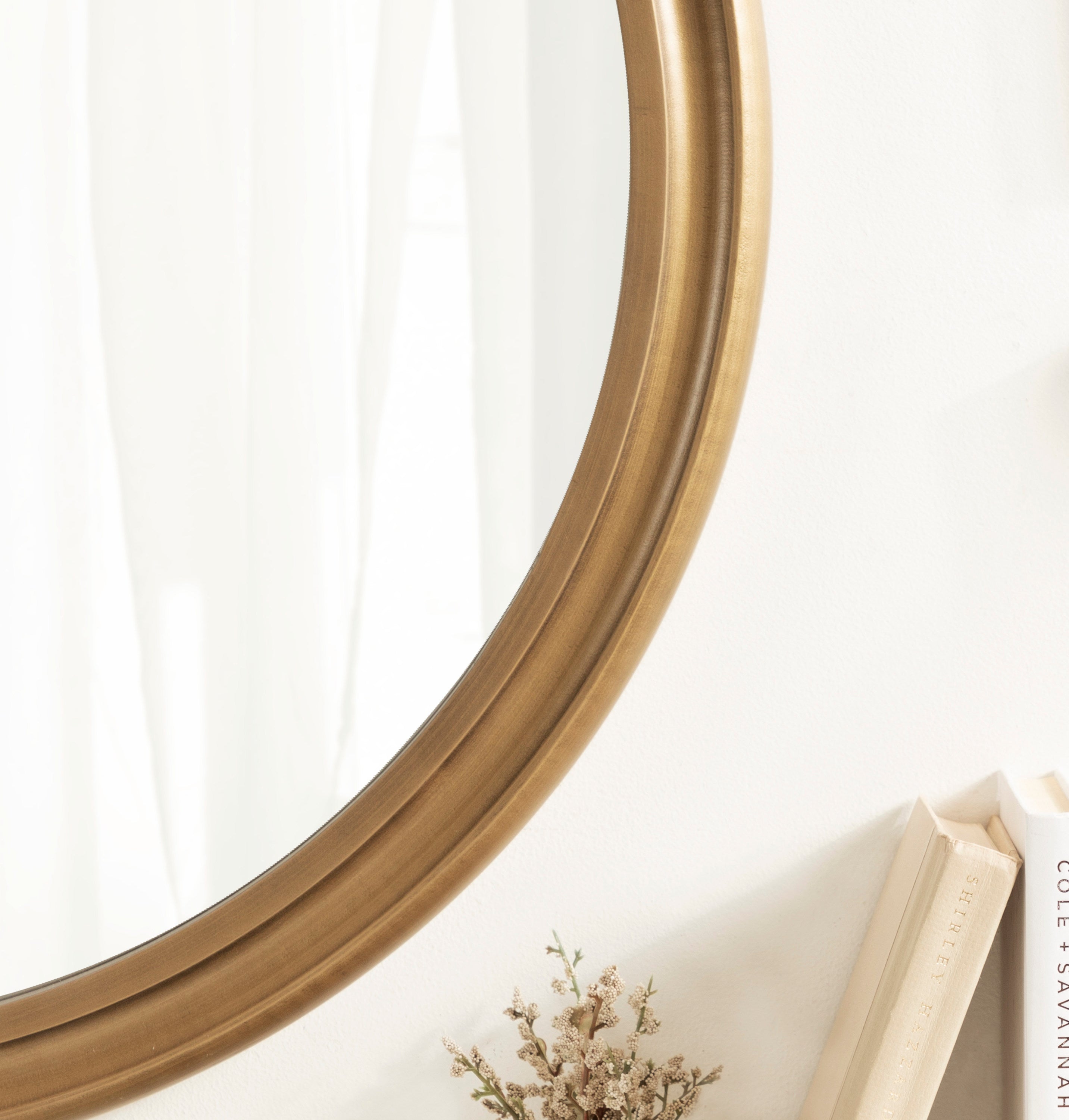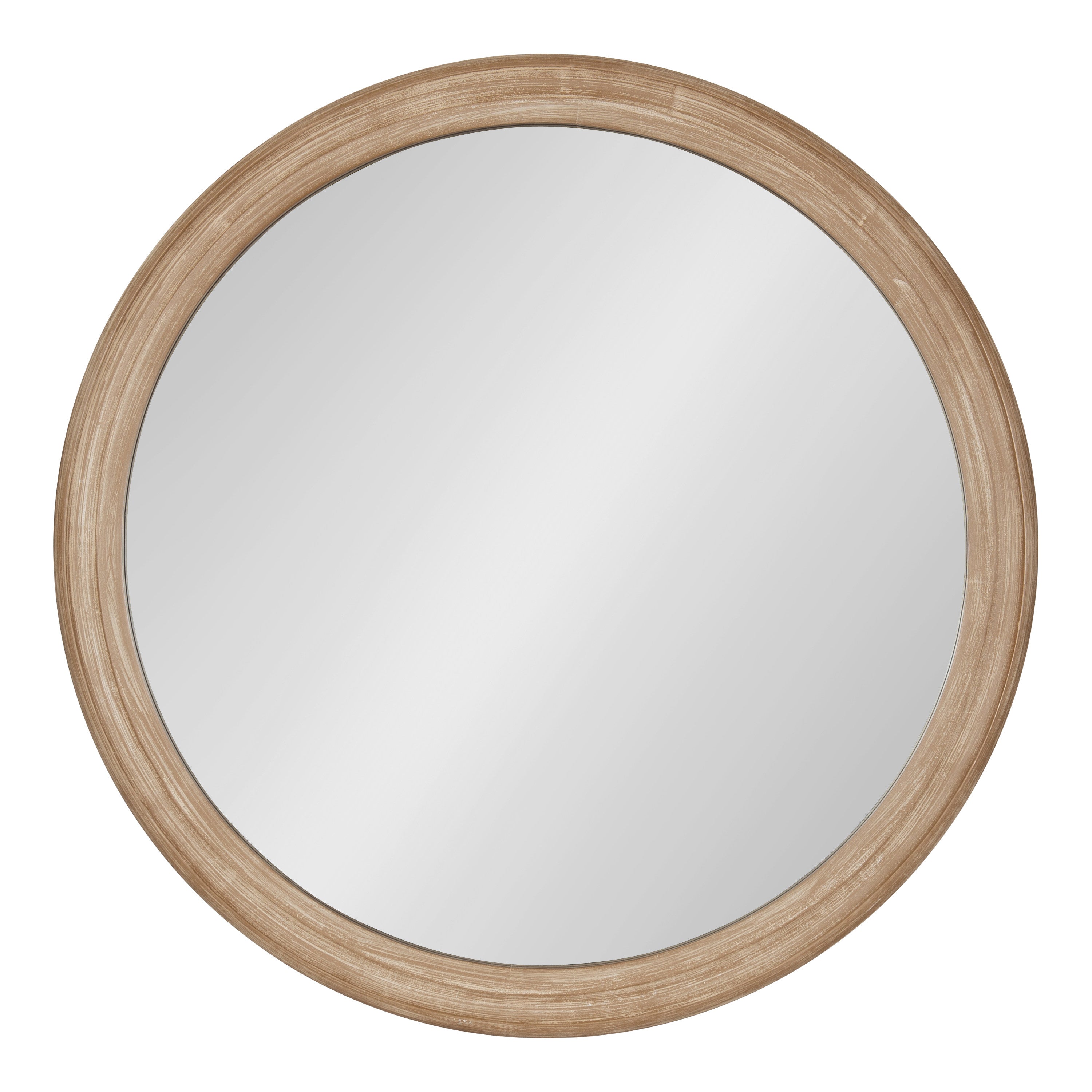 Make a bold and sophisticated statement on your wall with the beautiful transitional style of the Mansell decorative wall mirror. A well-built, ornamental wooden frame borders the curved oval glass mirror. Its sophisticated frame features a sloped style and has a durable, textured wood construction. Hang this lovely statement piece proudly over your vanity, dresser, shelf, or hang it as an accent piece in the living room, dining room, family room, or bedroom.