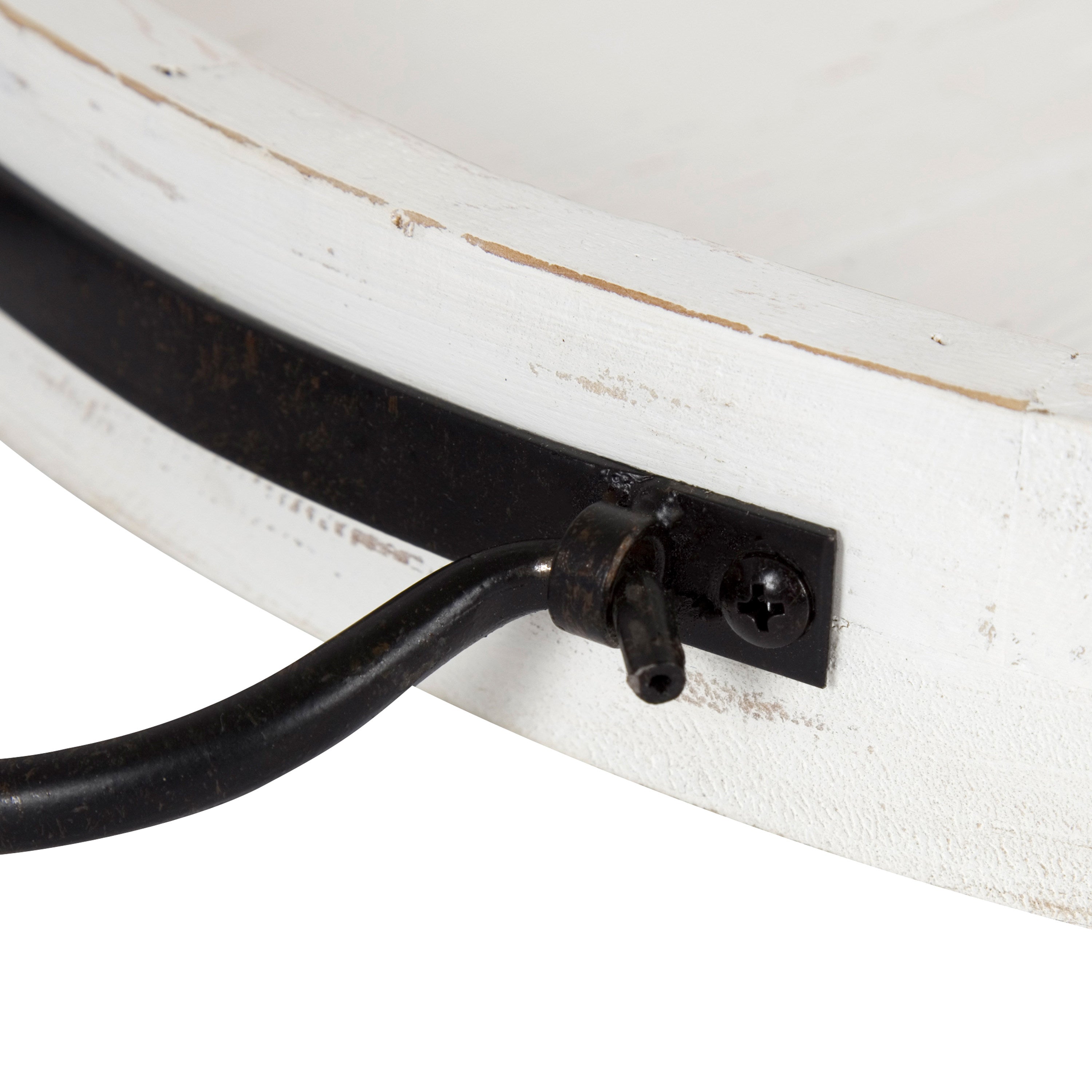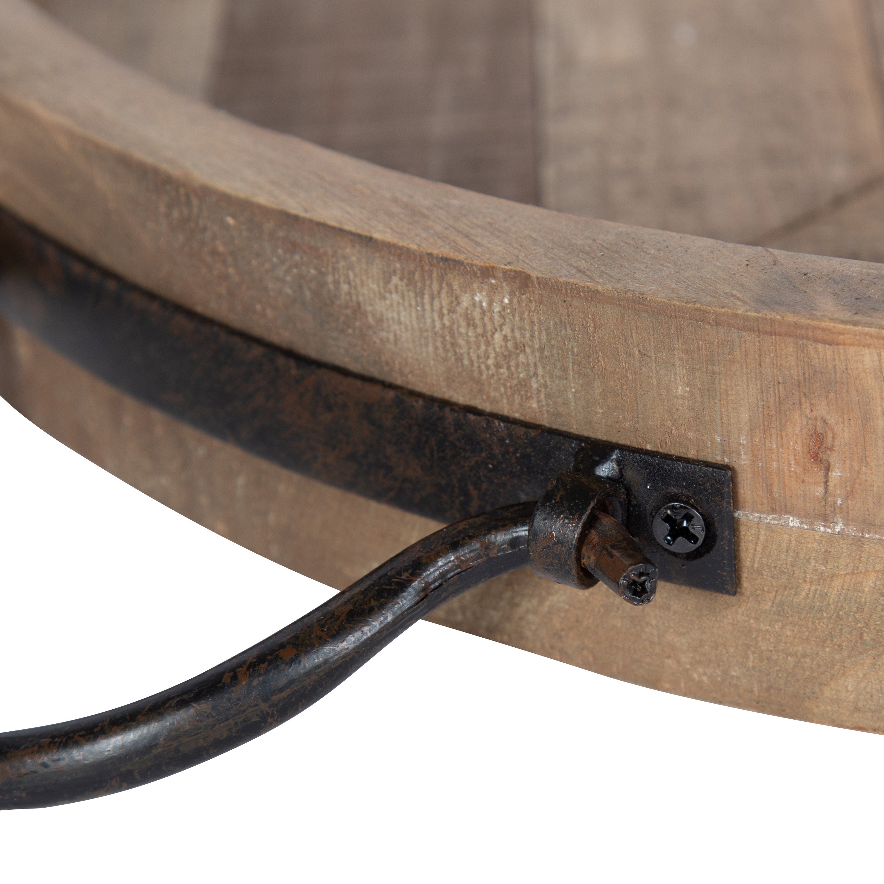 - Constructed of a wood with two sturdy black metal handles and a weathered like finish