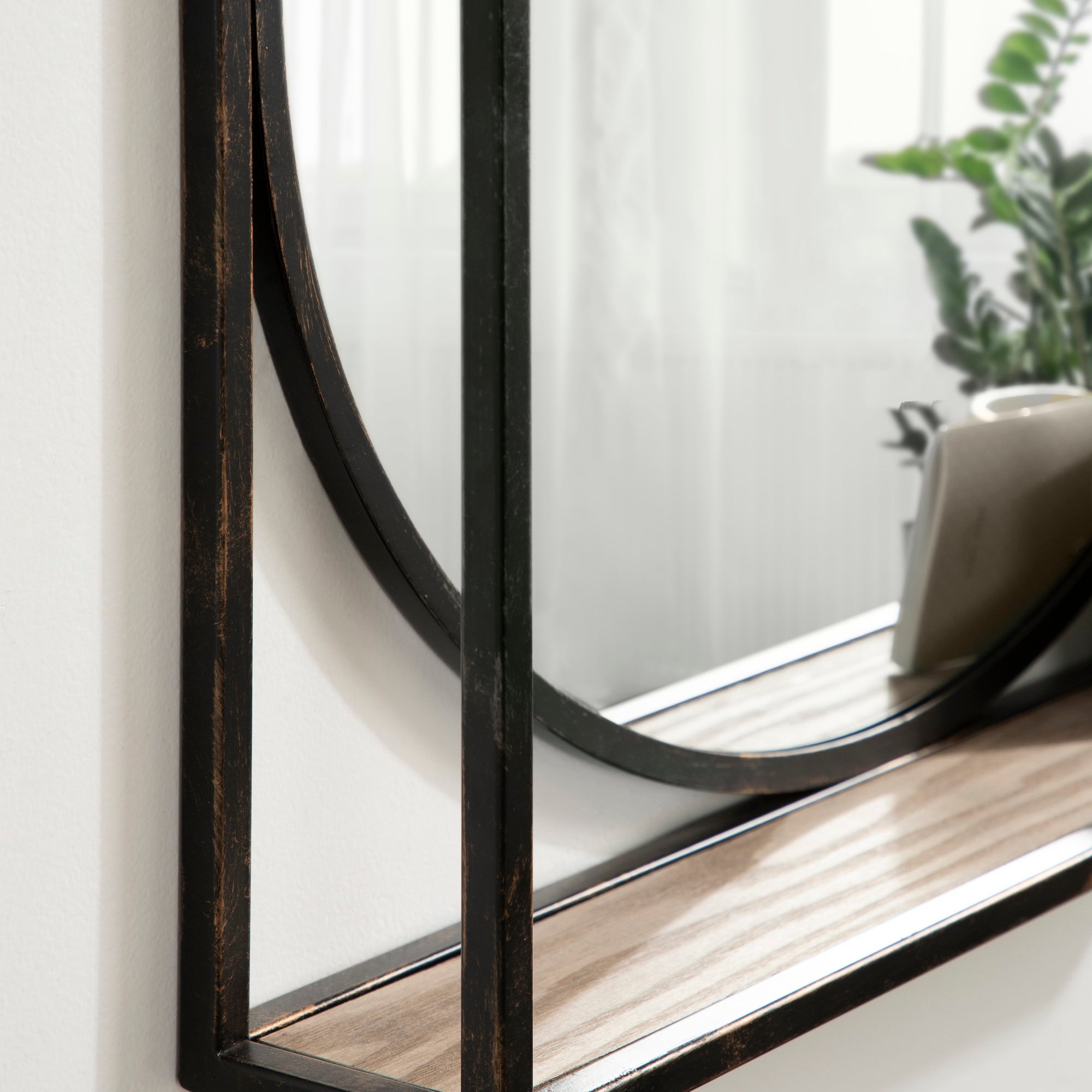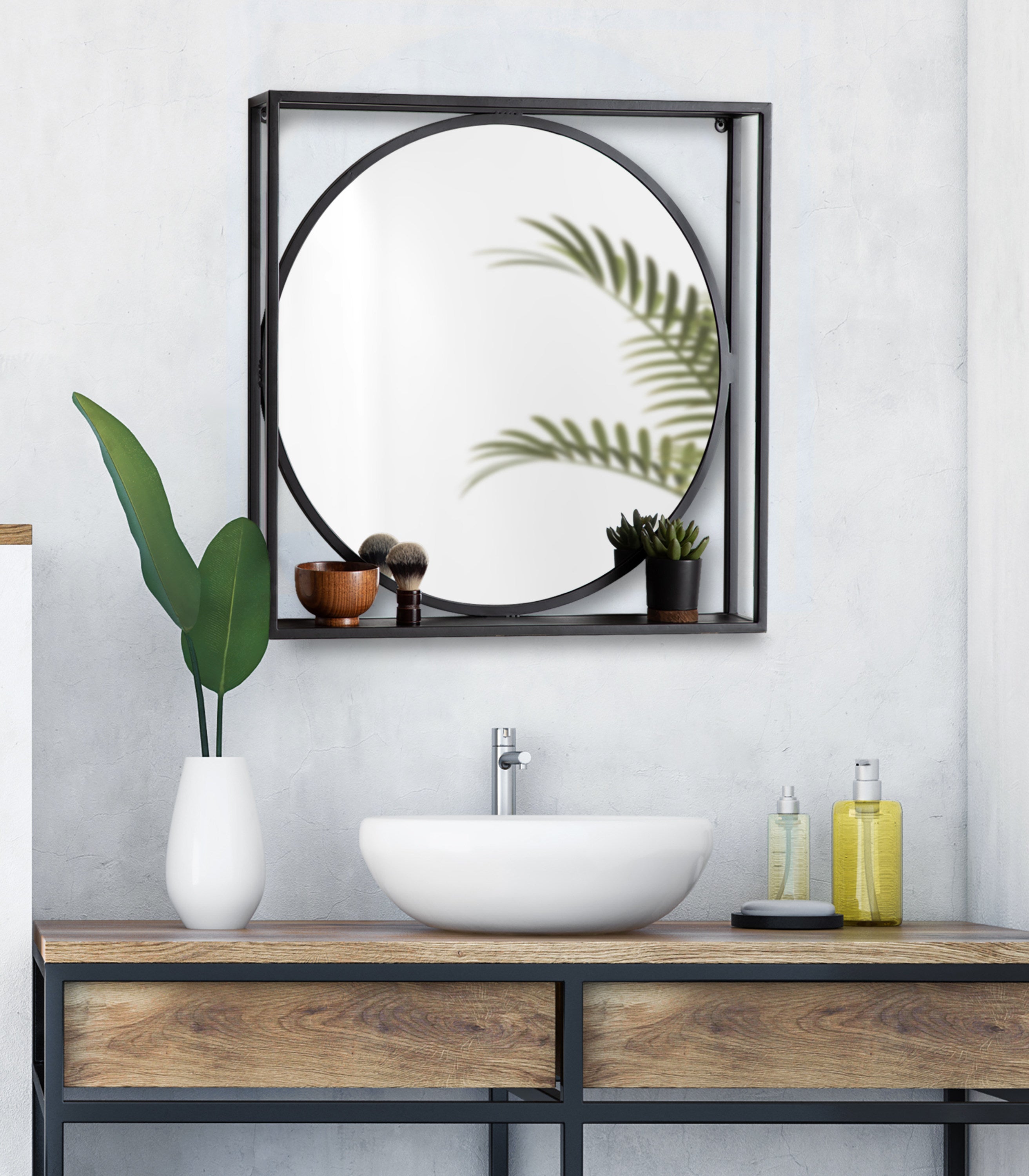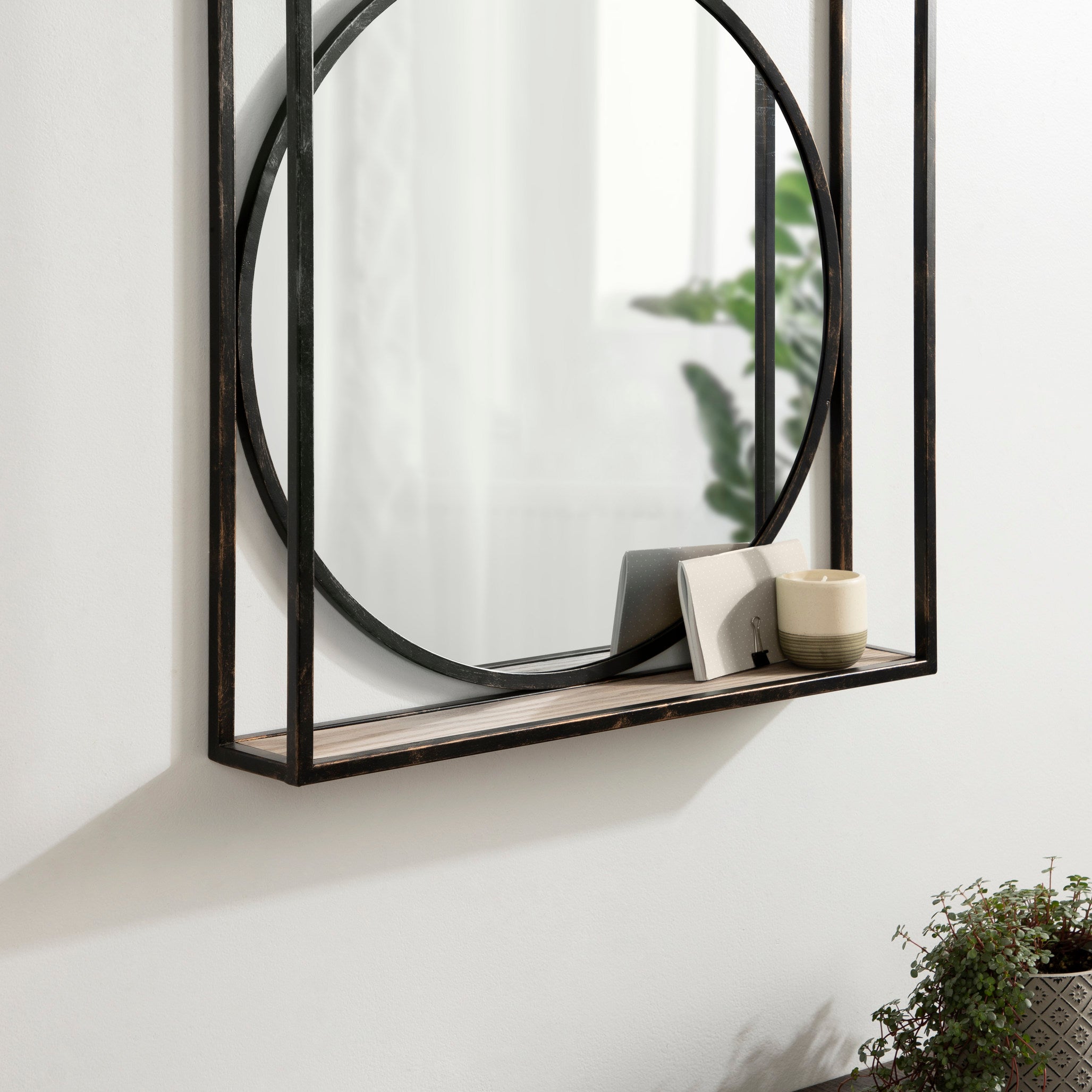 The McCauley Wall-Mounted Mirror creates the perfect modern addition to your home with its trendy geometric shape and clean black finish. Designed with a 3.5" shelf depth, this mirror has the capability to display small plants, photos, and keepsakes. This mirror hangs in only a matter of seconds with metal eyelet hangers and no assembly required. Mount this beautiful modern statement piece in your living room, bedroom, entryway, bathroom, or dining room.