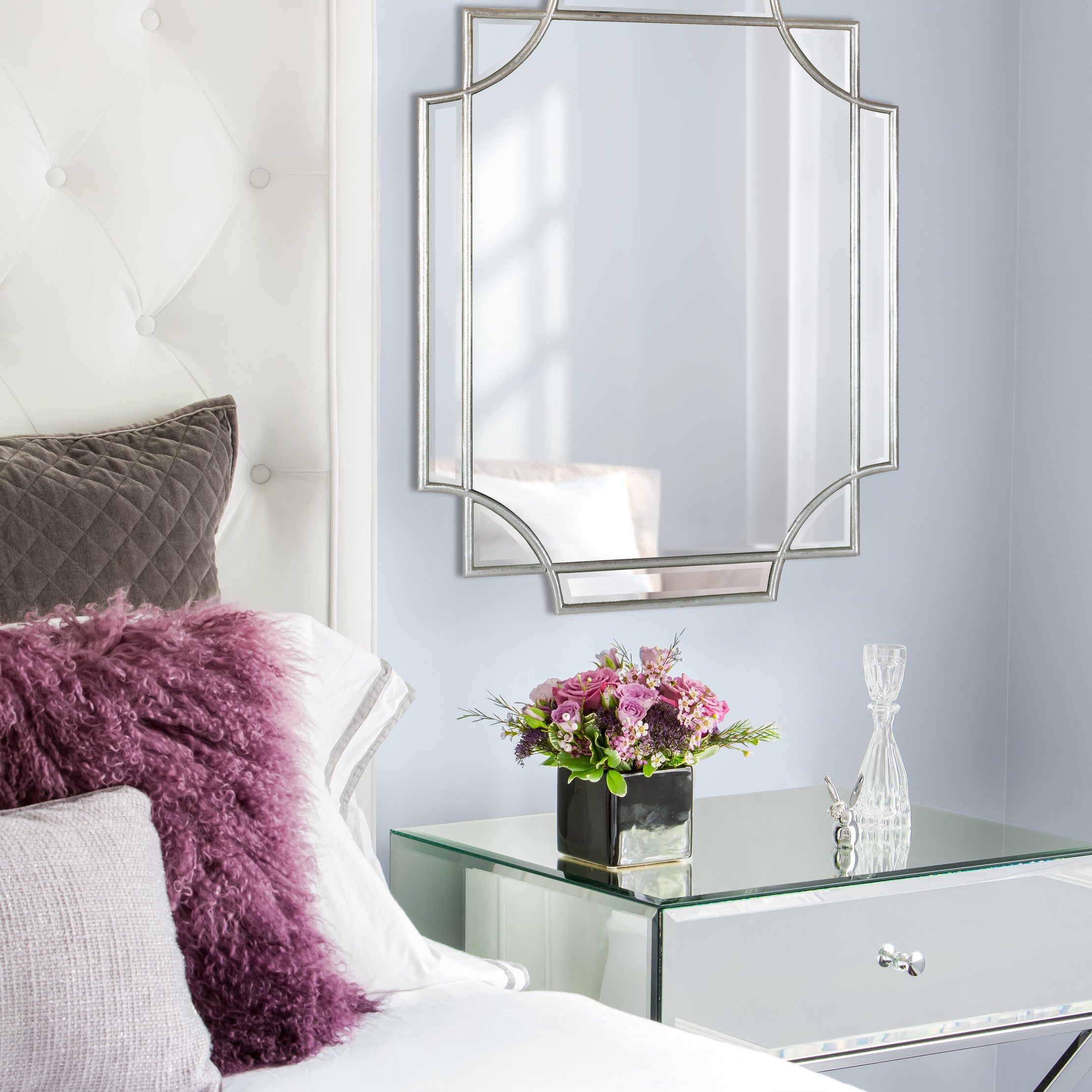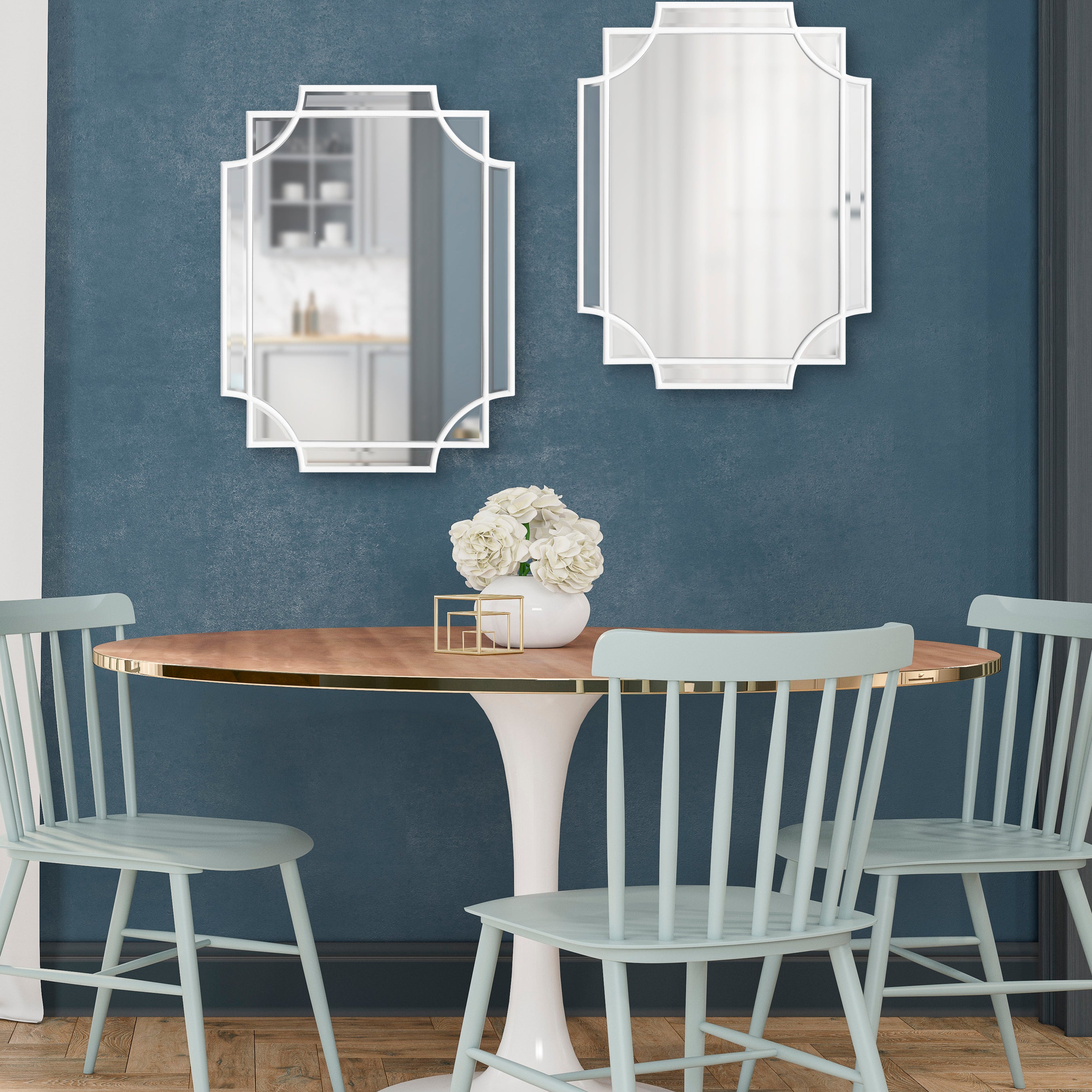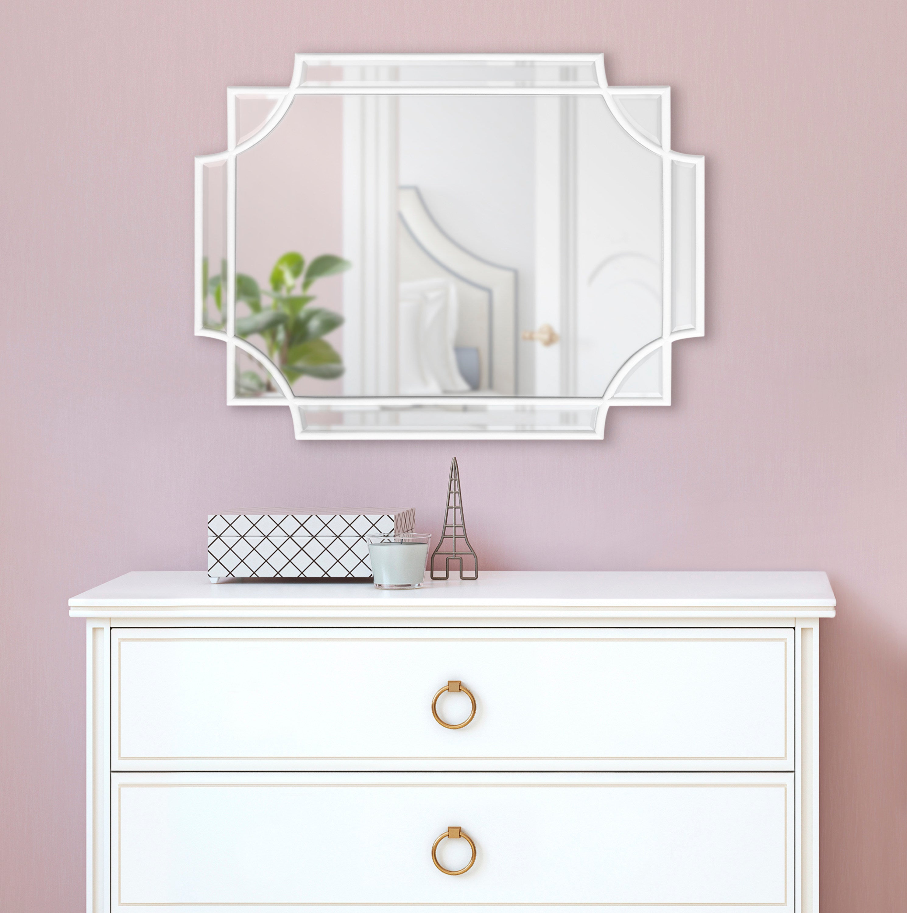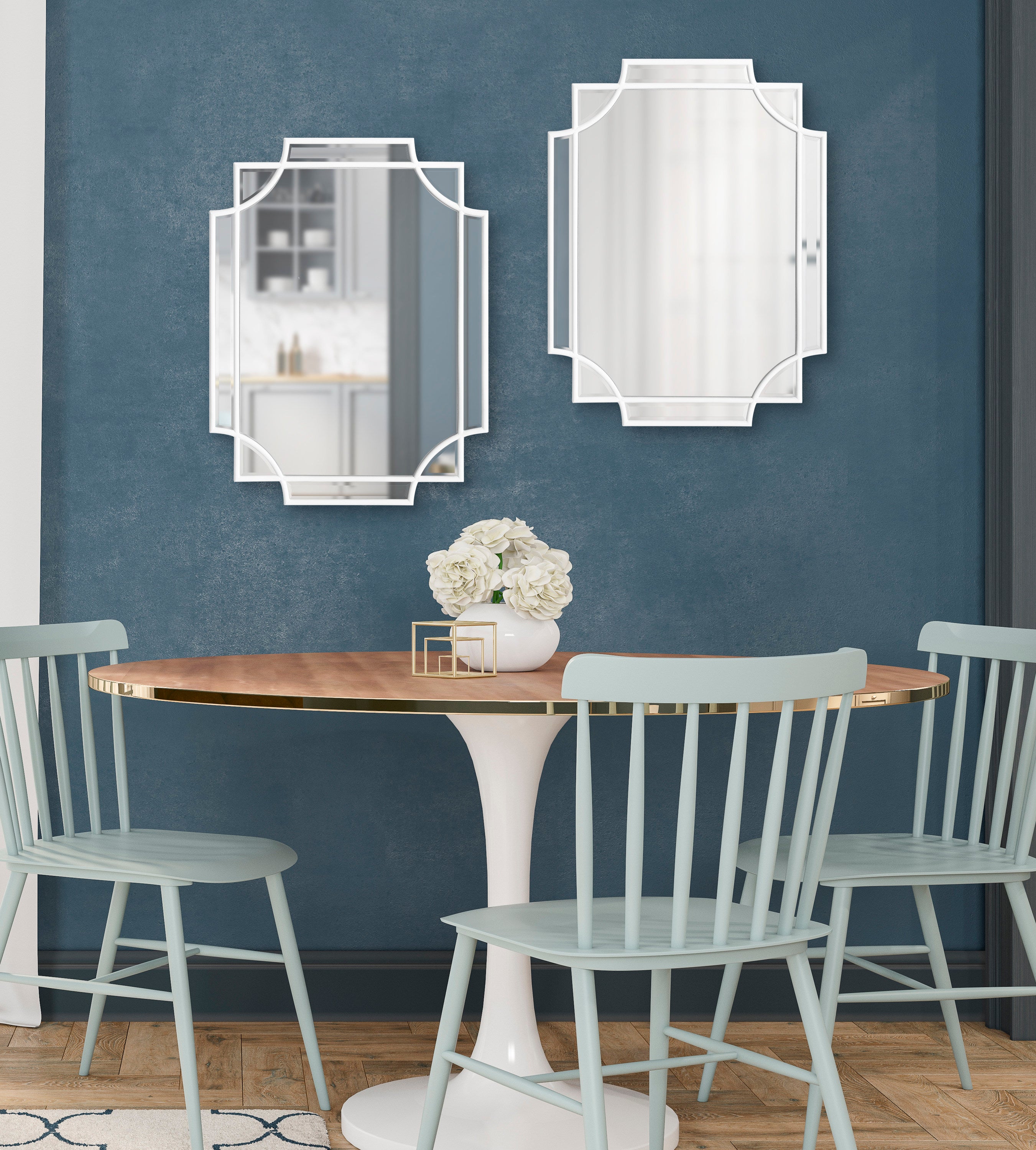 Add a timeless wall mirror to your home in the Minuette wall mirror. Inspired by the glamorous decadence of the turn of the century, the Minuette wall mirror has an overlapping, interlocking geometric shape. Hang it in any room of the home with its timeless, clean white finish allowing it to stand proudly with the rest of your glam decor. Easily display this mirror in any upscale living room, bedroom, entryway, dining room, or bathroom.