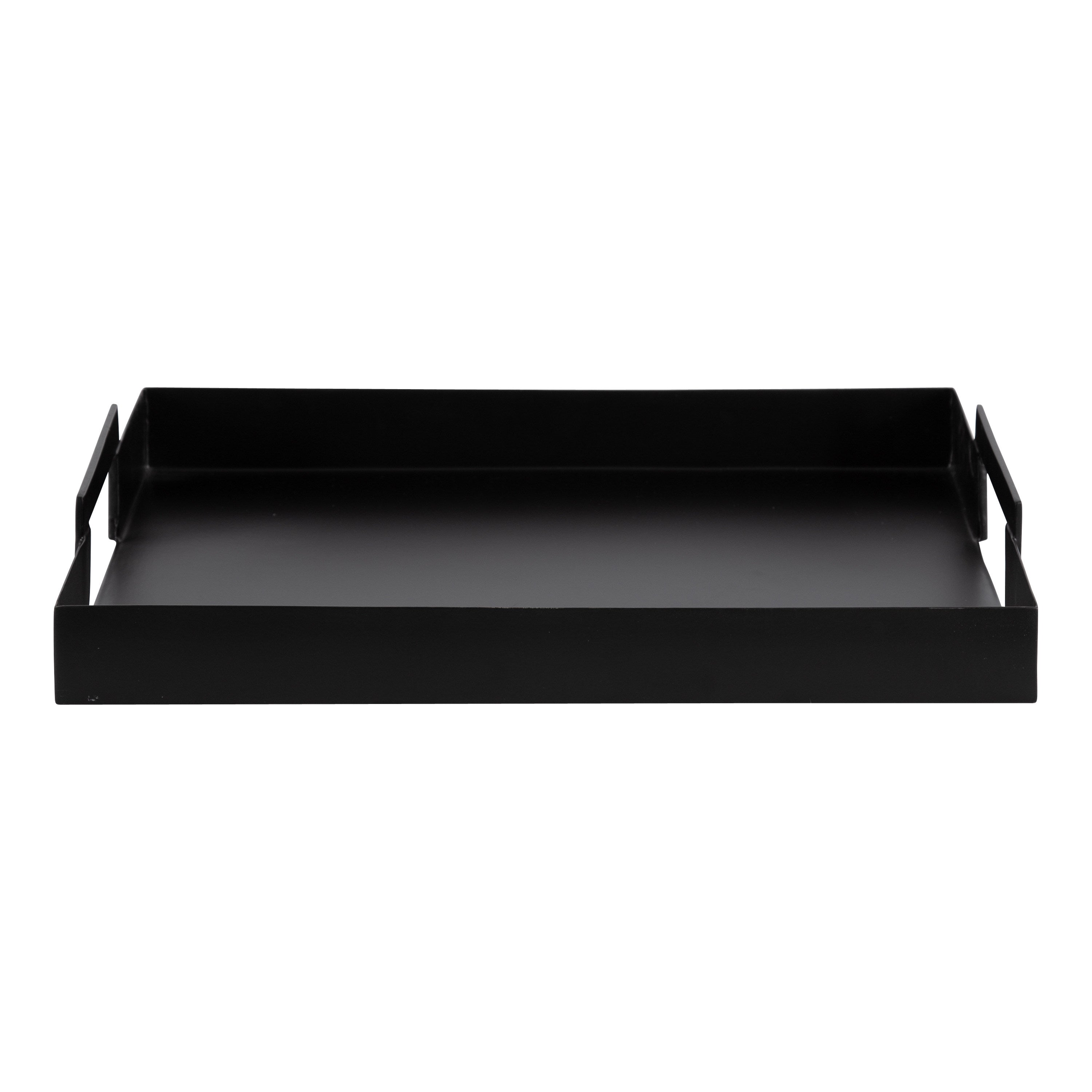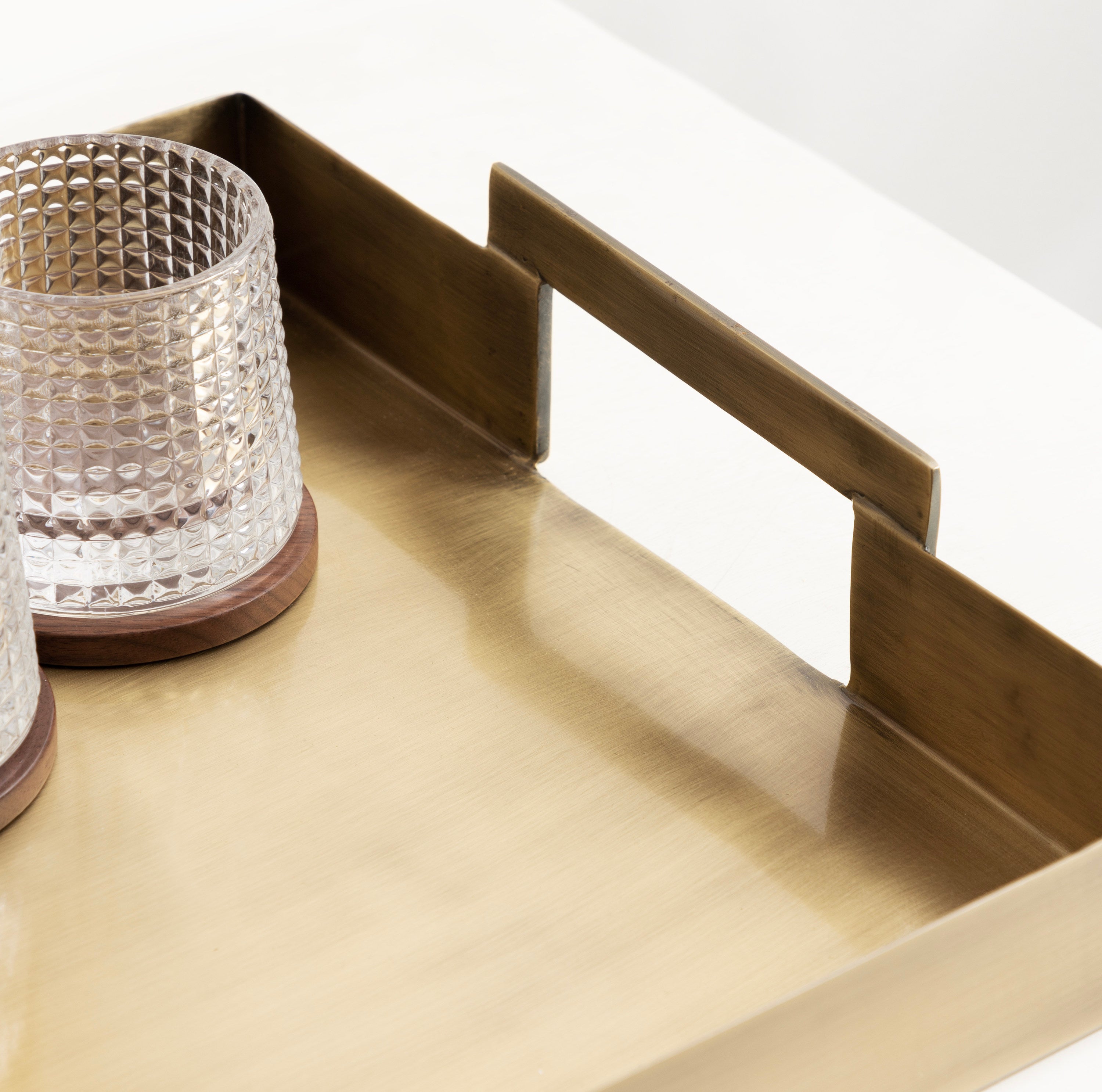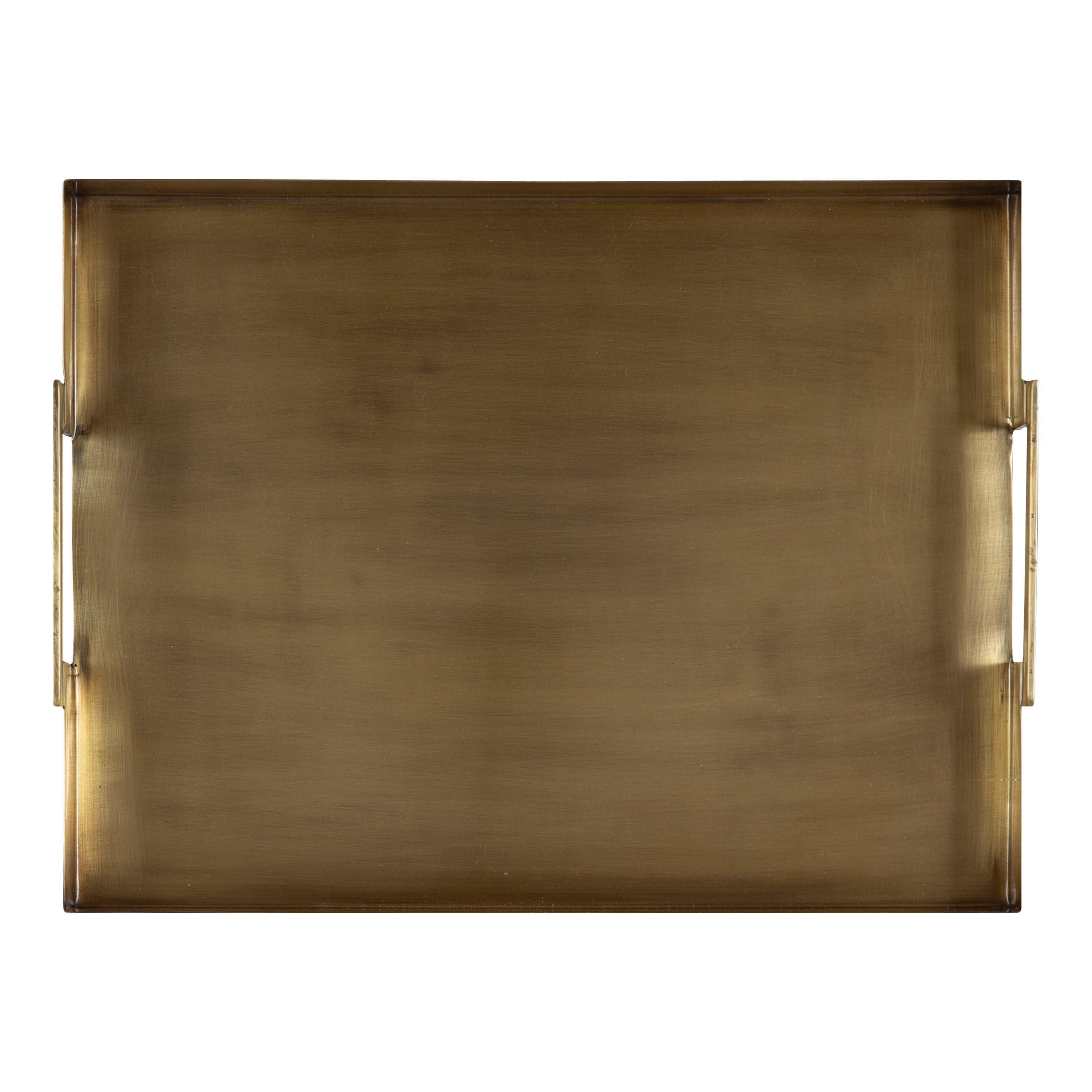 Create a visionary decor scene with this beautiful tray features a sleek design with a rectangular shape and a charming finish. The tray is crafted from rich and resilient iron material, making it a resilient display piece that is meant to last for multiple years. This large surface area allows it to serve various purposes across multiple rooms: use it as a sophisticated serving tray for cocktails and small appetizers, a charming centerpiece, an ottoman tray, or a storage catch-all for makeup and jewelry on your vanity. The metal handles allow easy mobility from multiple rooms of the house too! Even better, the tray is perfect for any of your wood, metal, or marble surfaces with protective rubber pads attached to the bottom.