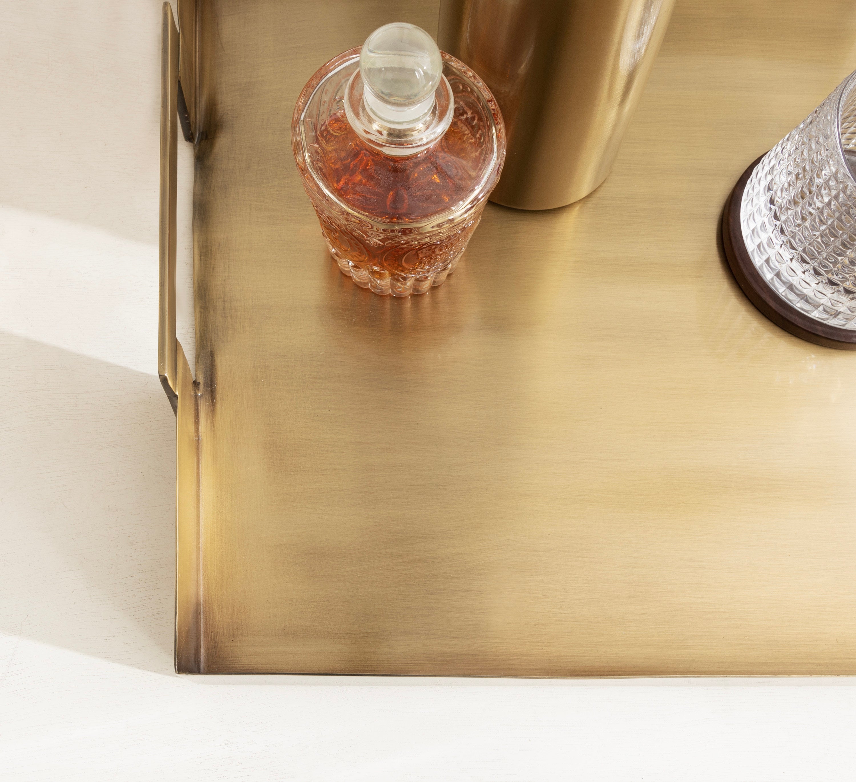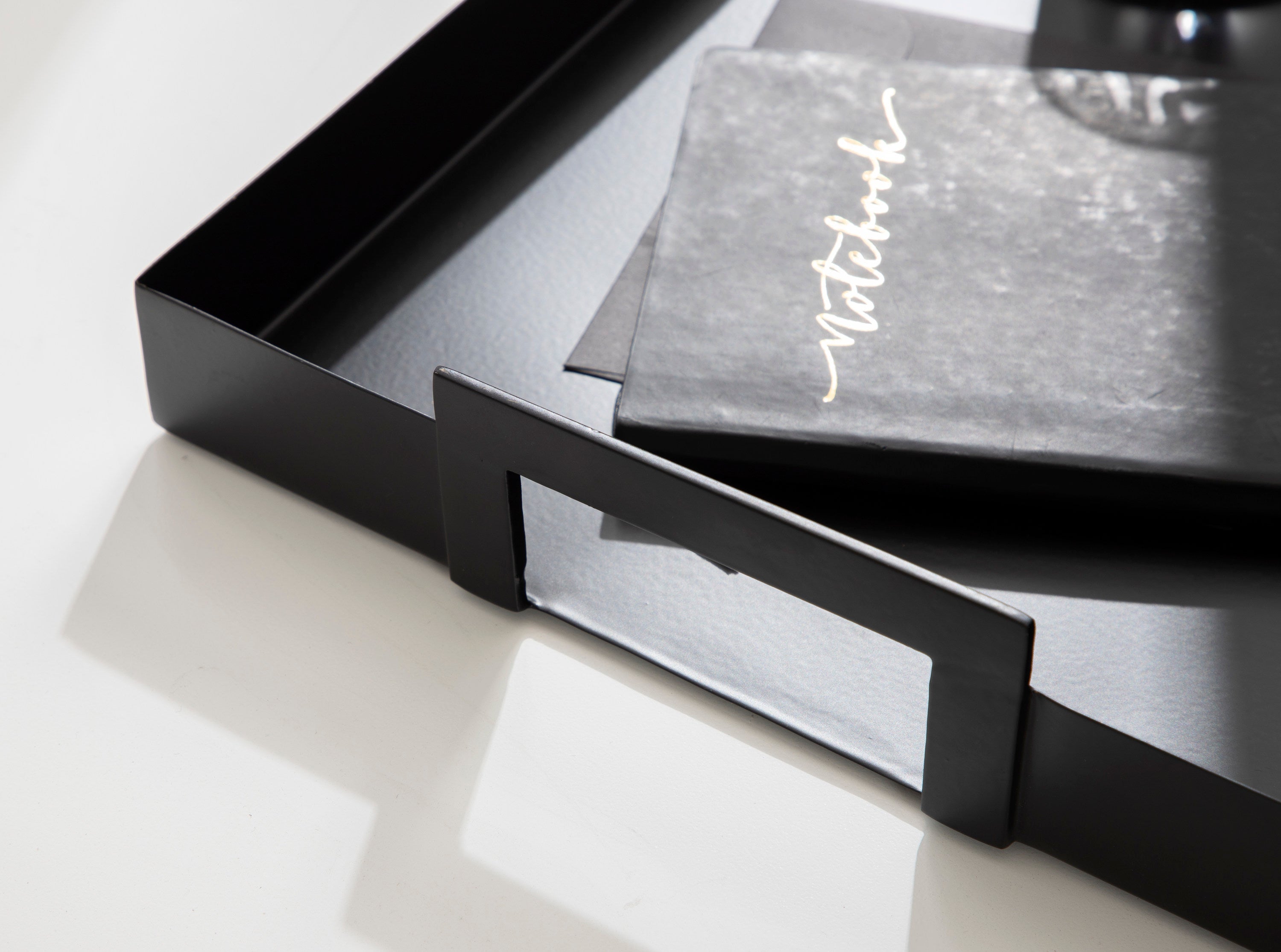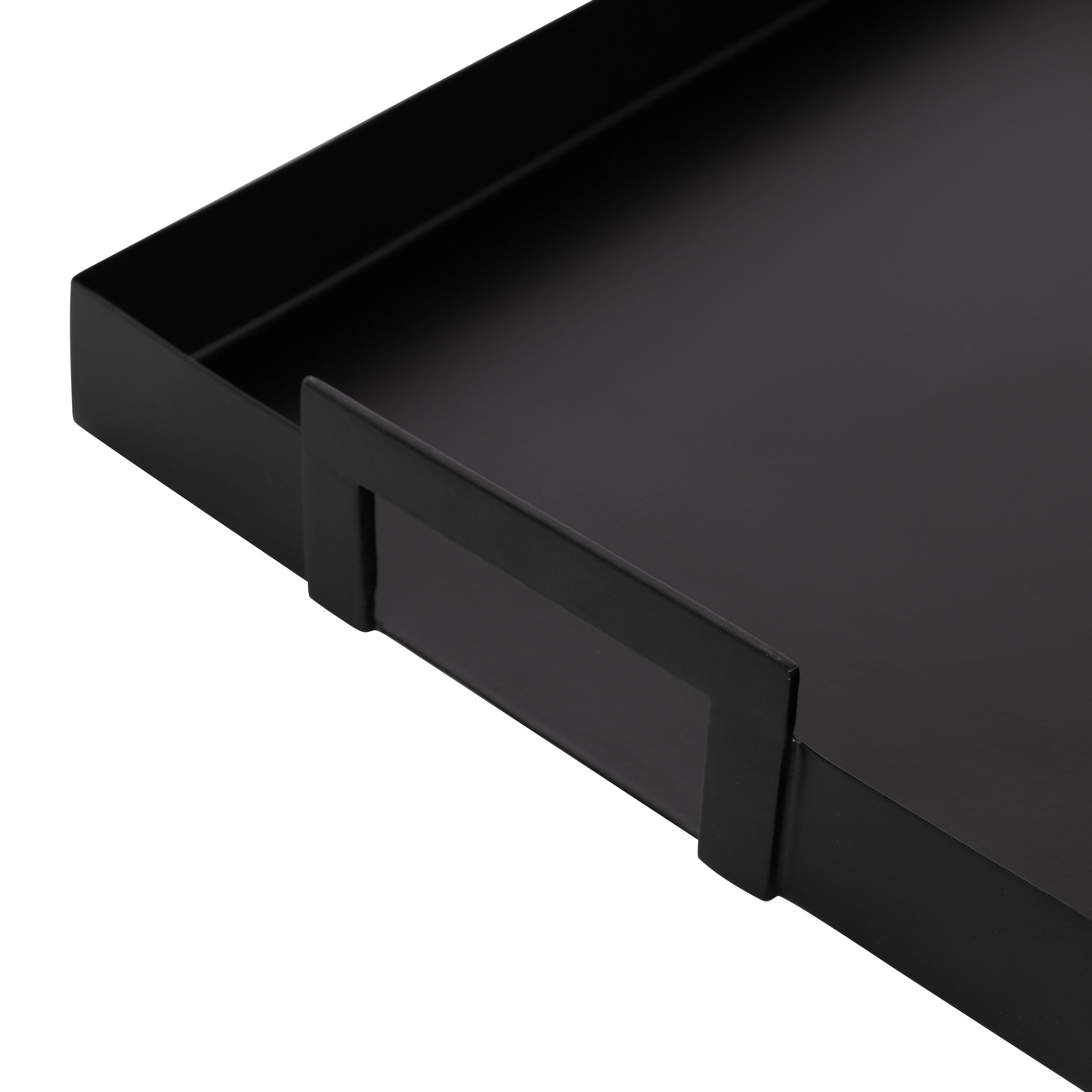 Create a visionary decor scene with this beautiful tray features a sleek design with a rectangular shape and a charming finish. The tray is crafted from rich and resilient iron material, making it a resilient display piece that is meant to last for multiple years. This large surface area allows it to serve various purposes across multiple rooms: use it as a sophisticated serving tray for cocktails and small appetizers, a charming centerpiece, an ottoman tray, or a storage catch-all for makeup and jewelry on your vanity. The metal handles allow easy mobility from multiple rooms of the house too! Even better, the tray is perfect for any of your wood, metal, or marble surfaces with protective rubber pads attached to the bottom.