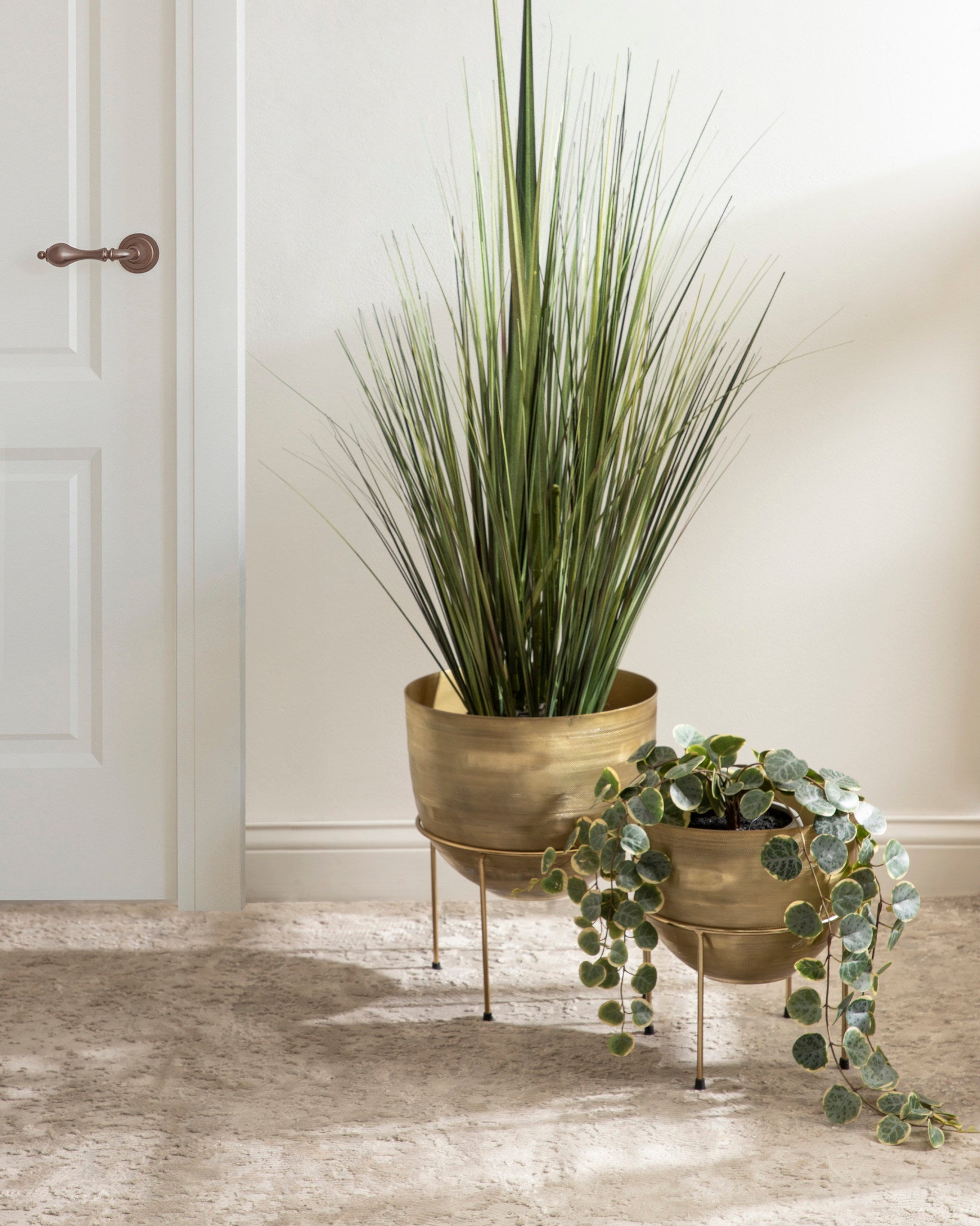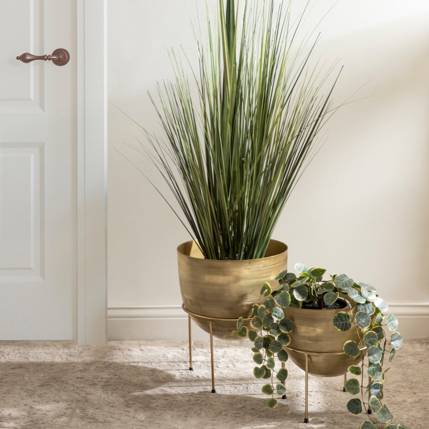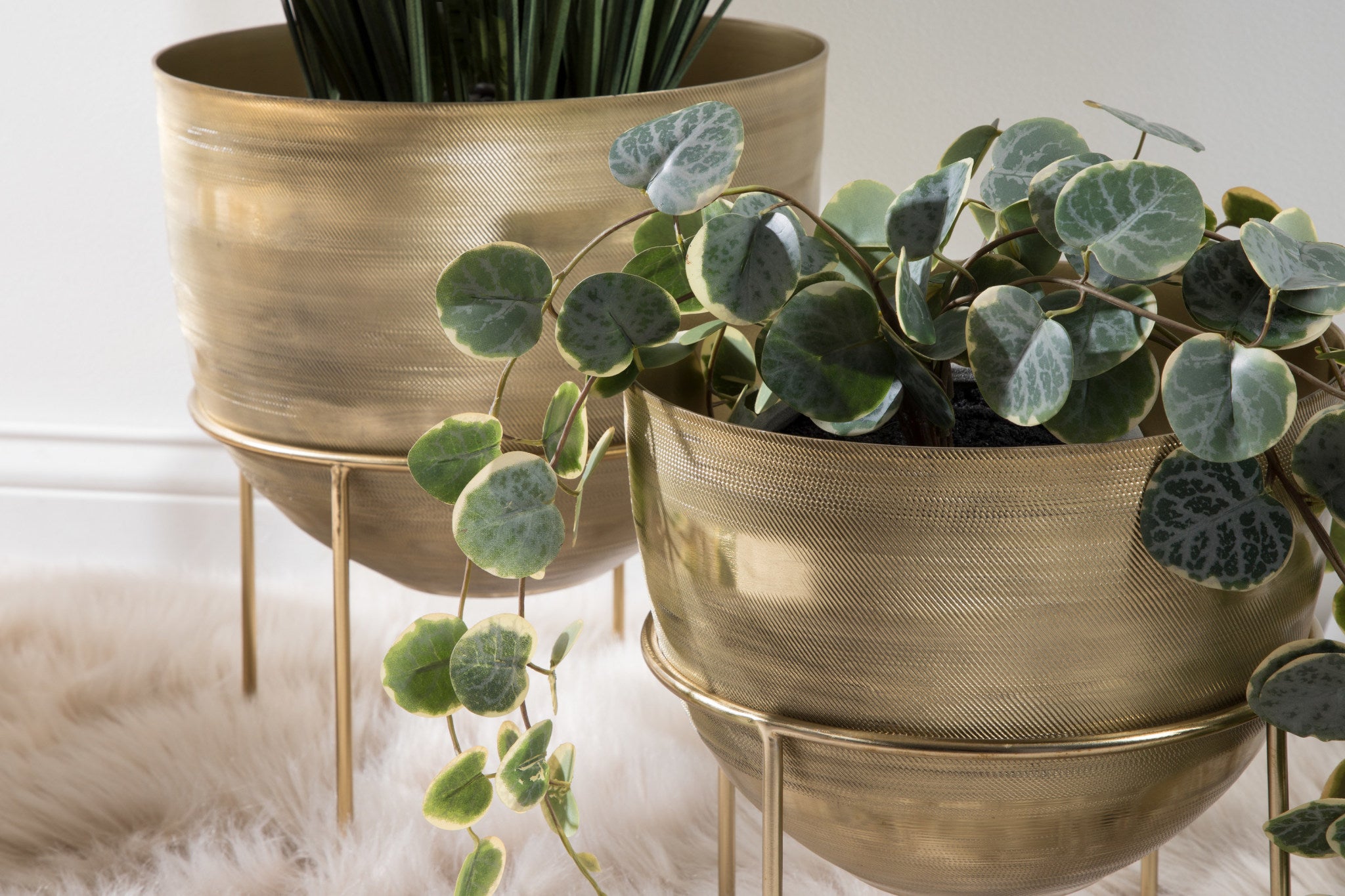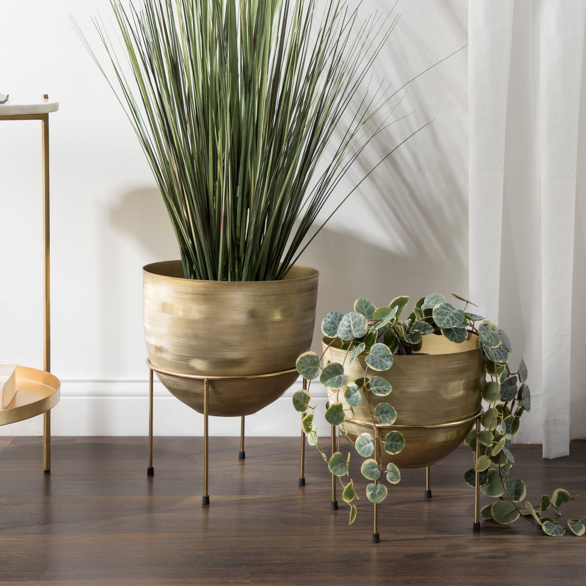 Give your home an elegant, modern quality with this unique and beautiful set of planters from Kate and Laurel. The Navara planter set was handcrafted in India, with a sophisticated engraving and a stunning finish distinct from piece to piece. The pots were made of textured aluminum, while each base was made of sturdy and resilient iron. These elegant planters are perfect for adding some faux greenery to your floor, console, side table, or dresser. They're also fantastic for authentic plants, provided you have a plastic or burlap liner with plenty of coverage.