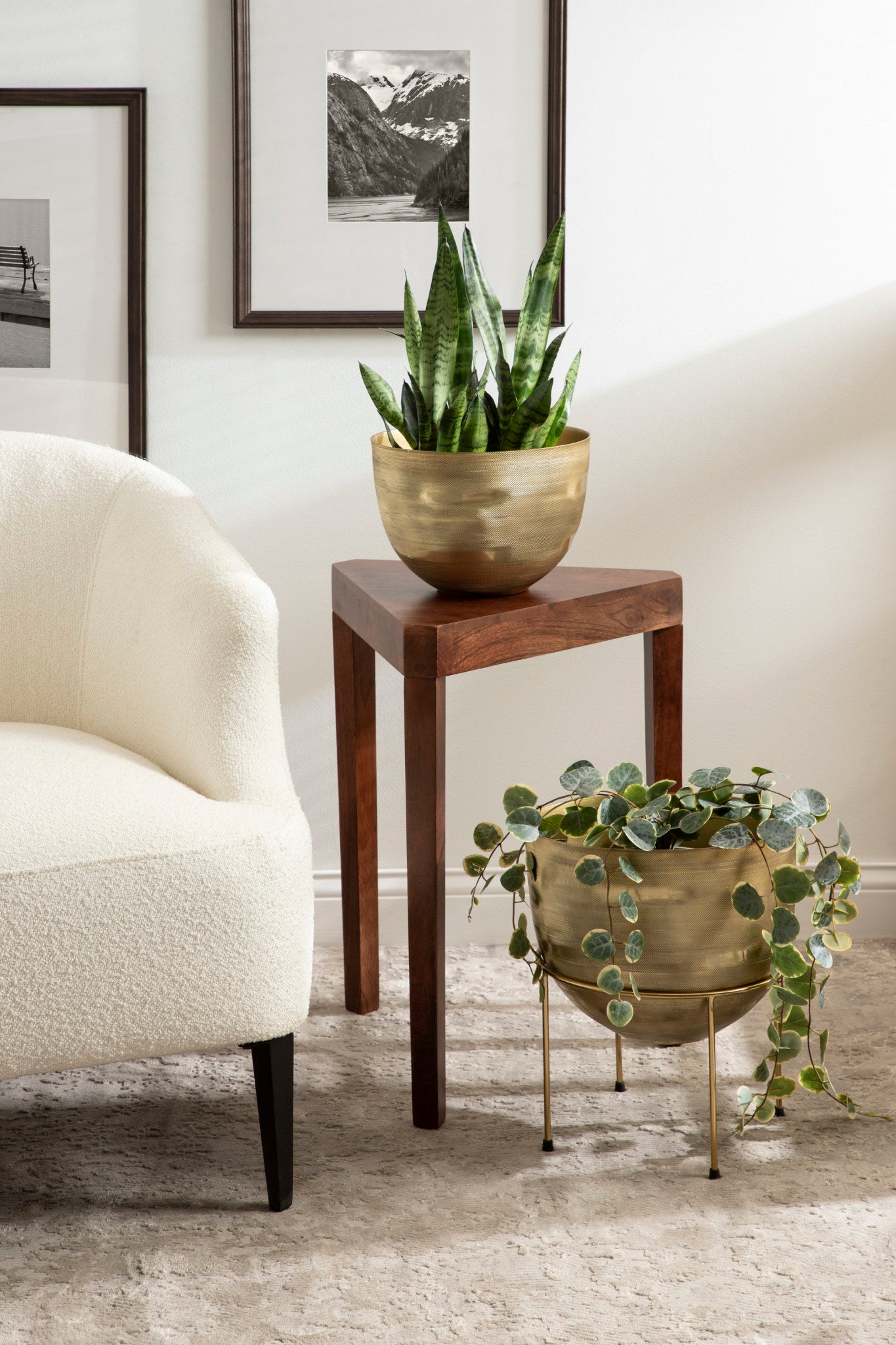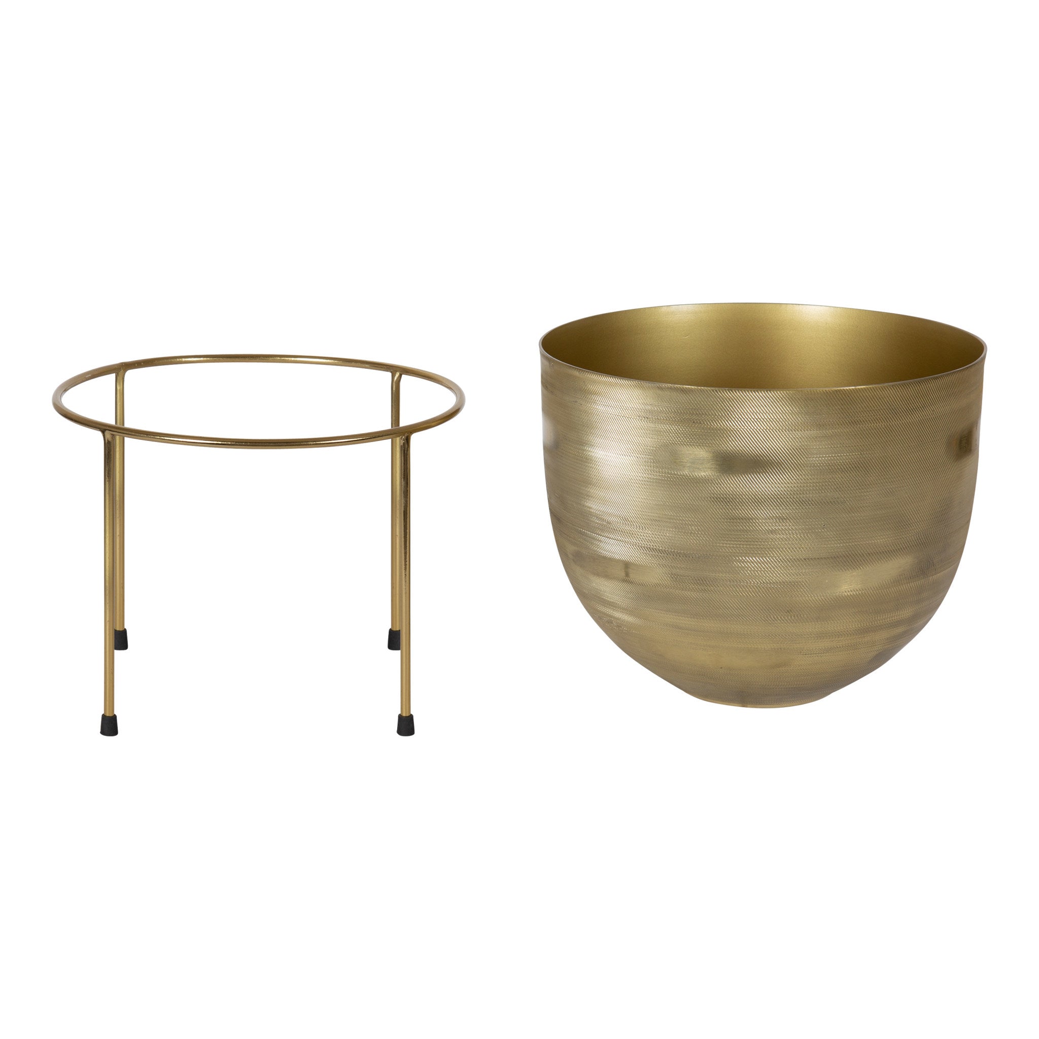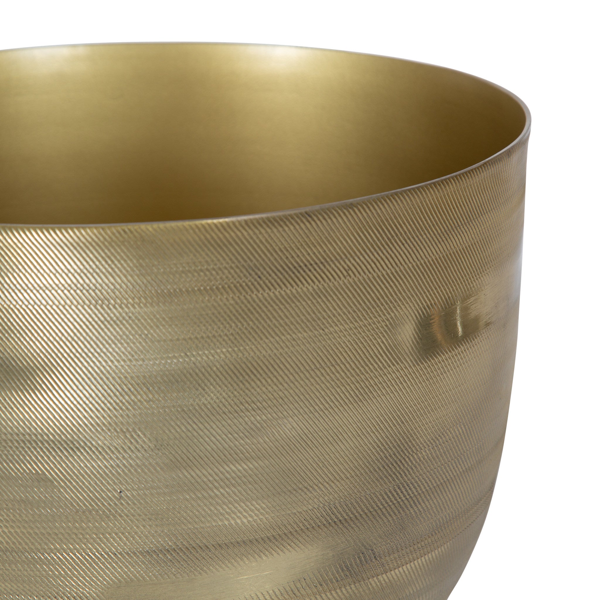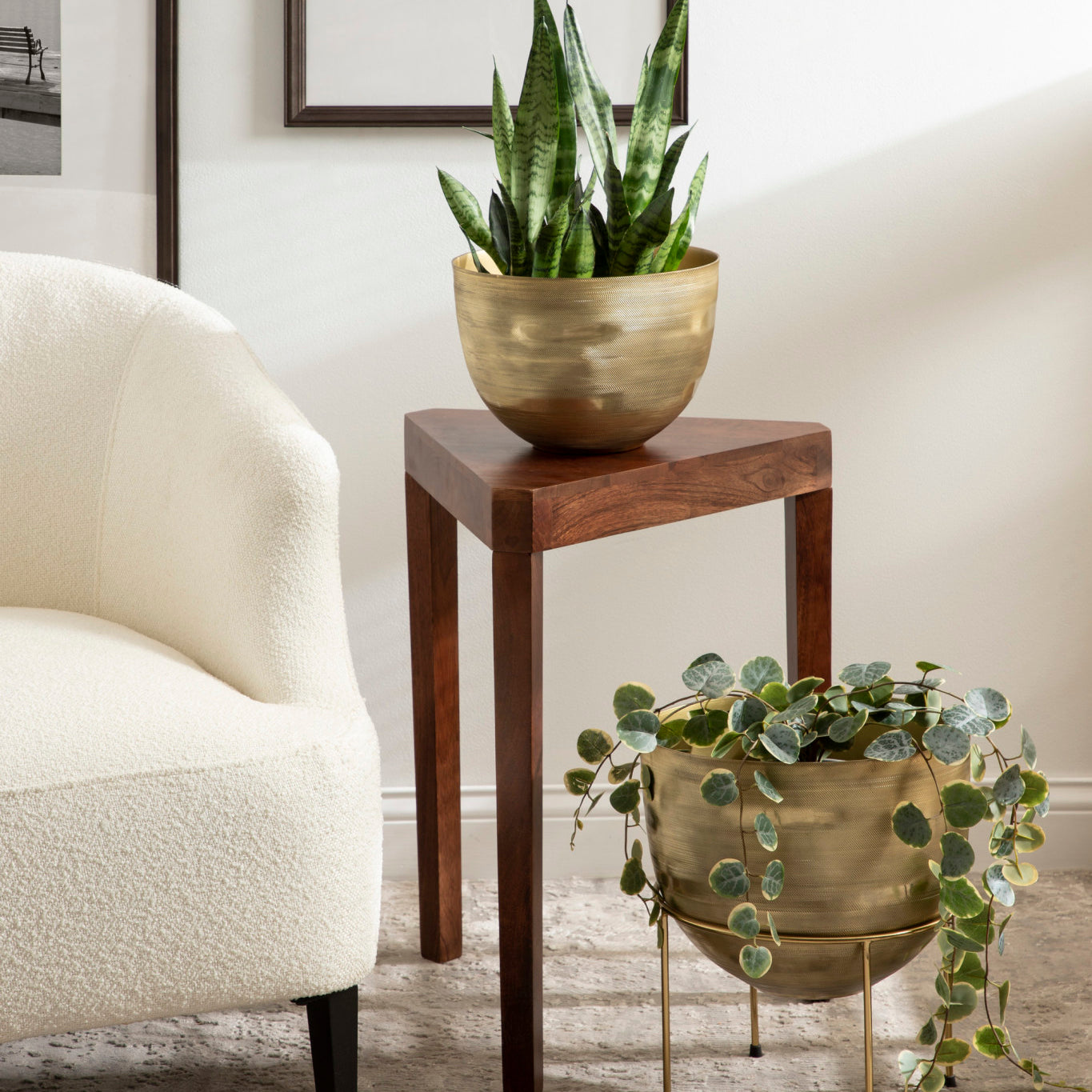 Give your home an elegant, modern quality with this unique and beautiful set of planters from Kate and Laurel. The Navara planter set was handcrafted in India, with a sophisticated engraving and a stunning finish distinct from piece to piece. The pots were made of textured aluminum, while each base was made of sturdy and resilient iron. These elegant planters are perfect for adding some faux greenery to your floor, console, side table, or dresser. They're also fantastic for authentic plants, provided you have a plastic or burlap liner with plenty of coverage.