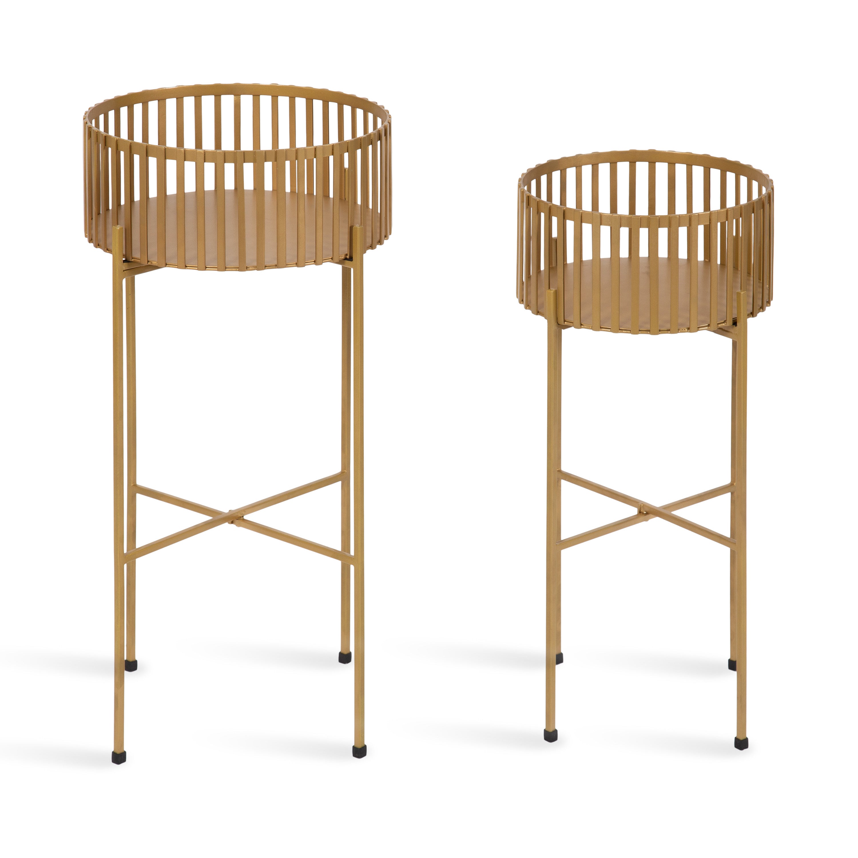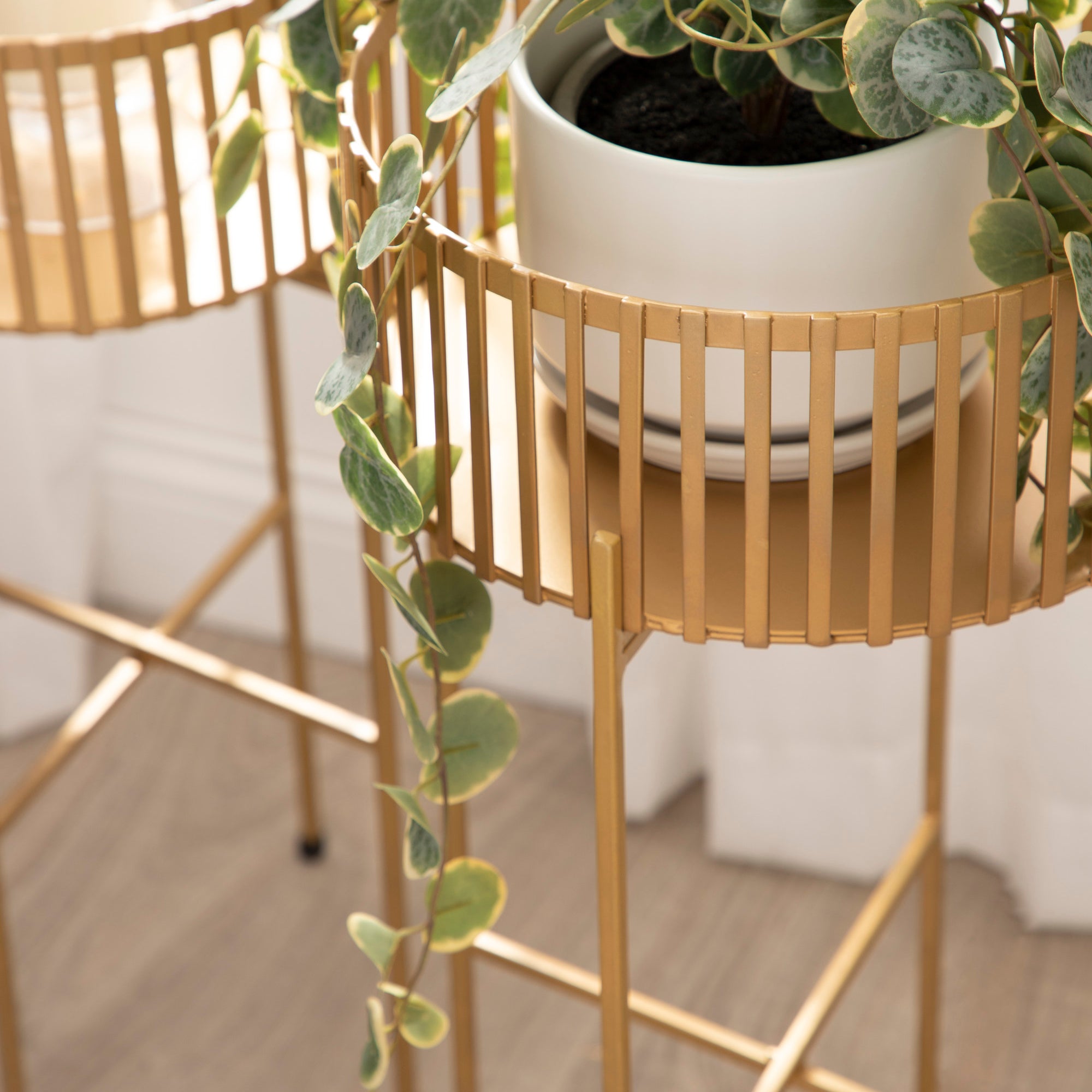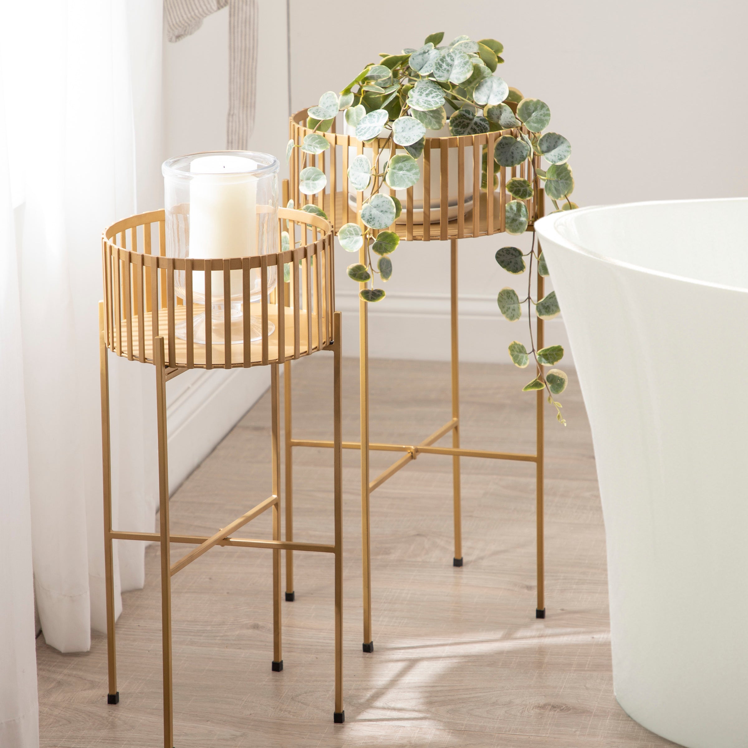 This stunning two-piece plant stand set allows you to showcase some of your favorite house plant additions. From a small succulent "garden" to a low bowl with some sprawling vines, the Paynter plant stand set was designed to fit shorter plant types. The sleek metal rods of the Paynter planters create interesting visual texture and openness, a look we don't often see in a floor planter set.