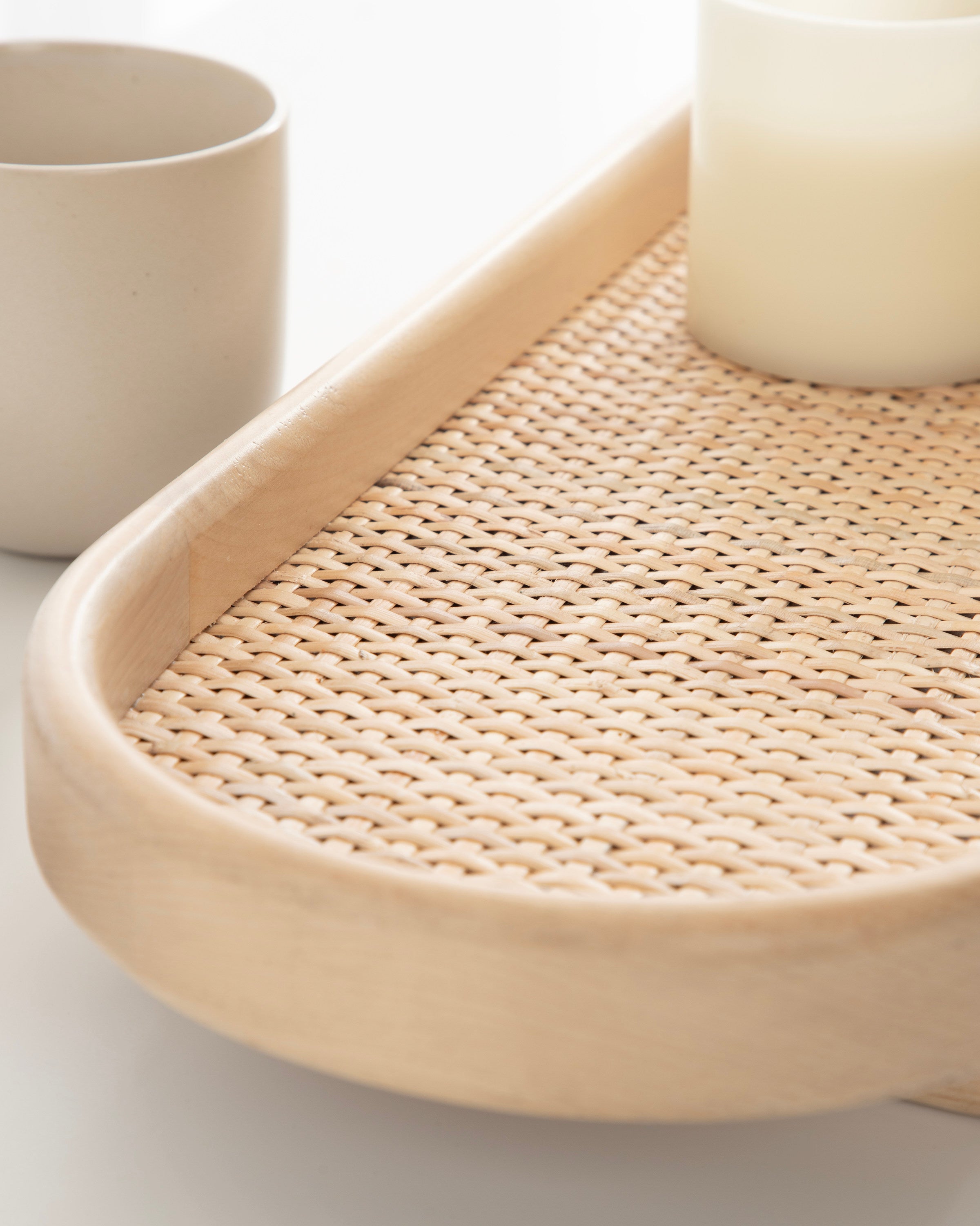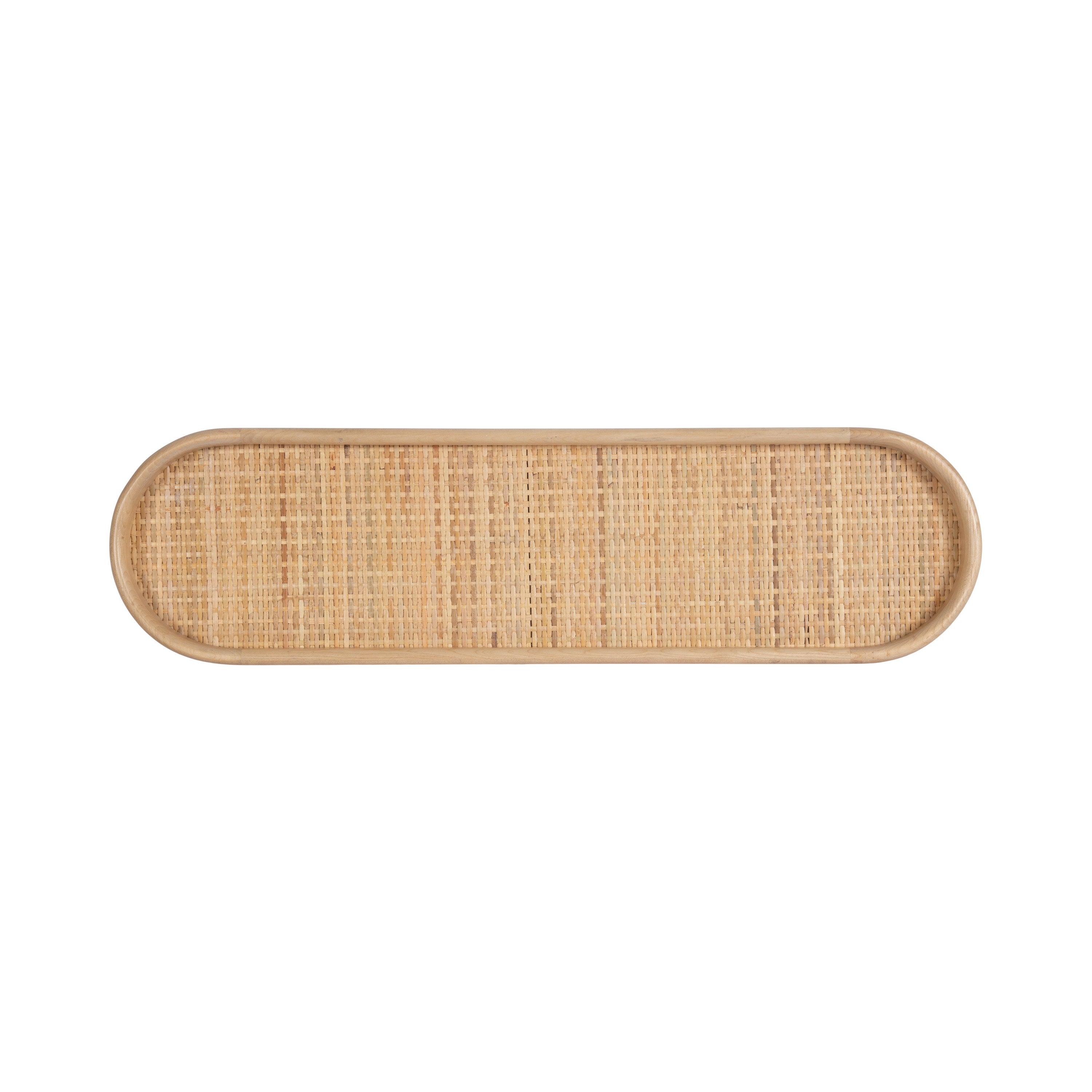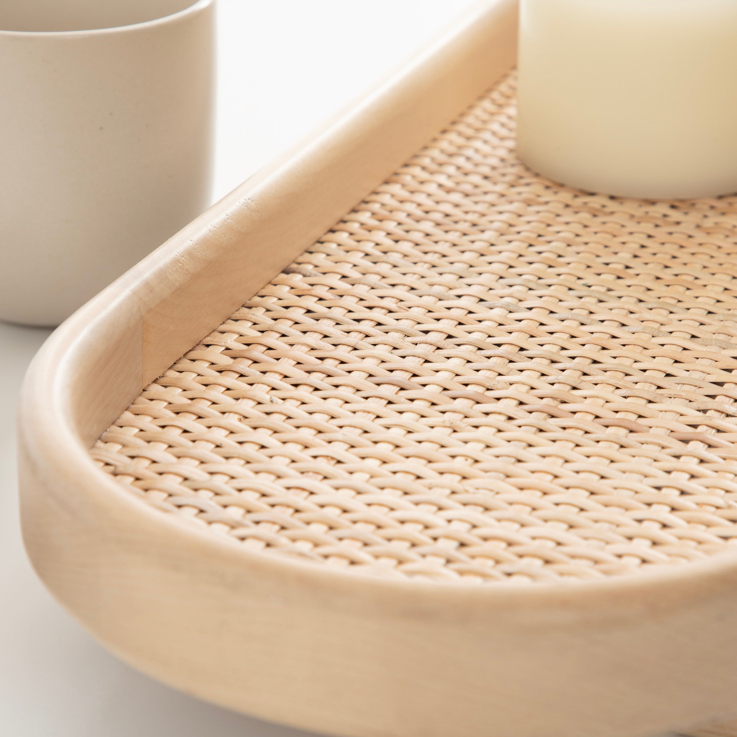 Bring modern transitional style into your home with this charming narrow accent tray with a raised edge. Place this charming tray on your entrance console table as a trinket tray to hold your keys and change as you come and go. This rectangular tray can also be used as a decorative accent on an ottoman to hold your beverages or on your vanity for makeup organization. Constructed of solid birch wood and woven rattan, this tray is dependable to carry your cocktails from room to room! An update to the classic accent tray, the base has a raised edge to keep your items more secure when transporting them.