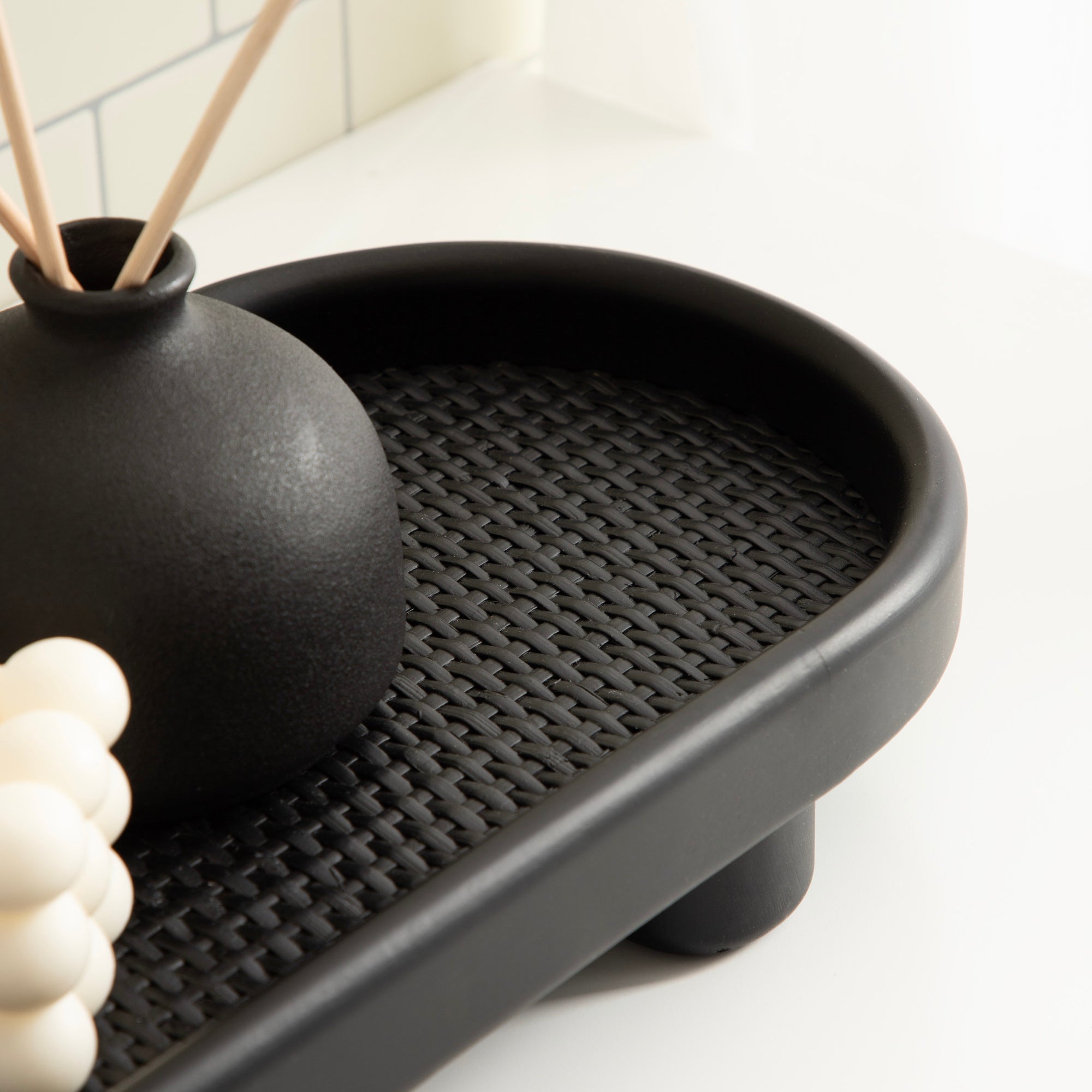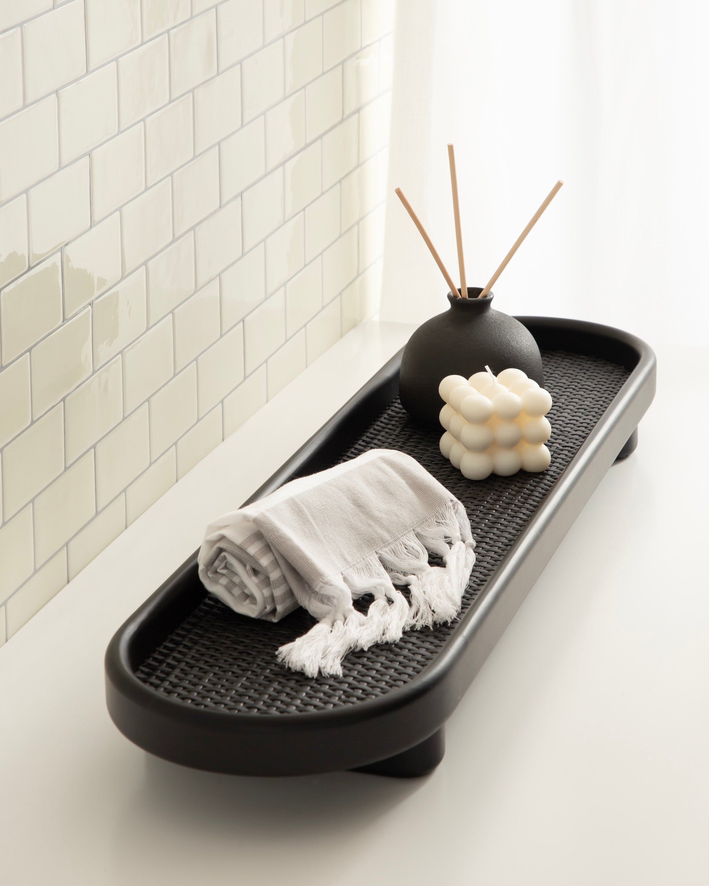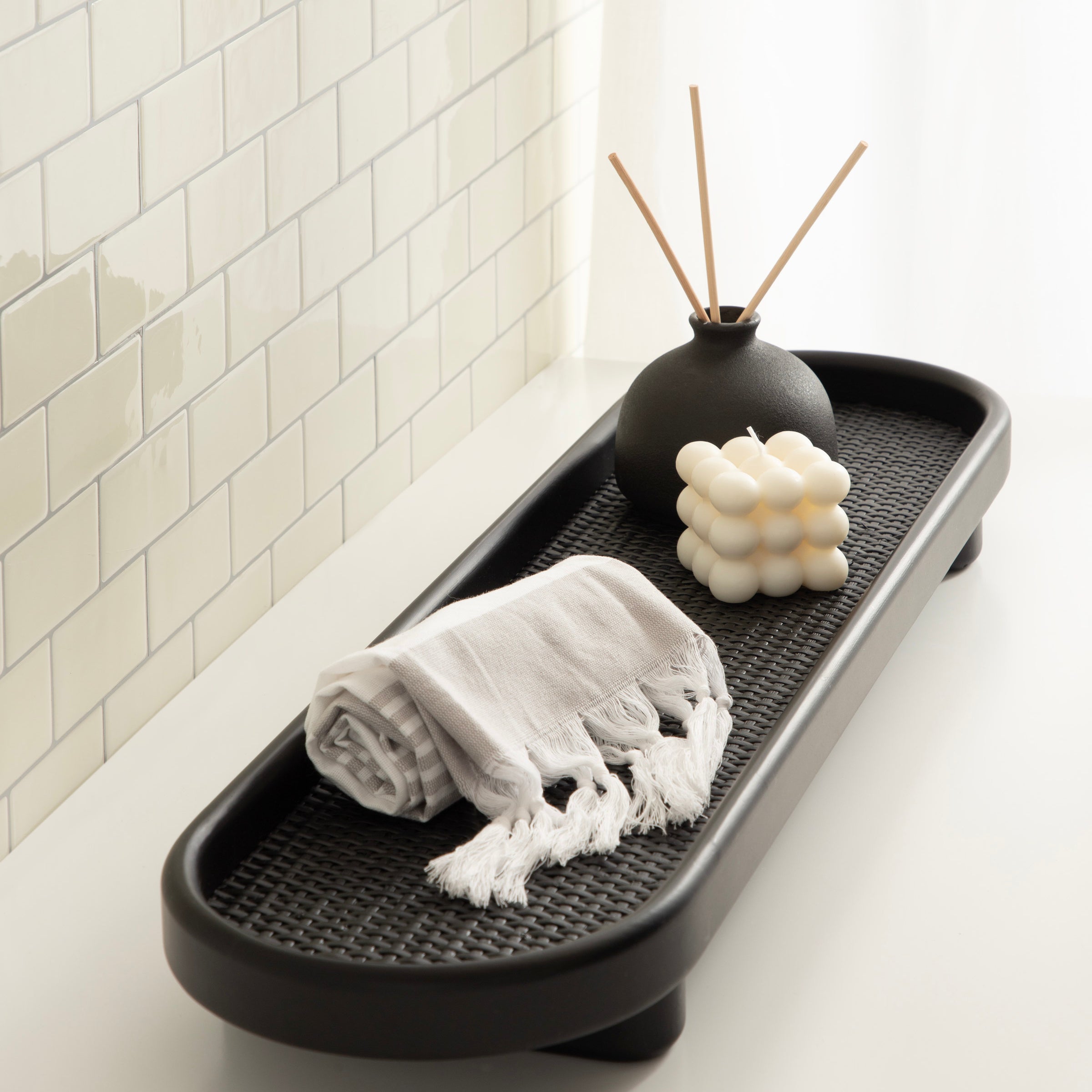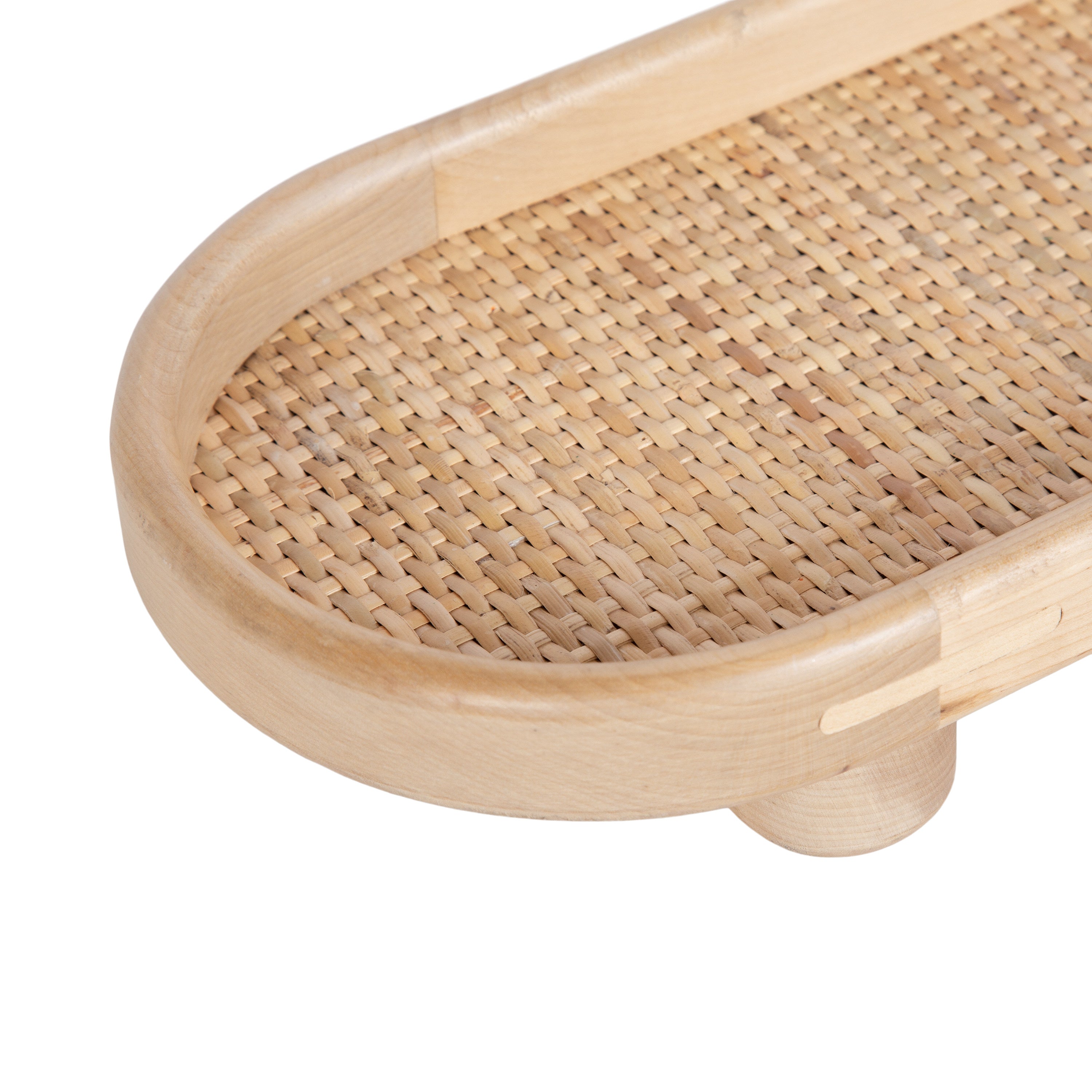 Bring modern transitional style into your home with this charming narrow accent tray with a raised edge. Place this charming tray on your entrance console table as a trinket tray to hold your keys and change as you come and go. This rectangular tray can also be used as a decorative accent on an ottoman to hold your beverages or on your vanity for makeup organization. Constructed of solid birch wood and woven rattan, this tray is dependable to carry your cocktails from room to room! An update to the classic accent tray, the base has a raised edge to keep your items more secure when transporting them.