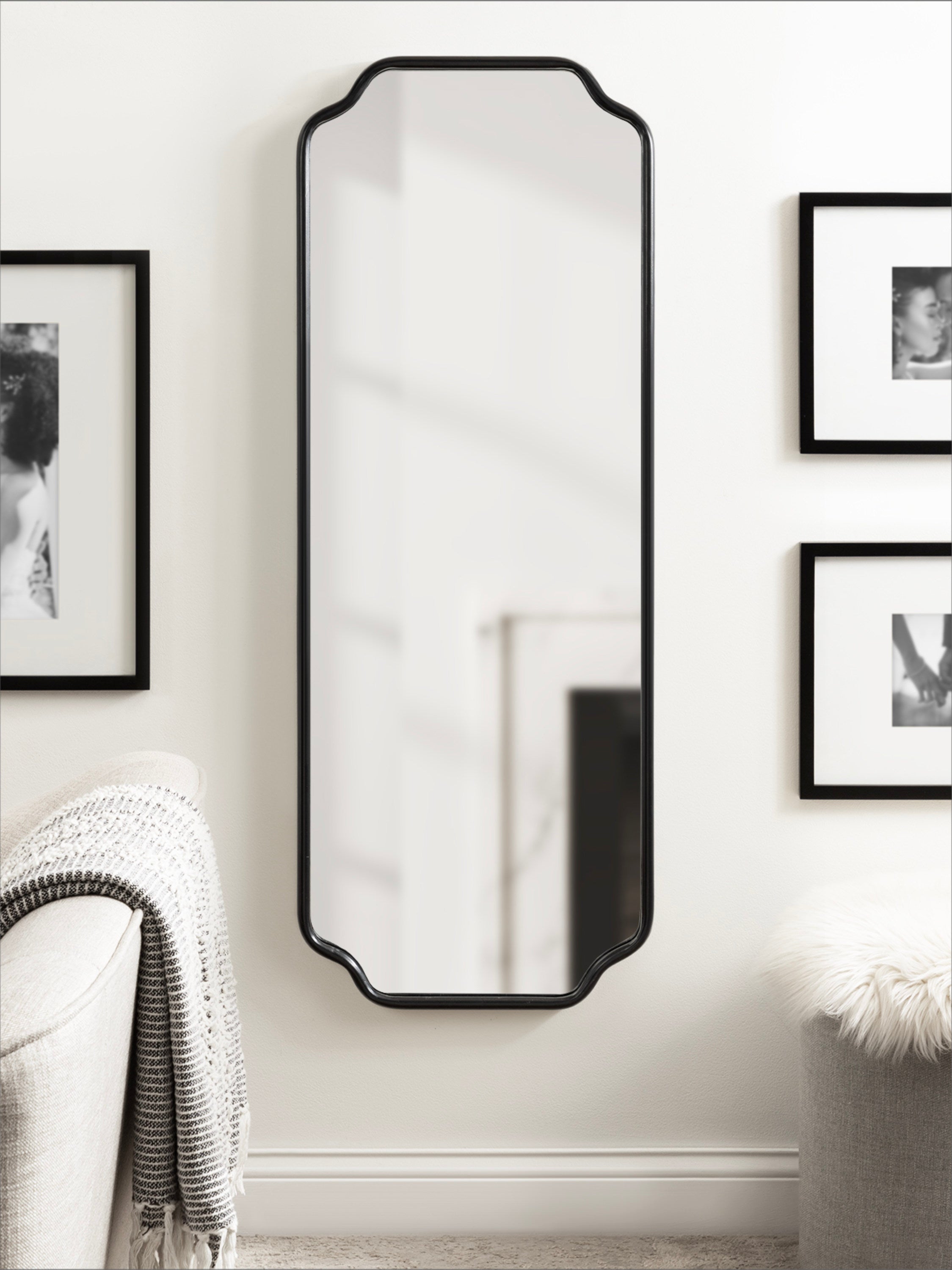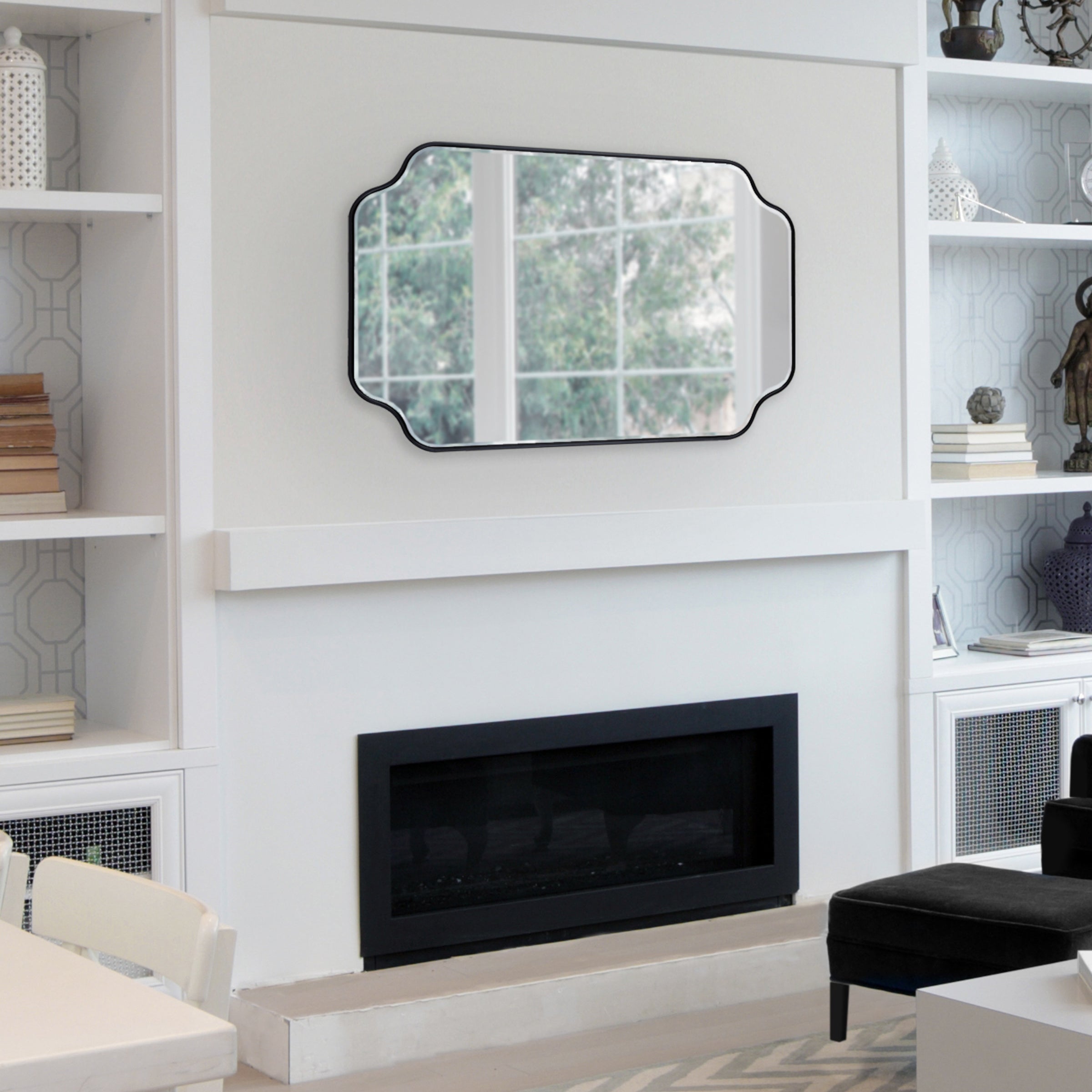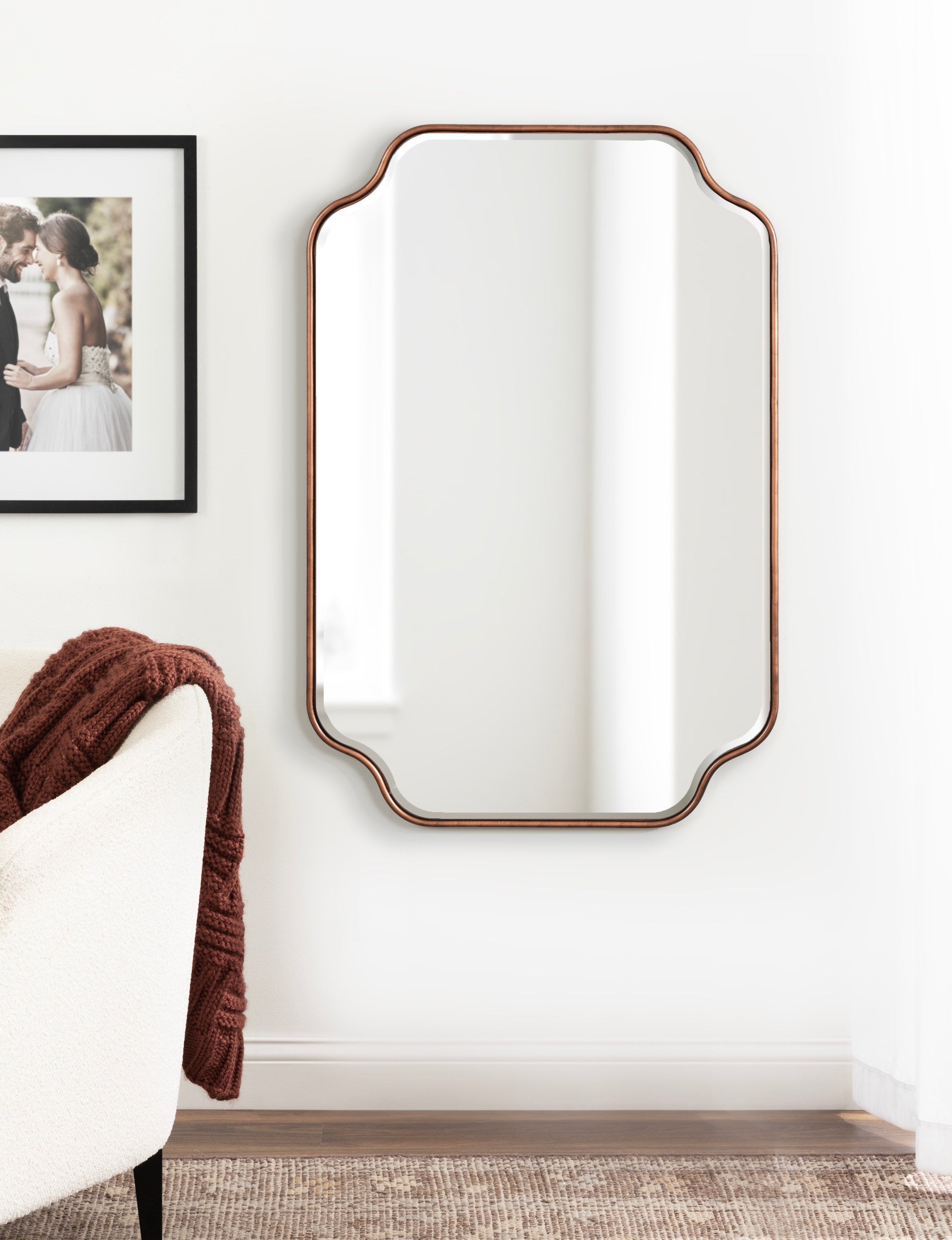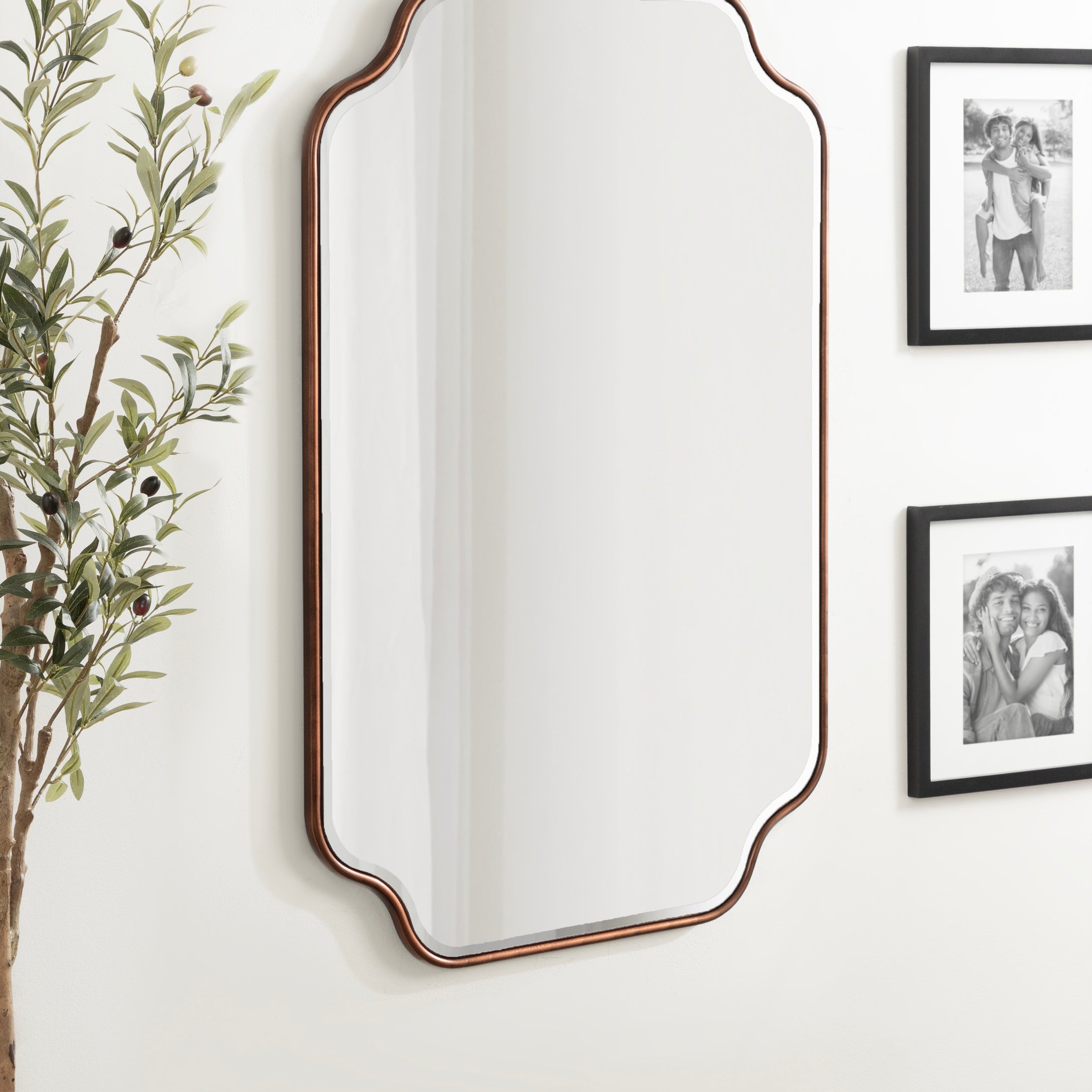 Create a glamorous and vibrant wall display in your home by hanging the sophisticated Plumley mirror. Inspired by eye-catching glamour, the Plumley mirror features a refined finish on a scalloped rectangle frame. It's a perfect substitute for wall art, enhancing the light and dimension of any space in your home. It looks fabulous as a bathroom vanity mirror or a statement piece above a console, over a mantle, or any room in your home that needs a decorative refresh.