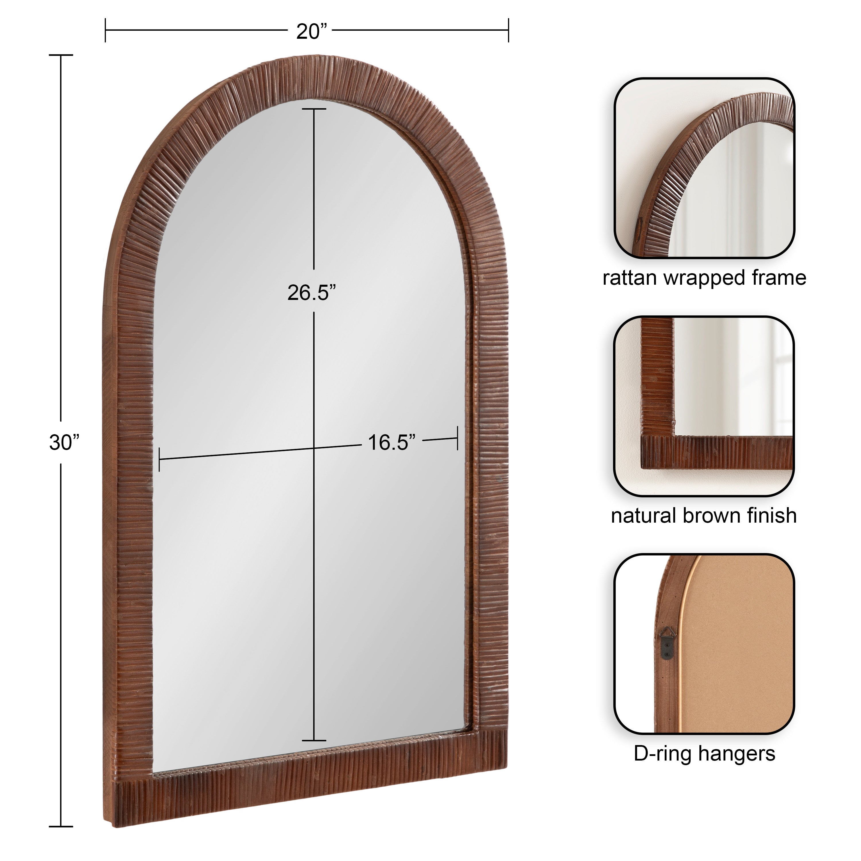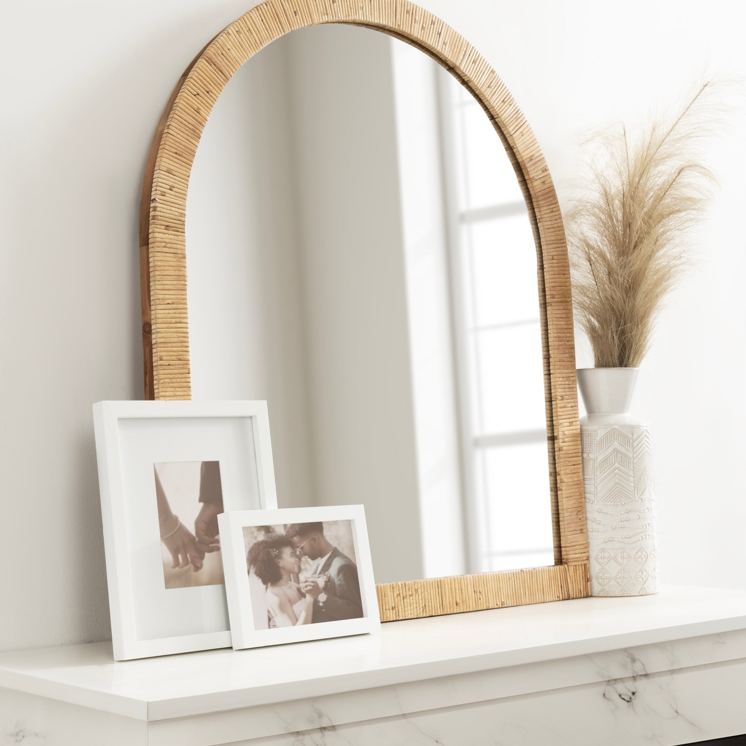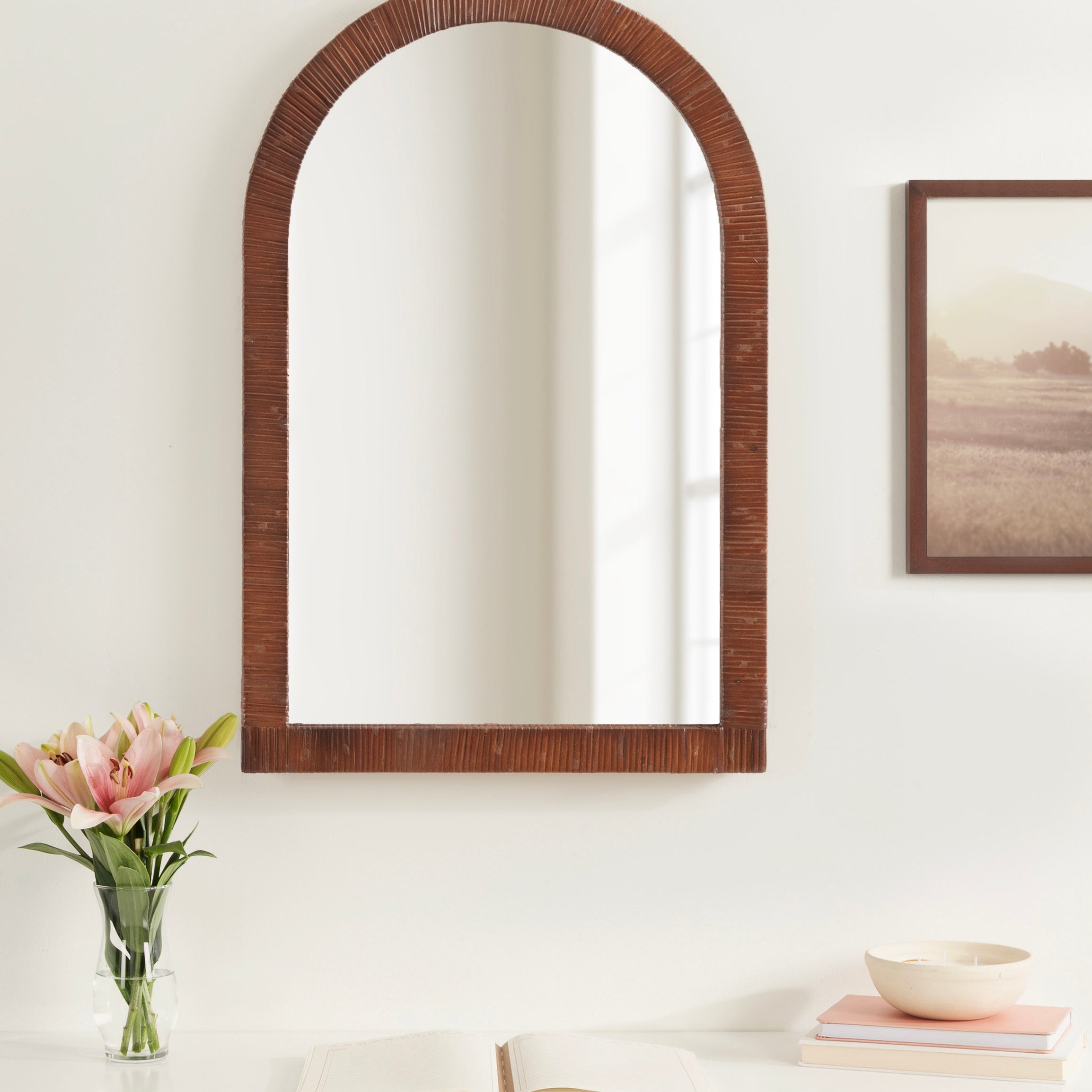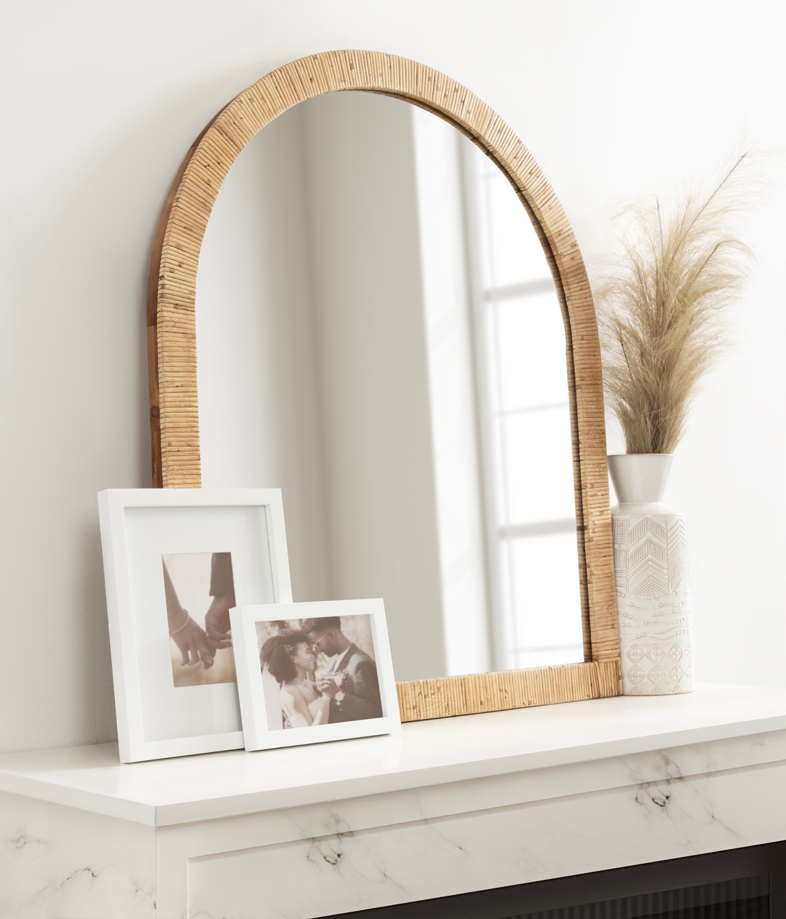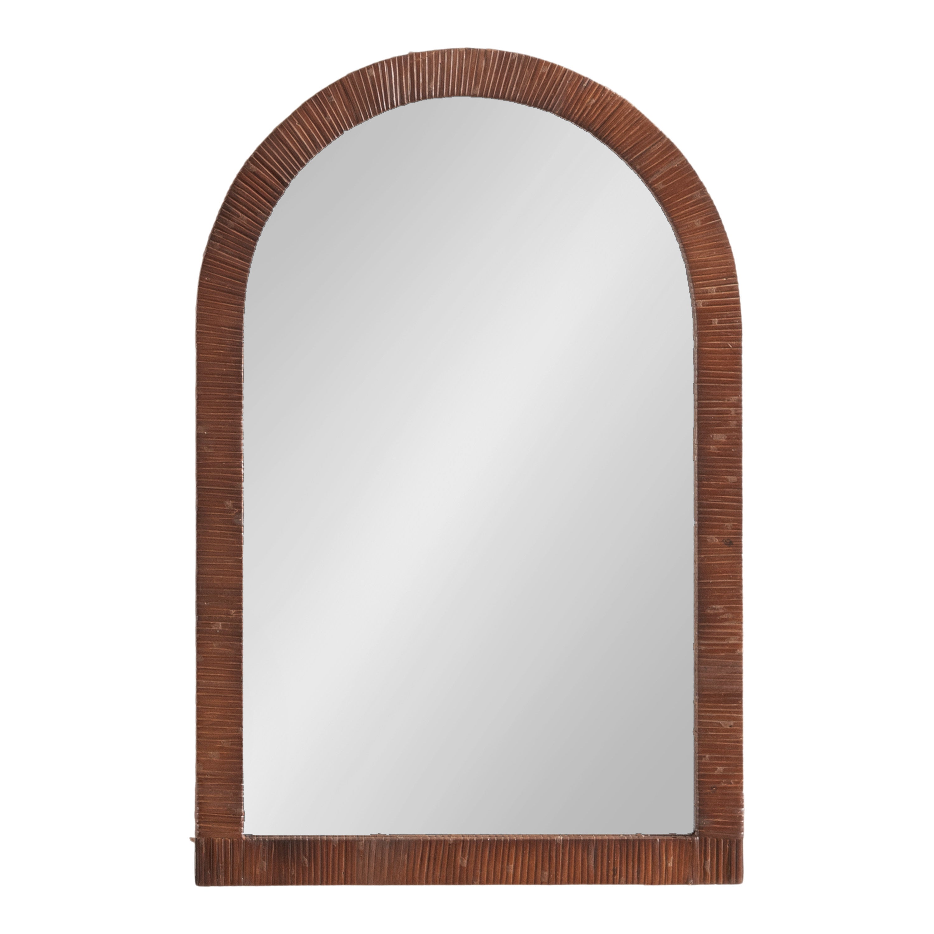Create a bohemian aesthetic in your home with this fantastic and unique arched wall mirror. This beautiful mirror is the epitome of boho design, featuring an arched, textured look on the frame that pops off the wall. The beautifully wrapped frame is made from premium, high-quality rattan with a natural wood finish to show off its rich, authentic look. The arched shape emphasizes its unique look with a dash of modernity to showcase a geometric and trendy style on any wall. Hang this stunning piece of wall decor in your bedroom, entryway, dining room, living room, bathroom, or even above a fireplace mantel with its stellar and unique design.
