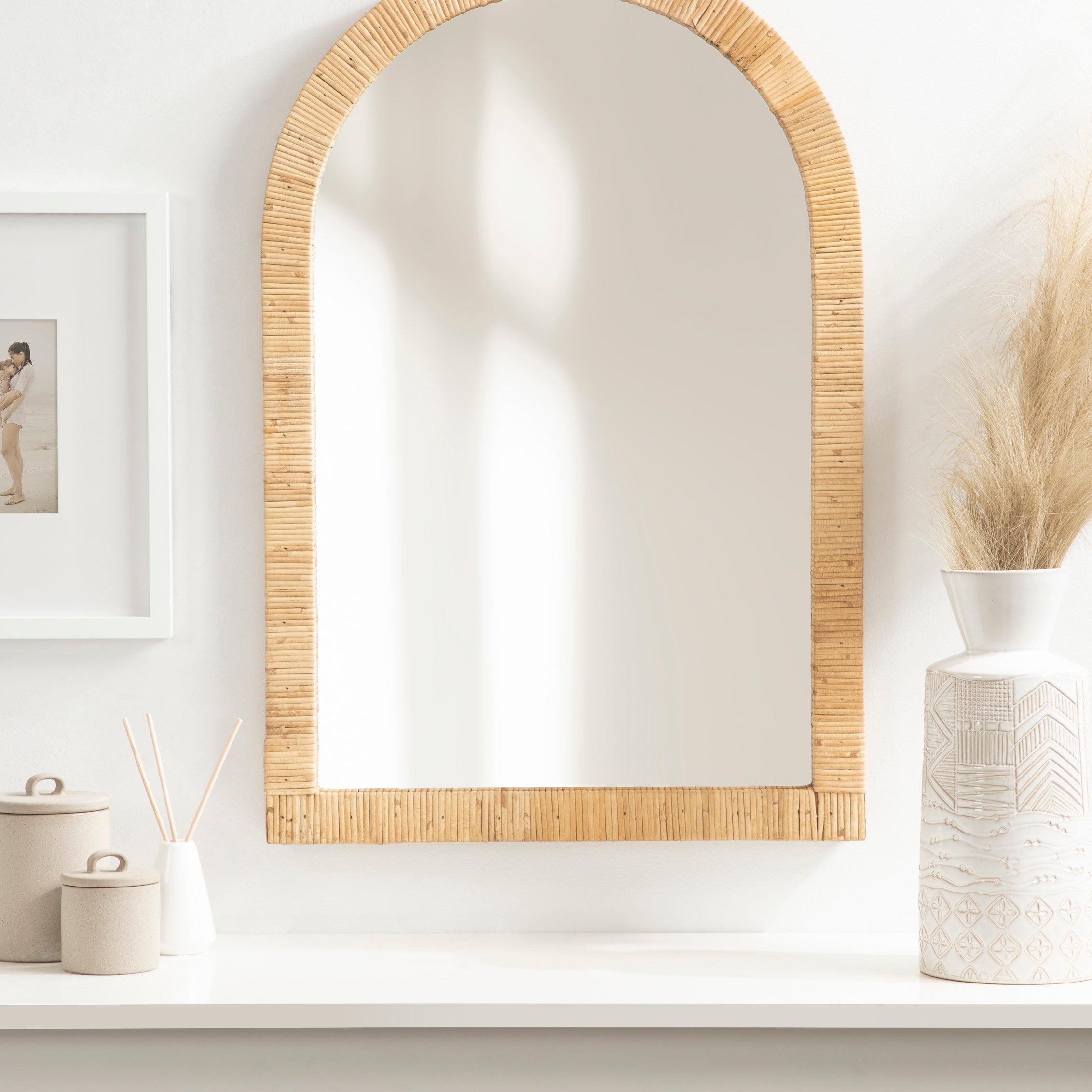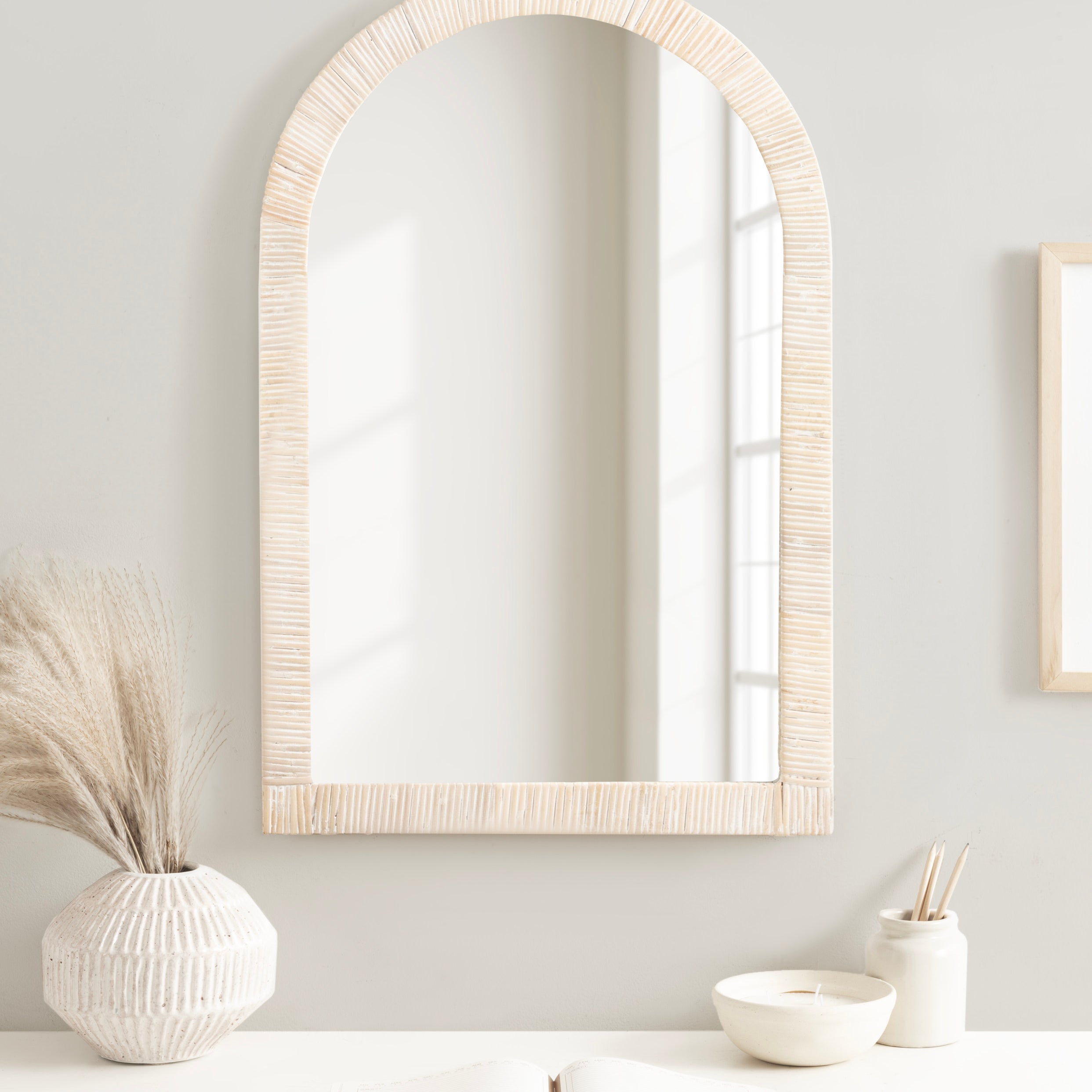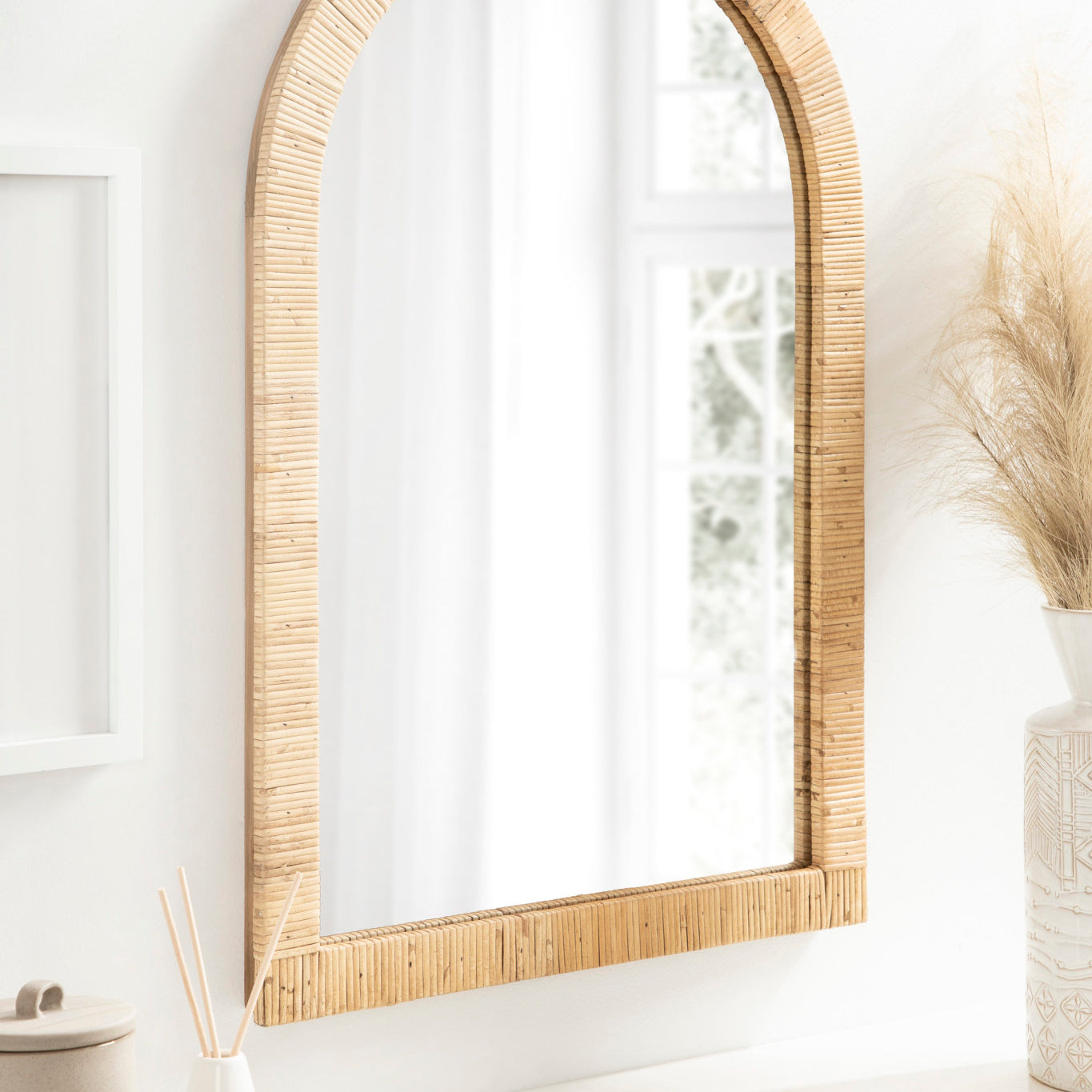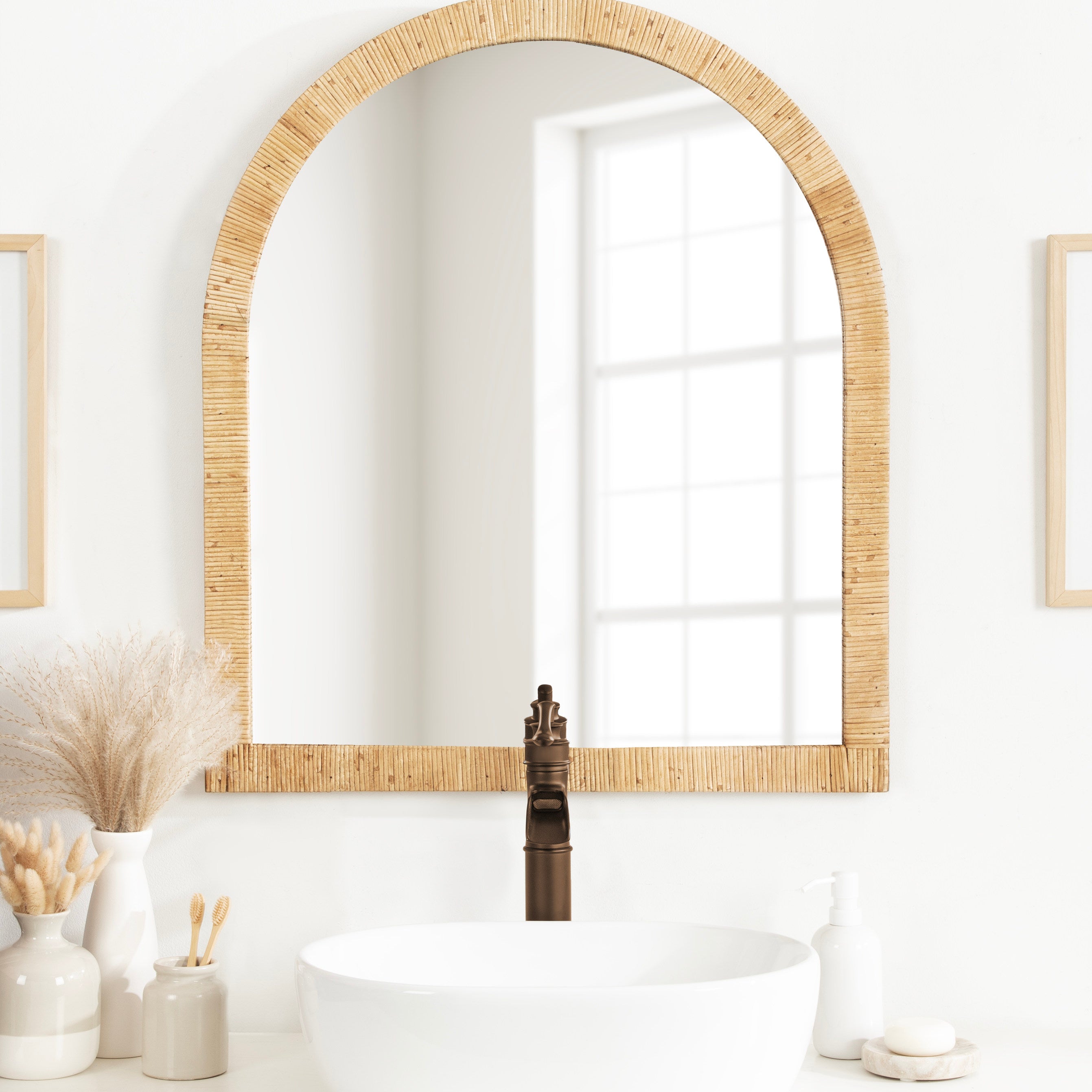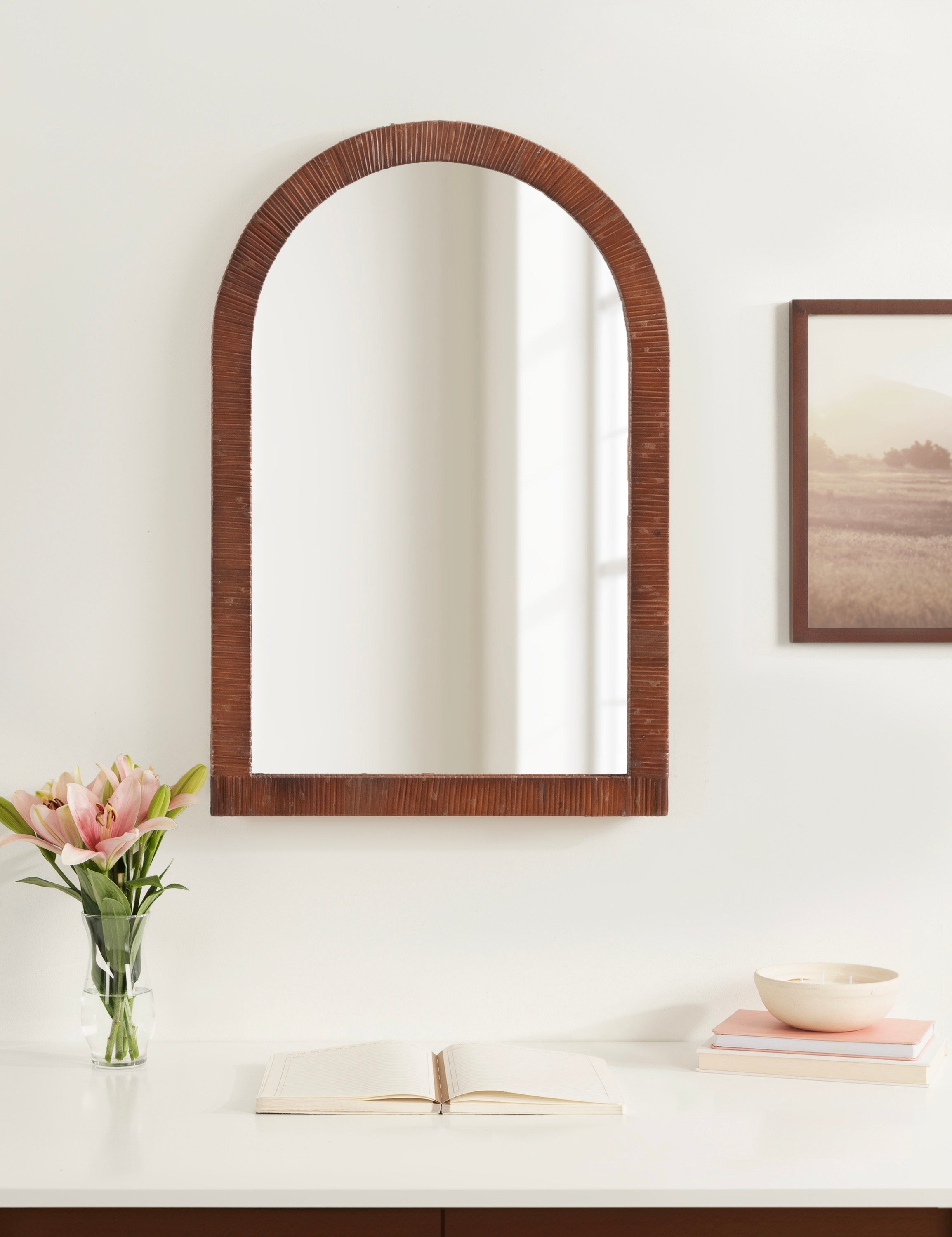 Create a bohemian aesthetic in your home with this fantastic and unique arched wall mirror. This beautiful mirror is the epitome of boho design, featuring an arched, textured look on the frame that pops off the wall. The beautifully wrapped frame is made from premium, high-quality rattan with a natural wood finish to show off its rich, authentic look. The arched shape emphasizes its unique look with a dash of modernity to showcase a geometric and trendy style on any wall. Hang this stunning piece of wall decor in your bedroom, entryway, dining room, living room, bathroom, or even above a fireplace mantel with its stellar and unique design.