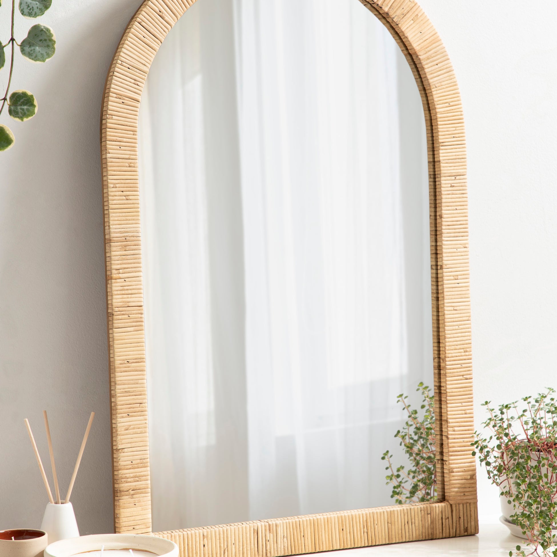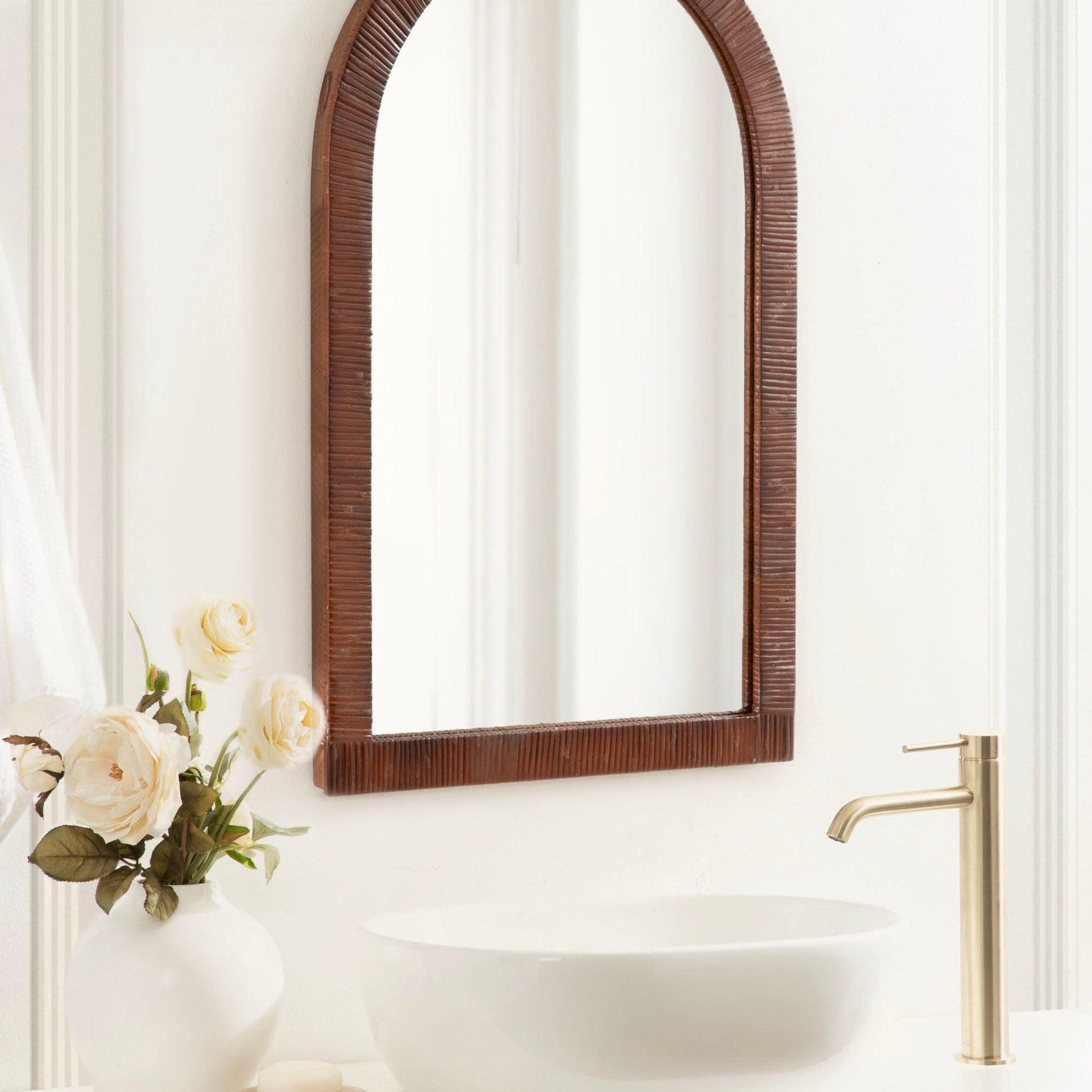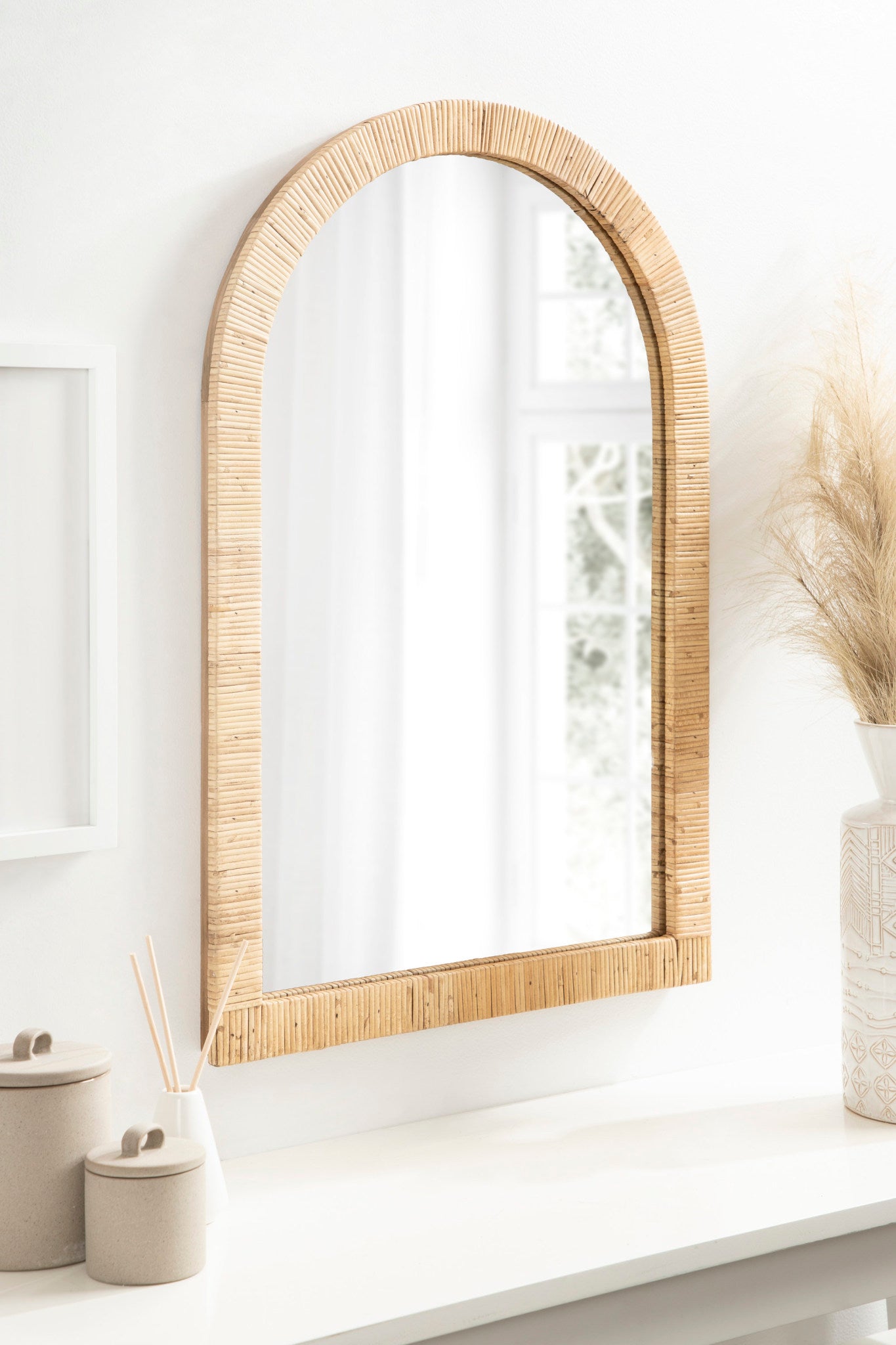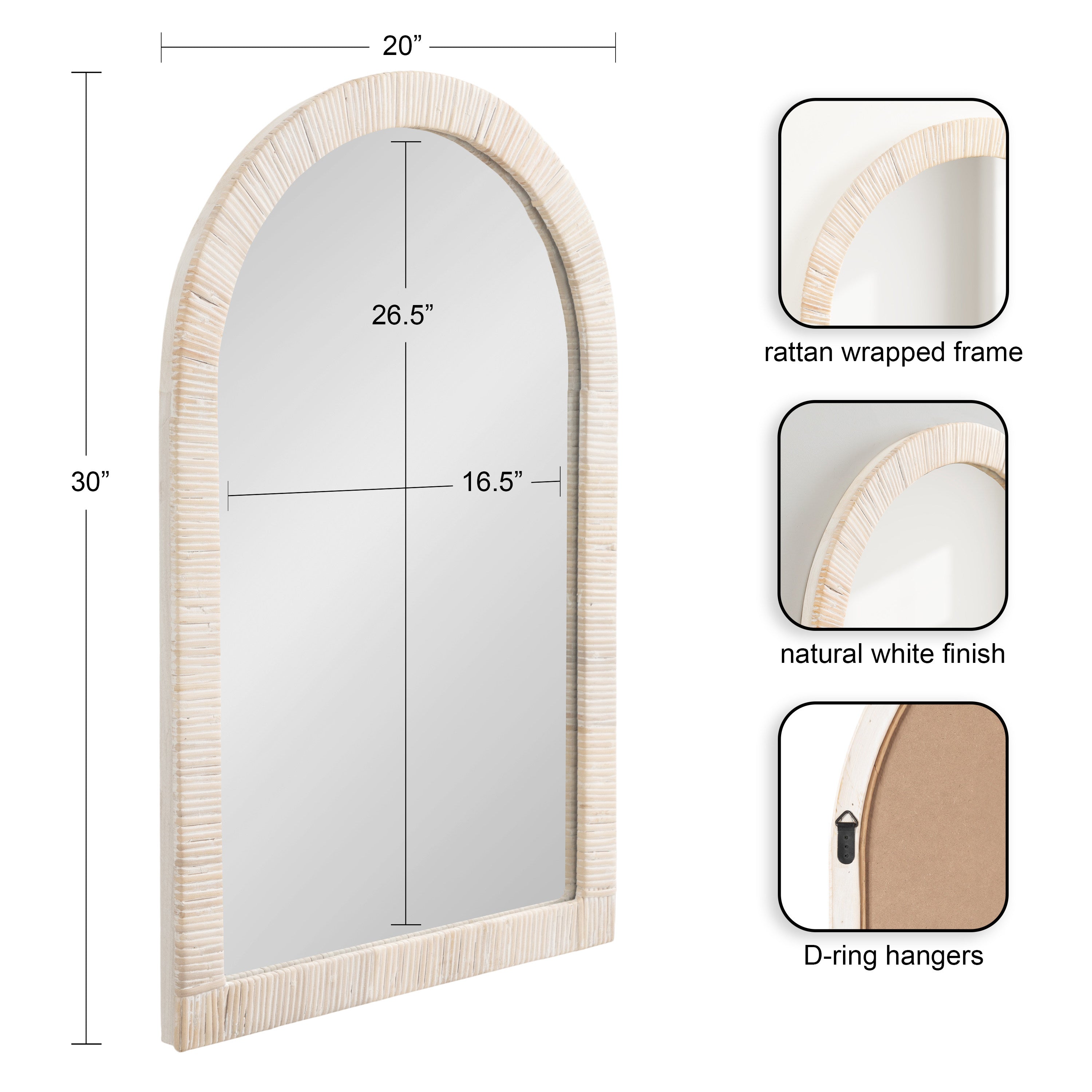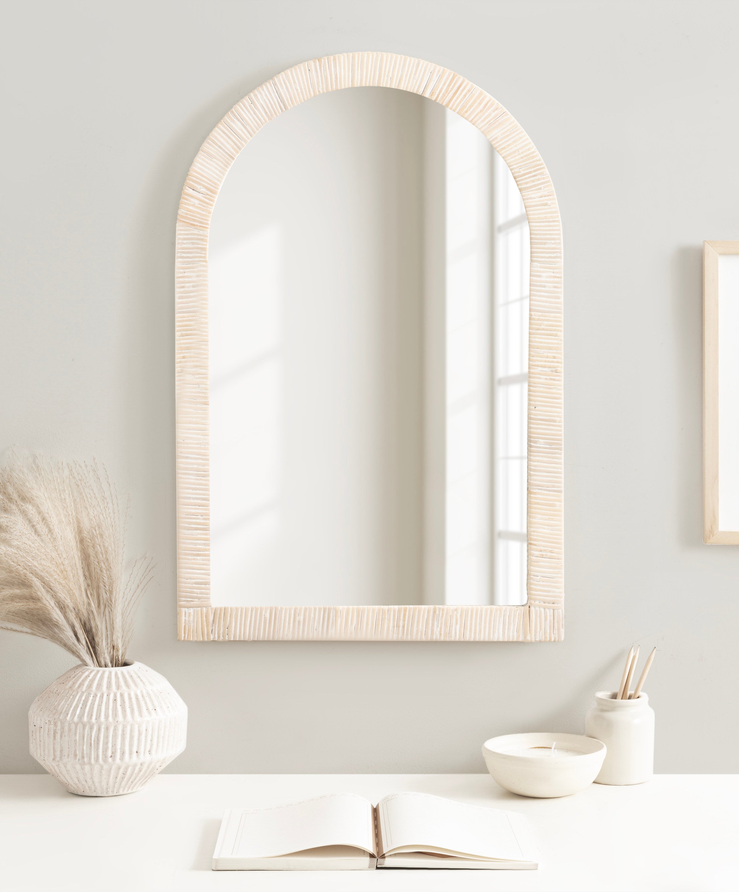 Create a bohemian aesthetic in your home with this fantastic and unique arched wall mirror. This beautiful mirror is the epitome of boho design, featuring an arched, textured look on the frame that pops off the wall. The beautifully wrapped frame is made from premium, high-quality rattan with a natural wood finish to show off its rich, authentic look. The arched shape emphasizes its unique look with a dash of modernity to showcase a geometric and trendy style on any wall. Hang this stunning piece of wall decor in your bedroom, entryway, dining room, living room, bathroom, or even above a fireplace mantel with its stellar and unique design.
