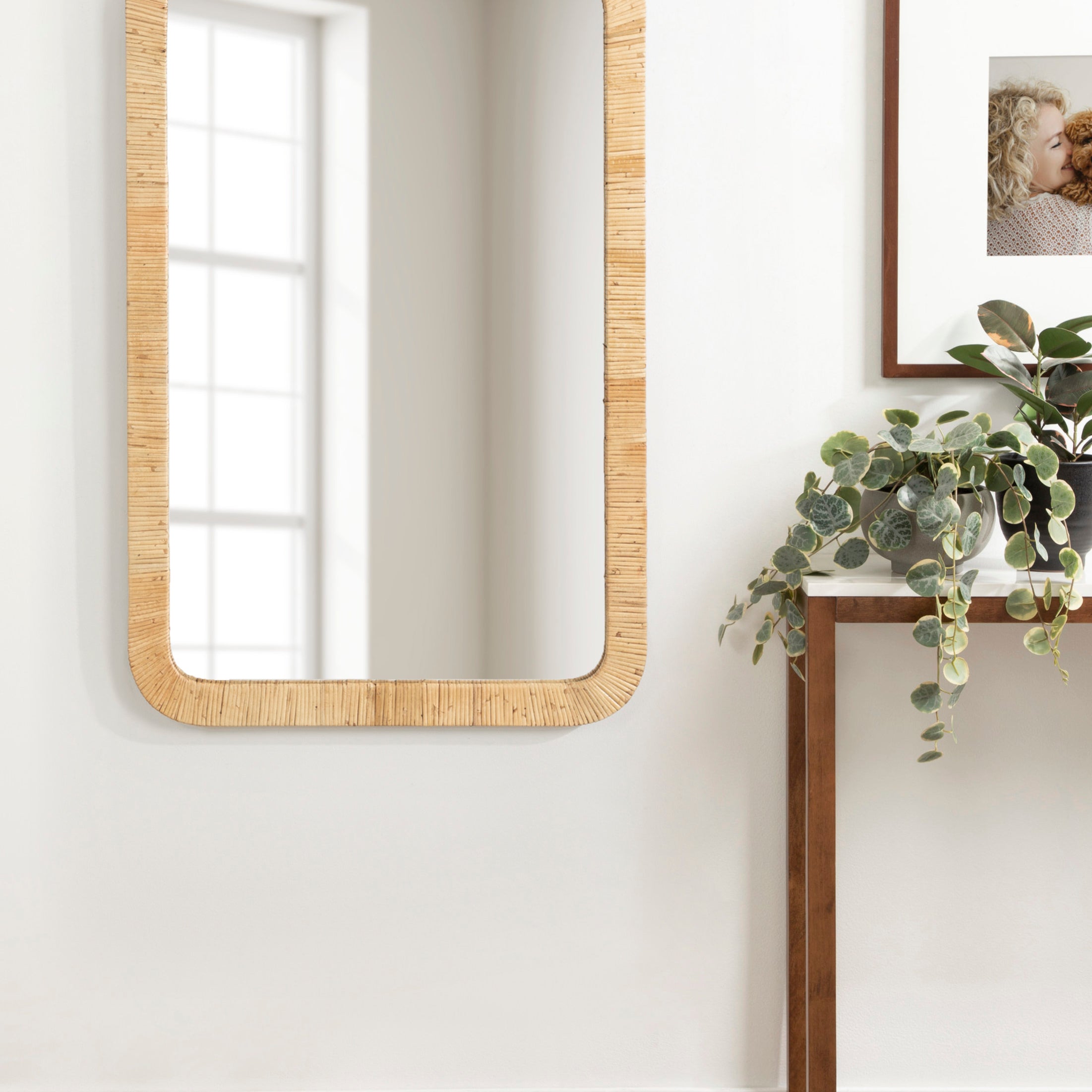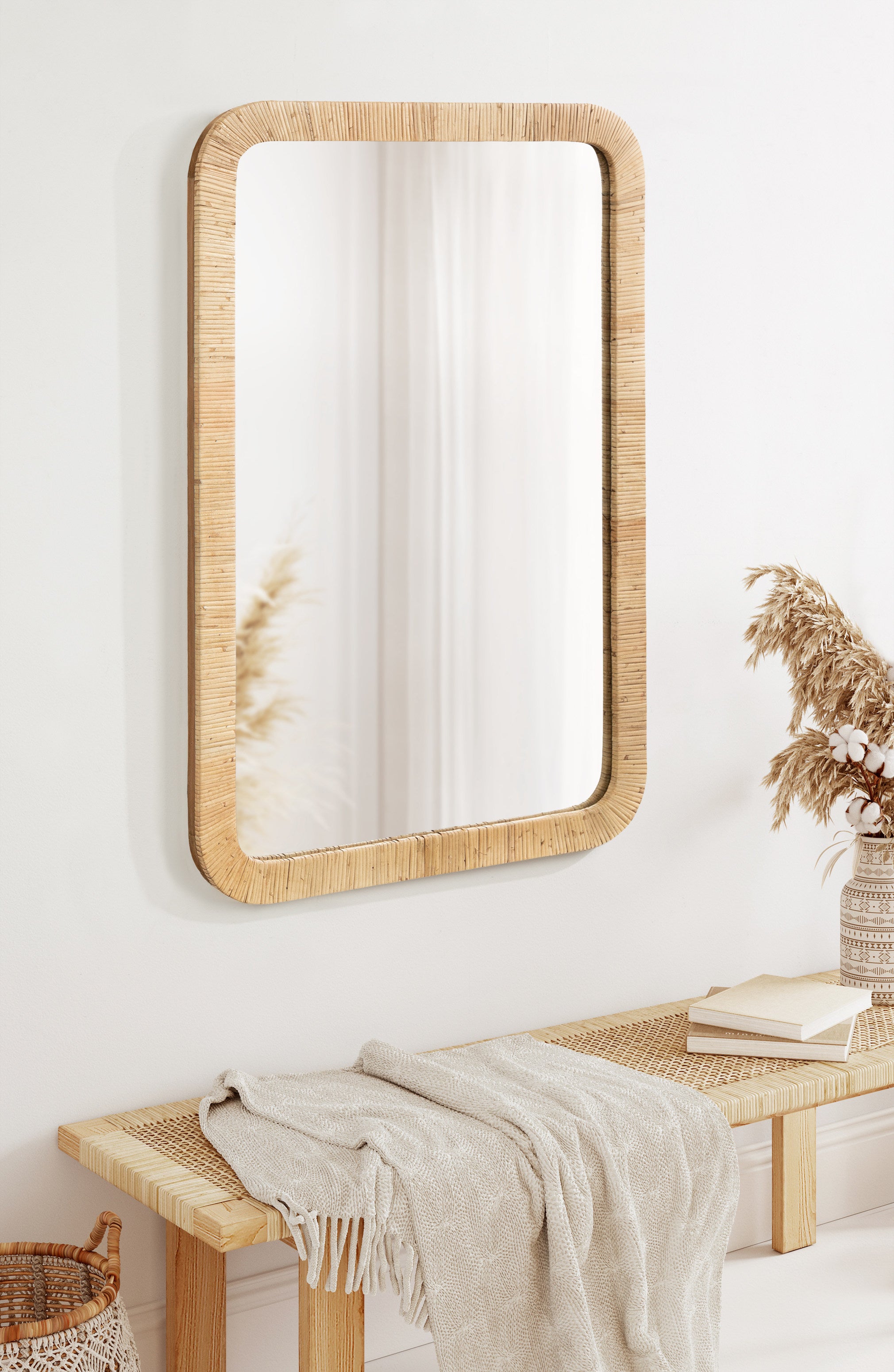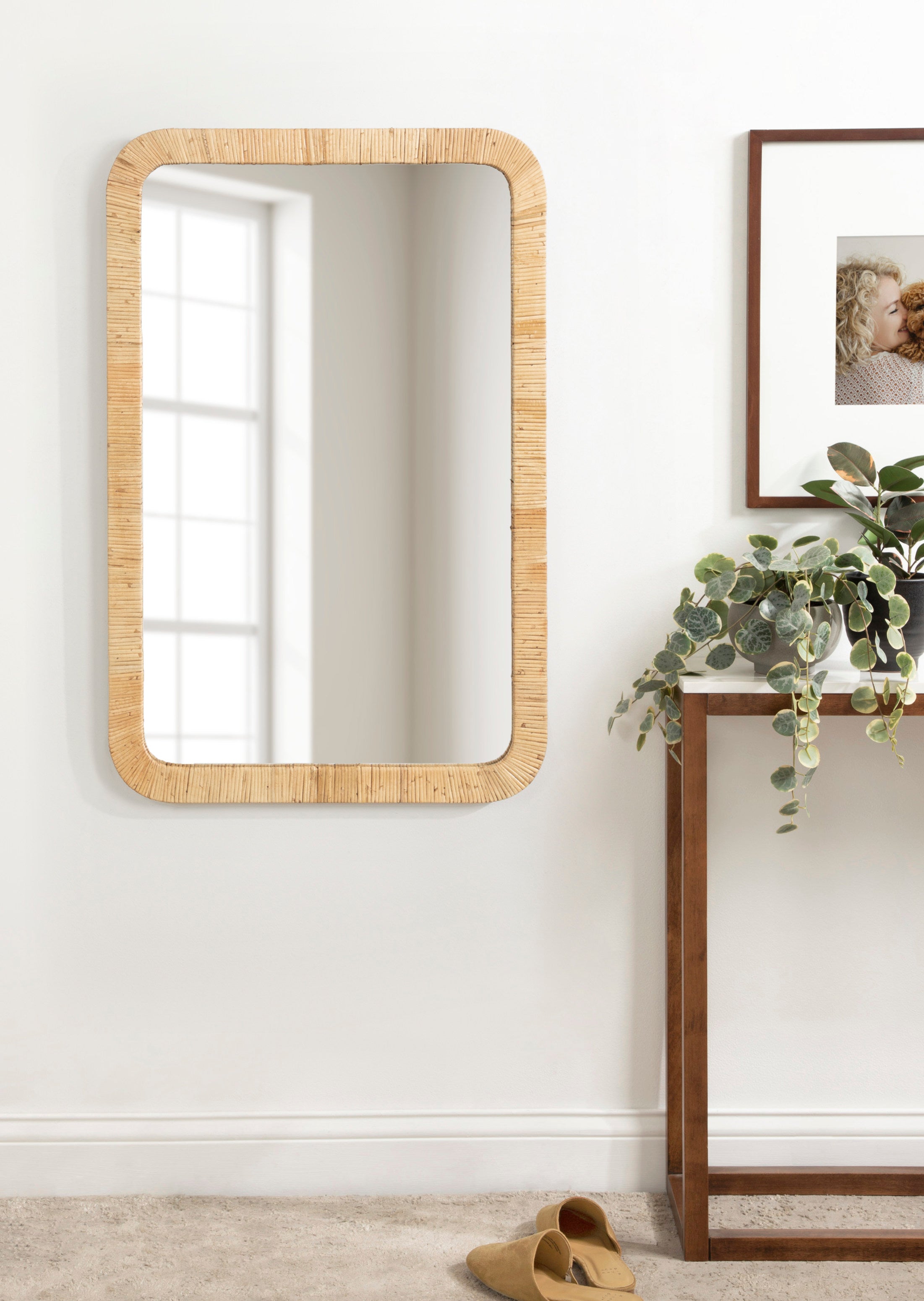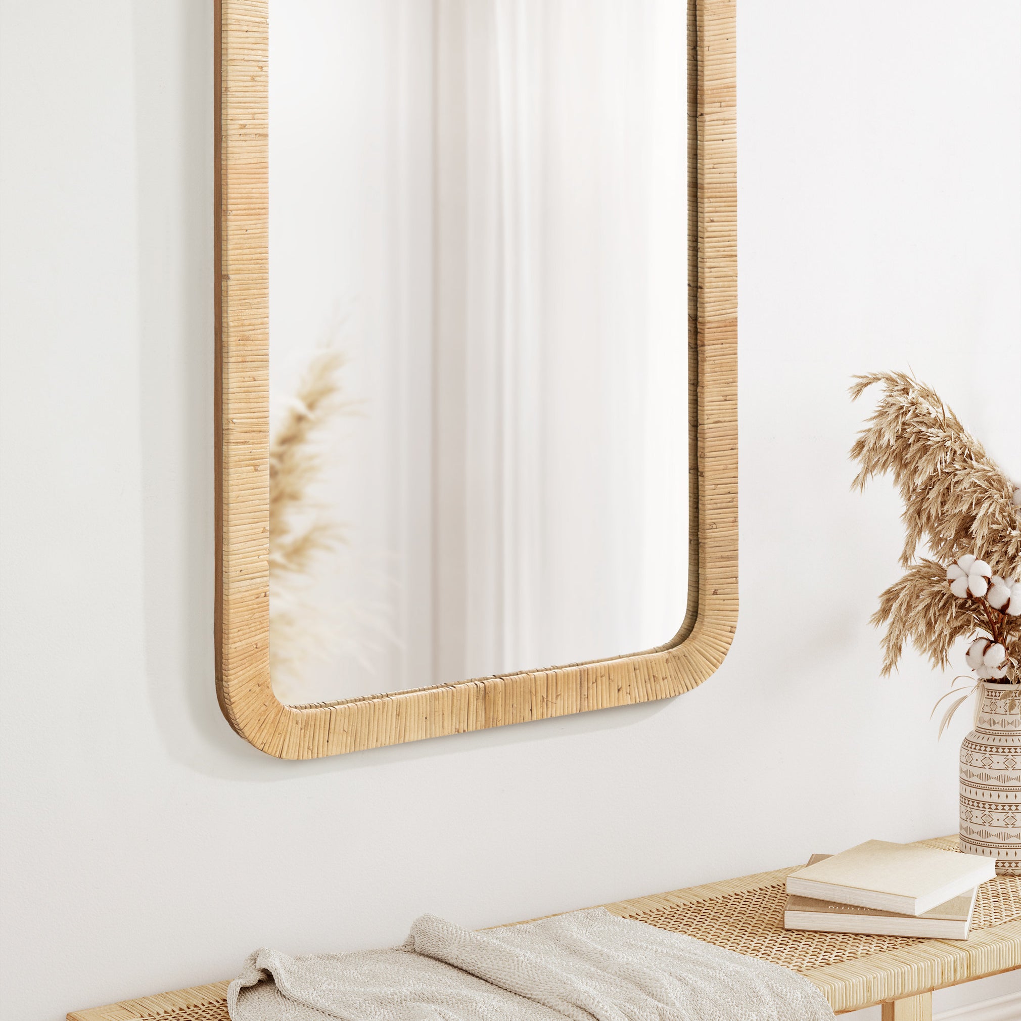 Create a bohemian aesthetic in your home with this fantastic and unique rounded rectangle wall mirror. This beautiful mirror is the epitome of boho design, featuring a natural, textured look on the frame that pops off the wall. The wonderfully wrapped frame is made from premium, high-quality rattan with a natural wood finish to show off its rich, authentic look. The rectangular shape emphasizes its unique look with a dash of modernity to showcase a geometric and trendy style on any wall. Hang this stunning piece of wall decor in your bedroom, entryway, dining room, living room, or even bathroom with its stellar and unique design.