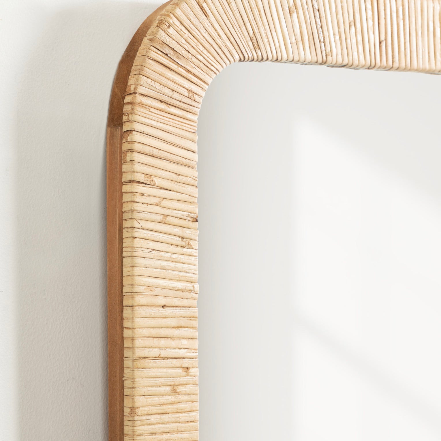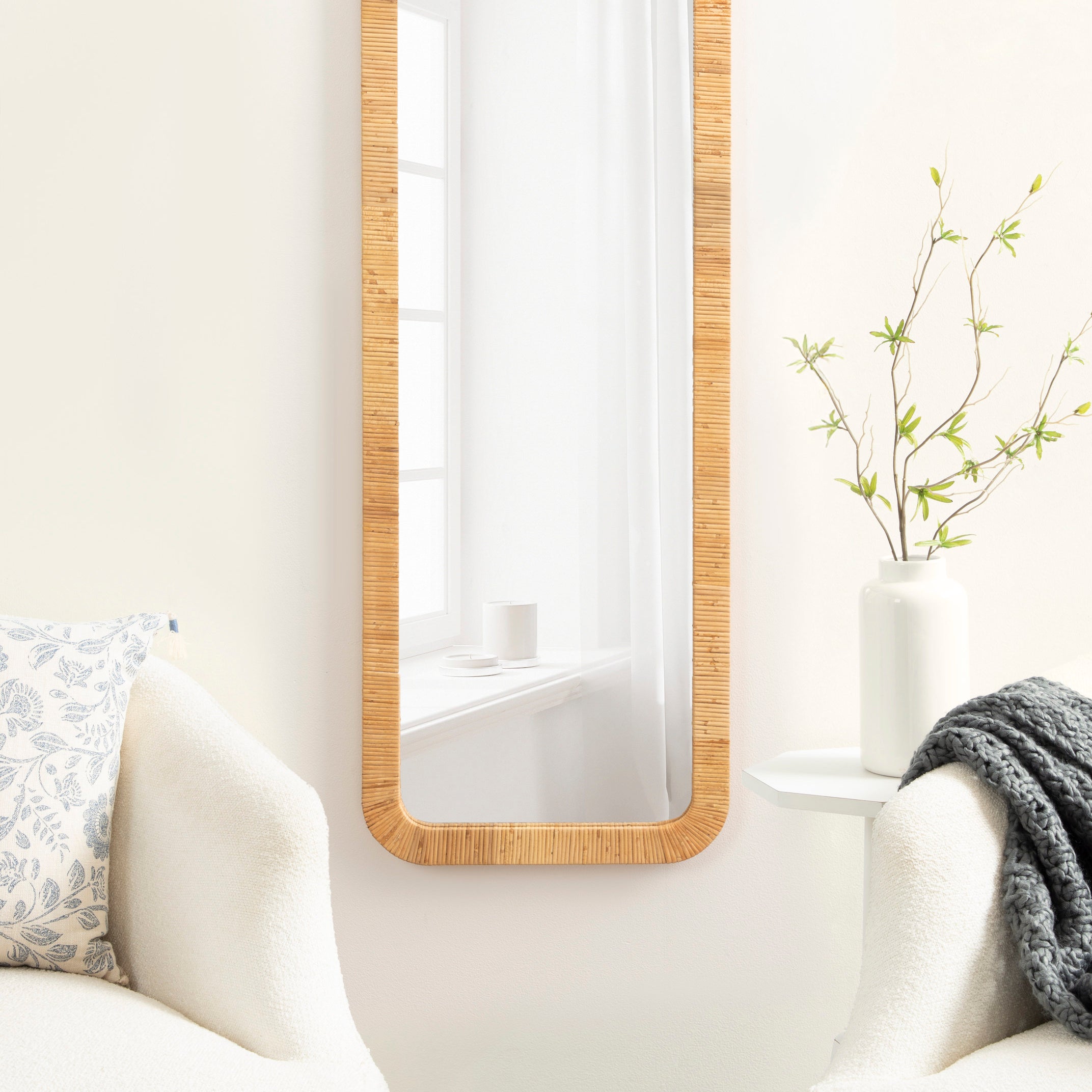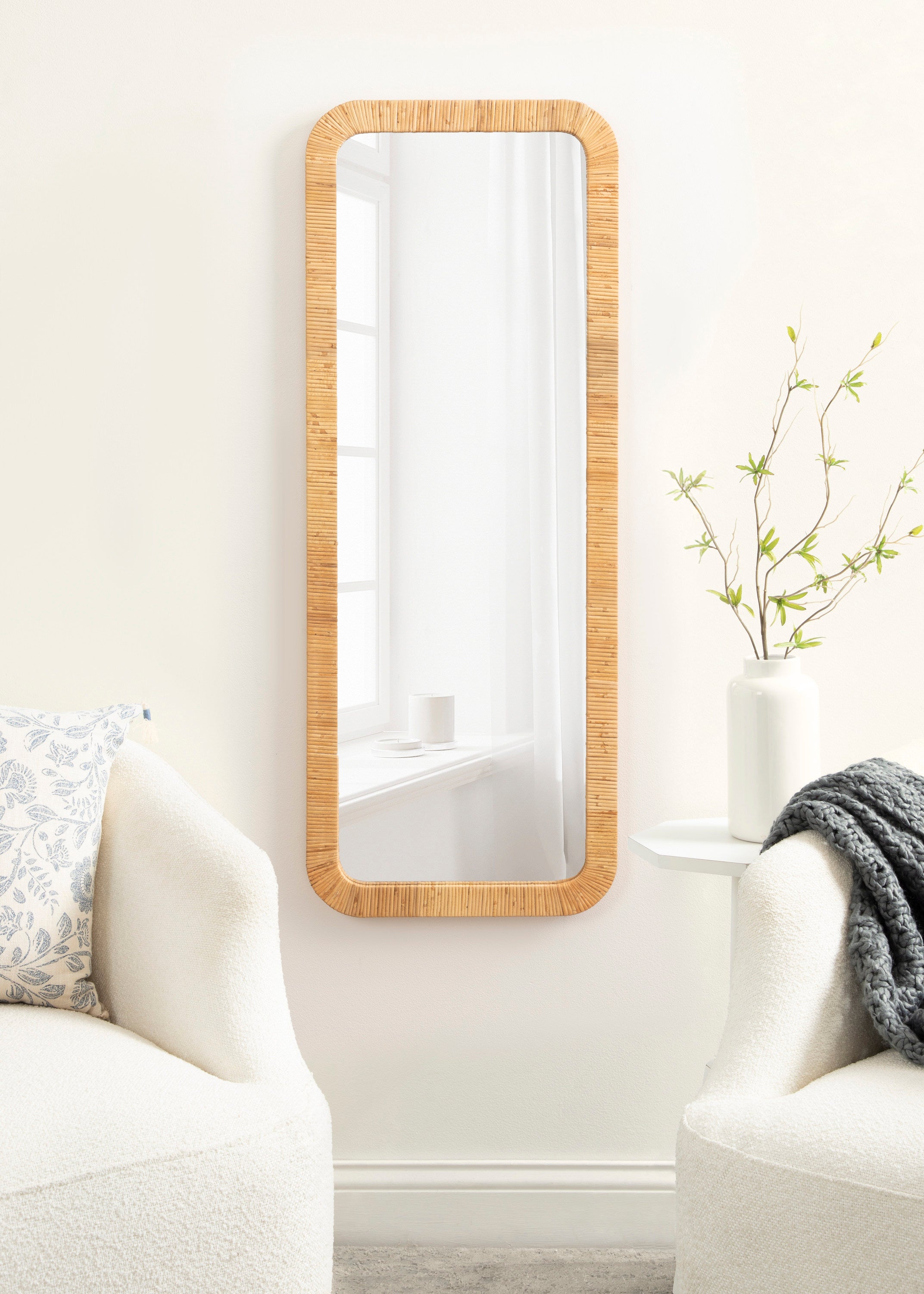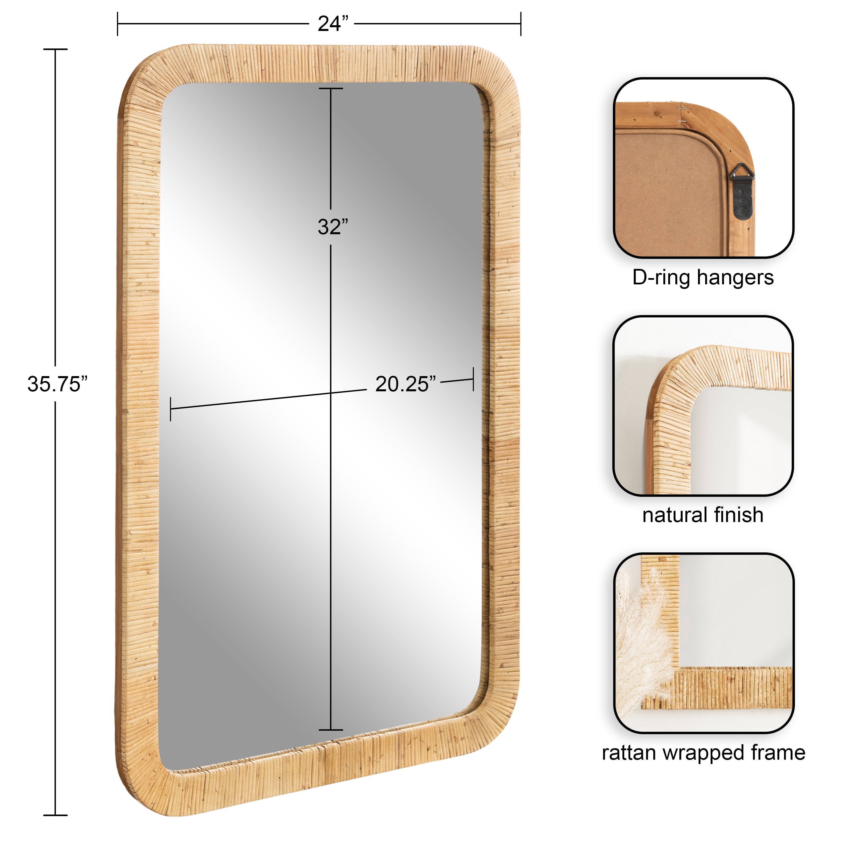 Create a bohemian aesthetic in your home with this fantastic and unique rounded rectangle wall mirror. This beautiful mirror is the epitome of boho design, featuring a natural, textured look on the frame that pops off the wall. The wonderfully wrapped frame is made from premium, high-quality rattan with a natural wood finish to show off its rich, authentic look. The rectangular shape emphasizes its unique look with a dash of modernity to showcase a geometric and trendy style on any wall. Hang this stunning piece of wall decor in your bedroom, entryway, dining room, living room, or even bathroom with its stellar and unique design.
