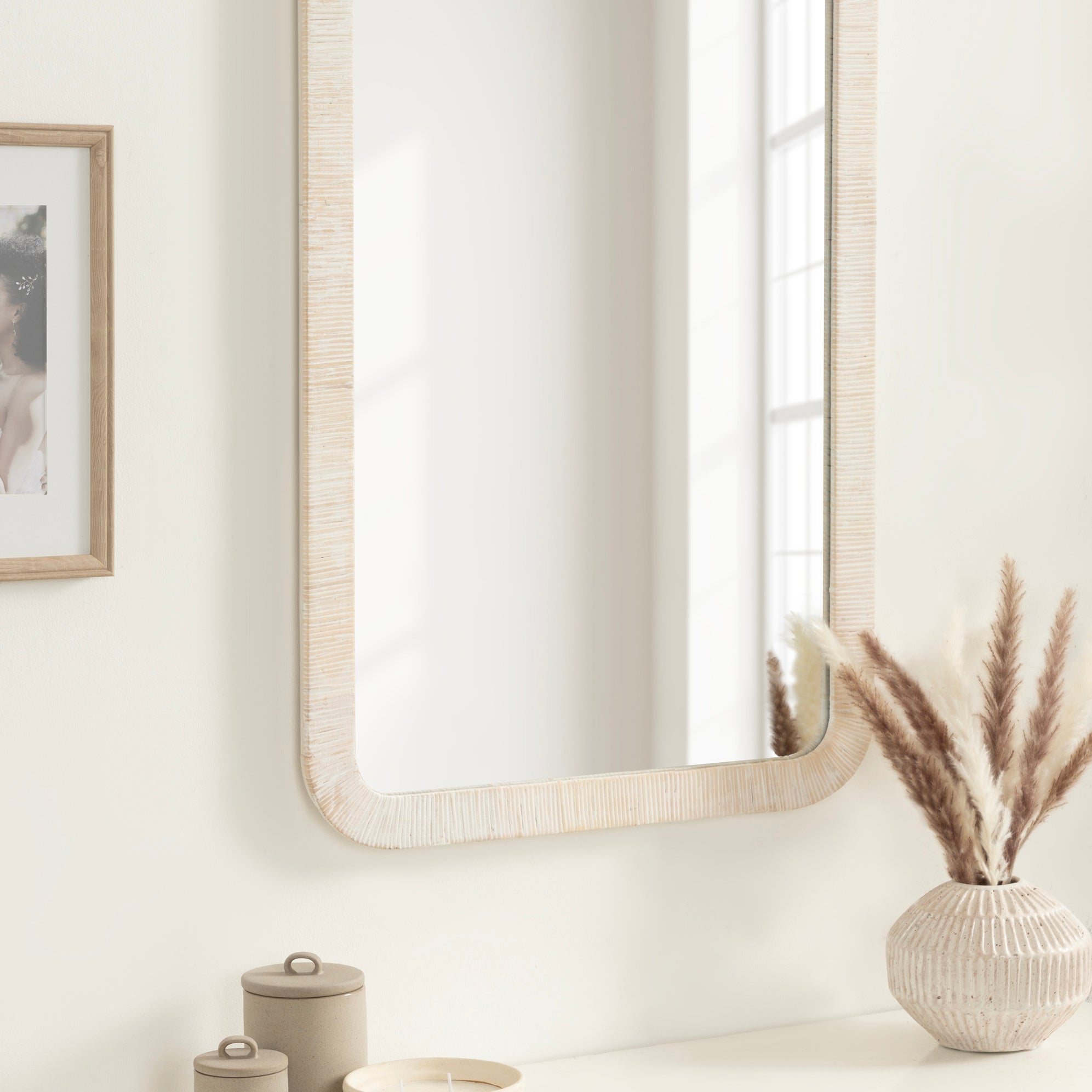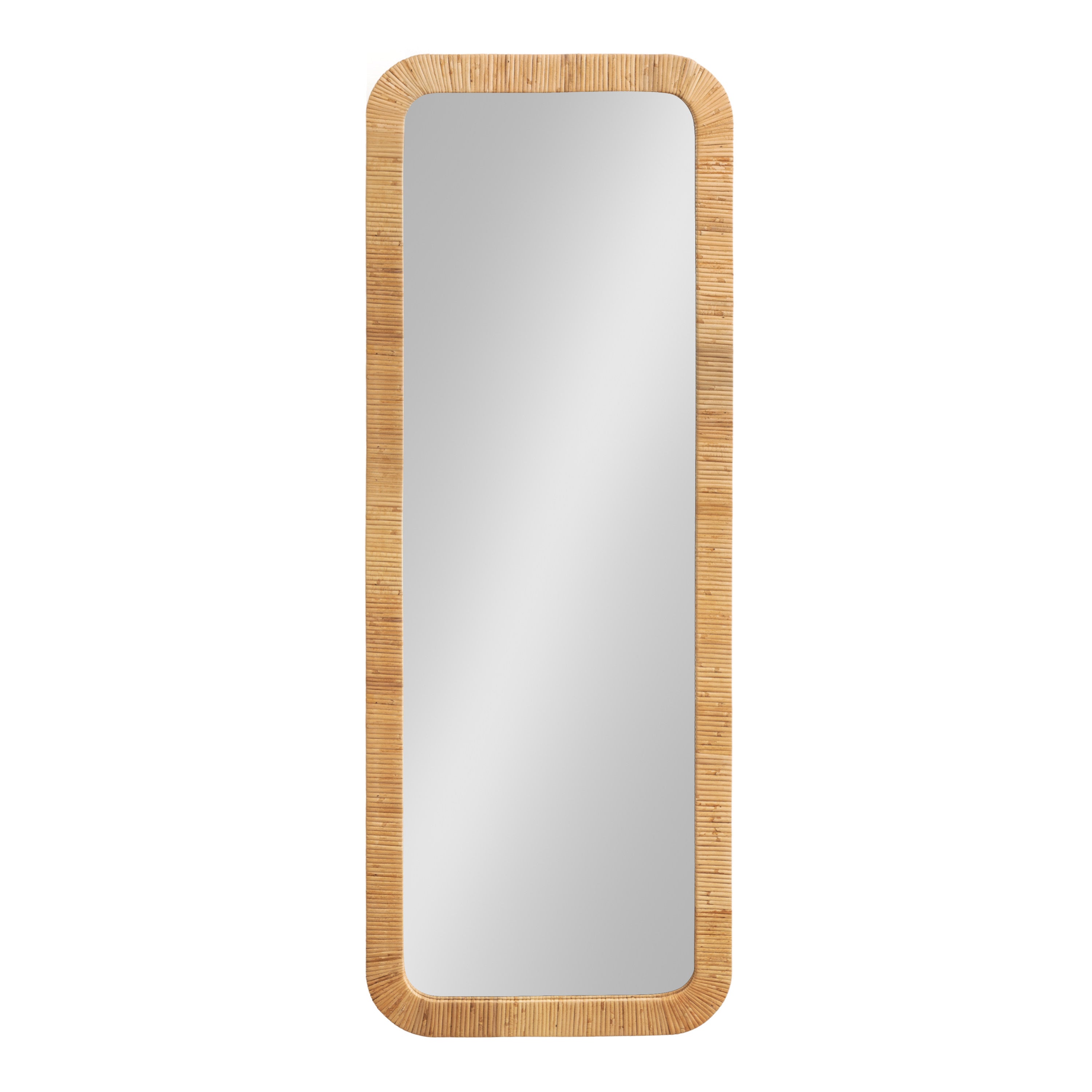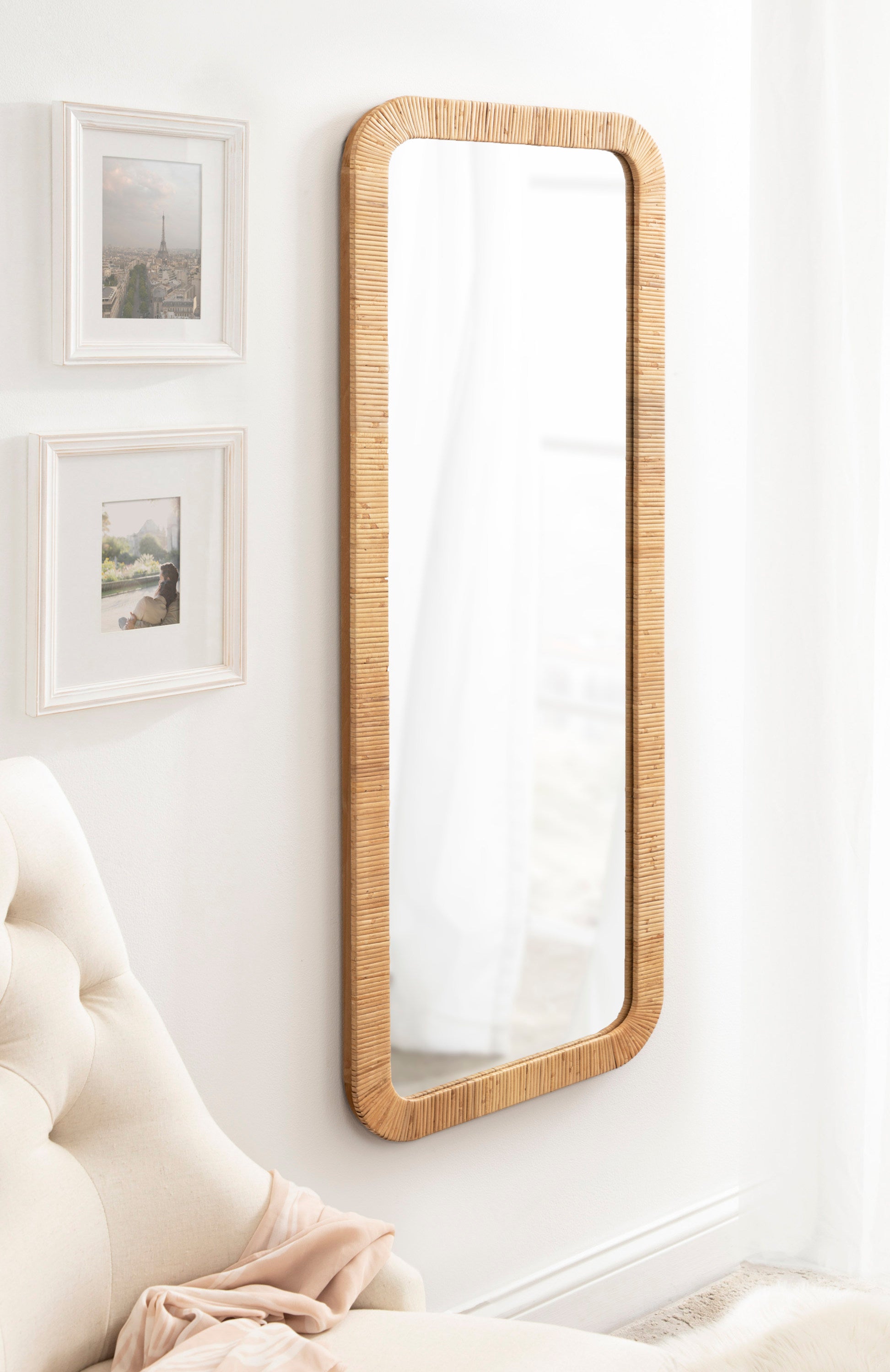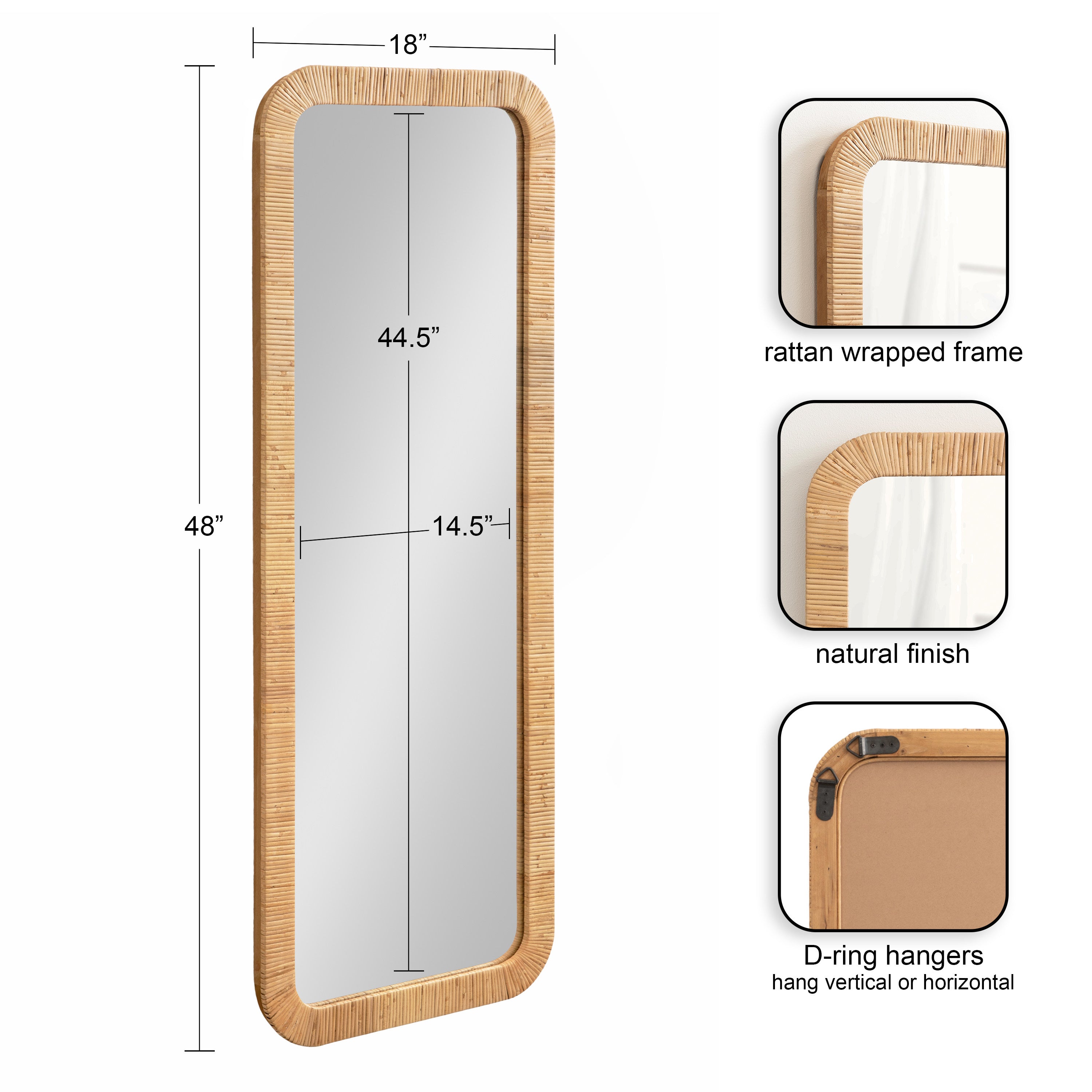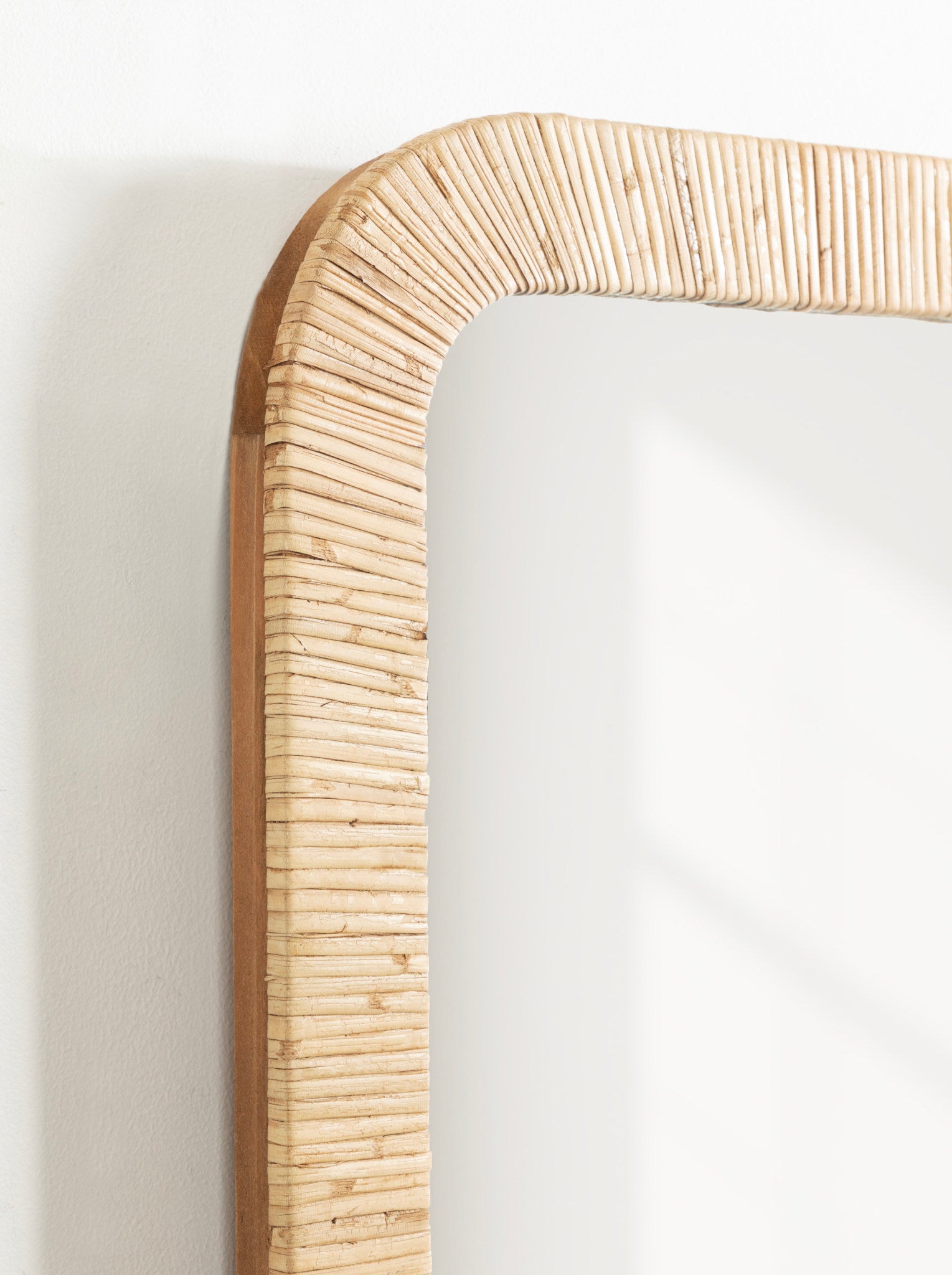 Create a bohemian aesthetic in your home with this fantastic and unique rounded rectangle wall mirror. This beautiful mirror is the epitome of boho design, featuring a natural, textured look on the frame that pops off the wall. The wonderfully wrapped frame is made from premium, high-quality rattan with a natural wood finish to show off its rich, authentic look. The rectangular shape emphasizes its unique look with a dash of modernity to showcase a geometric and trendy style on any wall. Hang this stunning piece of wall decor in your bedroom, entryway, dining room, living room, or even bathroom with its stellar and unique design.