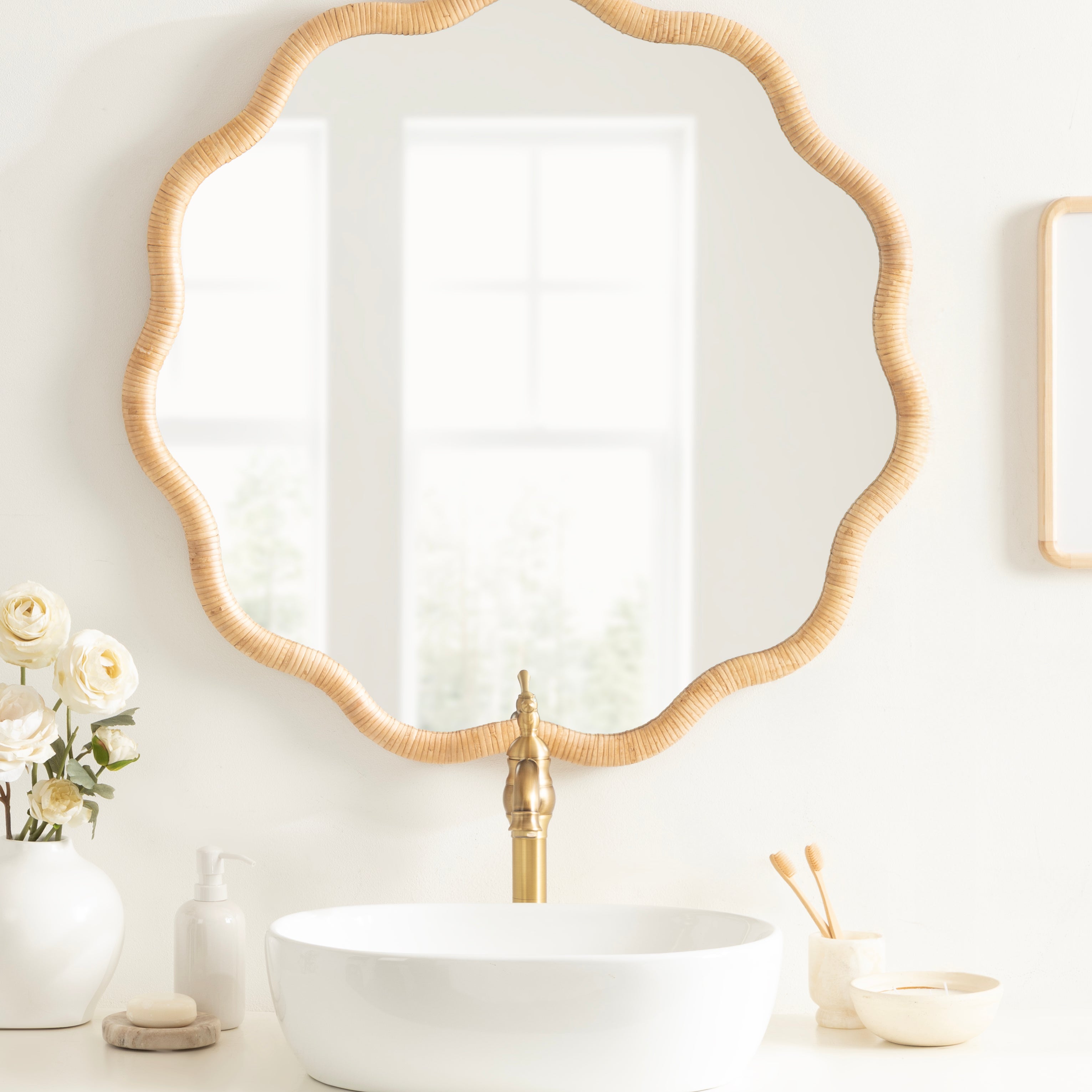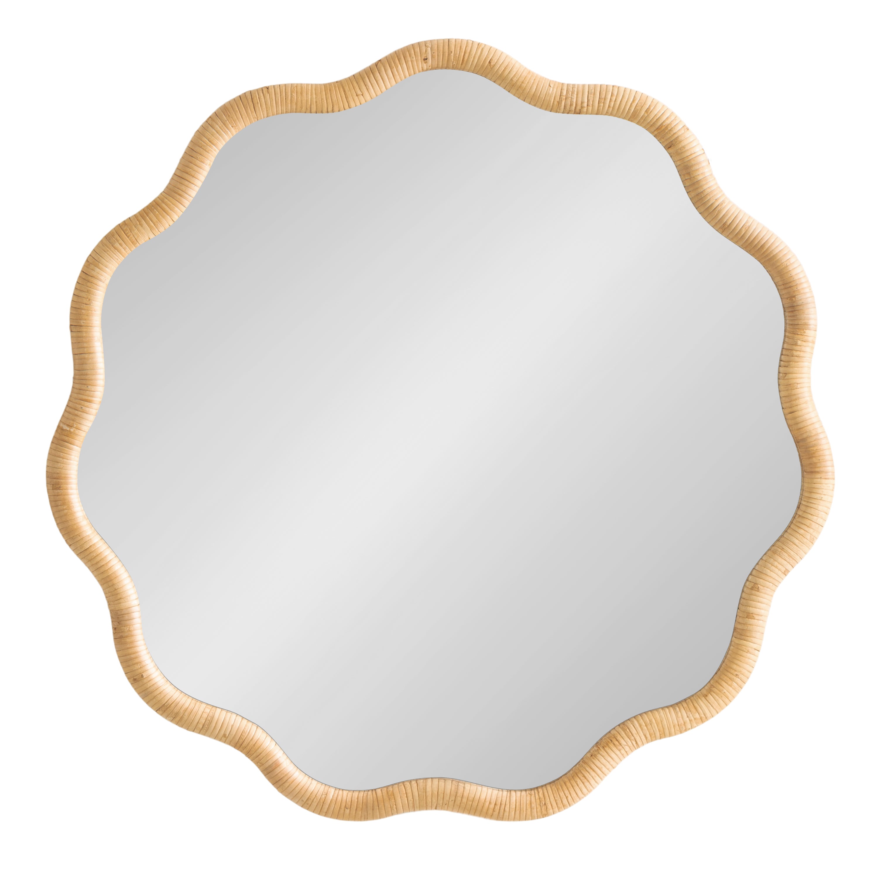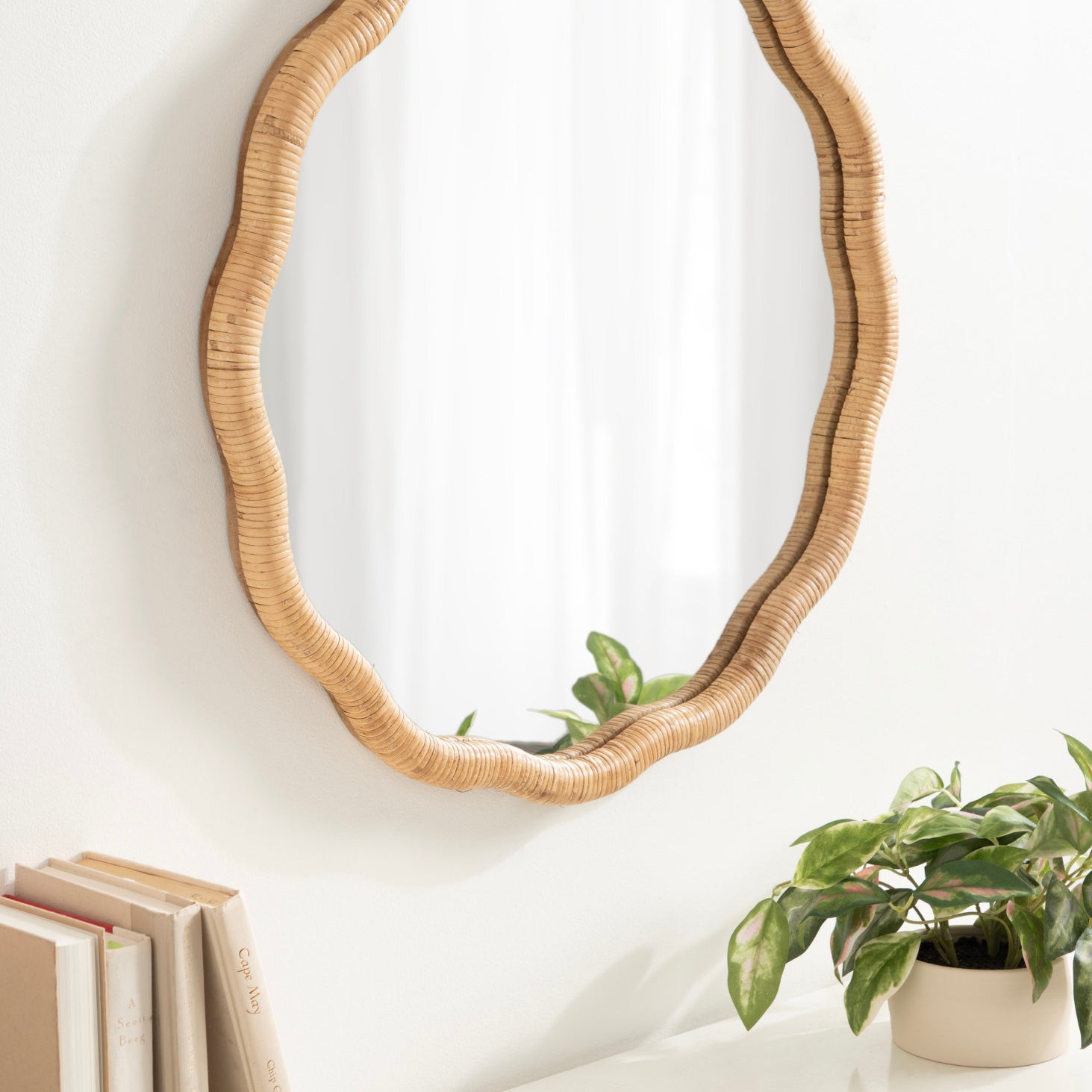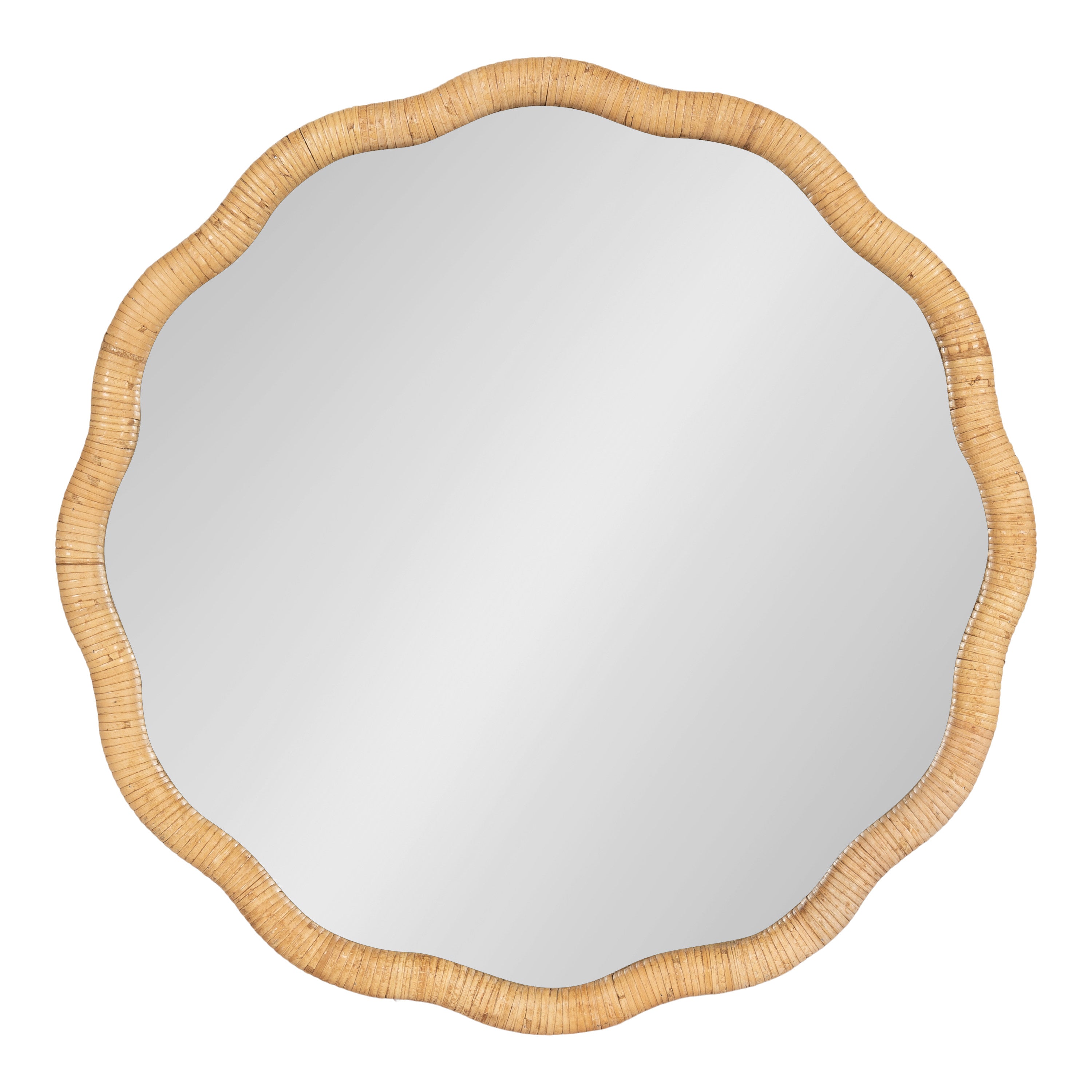 Elevate your wall decor with boho sophistication by hanging the Rahfy mirror! This lovely mirror offers textured visual intrigue to your home with a rattan-wrapped, round scalloped frame. It's a bold style choice that pays off with a vibrant surface area and a dimensional design. Whether you're redecorating your bathroom or adding a stylish and textured focal point to your favorite living space, it's perfect for setting the tone of your aesthetic.