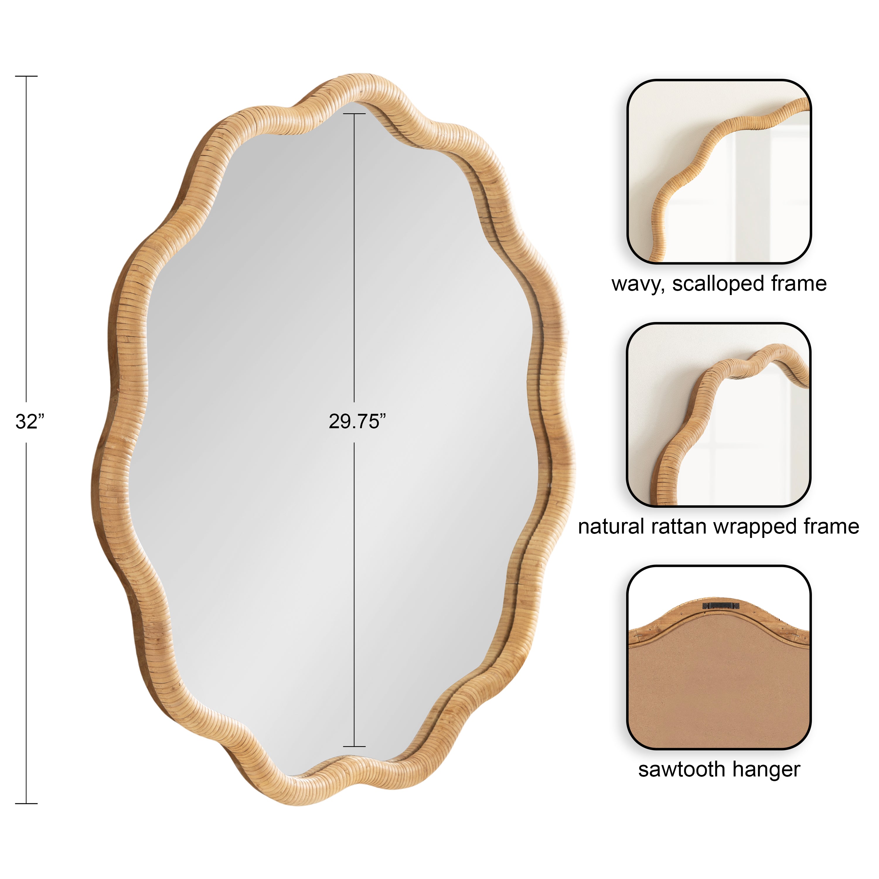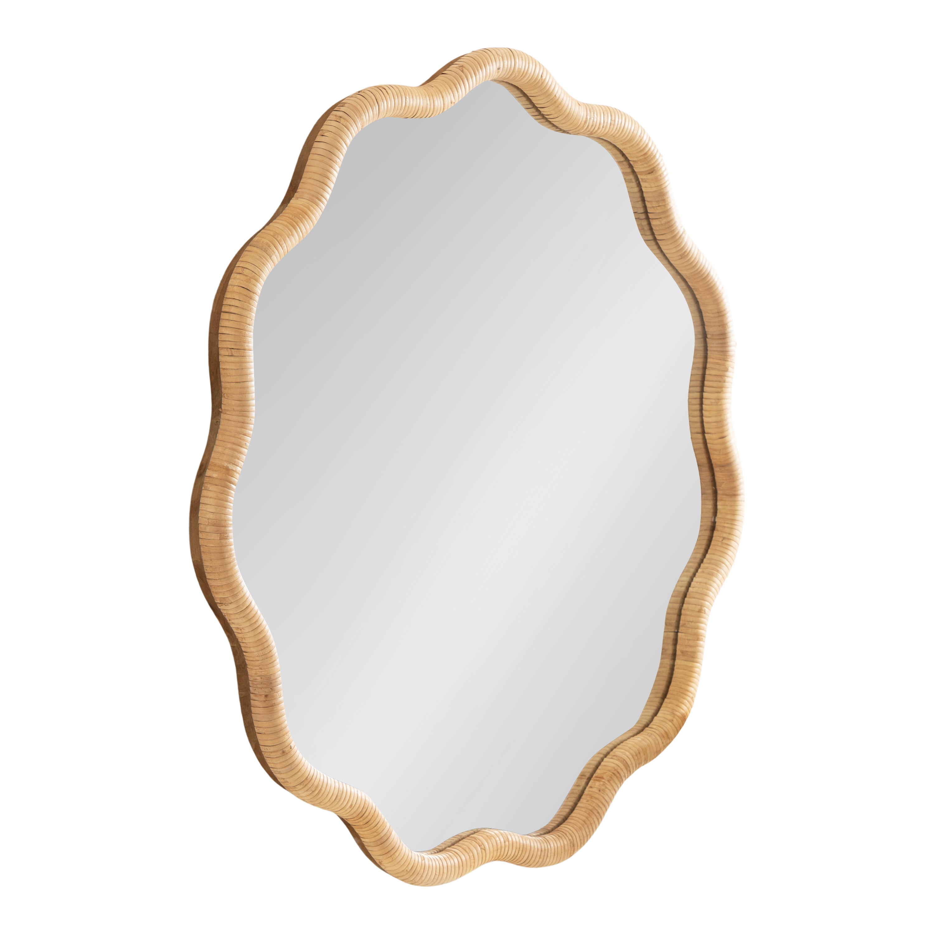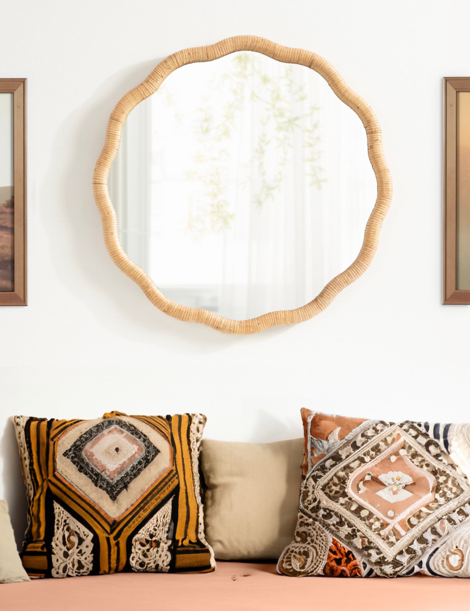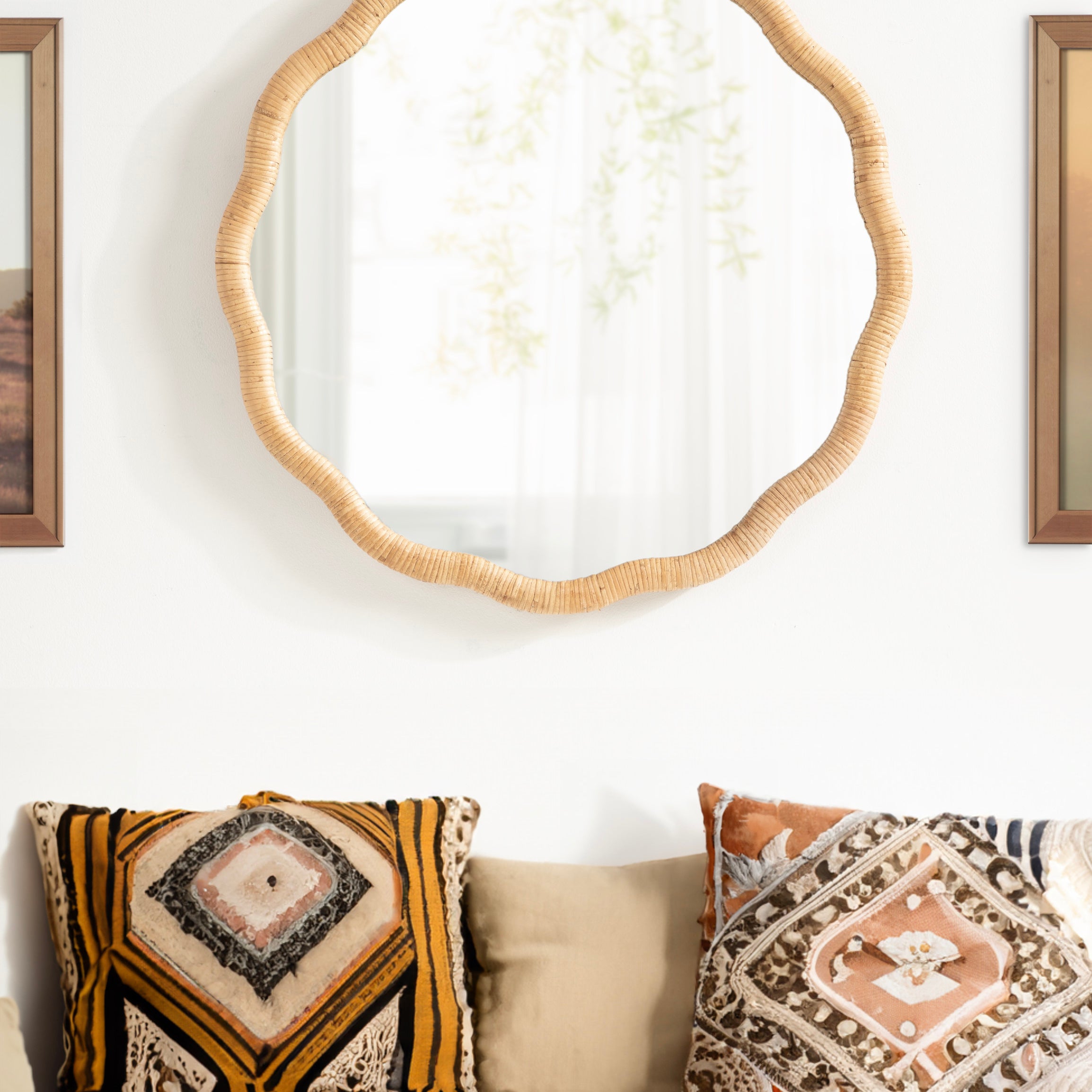 Elevate your wall decor with boho sophistication by hanging the Rahfy mirror! This lovely mirror offers textured visual intrigue to your home with a rattan-wrapped, round scalloped frame. It's a bold style choice that pays off with a vibrant surface area and a dimensional design. Whether you're redecorating your bathroom or adding a stylish and textured focal point to your favorite living space, it's perfect for setting the tone of your aesthetic.