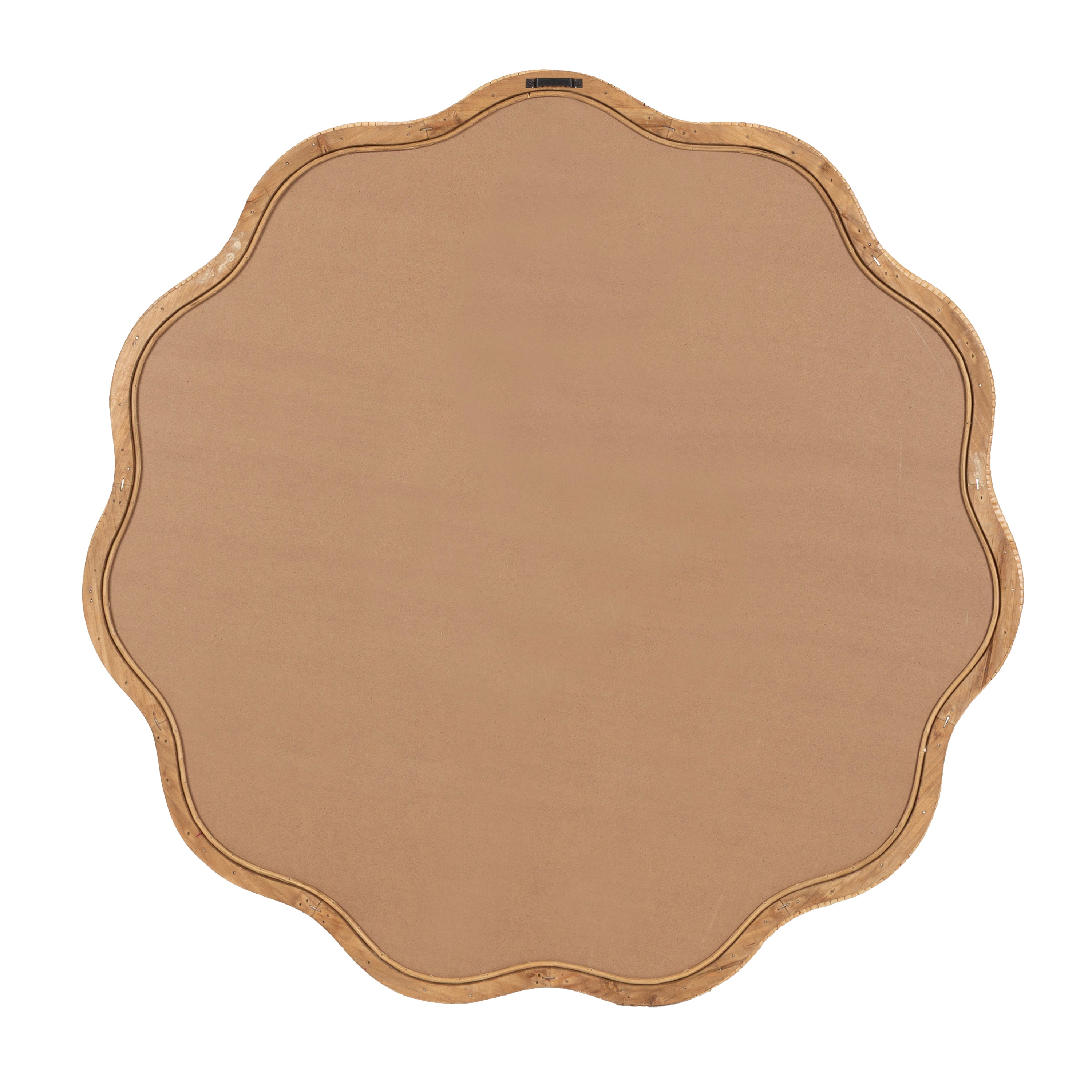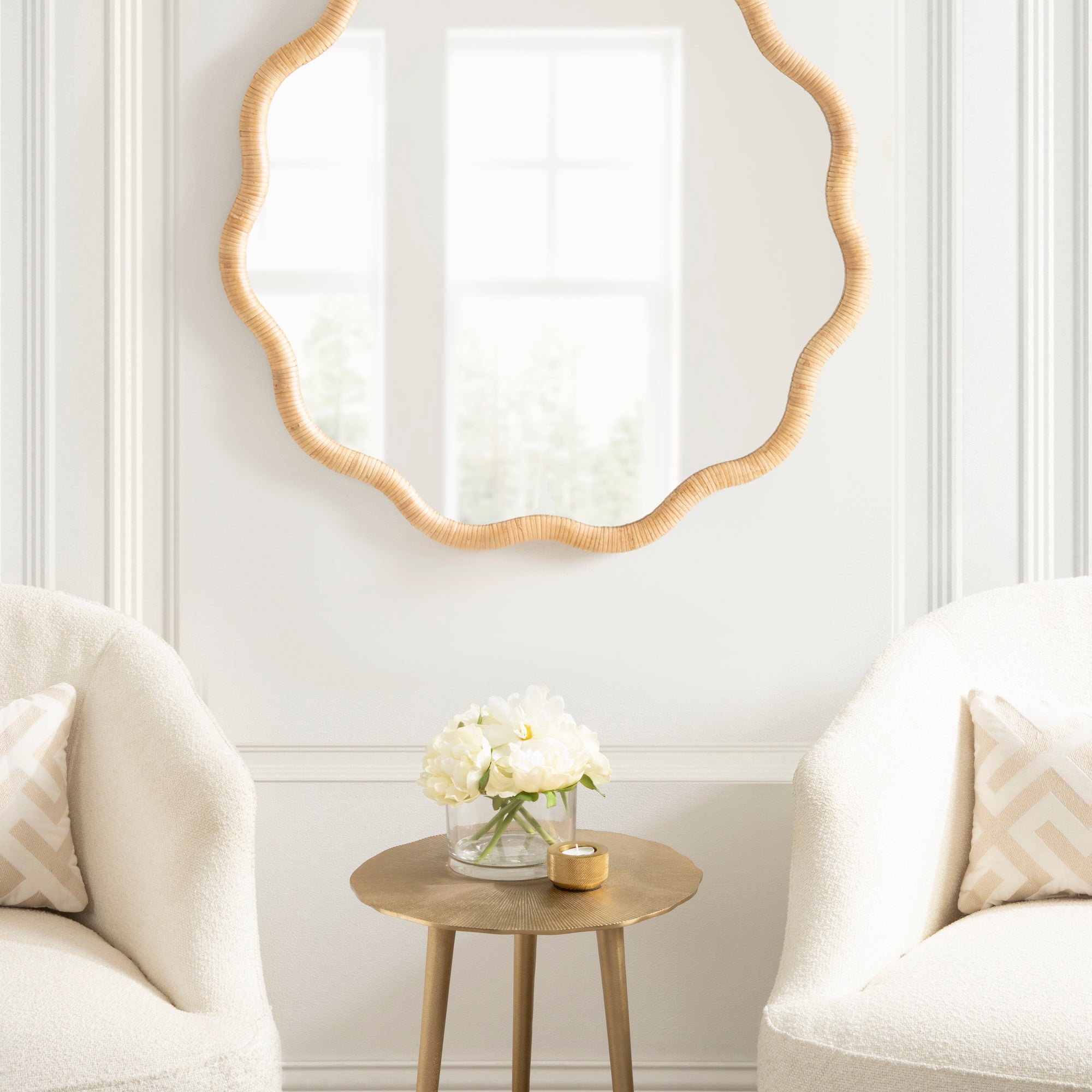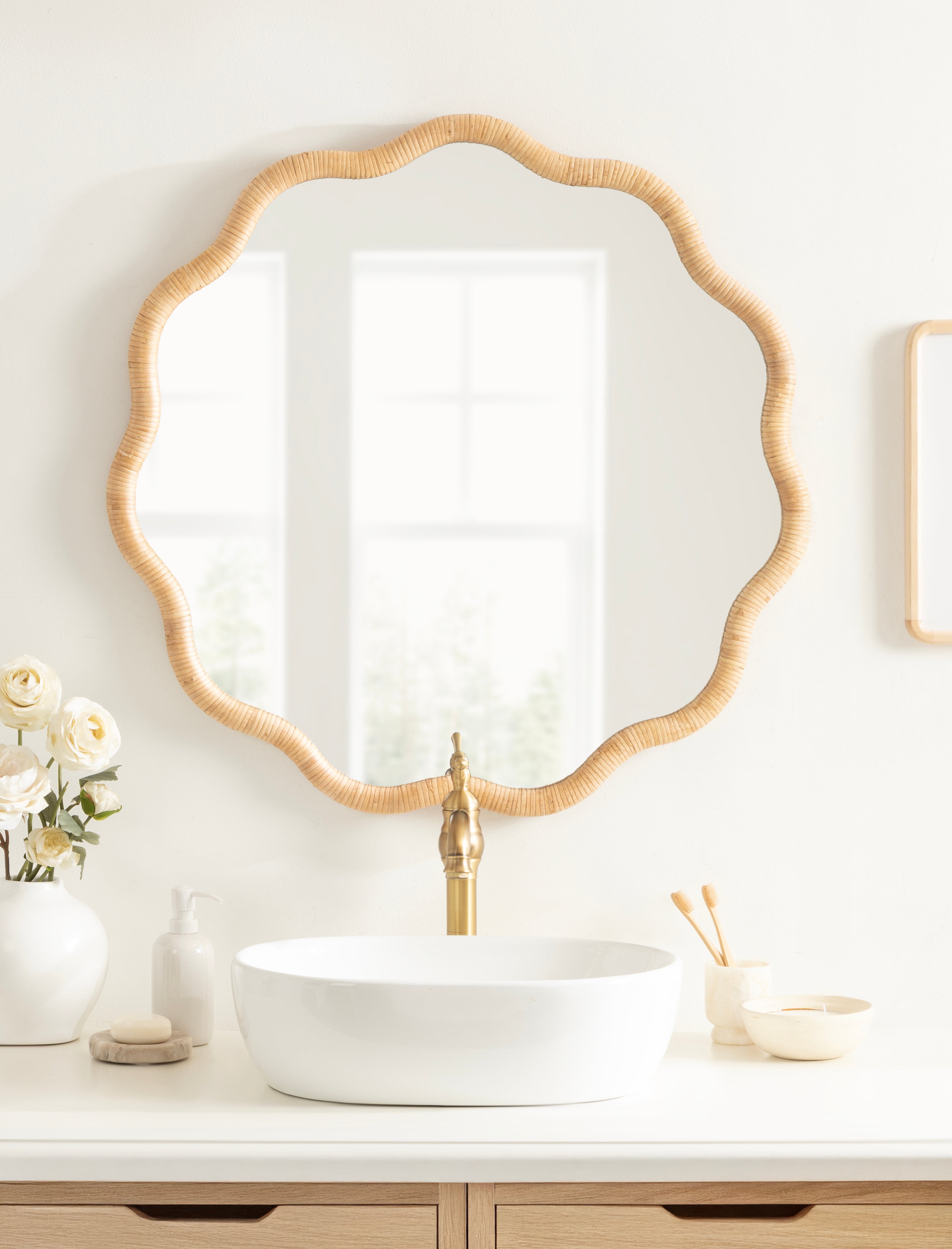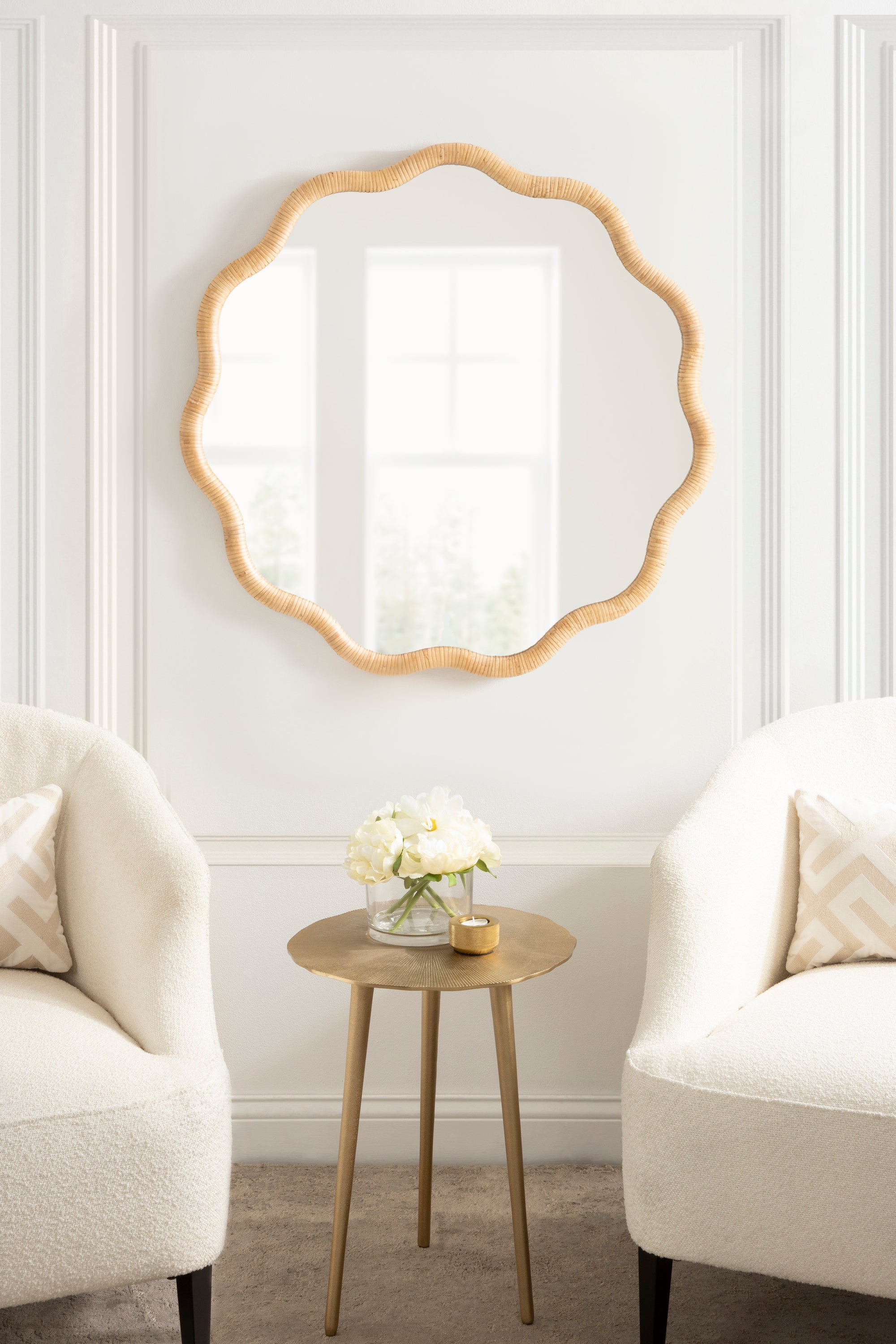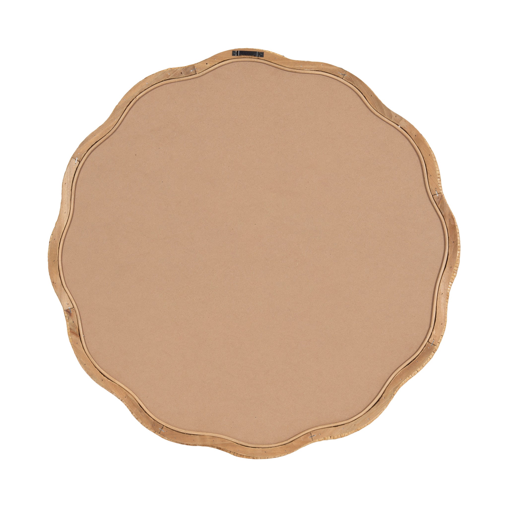 Elevate your wall decor with boho sophistication by hanging the Rahfy mirror! This lovely mirror offers textured visual intrigue to your home with a rattan-wrapped, round scalloped frame. It's a bold style choice that pays off with a vibrant surface area and a dimensional design. Whether you're redecorating your bathroom or adding a stylish and textured focal point to your favorite living space, it's perfect for setting the tone of your aesthetic.