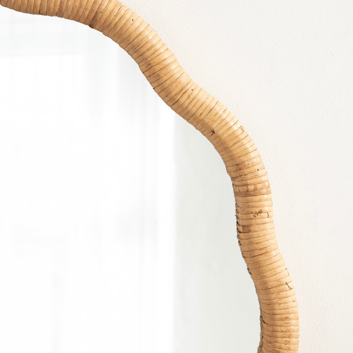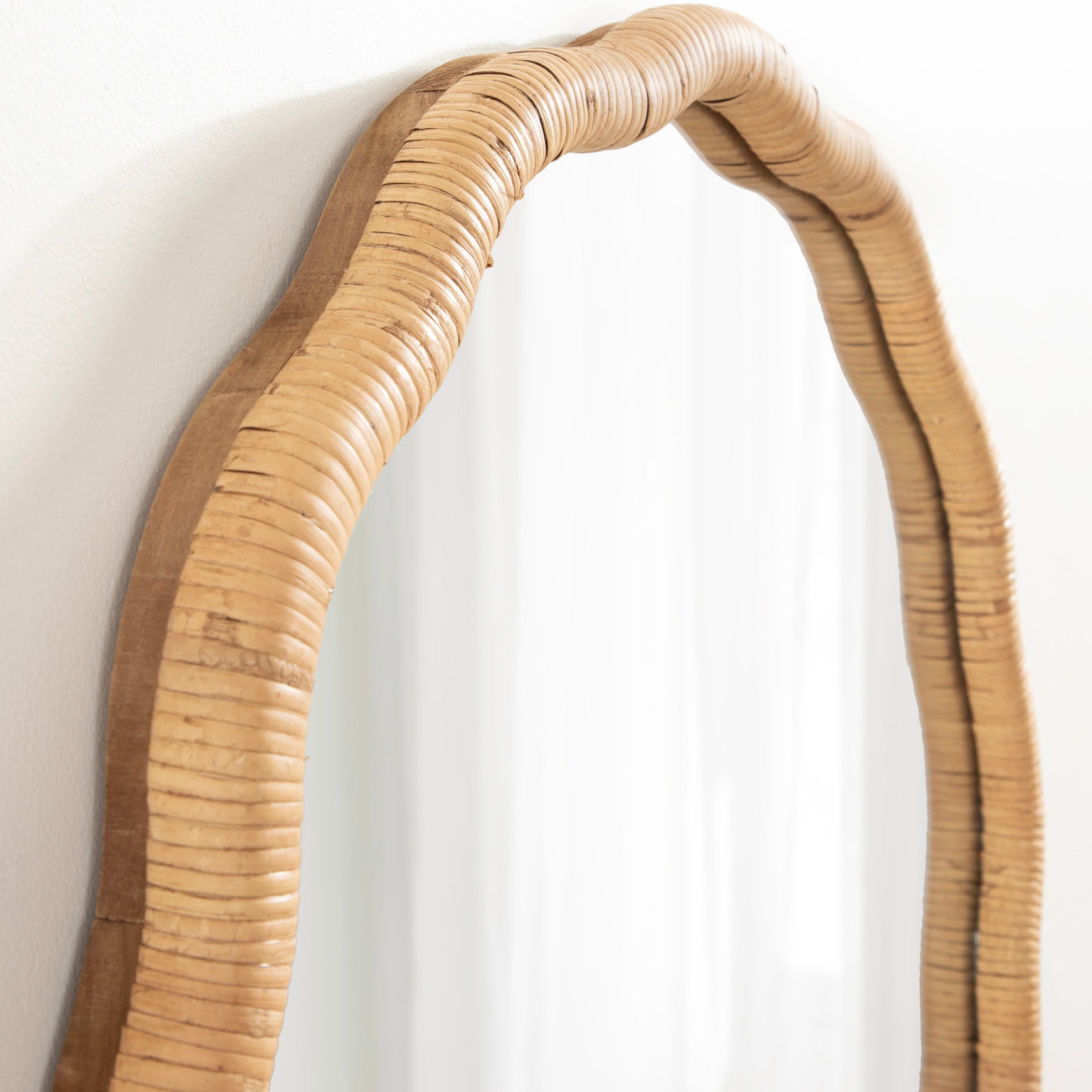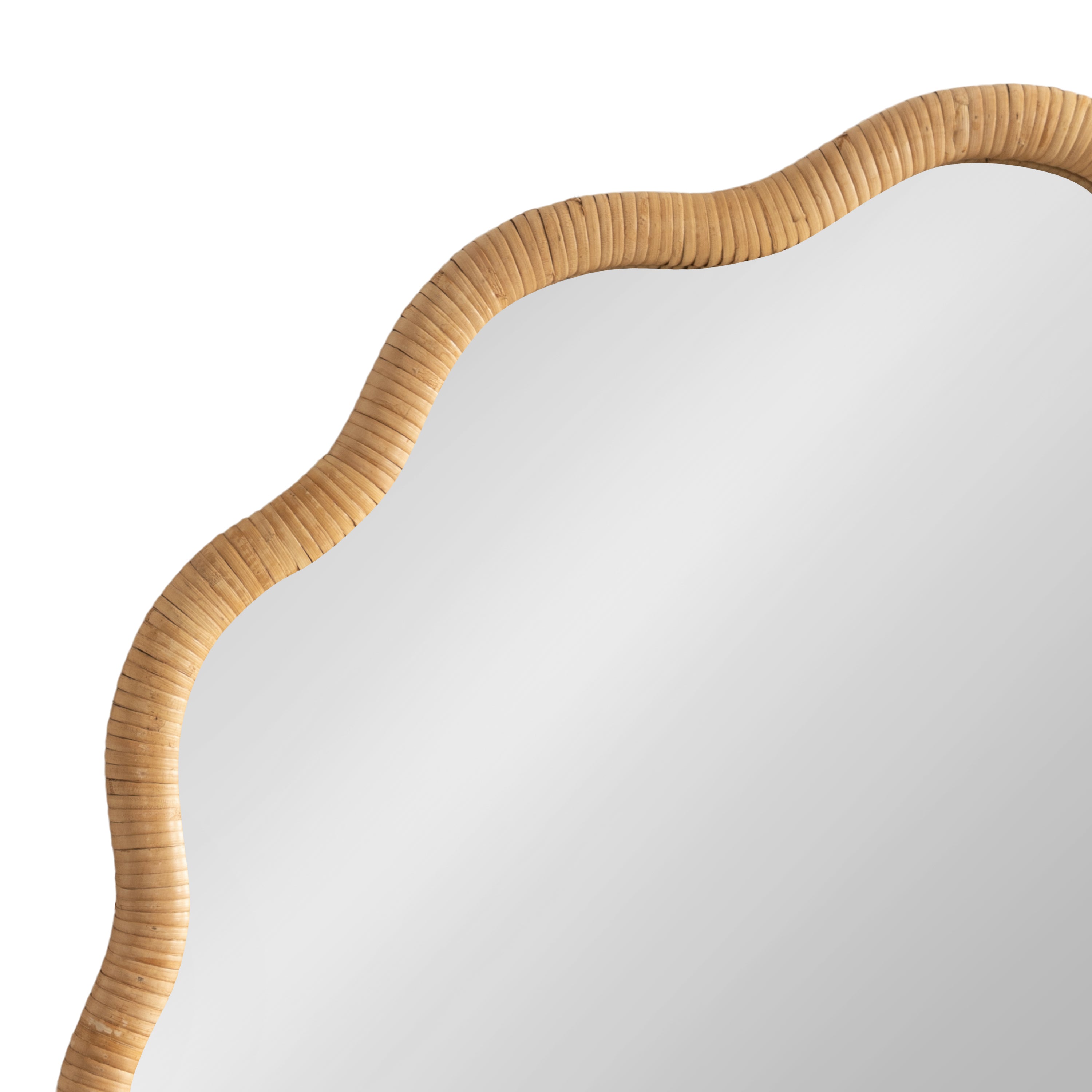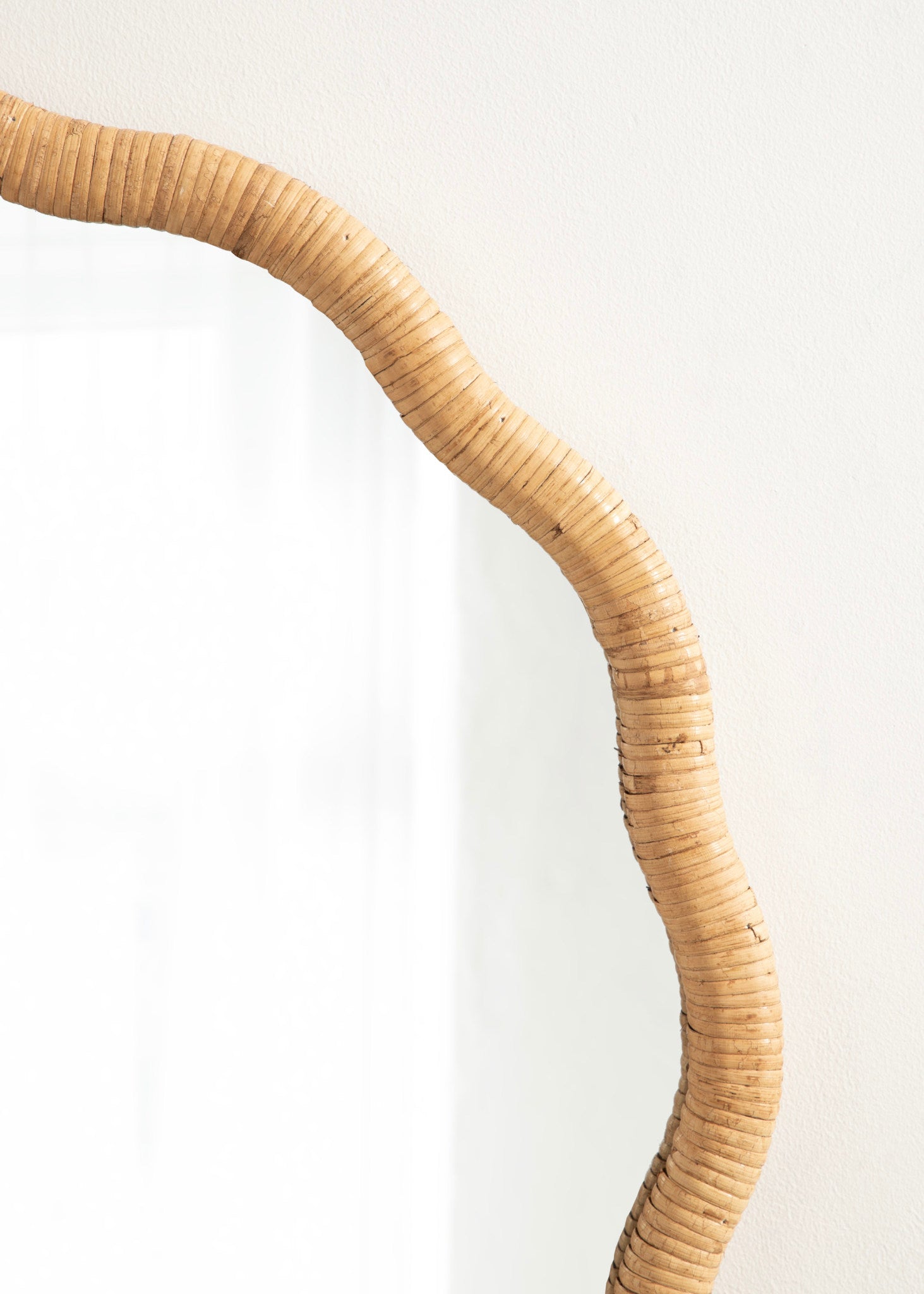 Elevate your wall decor with boho sophistication by hanging the Rahfy mirror! This lovely mirror offers textured visual intrigue to your home with a rattan-wrapped, round scalloped frame. It's a bold style choice that pays off with a vibrant surface area and a dimensional design. Whether you're redecorating your bathroom or adding a stylish and textured focal point to your favorite living space, it's perfect for setting the tone of your aesthetic.