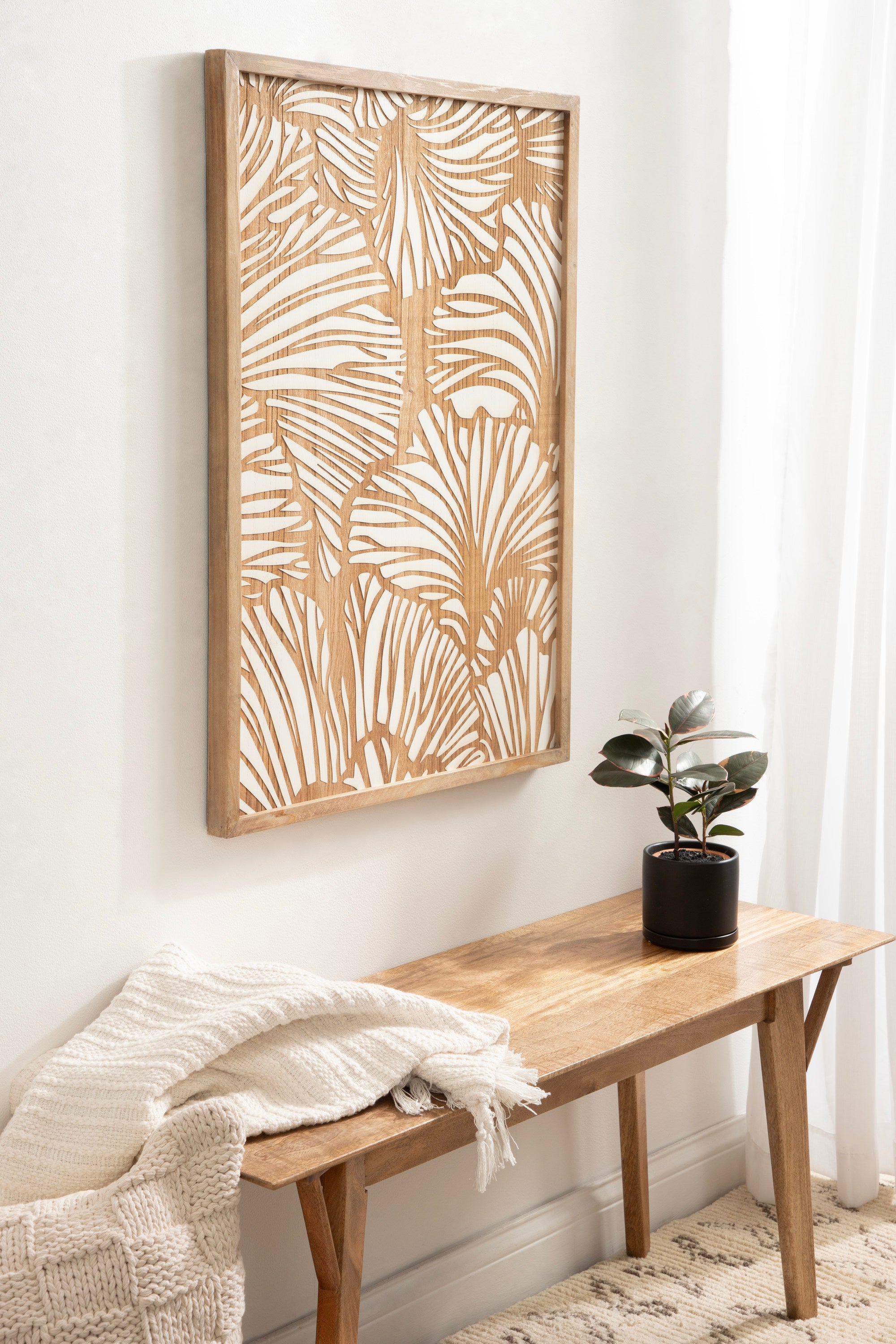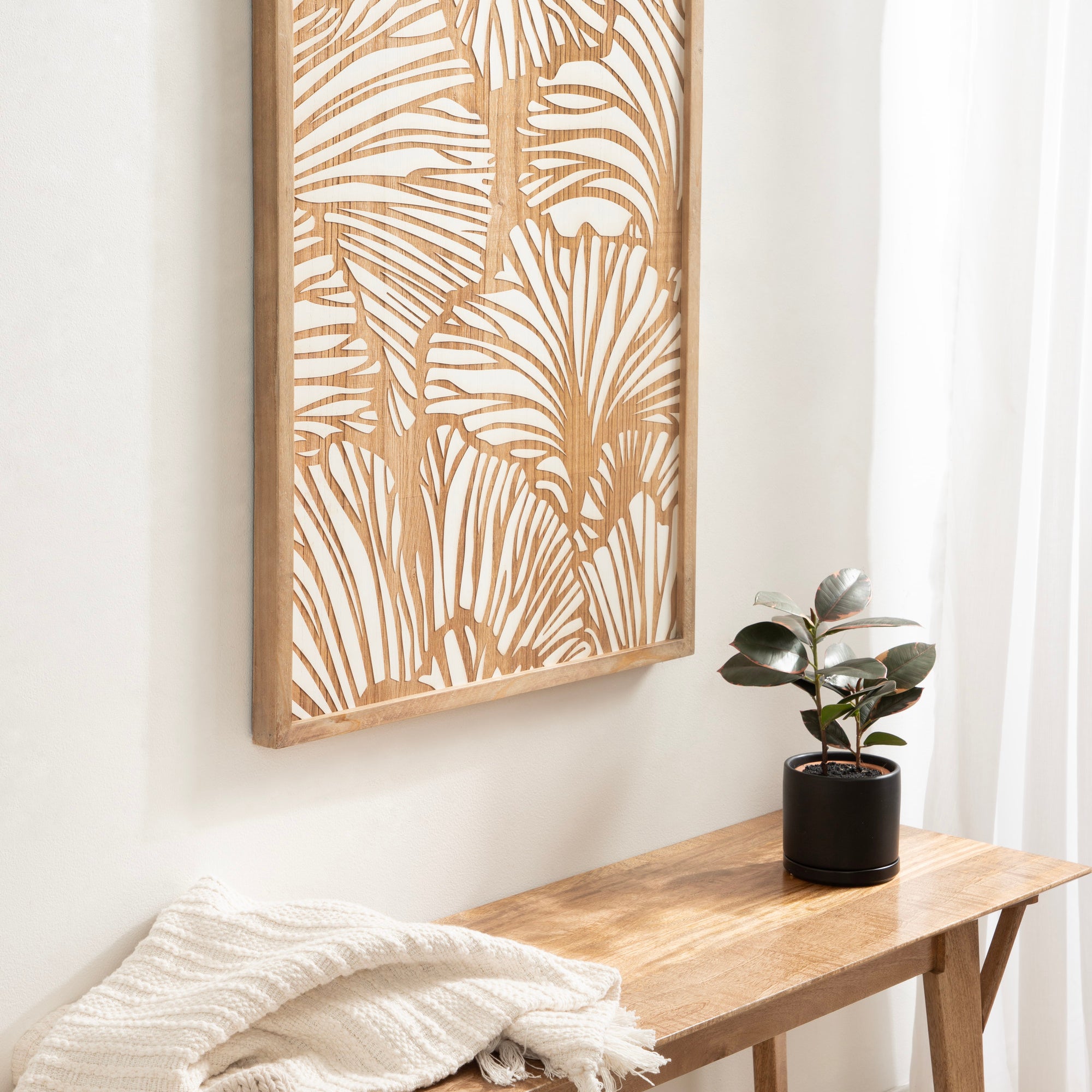 Add some texture and dimension to your home with this beautiful Sago wall art plaque. This artwork combines the natural toning of the wood with delicate painted floral elements. This combination gives your space an organic, decorative addition with a layer of gorgeous texture. This organic accent diverges from the standard piece of artwork on your wall with its textured solid wood background. This piece gives your home a much more sophisticated element that will dazzle in numerous settings throughout your home. Use it as a living room accent, a bedroom artwork, or an entryway addition. This Sago plaque is a versatile option that blends across design styles due to its natural rustic tone.