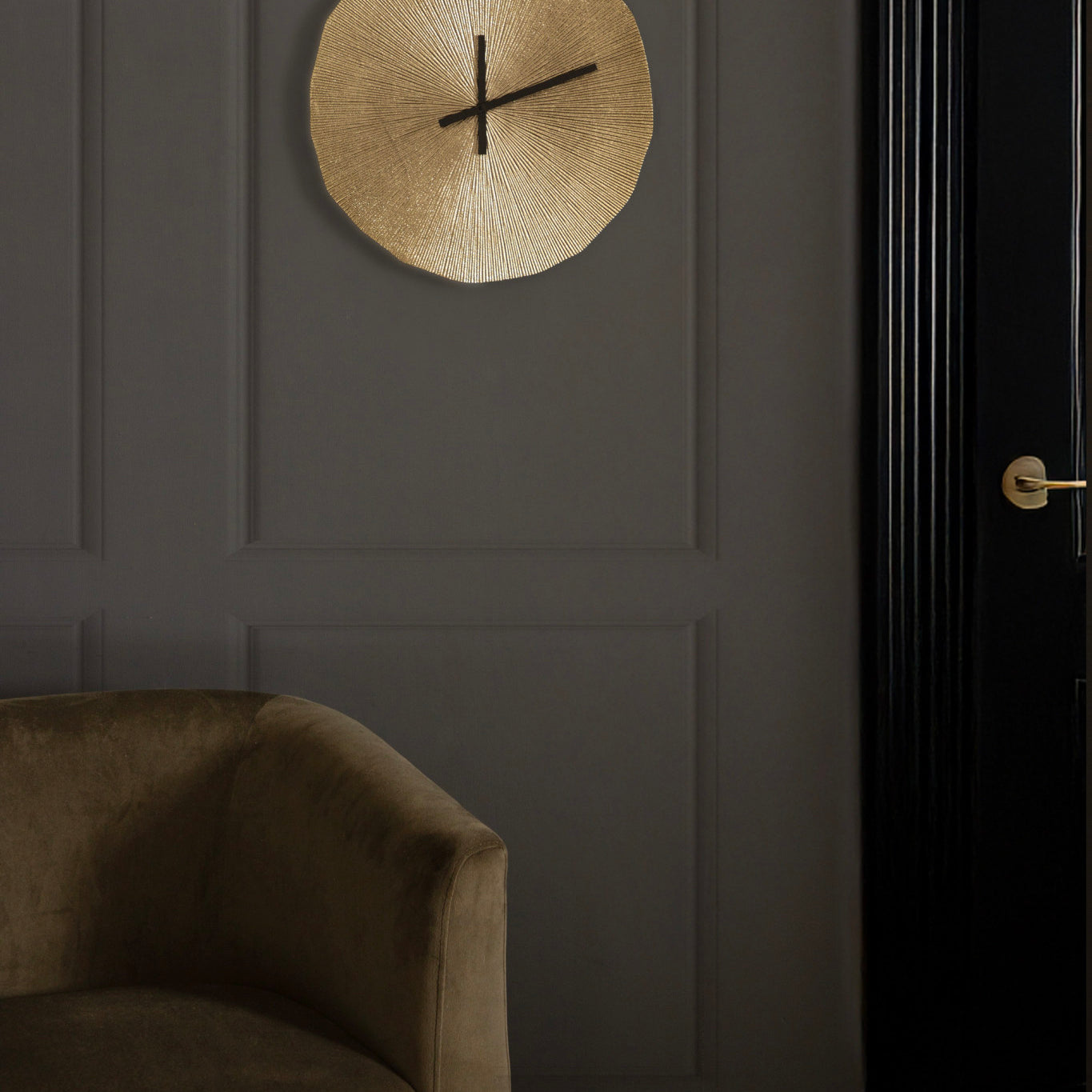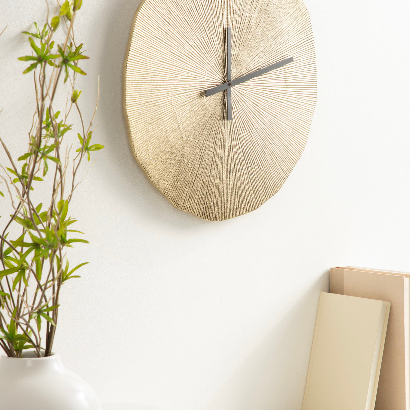 Add some personality to your home or workspace with this Sancia wall clock from Kate and Laurel. The metallic clock features a modern design inspired by contemporary aesthetics, giving your space a clean, sophisticated look. The clock itself is numberless, with a refined finish that boasts an embossed sunburst pattern. Crafted from sandcast aluminum, the organic shape of this clock makes it look and feel one-of-a-kind. The minimalist design looks great in any space, whether you decide to hang it in your living room, kitchen, bedroom, or dining room. It also looks great as a functional replacement for wall art, an entryway conversation piece, or a tone-setting, minimalist accent for your home office. This clock's functional design requires one AA battery to run, making it ready to give you the time at any point of the day. The AA battery does not come included with this product, but the clock requires no assembly.