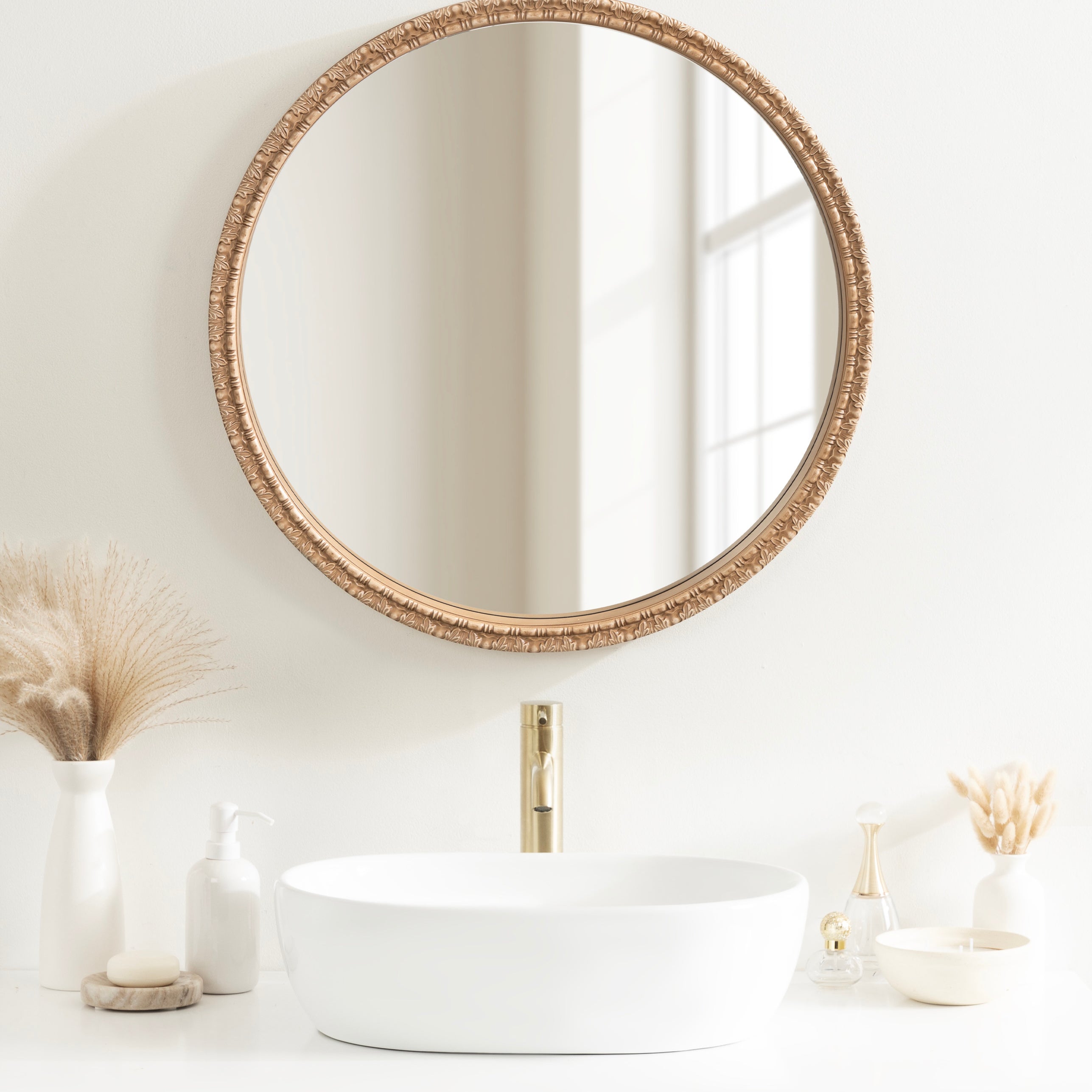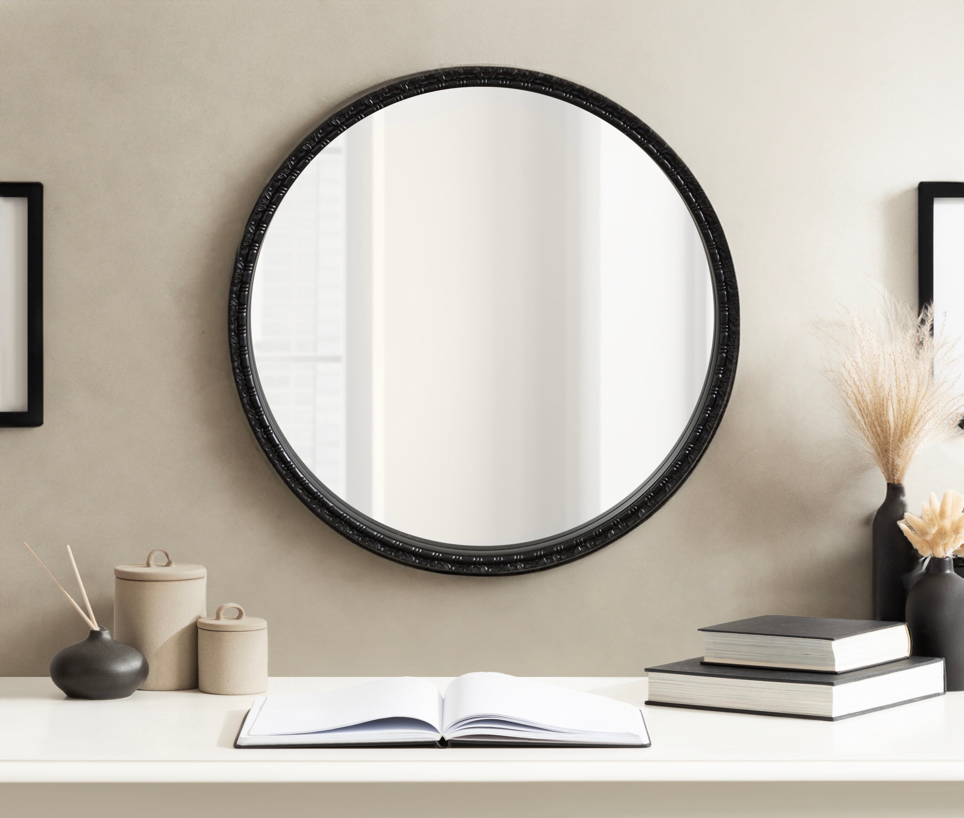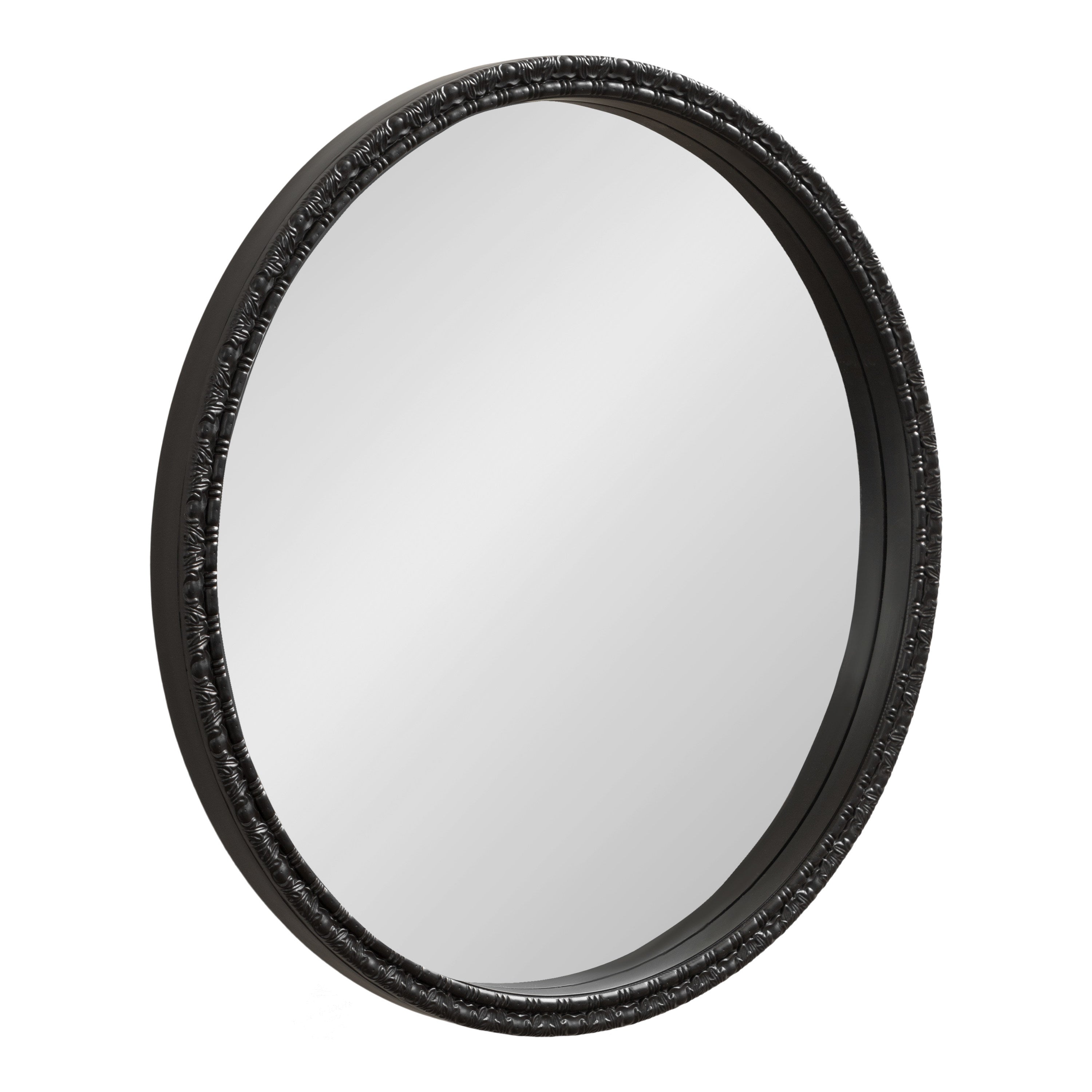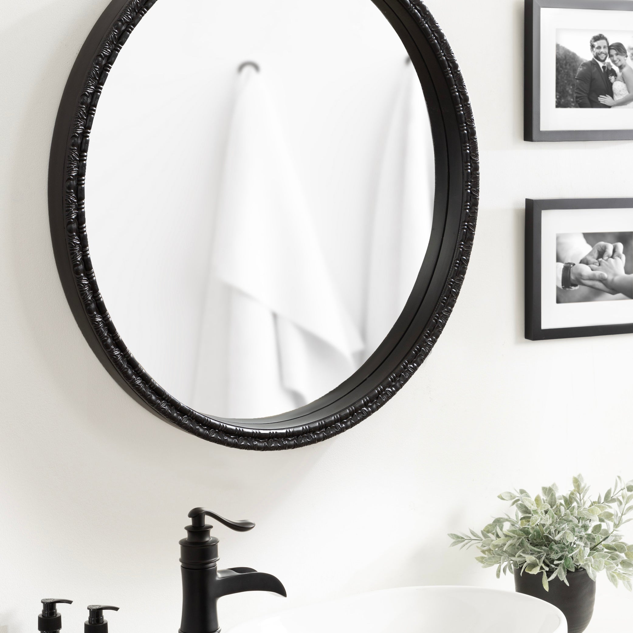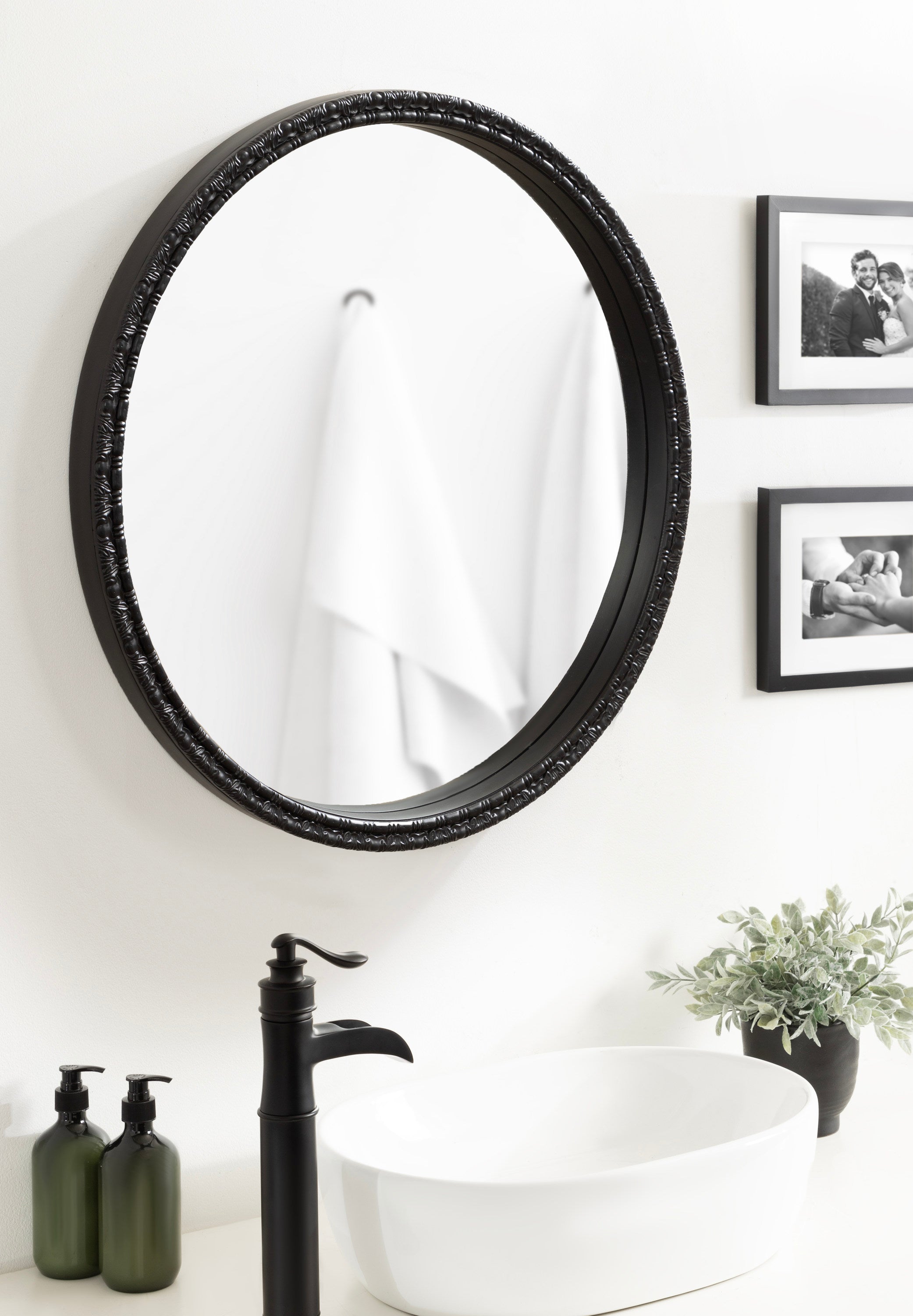 Looking for a charming ornate mirror to elevate your space? Look no further than the Stallworth round mirror with its slim frame and textured detailing. This circular mirror couples quality craftsmanship with a unique wooden frame. Use it as a bathroom vanity mirror, a textured addition to a living room, a refined bedroom accent, or even as a hallway mirror. This low-profile mirror features some light distressing along with two ornate patterns, giving you a detailed, thoughtful design.
